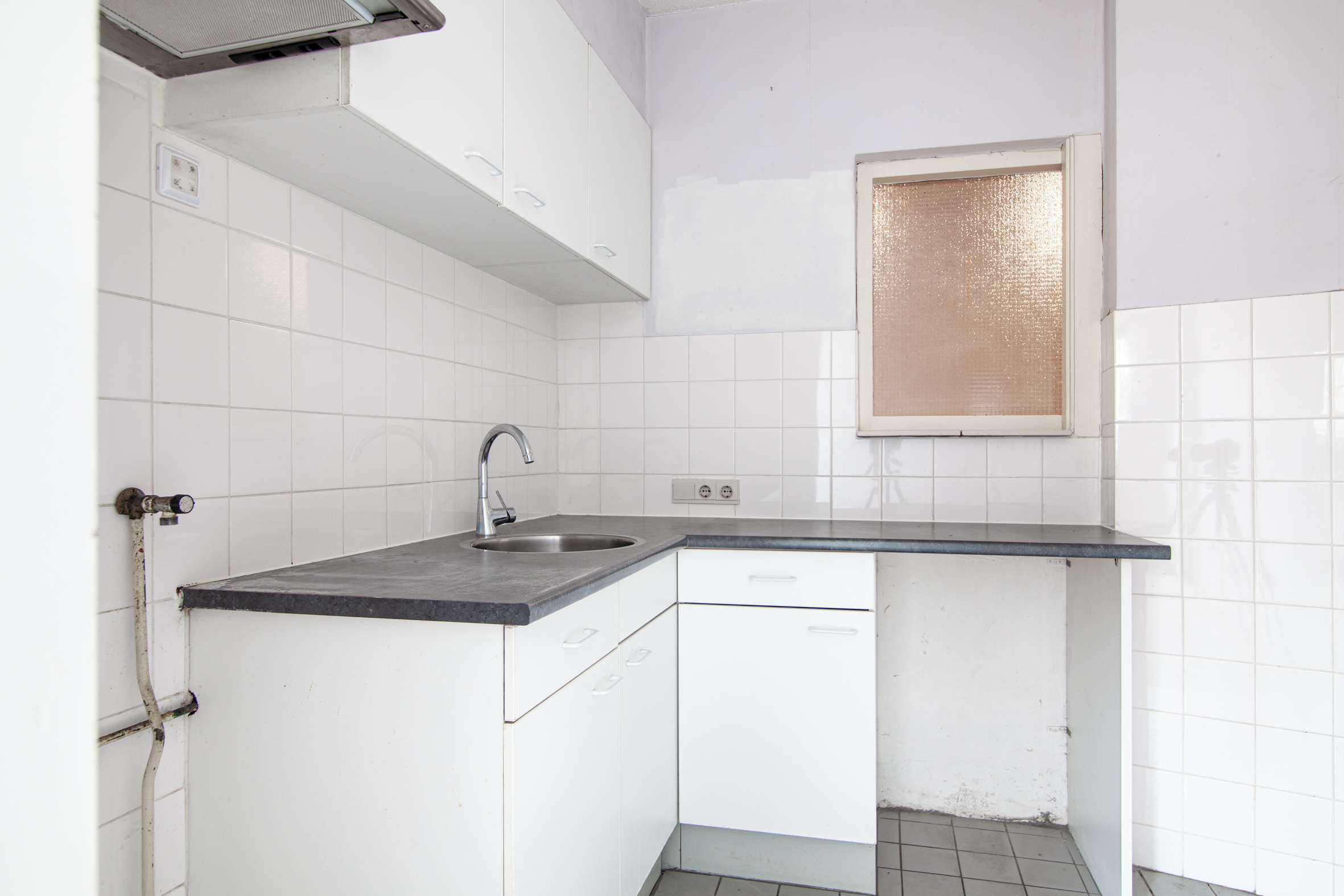 1e verdieping: privé-entree, hal met toilet en meterkast. Woonkamer met balkon met zicht op binnenplaats. Semi-open keuken met recht keukenblok voorzien van een rvs spoelbak en een circulatiekap.