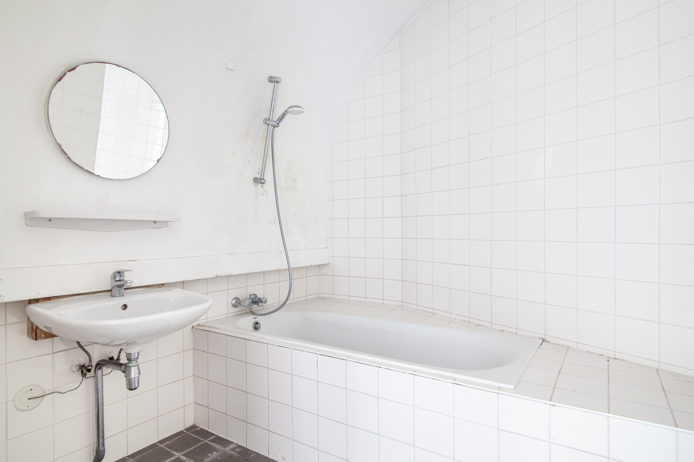 2e verdieping: overloop met grote was-/cv-ruimte, grote slaapkamer en een kleinere slaapkamer aan de achterzijde. Badkamer voorzien van ligbad en wastafel (wit sanitair en wit betegeld).