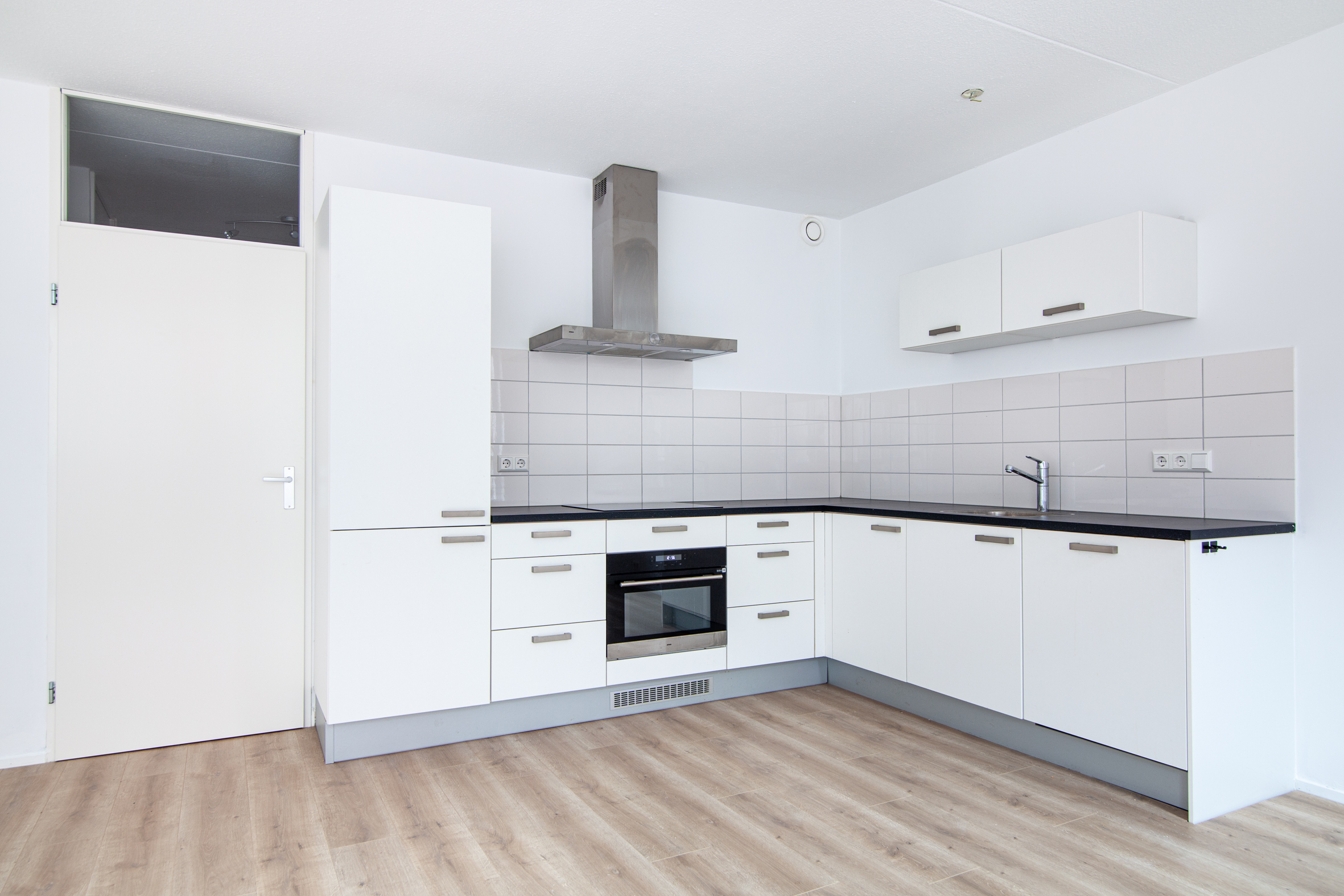 1e verdieping: privé-entree, hal met toilet, vernieuwde meterkast en trappenhuis. Extra grote woonkeuken. De keuken (wit kunststof) is recent vernieuwd en voorzien van een L-vormig aanrechtblad, rvs spoelbak, vaatwasser, inductiekookplaat, rvs afzuigkap (recirculatie), koel-/vriescombinatie en oven.