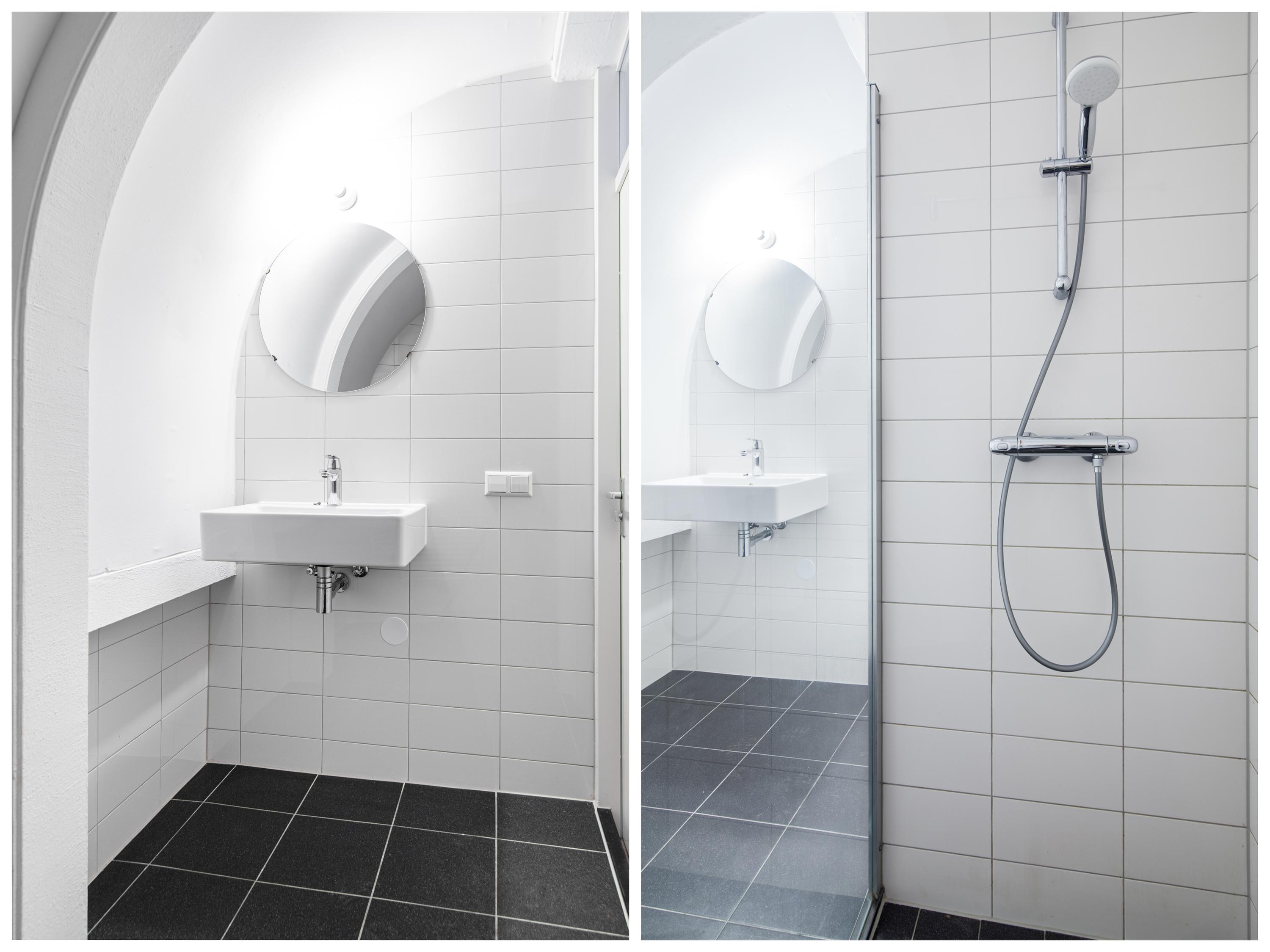 het zicht. Nette, inpandige badkamer voorzien van een inloopdouche, handdoekradiator en wastafel.
