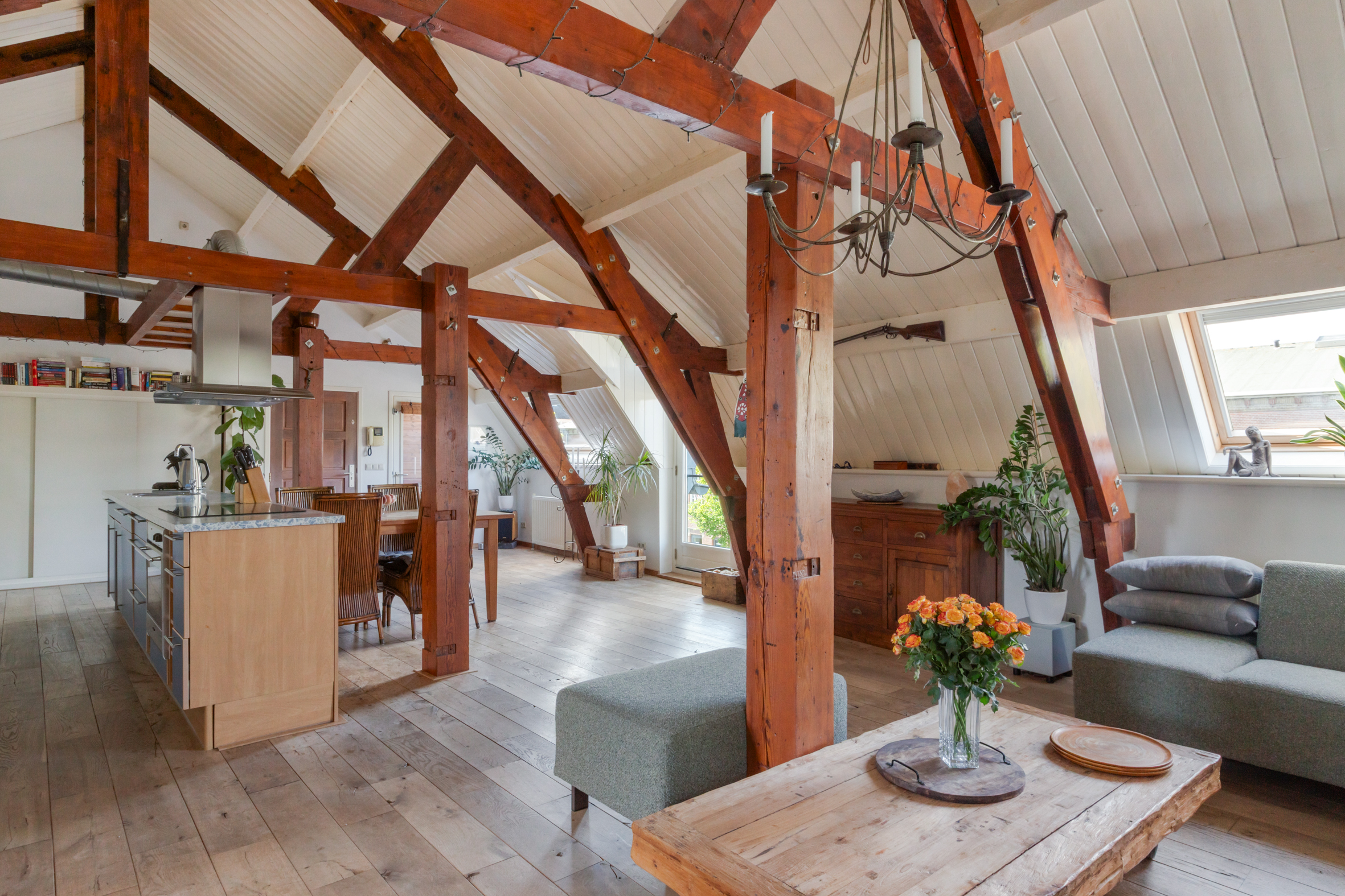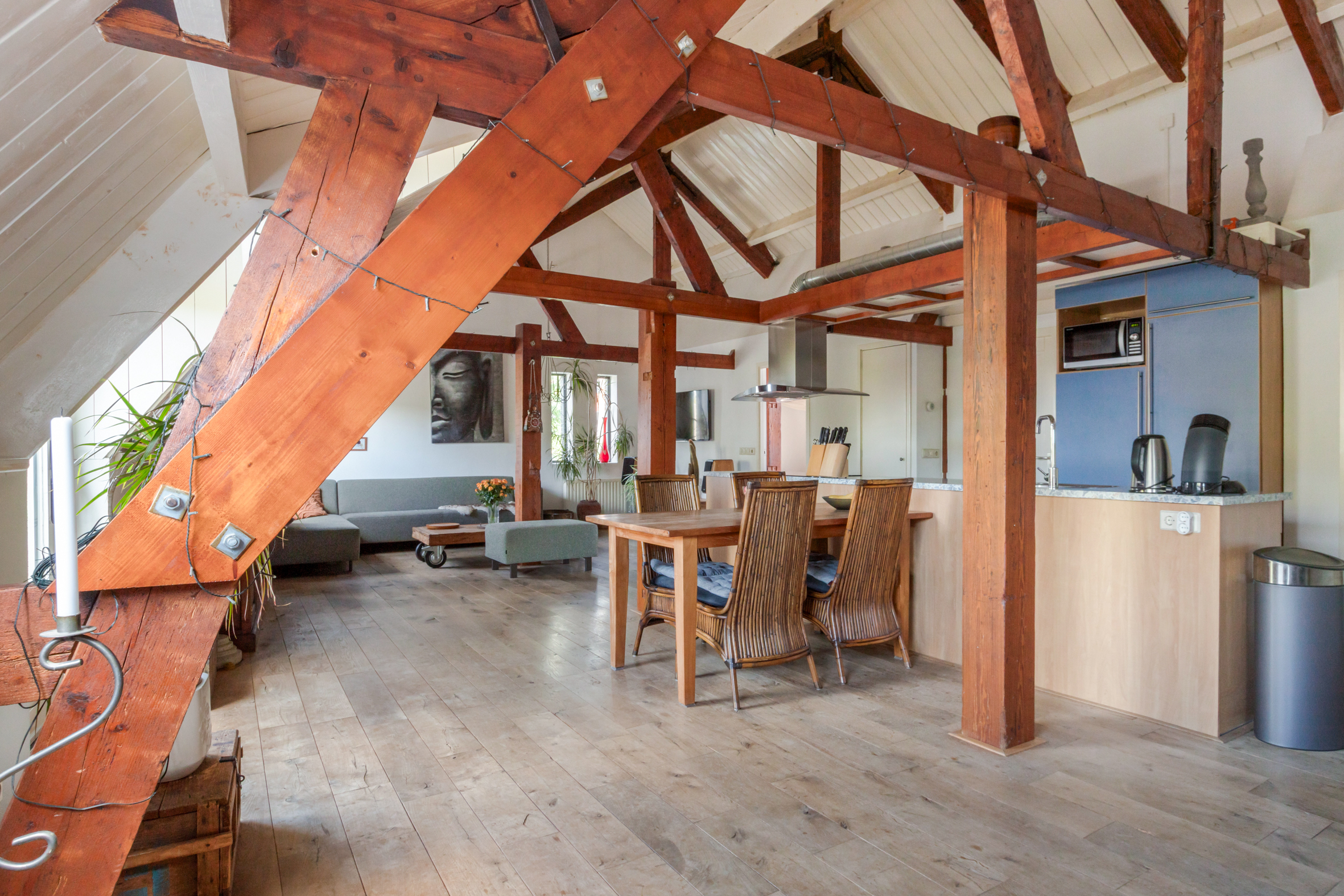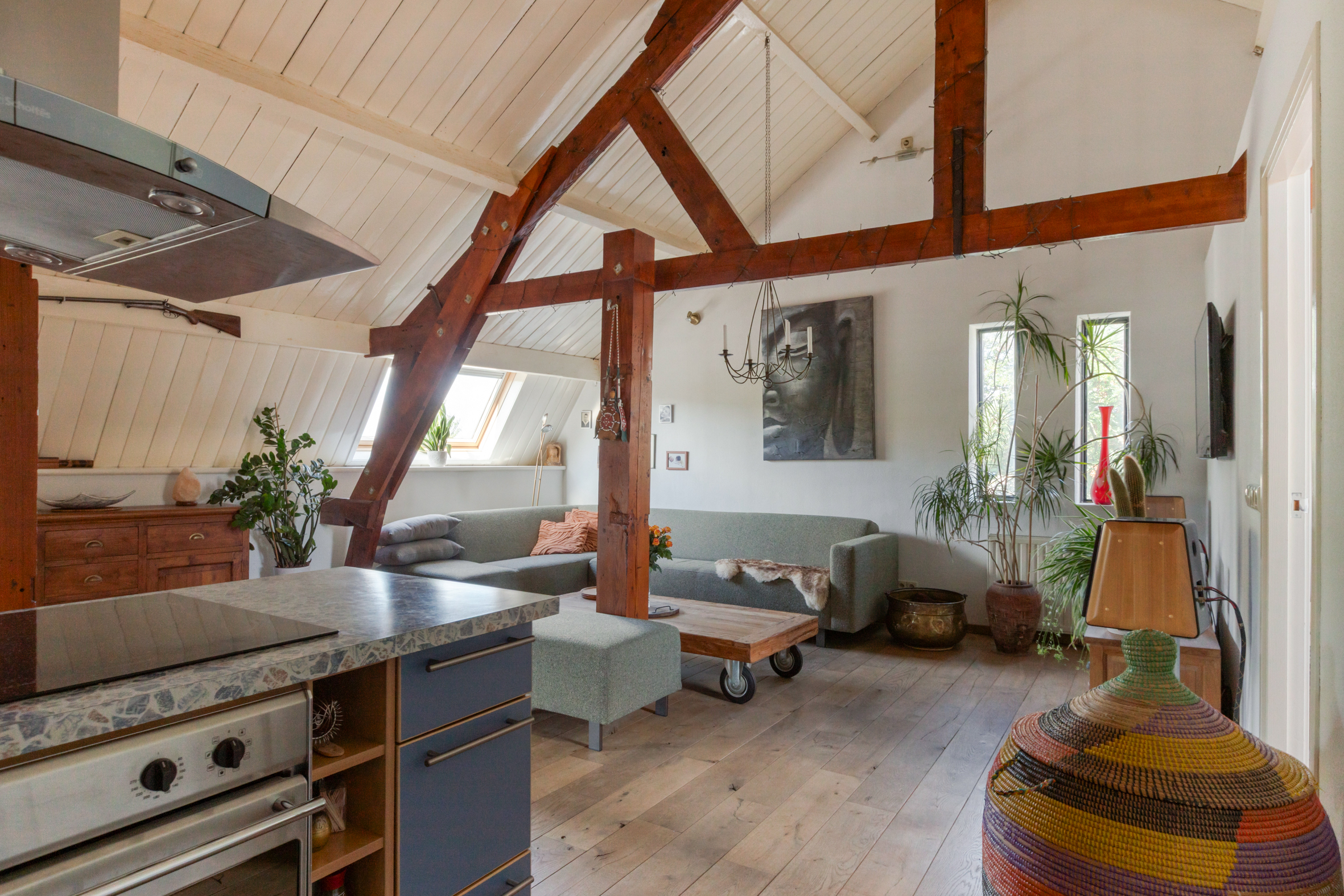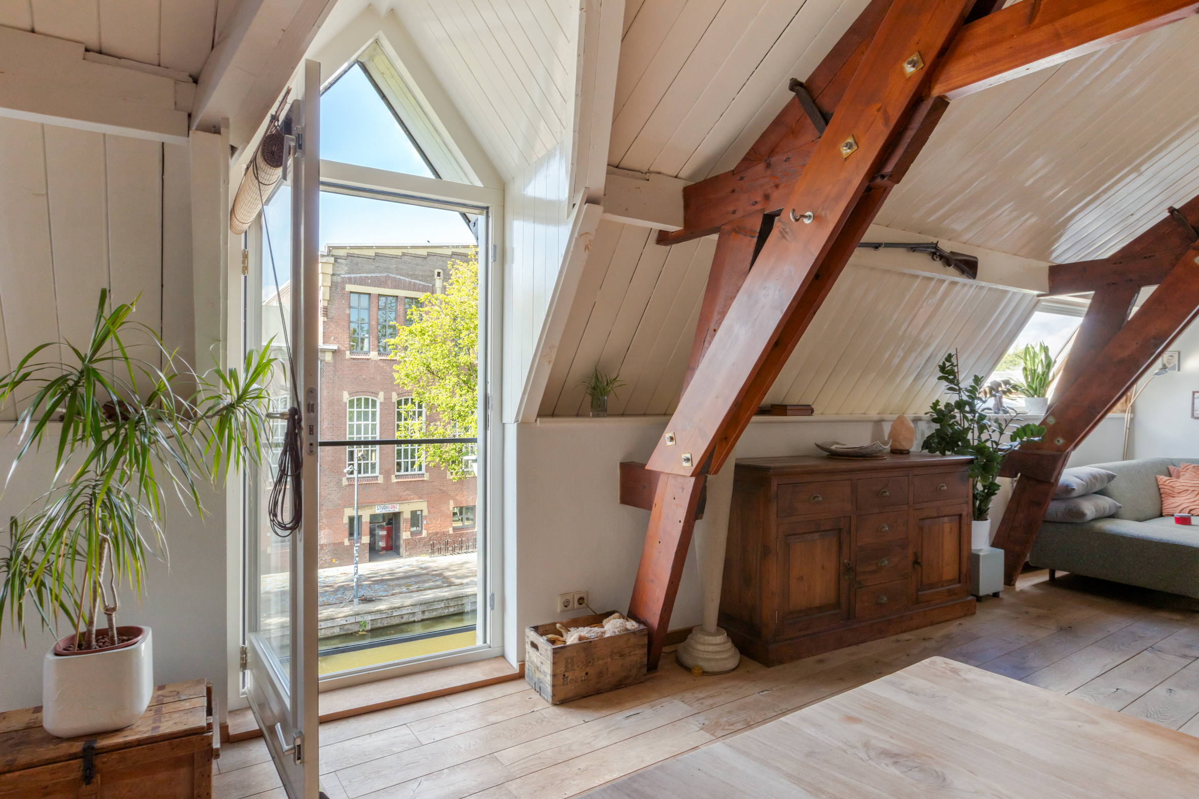 Tweede verdieping: entree woning, geweldige woonkamer met veel lichtinval, prachtige hoge nok met balken en spanten in het zicht, Frans balkon, een zit- en een eetgedeelte. A room with a view: vanuit de woonkamer heerlijk vrij zicht op het water!