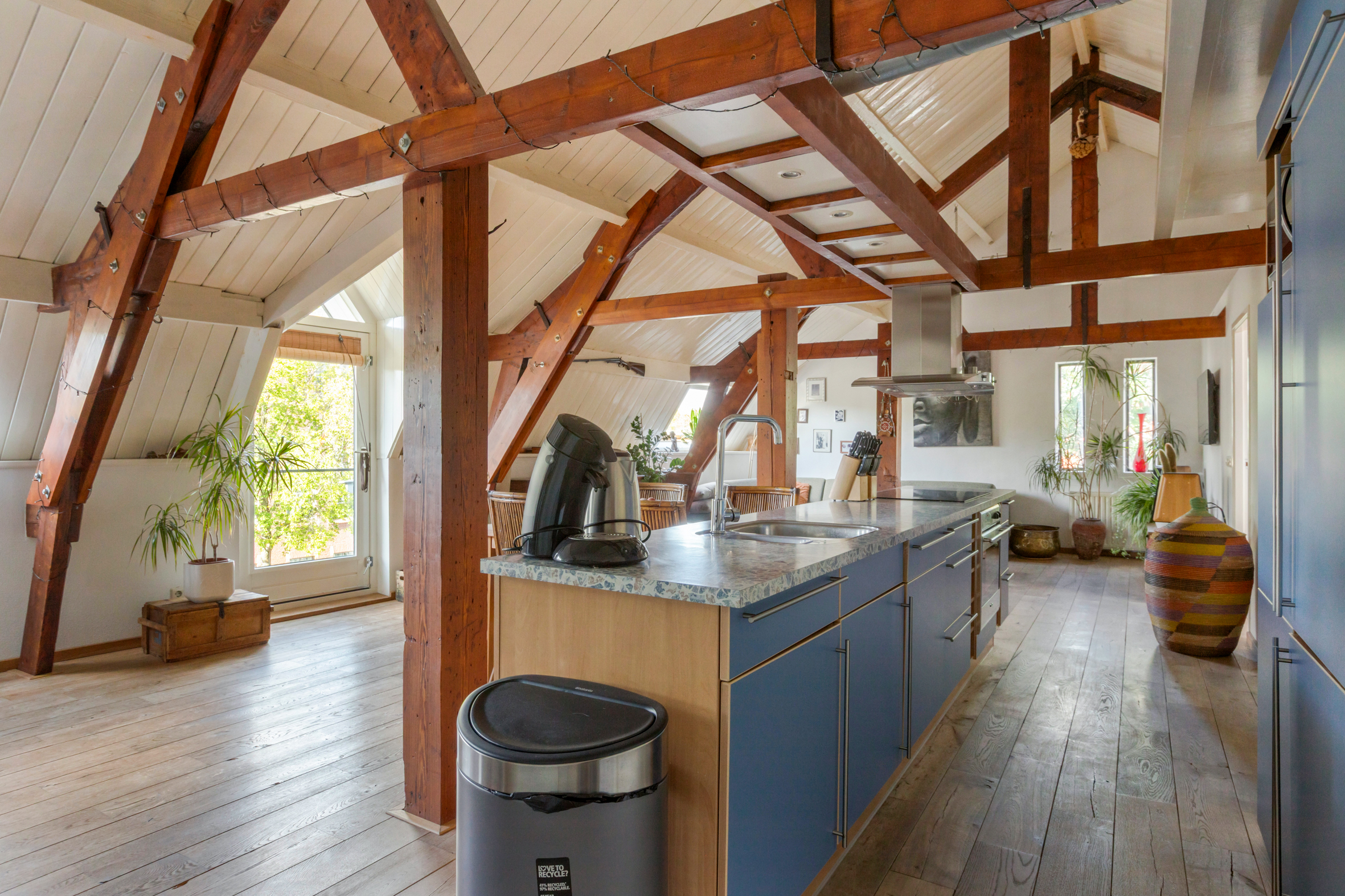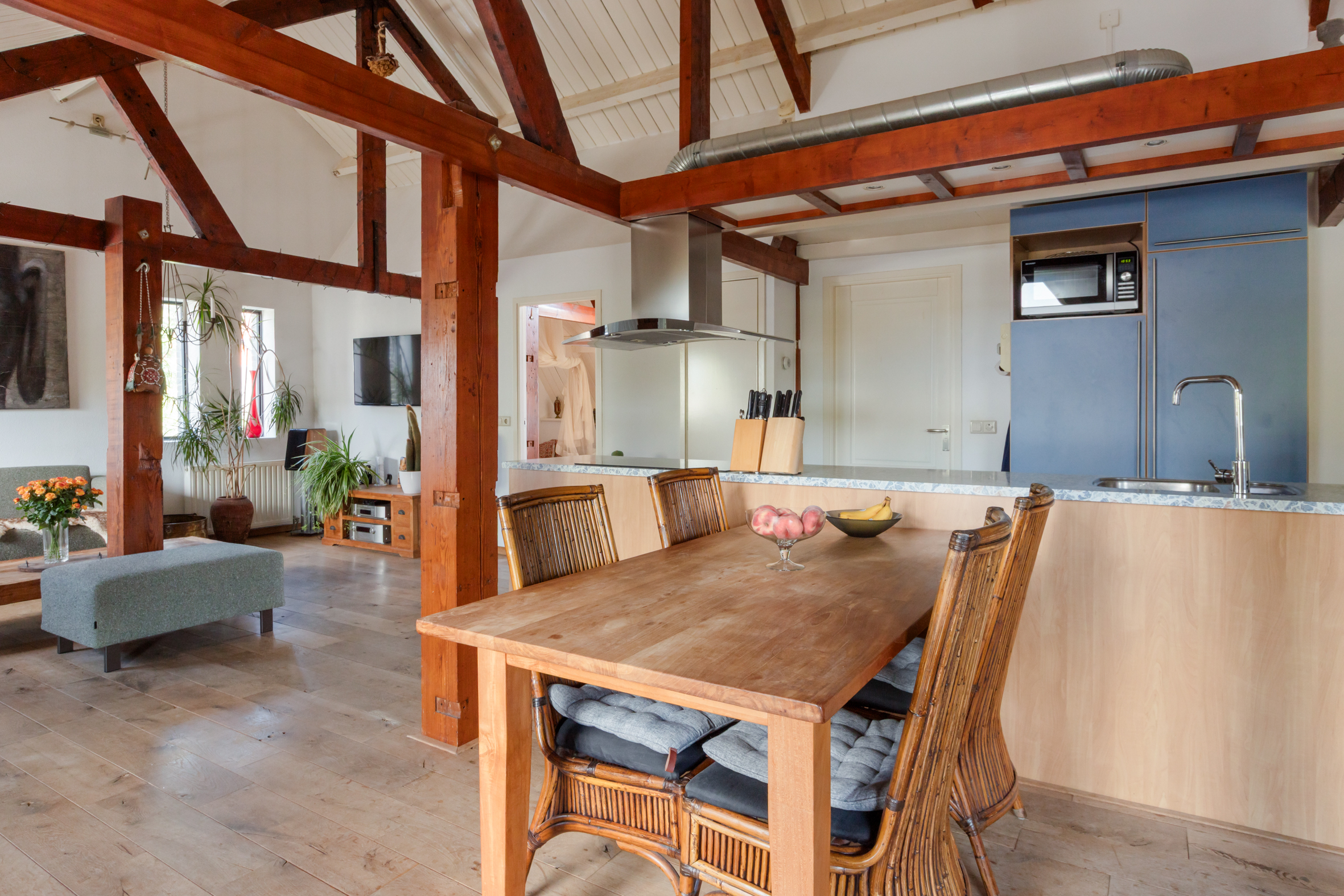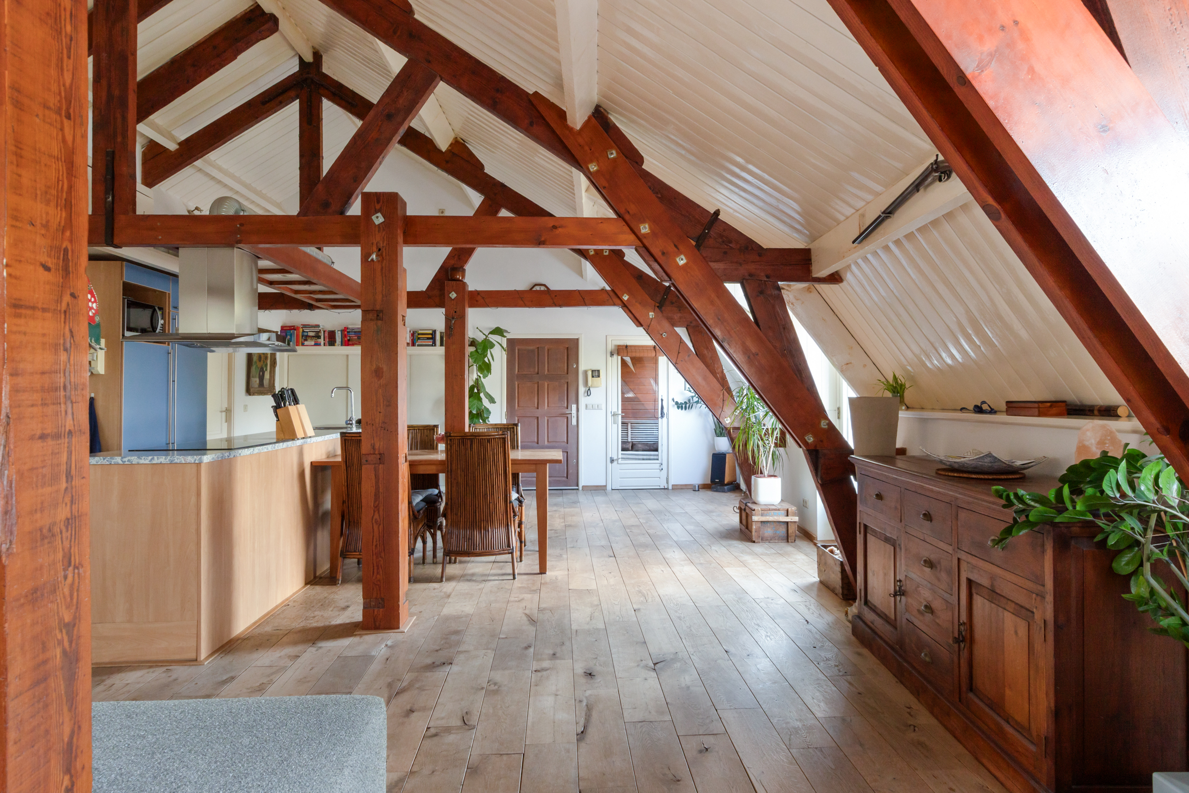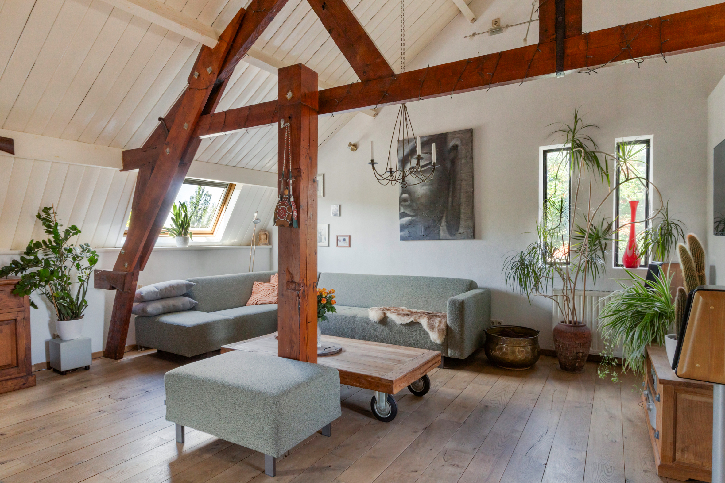 Tweede verdieping: entree woning, geweldige woonkamer met veel lichtinval, prachtige hoge nok met balken en spanten in het zicht, Frans balkon, een zit- en een eetgedeelte. A room with a view: vanuit de woonkamer heerlijk vrij zicht op het water!