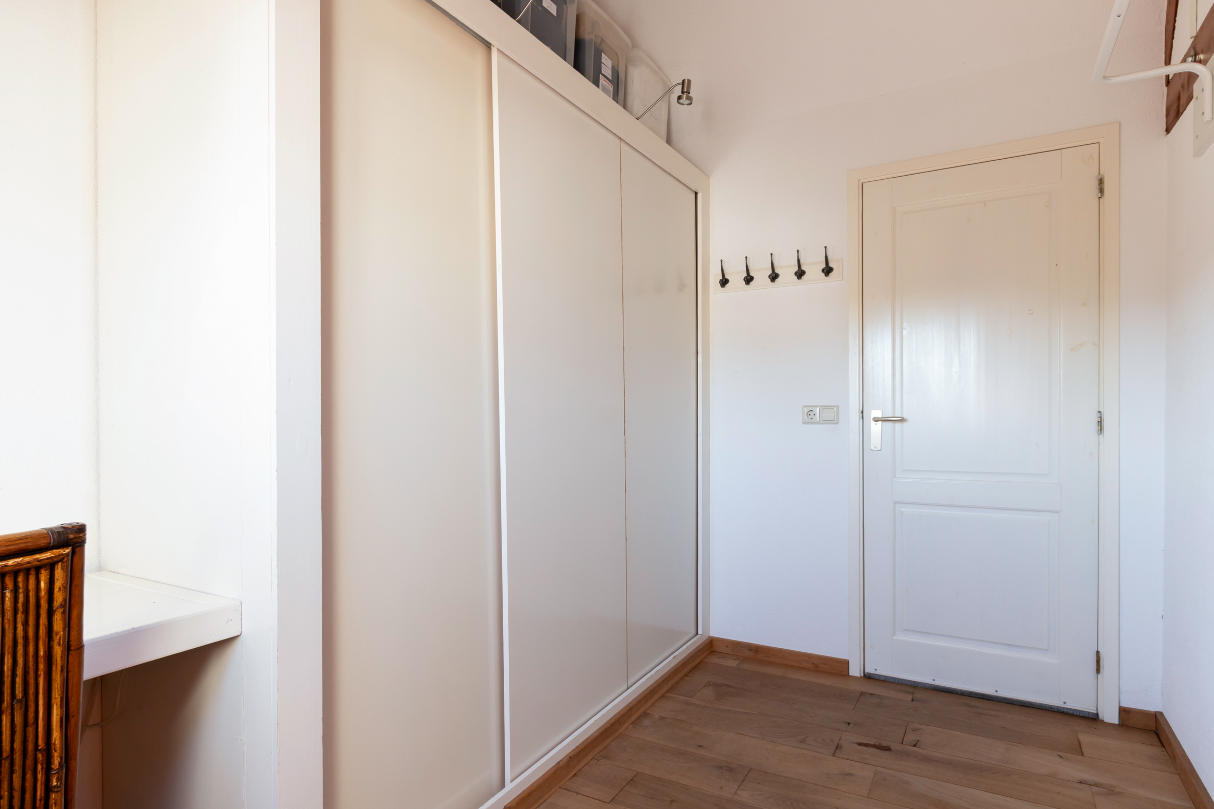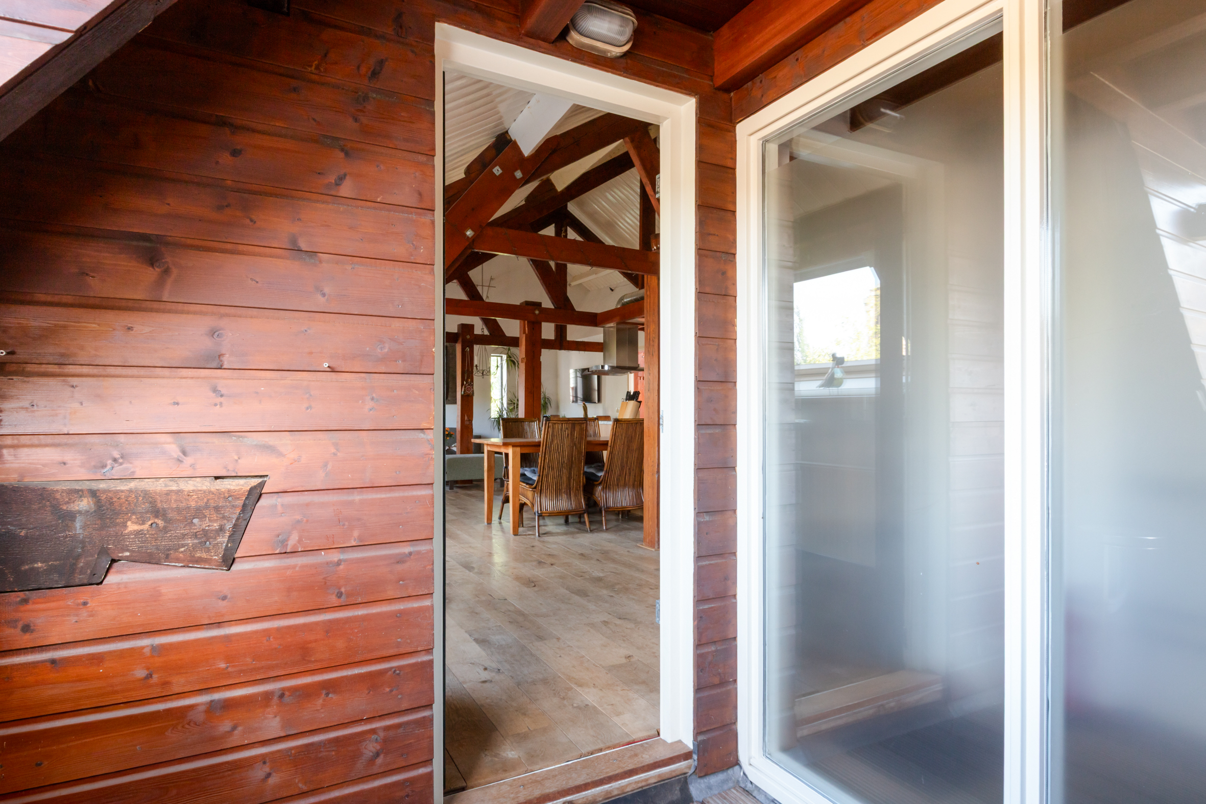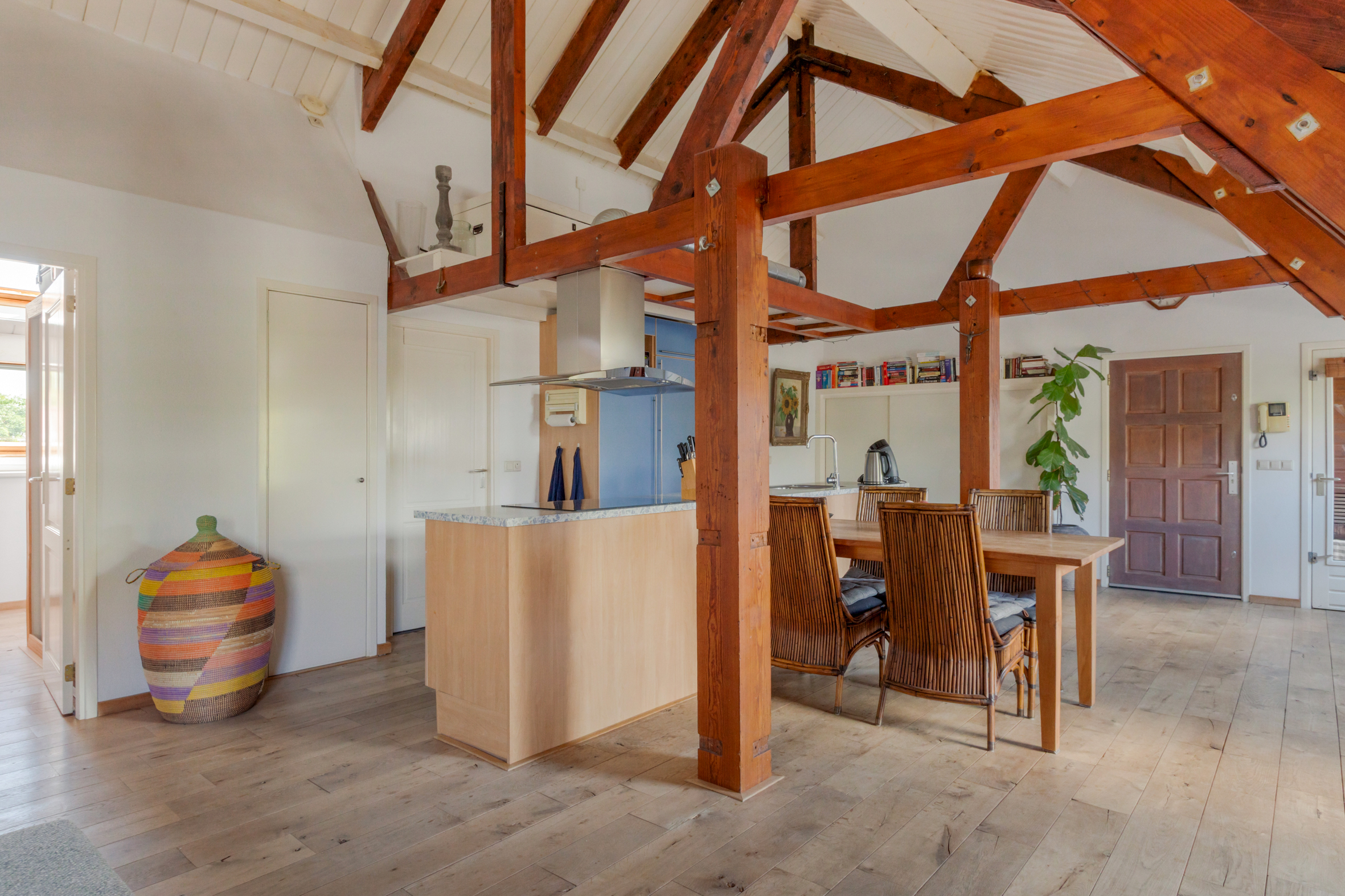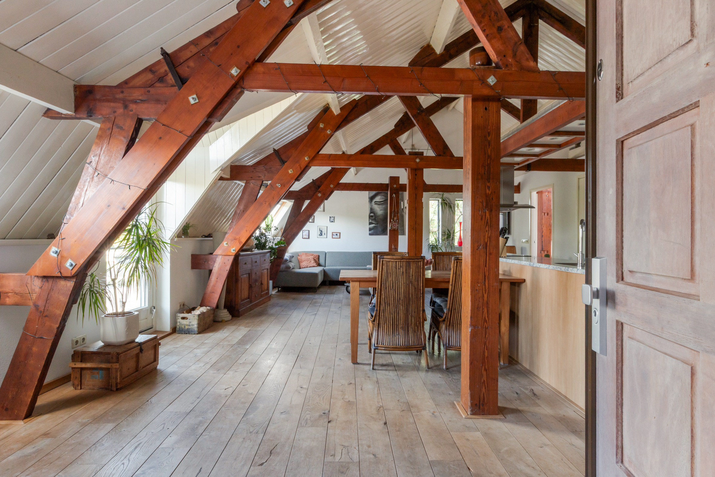 Tweede verdieping: entree woning, geweldige woonkamer met veel lichtinval, prachtige hoge nok met balken en spanten in het zicht, Frans balkon, een zit- en een eetgedeelte. A room with a view: vanuit de woonkamer heerlijk vrij zicht op het water!
