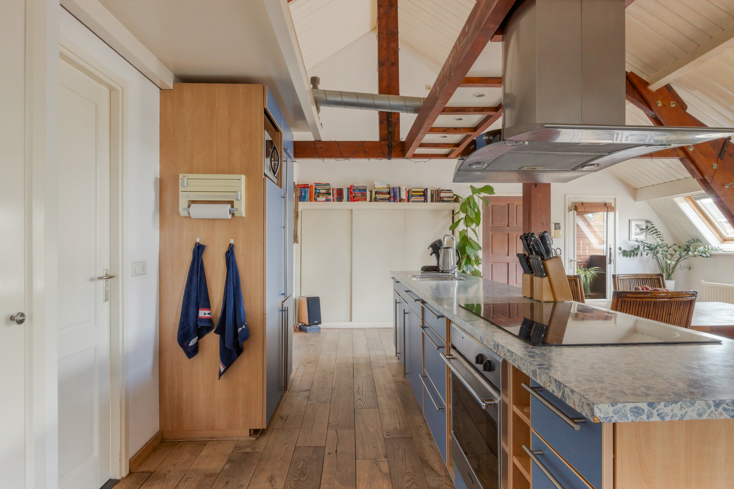 Open keuken, vrijstaand in de ruimte, dus bij het koken heerlijk kletsen met de gasten aan de tafel. Een extra gedeelte met diverse kasten zorgt voor voldoende bergruimte in de keuken. De keuken is in kunststof uitvoering en voorzien van elektrische kookplaat, afzuigkap, koelkast en vaatwasser.