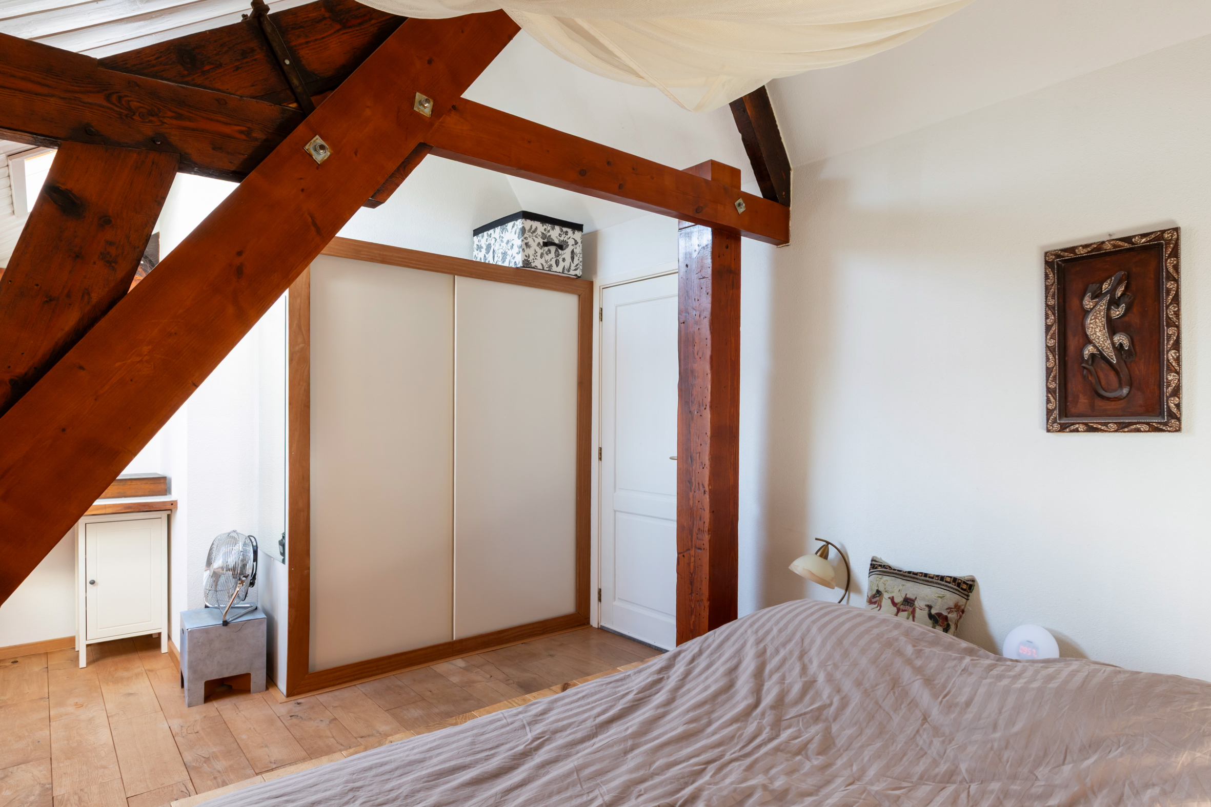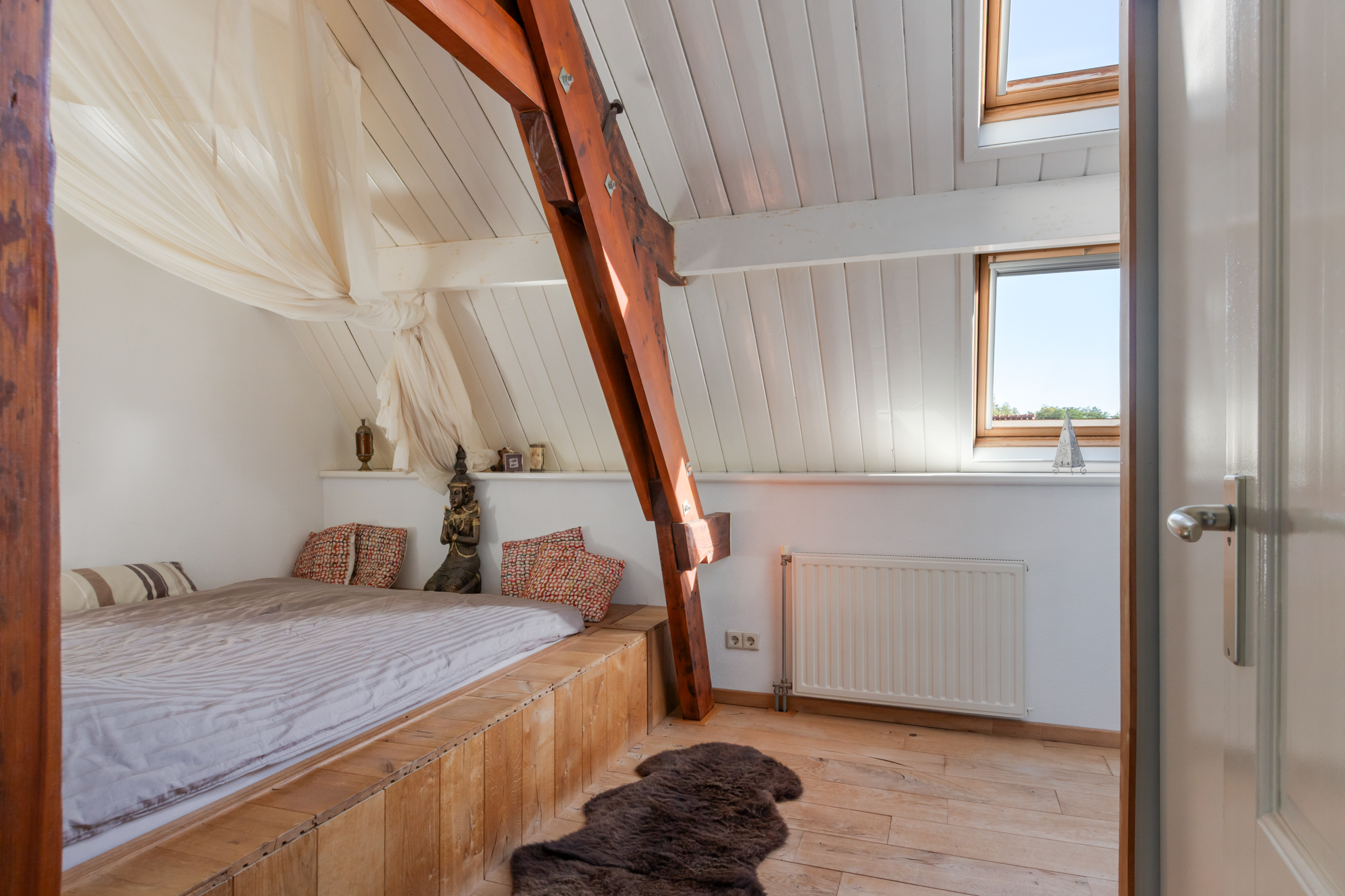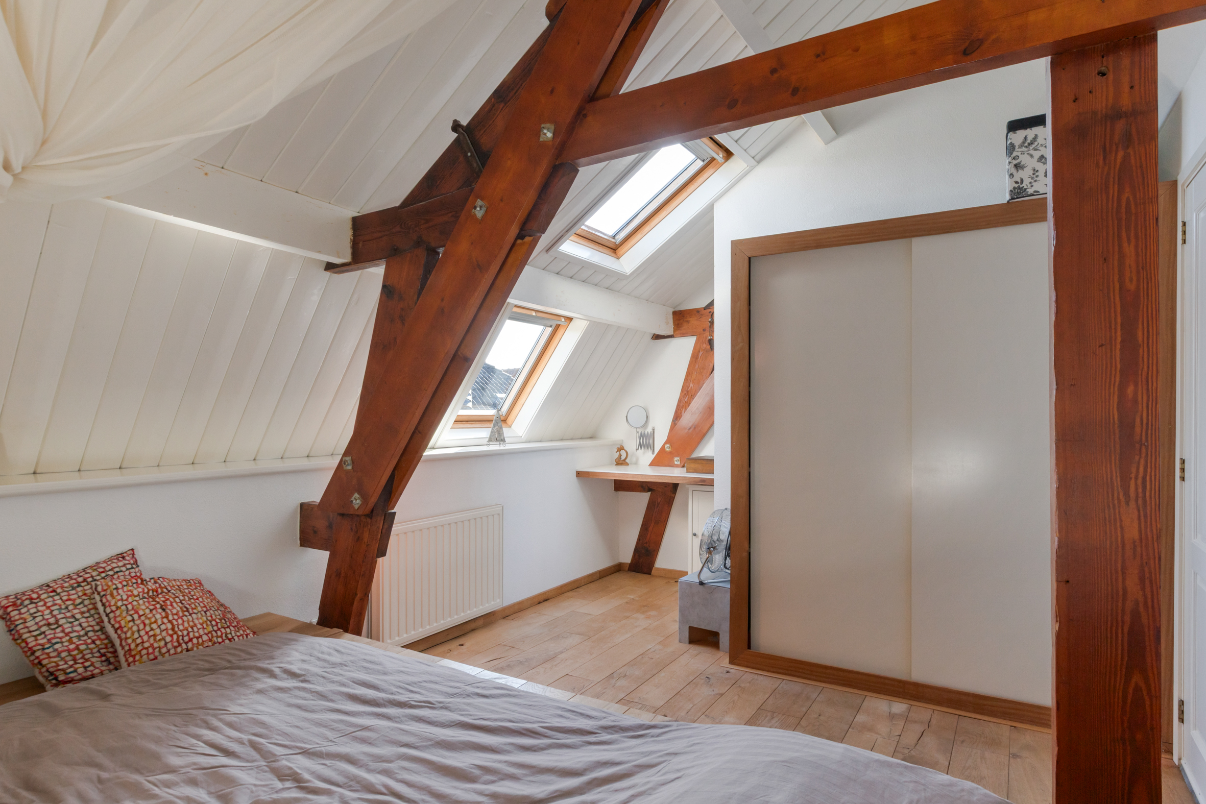 Grote slaapkamer aan de achterzijde, waarin een "vast bed" is aangebracht. De kamer is voorzien van een massief eiken vloer en twee dakramen.