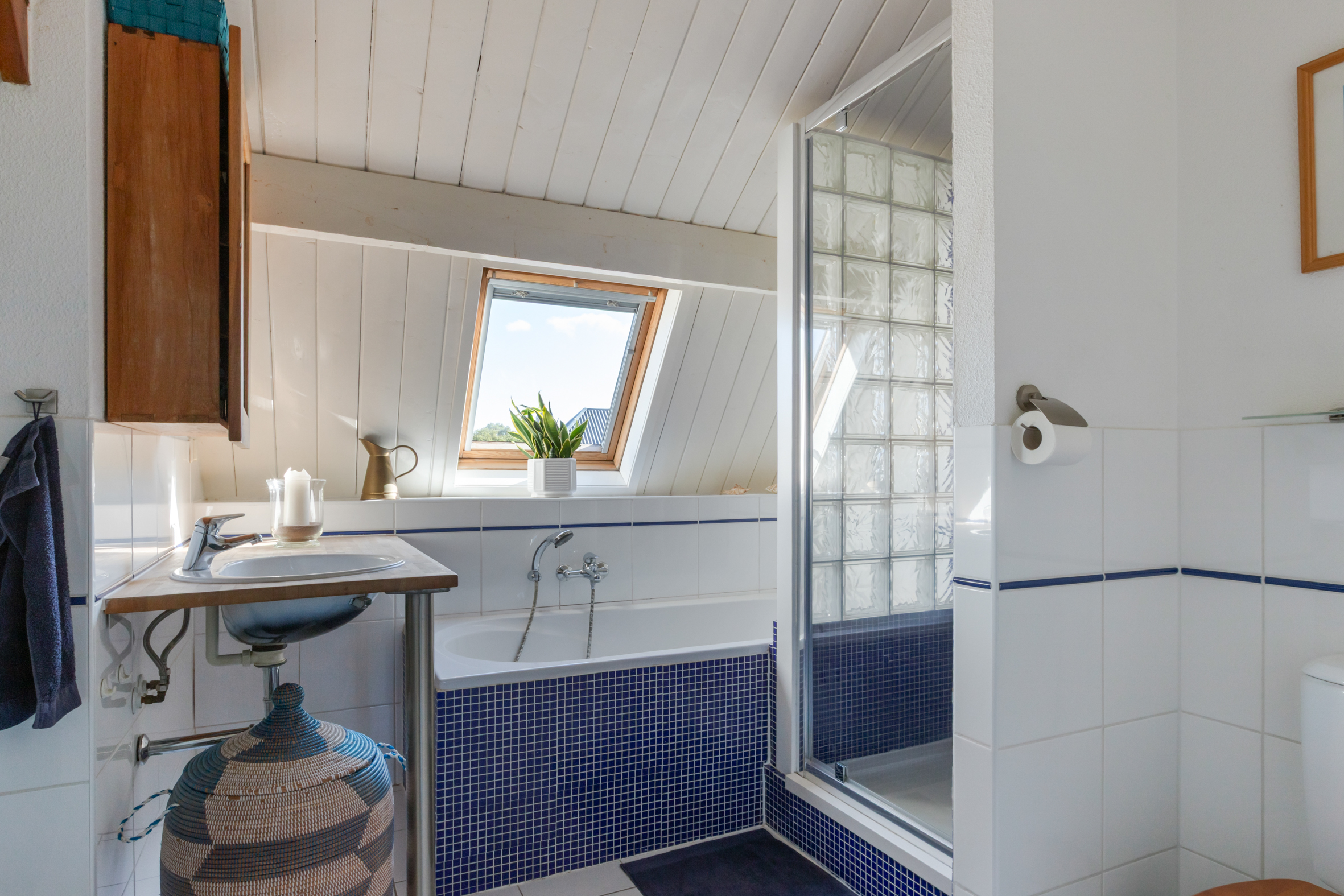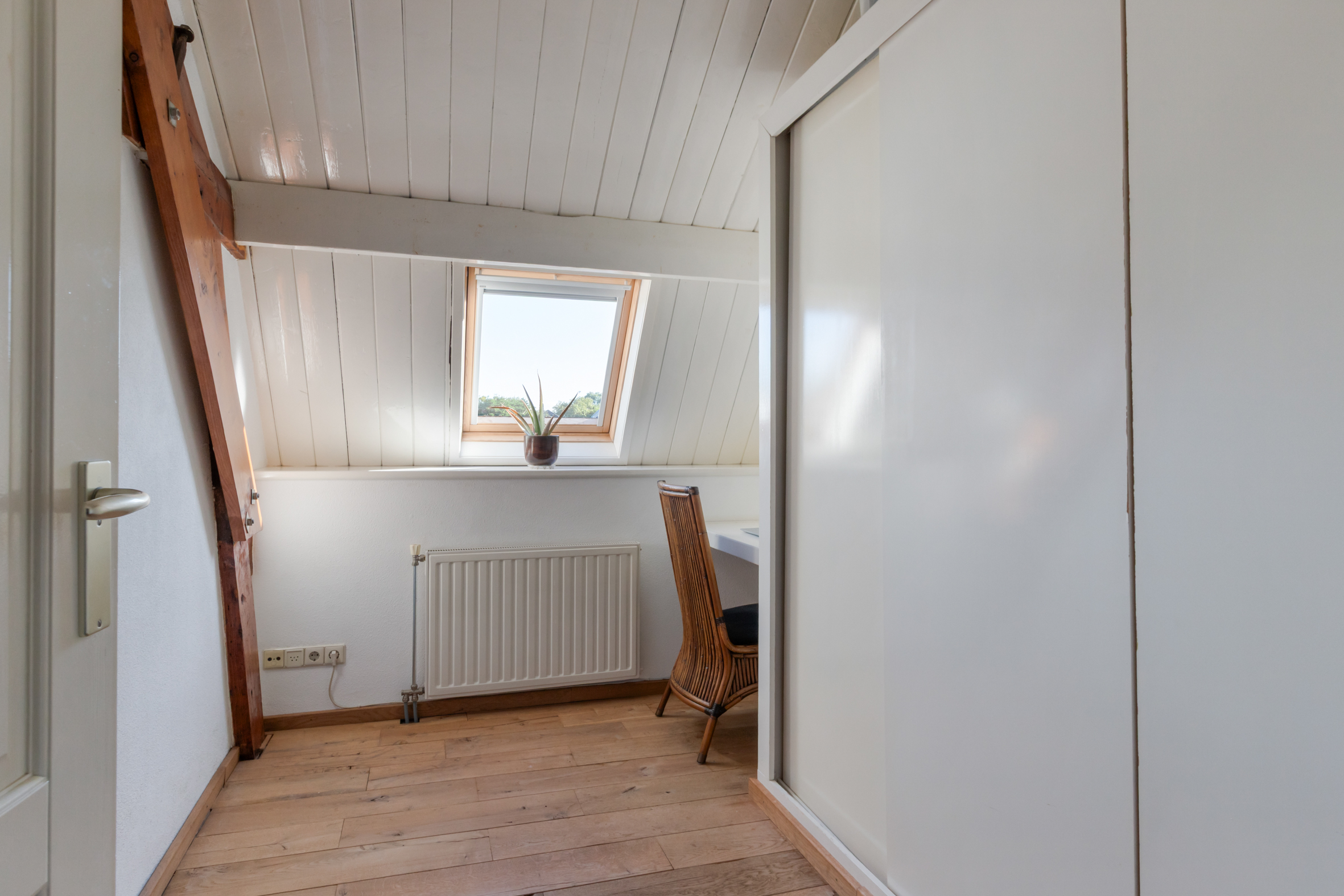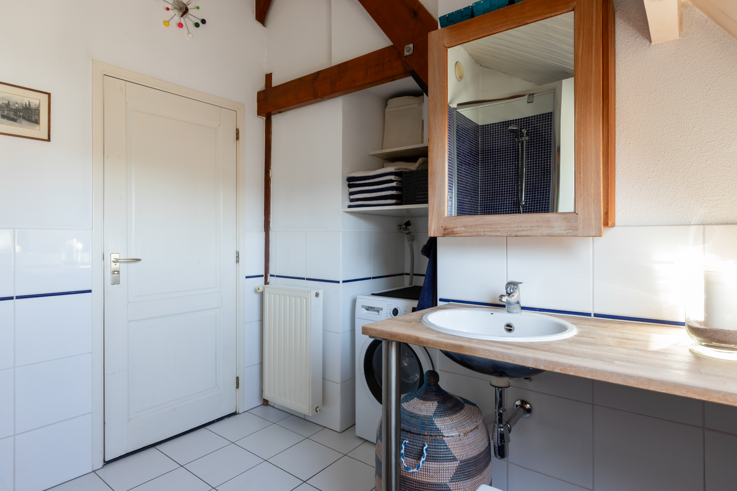 Tweede slaap-/werkkamer met dakraam. Badkamer, fris wit betegeld en deels met blauwe mozaiek betegeling. De badkamer is voorzien van een ligbad, douchehoek, wastafel met meubel en toilet, opstelplaats voor de wasmachine. Dakraam met zicht over de mooie binnenstad.