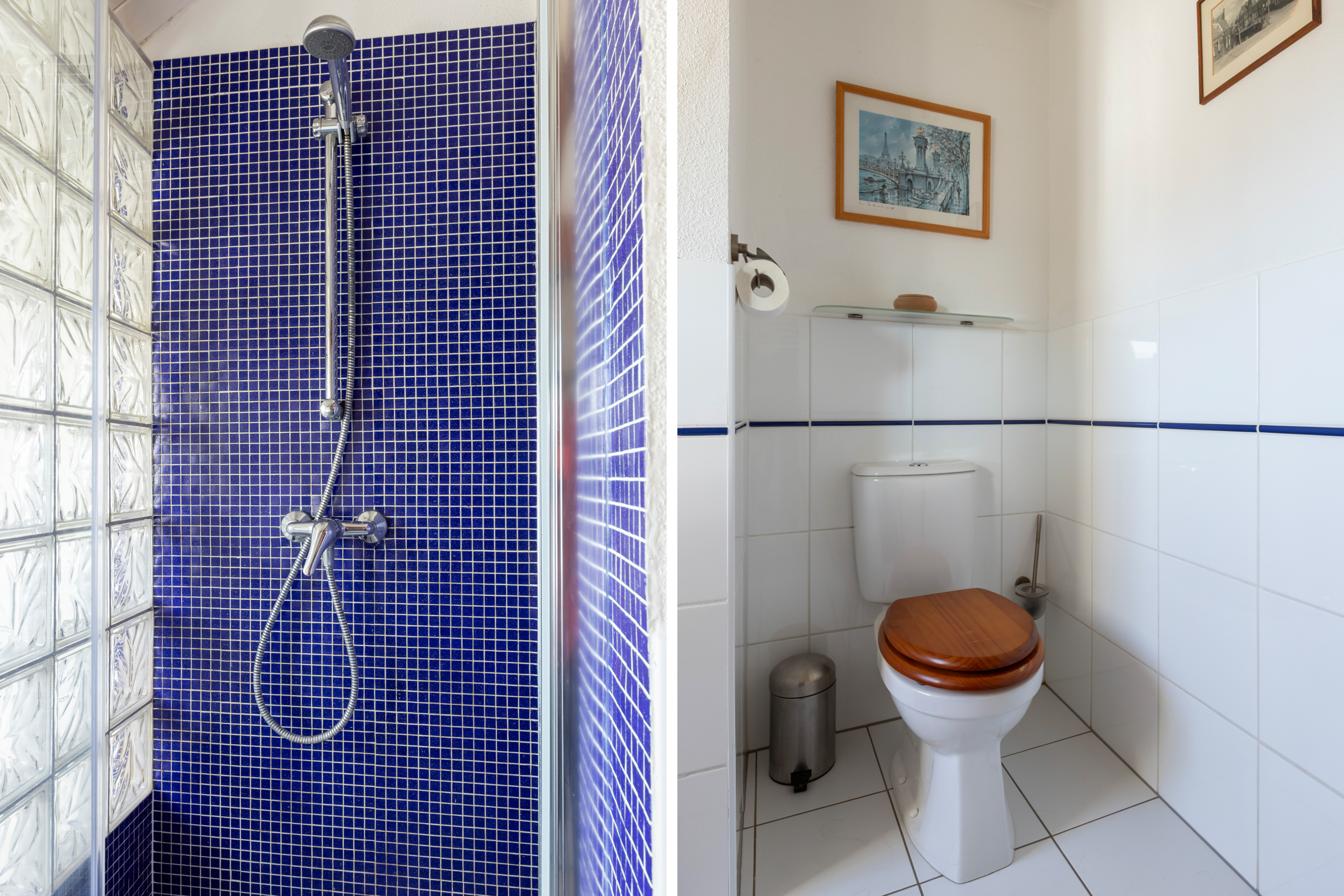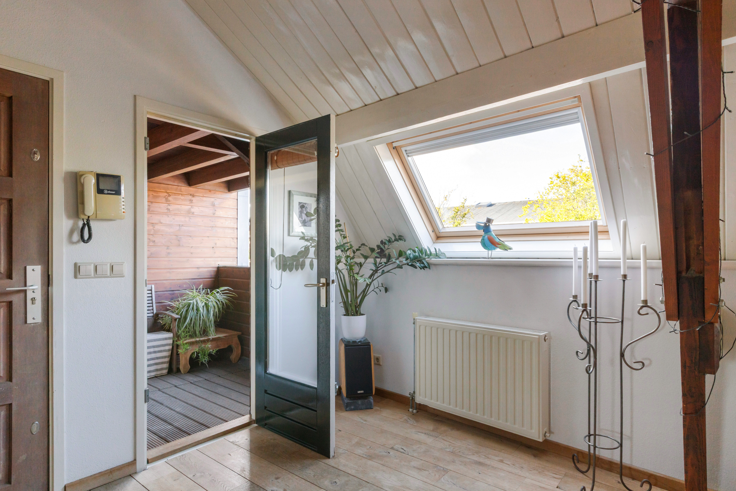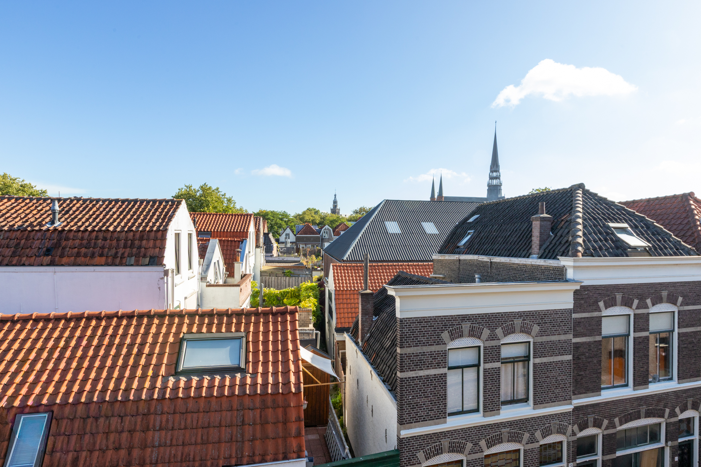 Tweede slaap-/werkkamer met dakraam. Badkamer, fris wit betegeld en deels met blauwe mozaiek betegeling. De badkamer is voorzien van een ligbad, douchehoek, wastafel met meubel en toilet, opstelplaats voor de wasmachine. Dakraam met zicht over de mooie binnenstad.