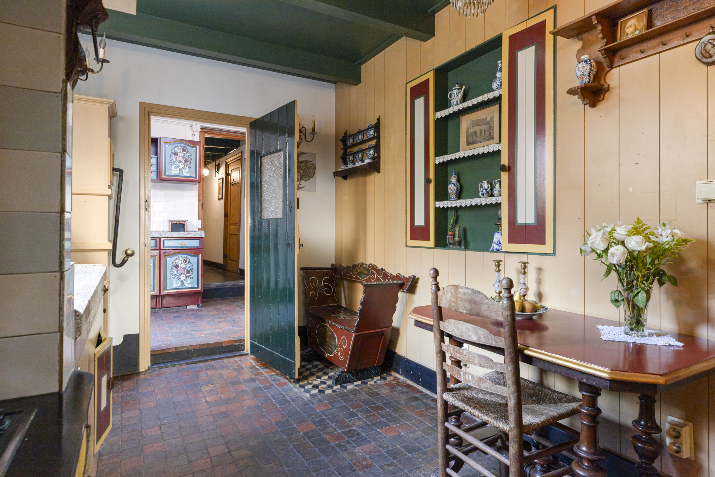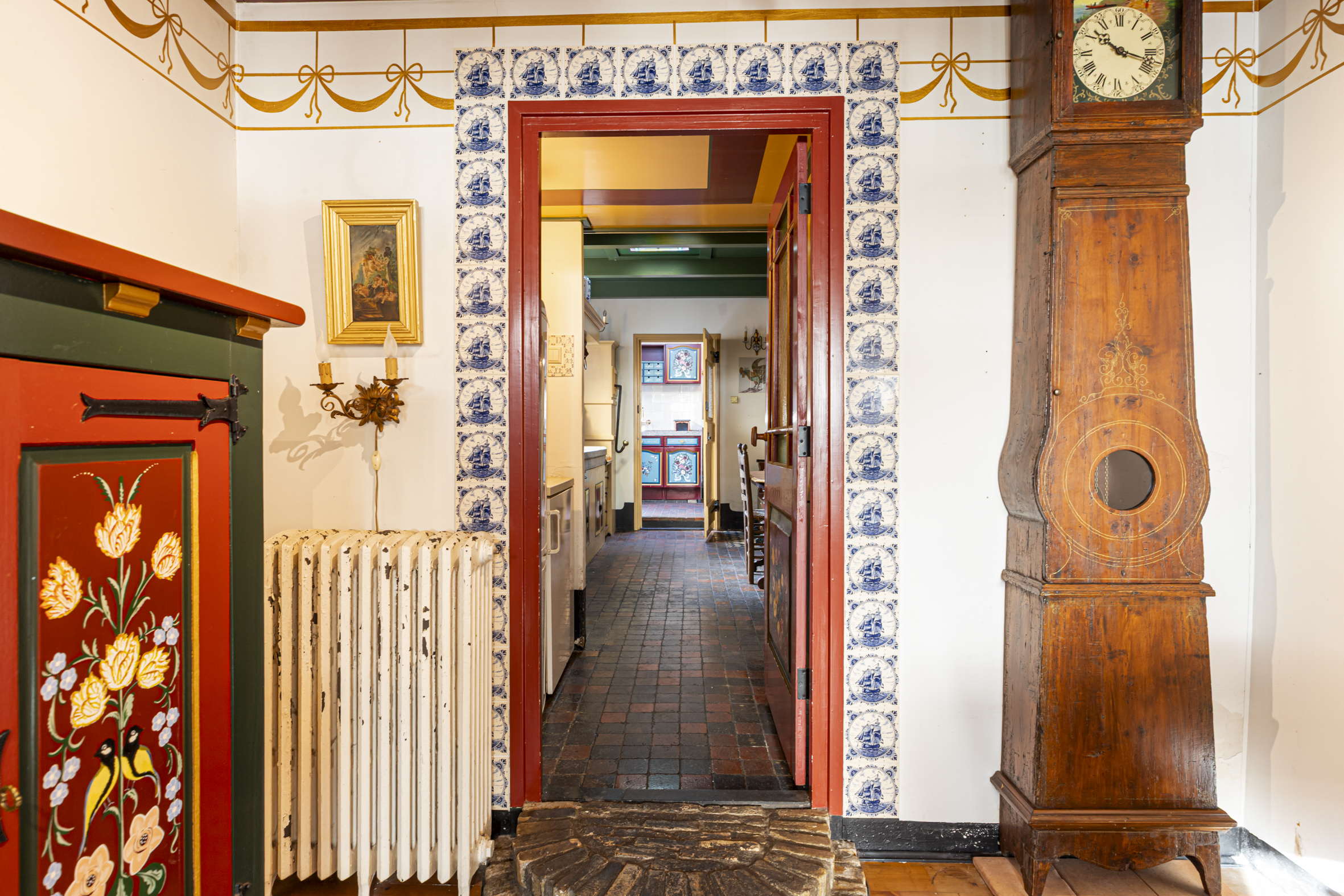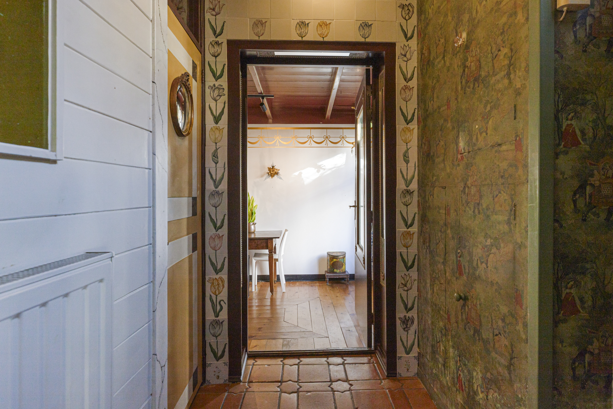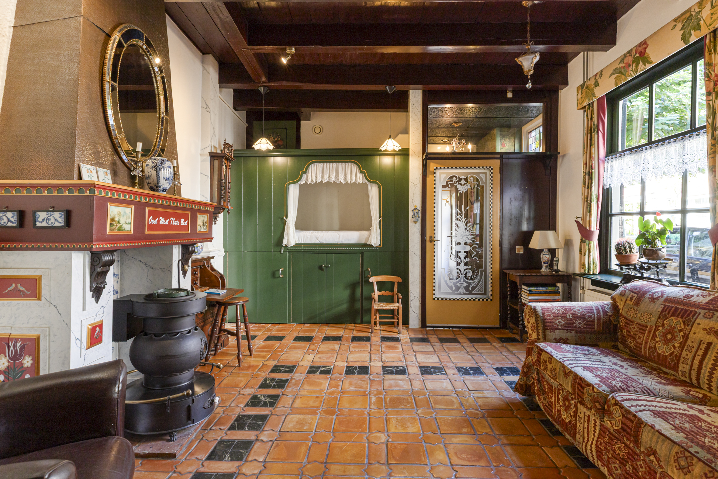 begane grond: entree, hal met meterkast en bijzonder Delftsblauw toilet. Aan de linkerkant bevindt zich de gezellige woonkamer met schouw en potkachel, een bedstee, balkenplafond en bijzondere tegelvloer. Open spiltrap naar de 1e verdieping. De ruimte aan de rechterzijde is in gebruik als eetkamer met eveneens een balkenplafond. Via 2 treden bereik je de sfeervolle keuken met veel authentieke elementen, zoals de schouw, de houten betimmering, het granito aanrechtblad en de tegelvloer. Trap naar de 1e verdieping. Via de keuken kom je in de bijkeuken met ook een granito aanrechtblad, een lichtkoepel, een lange gang en de deur naar de tuin.