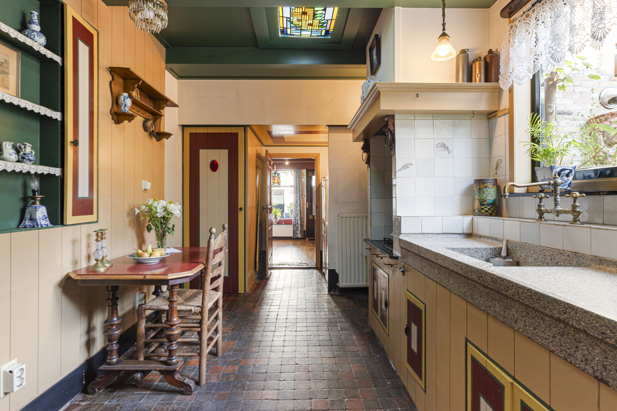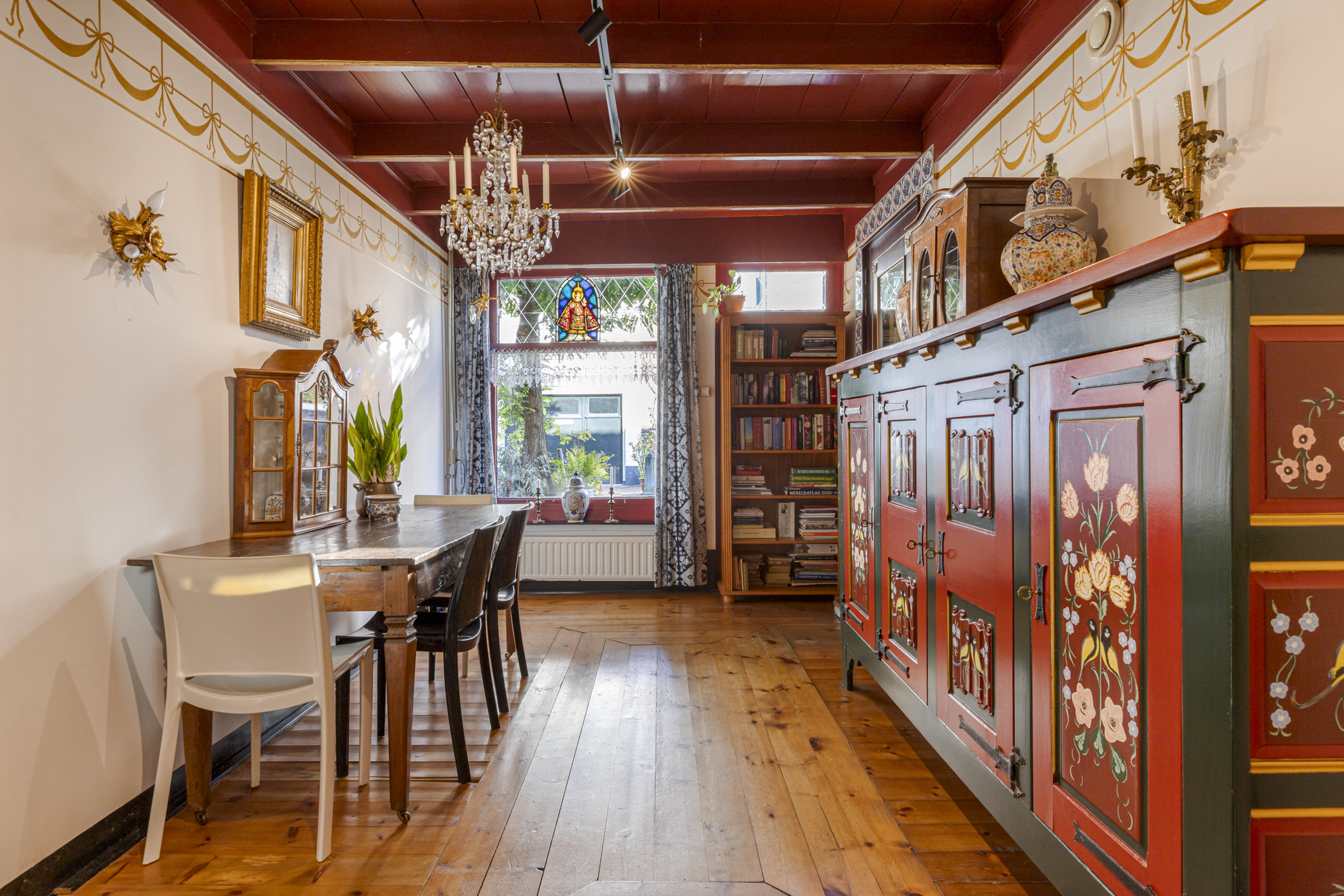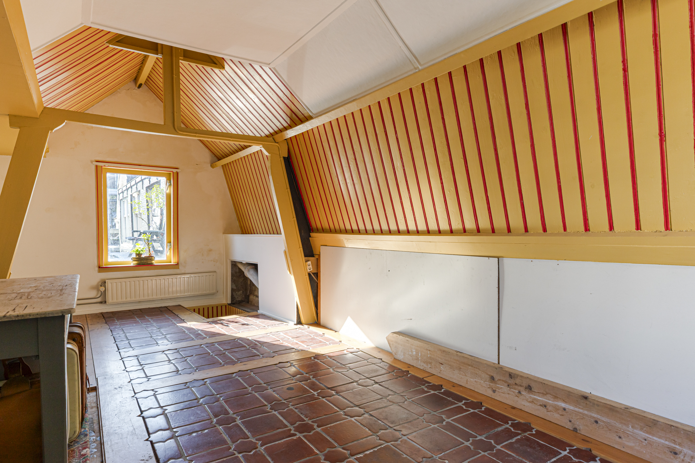 begane grond: entree, hal met meterkast en bijzonder Delftsblauw toilet. Aan de linkerkant bevindt zich de gezellige woonkamer met schouw en potkachel, een bedstee, balkenplafond en bijzondere tegelvloer. Open spiltrap naar de 1e verdieping. De ruimte aan de rechterzijde is in gebruik als eetkamer met eveneens een balkenplafond. Via 2 treden bereik je de sfeervolle keuken met veel authentieke elementen, zoals de schouw, de houten betimmering, het granito aanrechtblad en de tegelvloer. Trap naar de 1e verdieping. Via de keuken kom je in de bijkeuken met ook een granito aanrechtblad, een lichtkoepel, een lange gang en de deur naar de tuin.