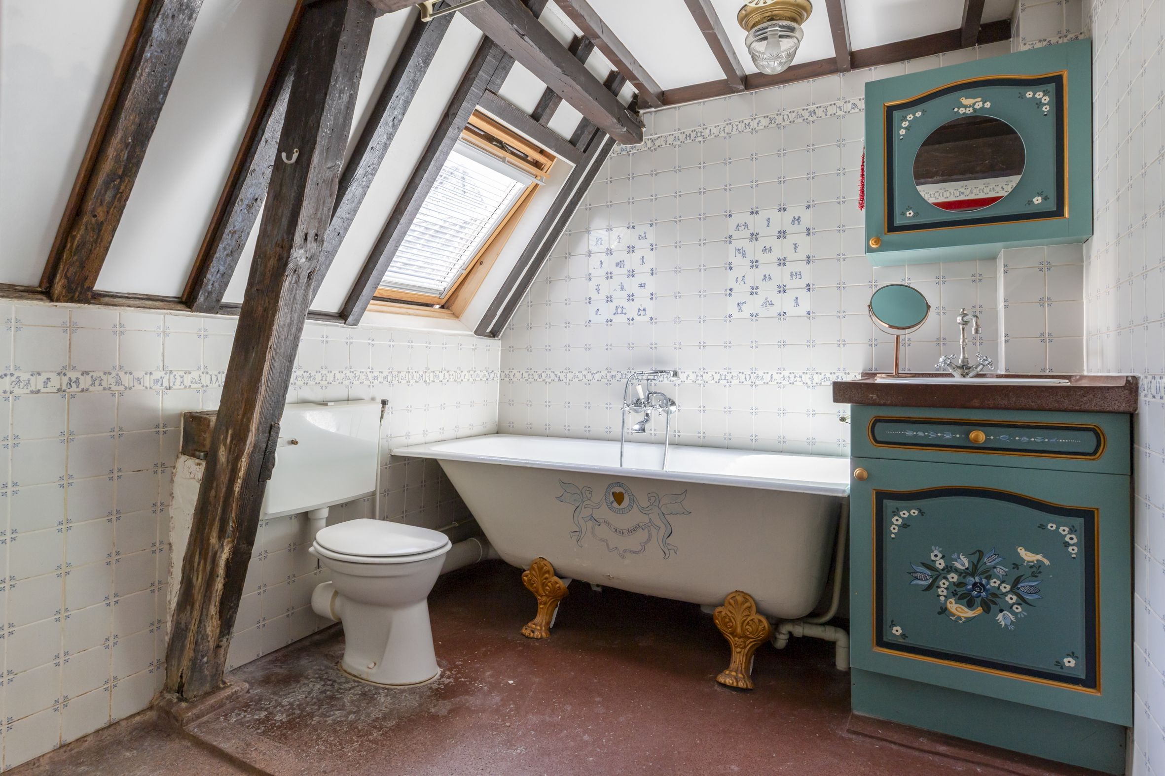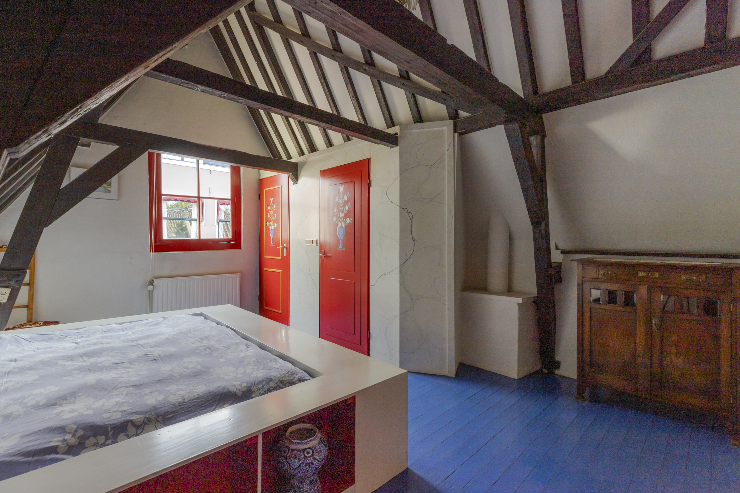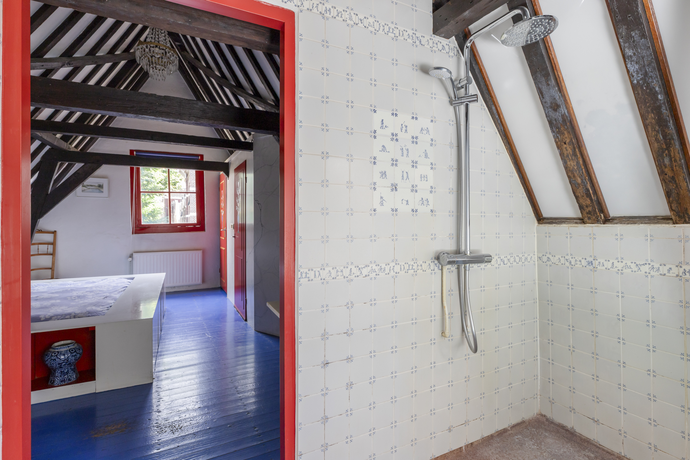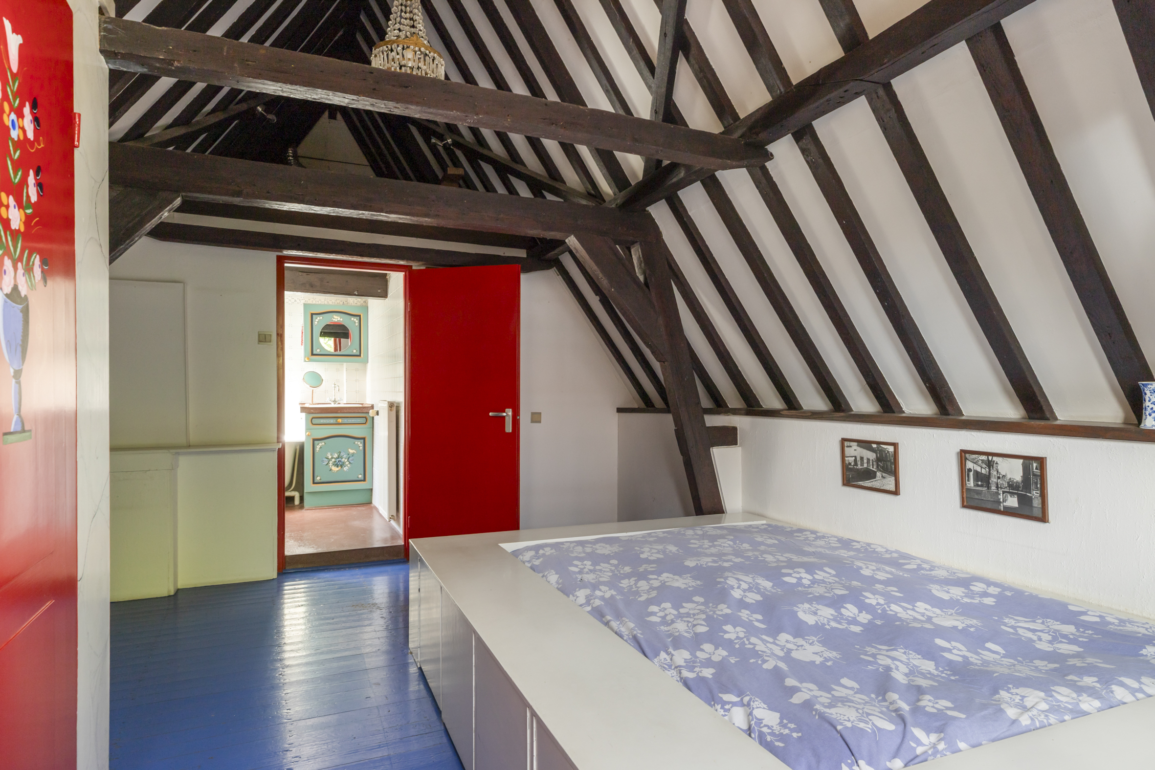 1e verdieping: links: grote open slaapkamer met vaste kast en de kapconstructie in het zicht. Aansluitend een extra (kleed)kamer met dakraam. Eenvoudige badkamer met rode, granitovloer, douche, toilet, bad op pootjes, een wastafel in een houten meubel en een dakraam.