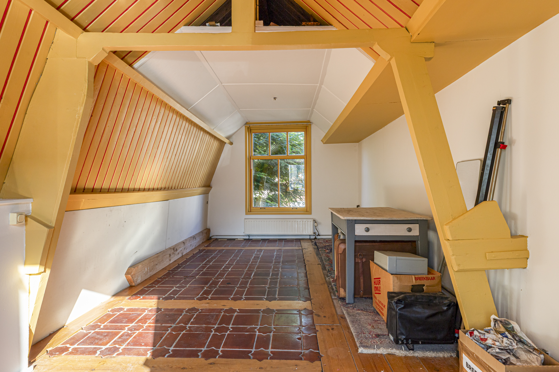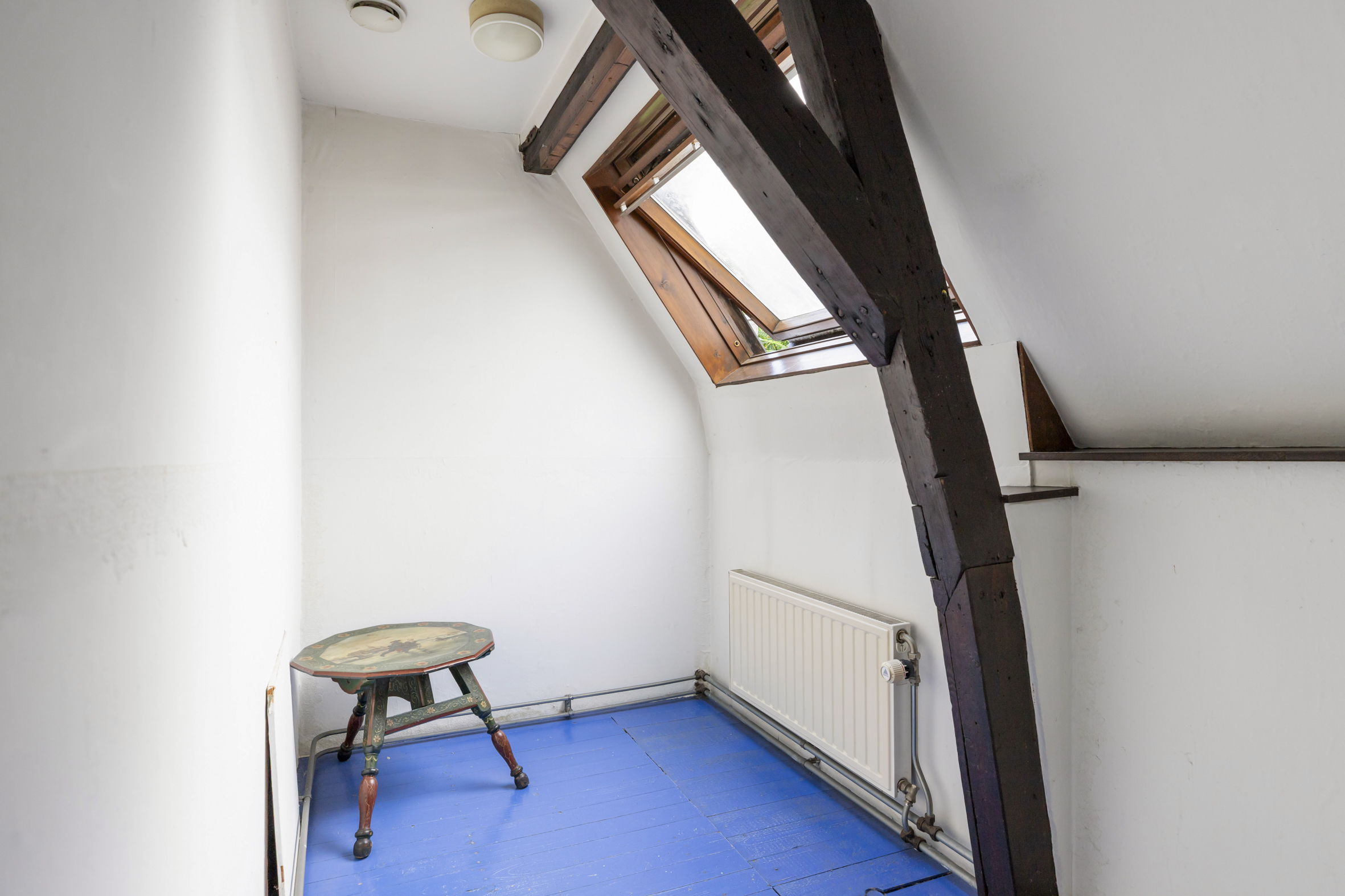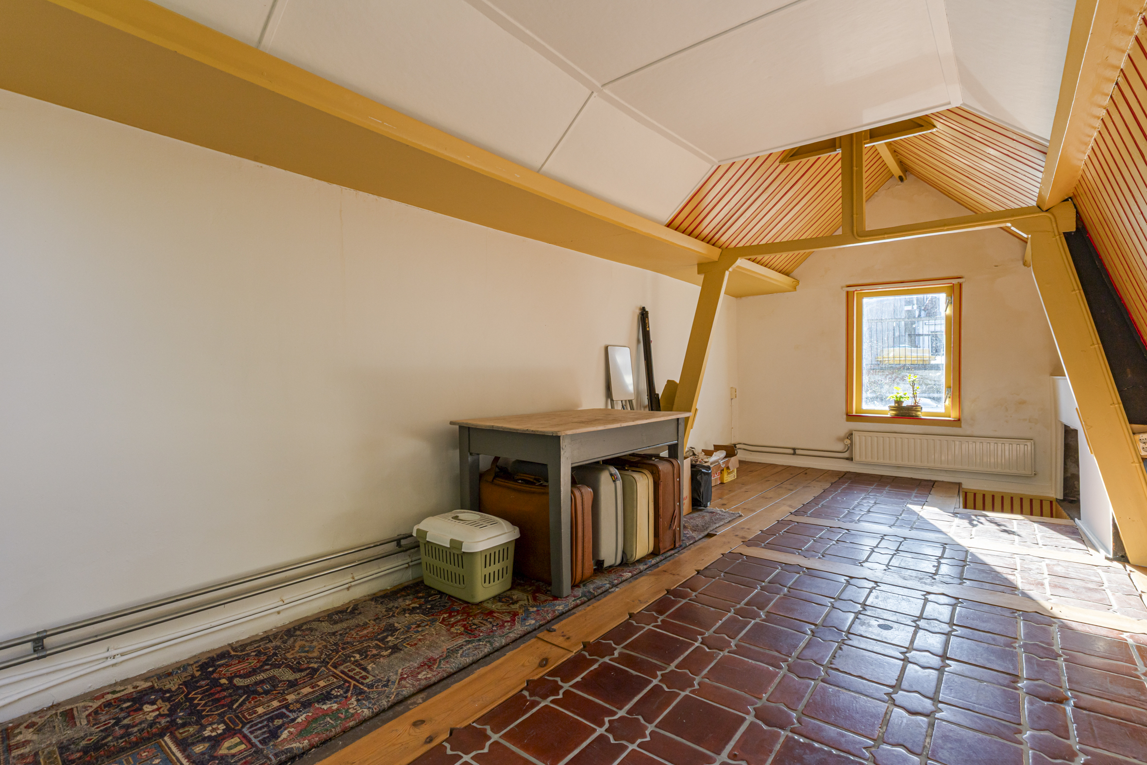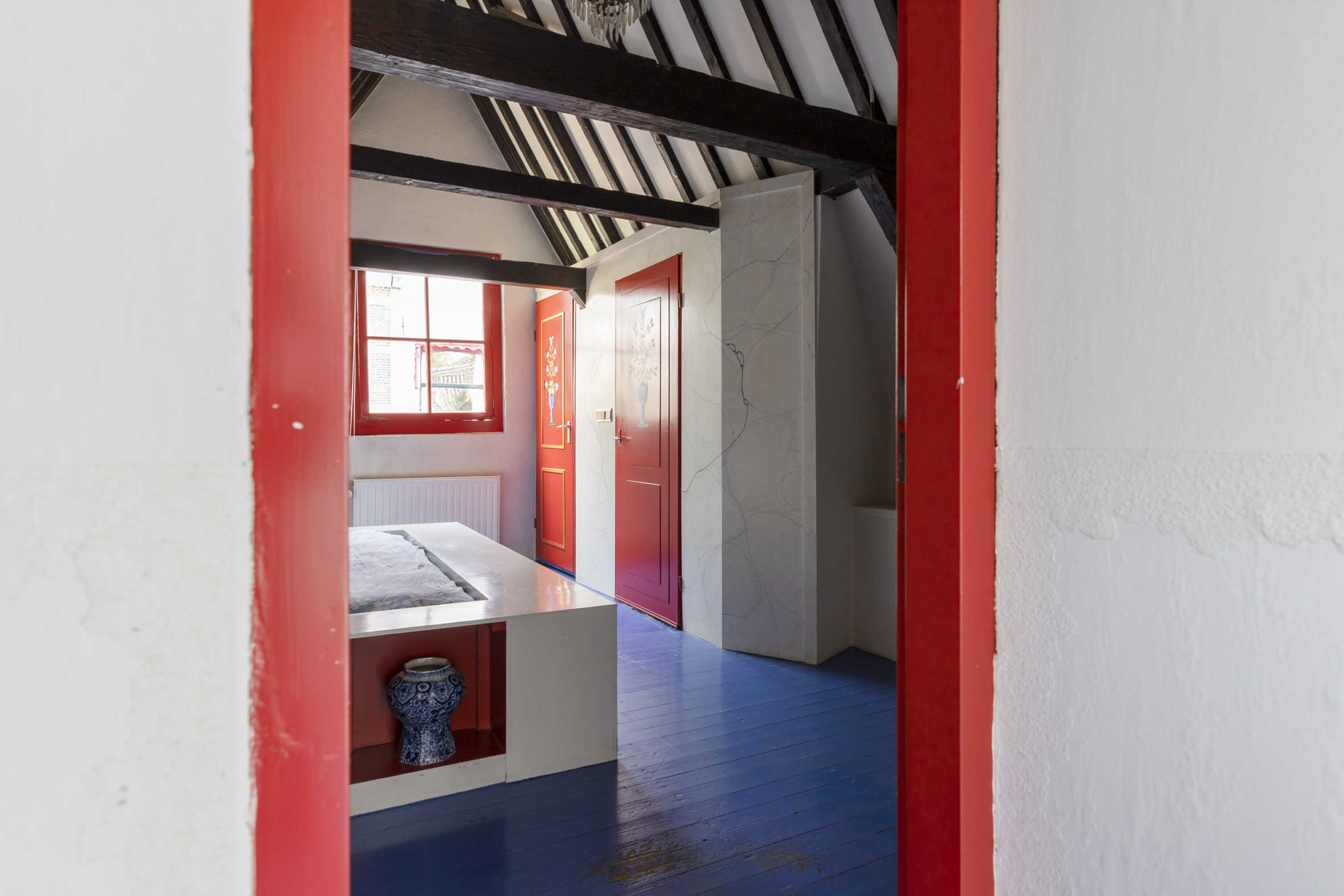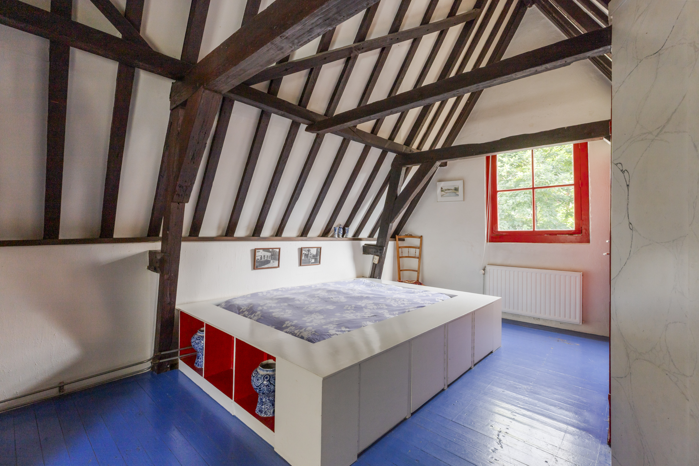 1e verdieping: links: grote open slaapkamer met vaste kast en de kapconstructie in het zicht. Aansluitend een extra (kleed)kamer met dakraam. Eenvoudige badkamer met rode, granitovloer, douche, toilet, bad op pootjes, een wastafel in een houten meubel en een dakraam.