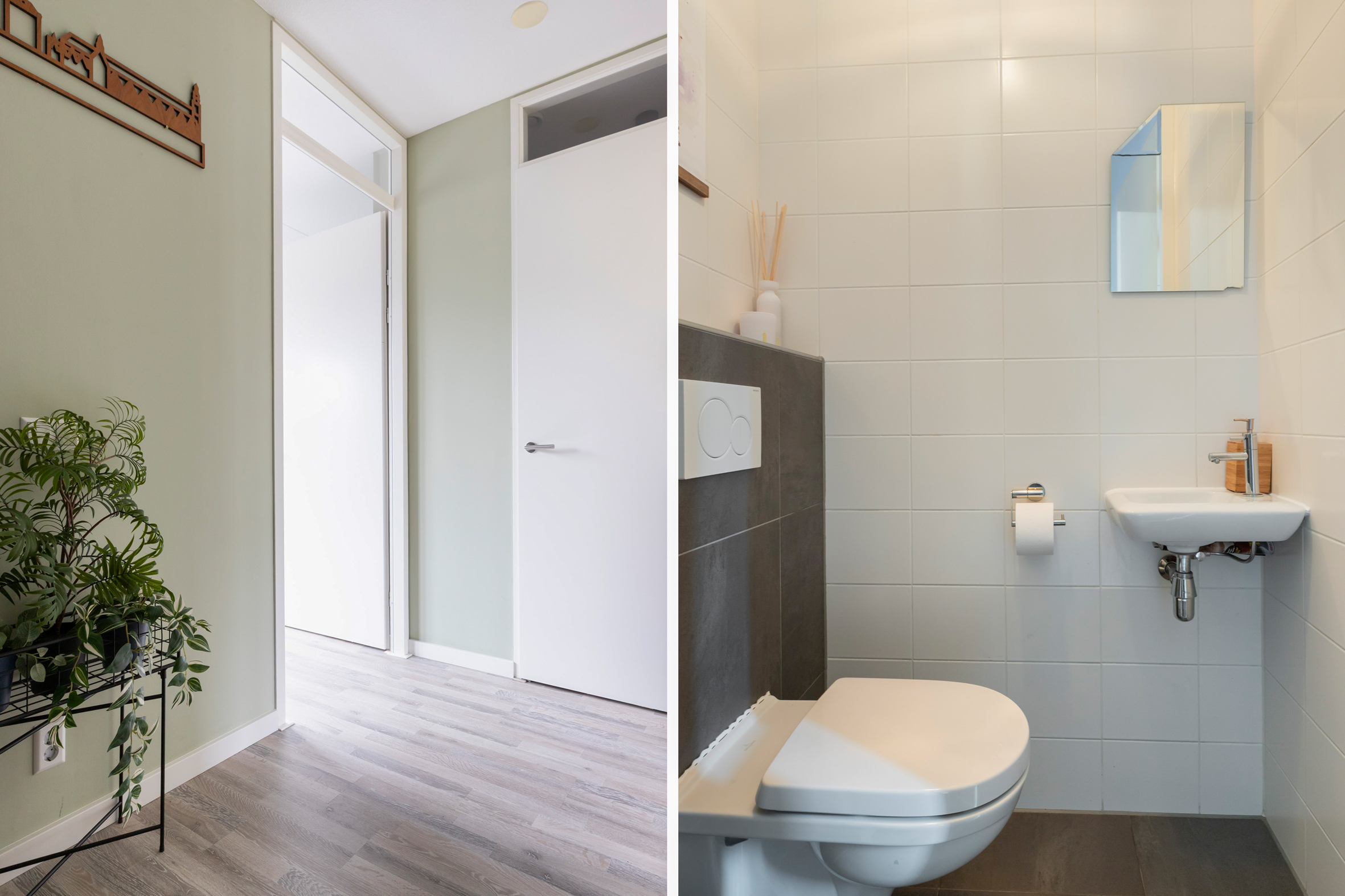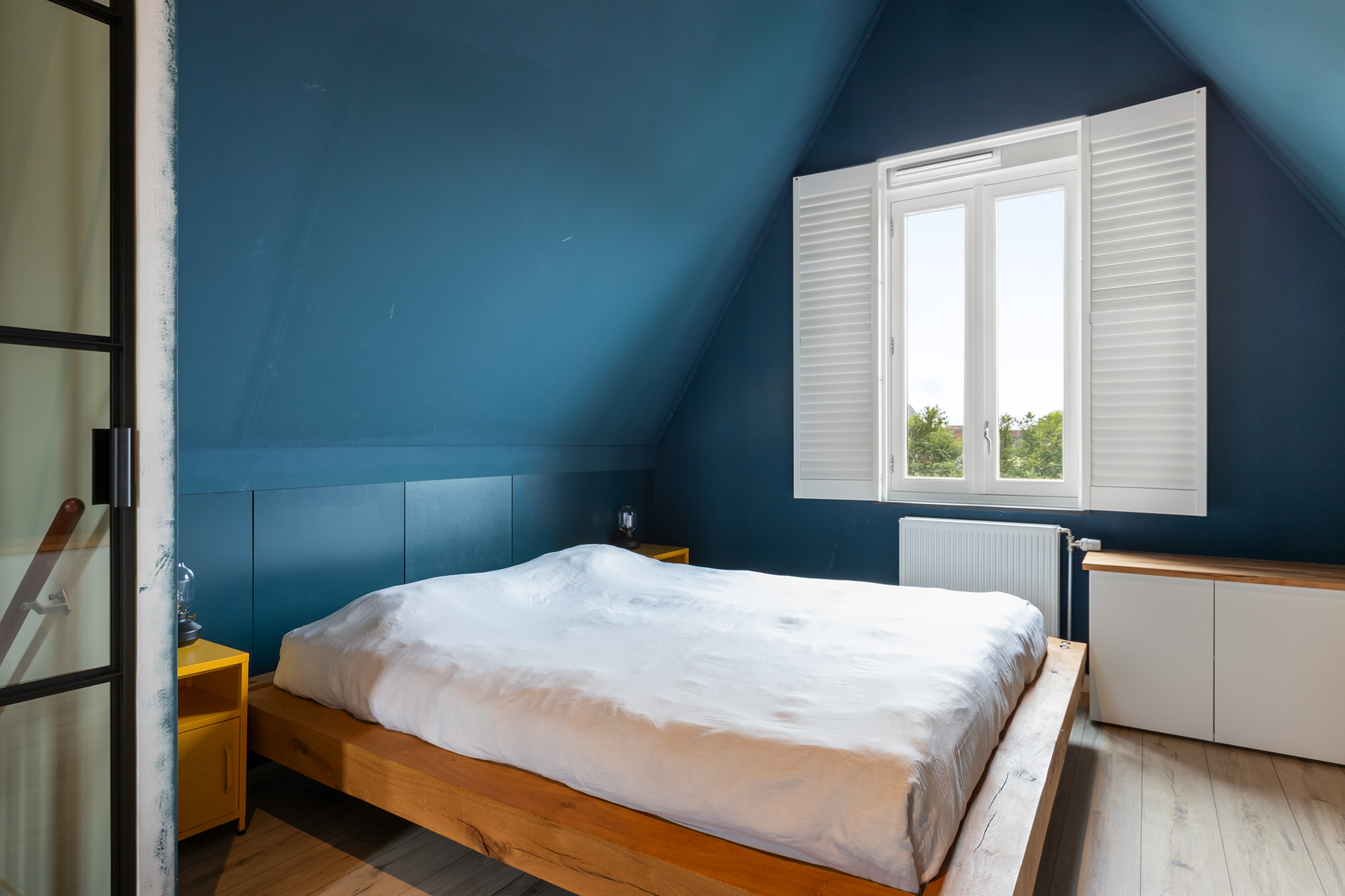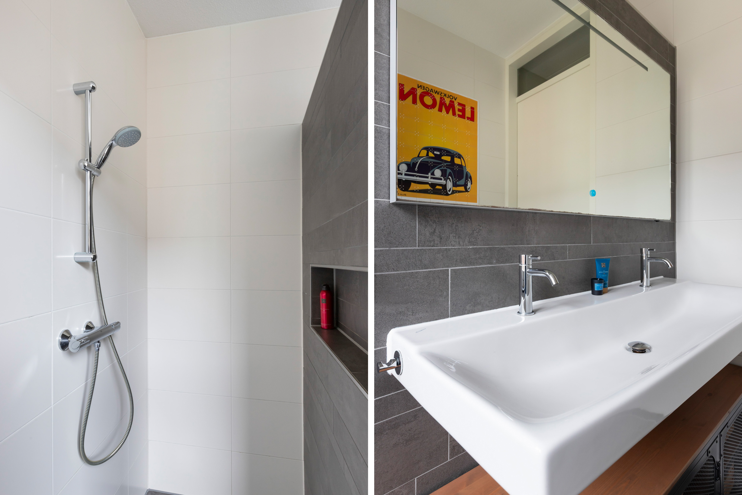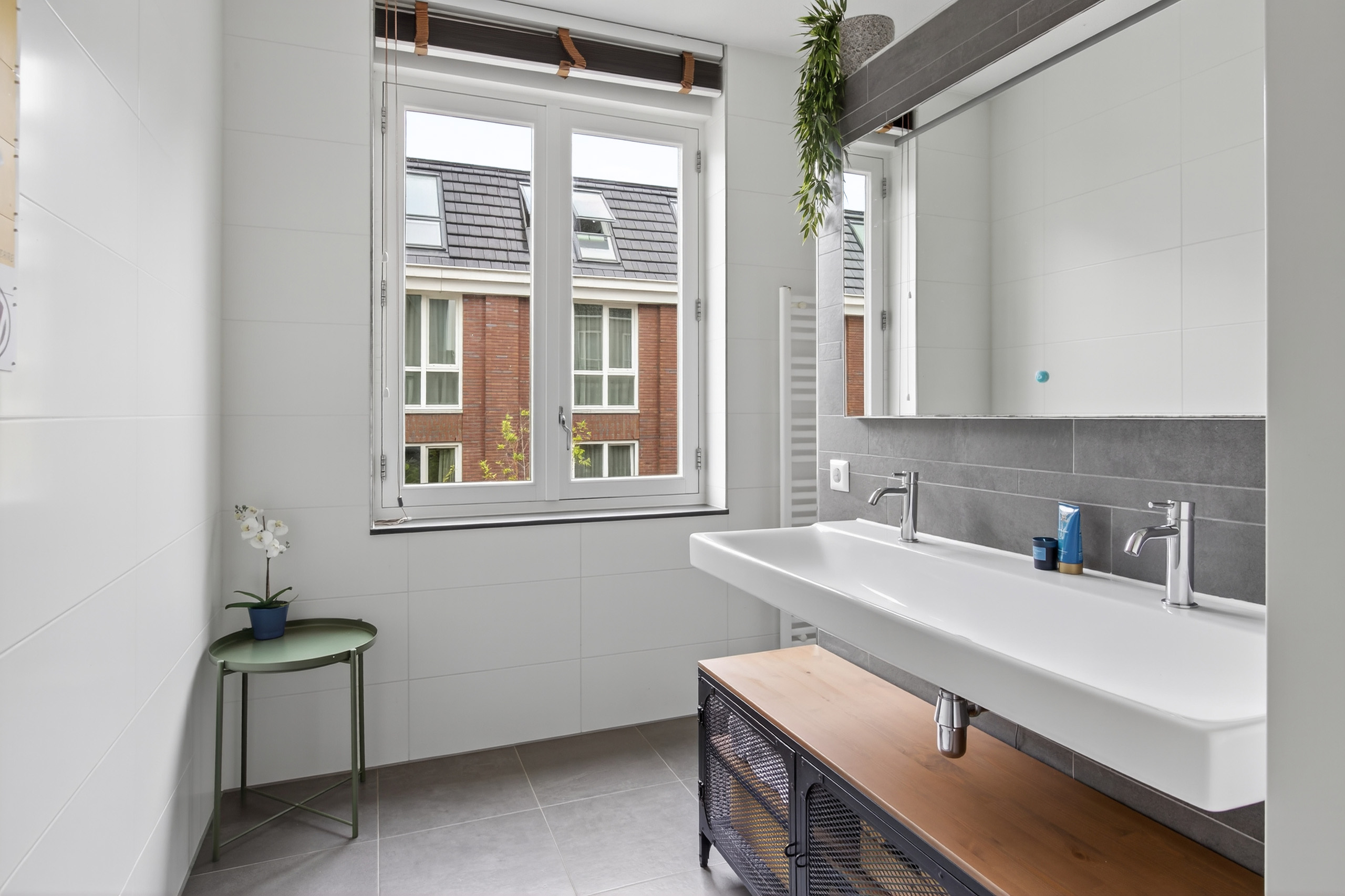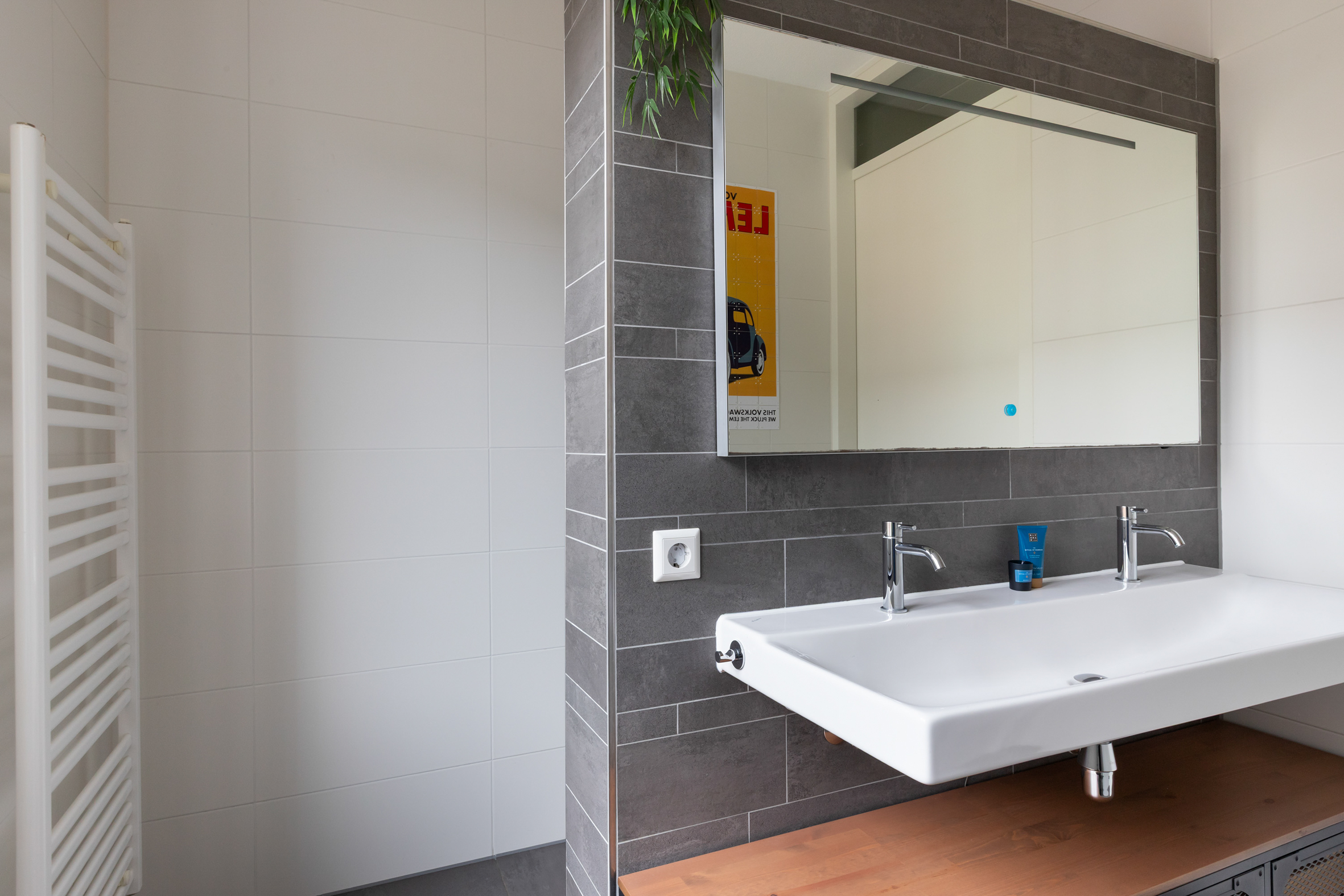 2e verdieping: overloop met toilet (hang), moderne badkamer (wit/antraciet betegeld) met inloopdouche, brede wastafel, designradiator en raam. Slaapkamer aan de voorzijde over de volle breedte van de woning en voorzien van 3 ramen. De slaapkamer aan de achterzijde heeft 2 grote ramen.