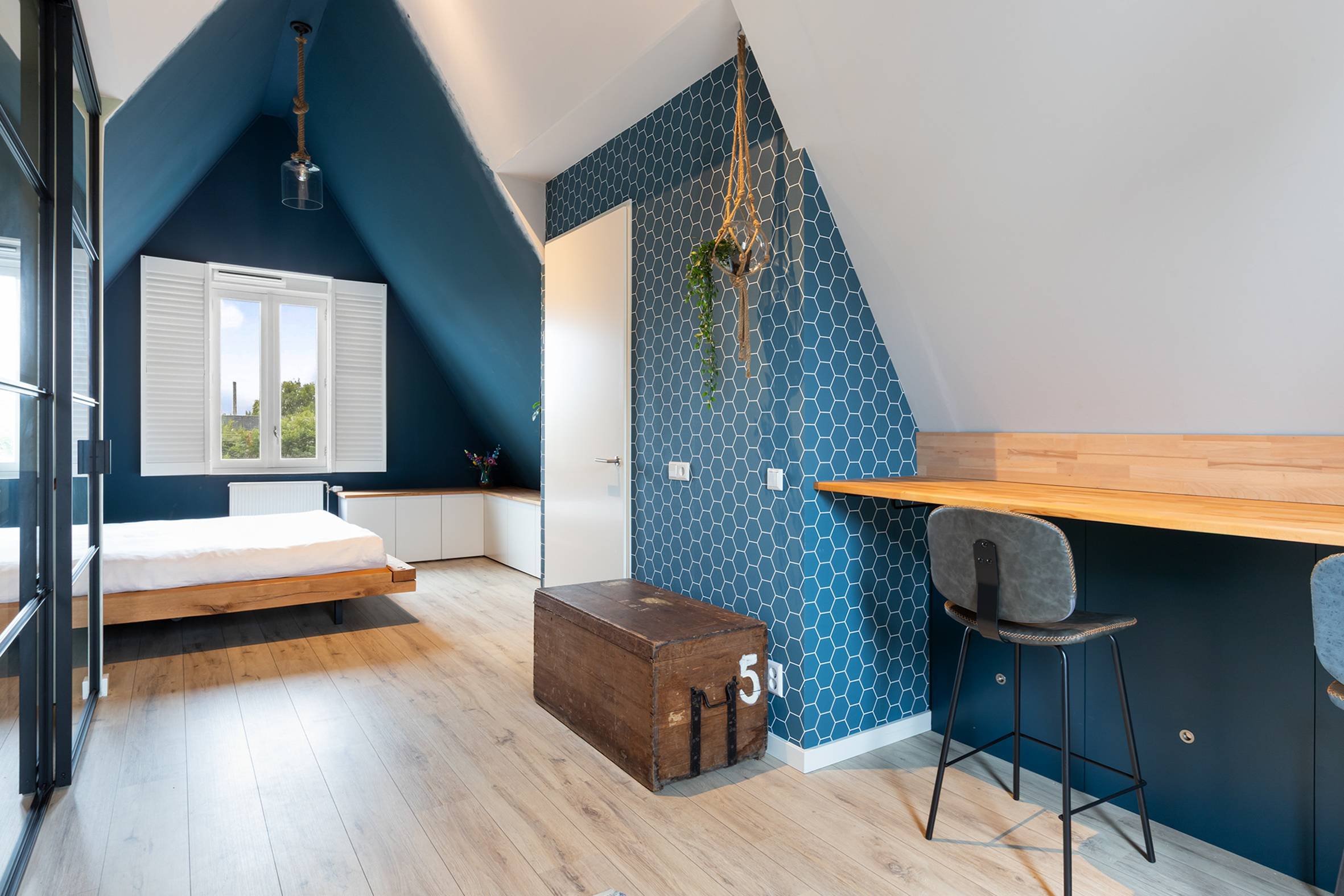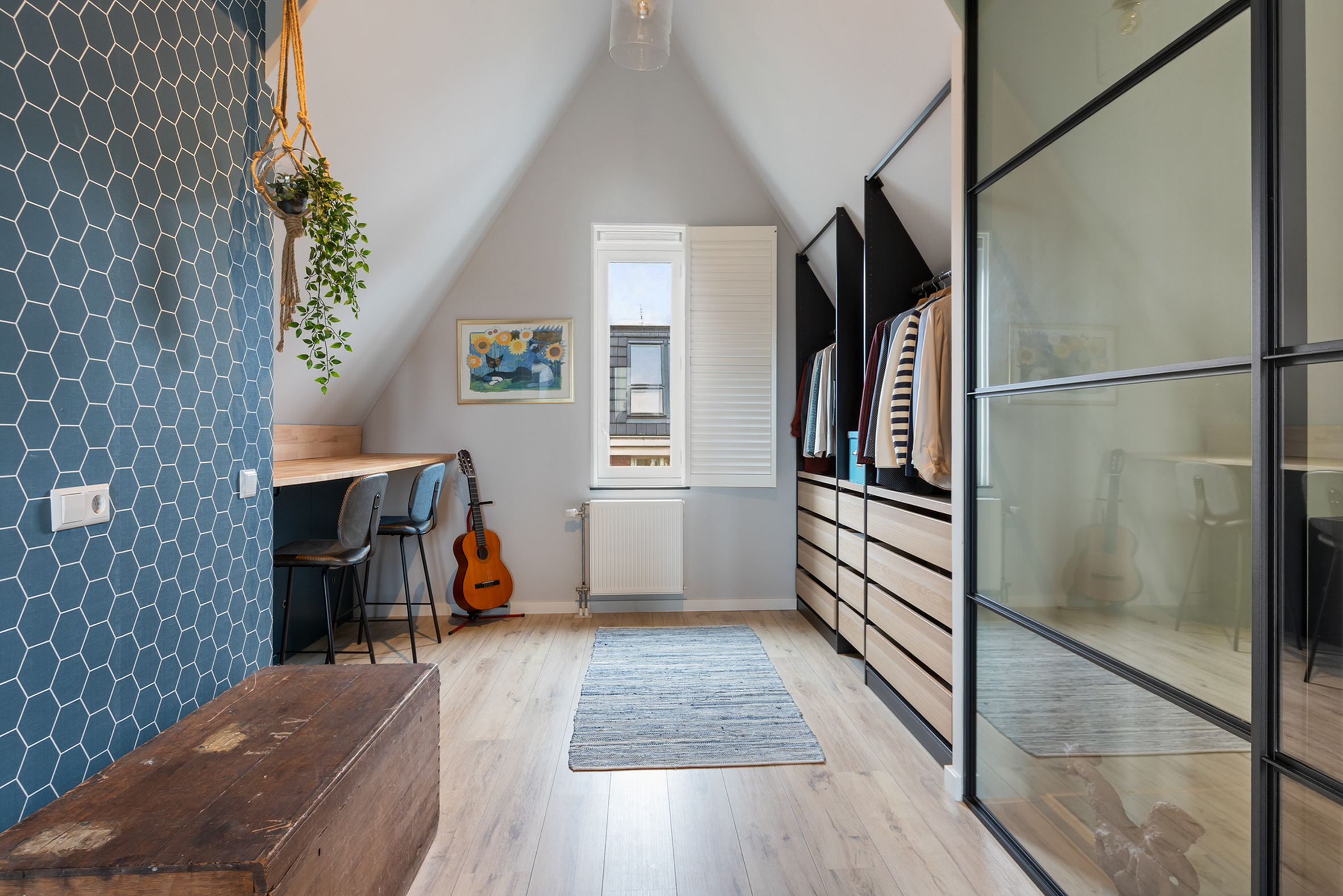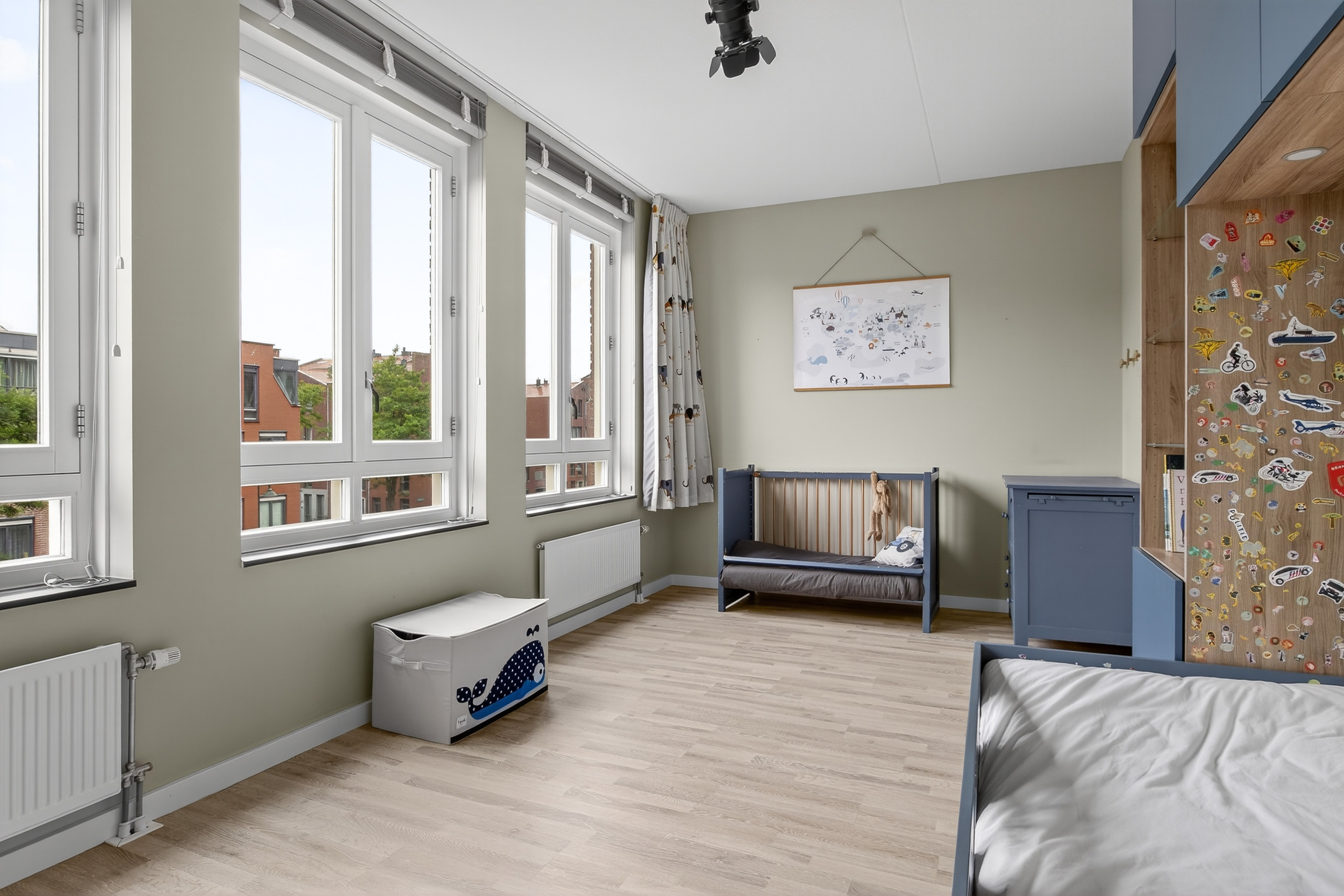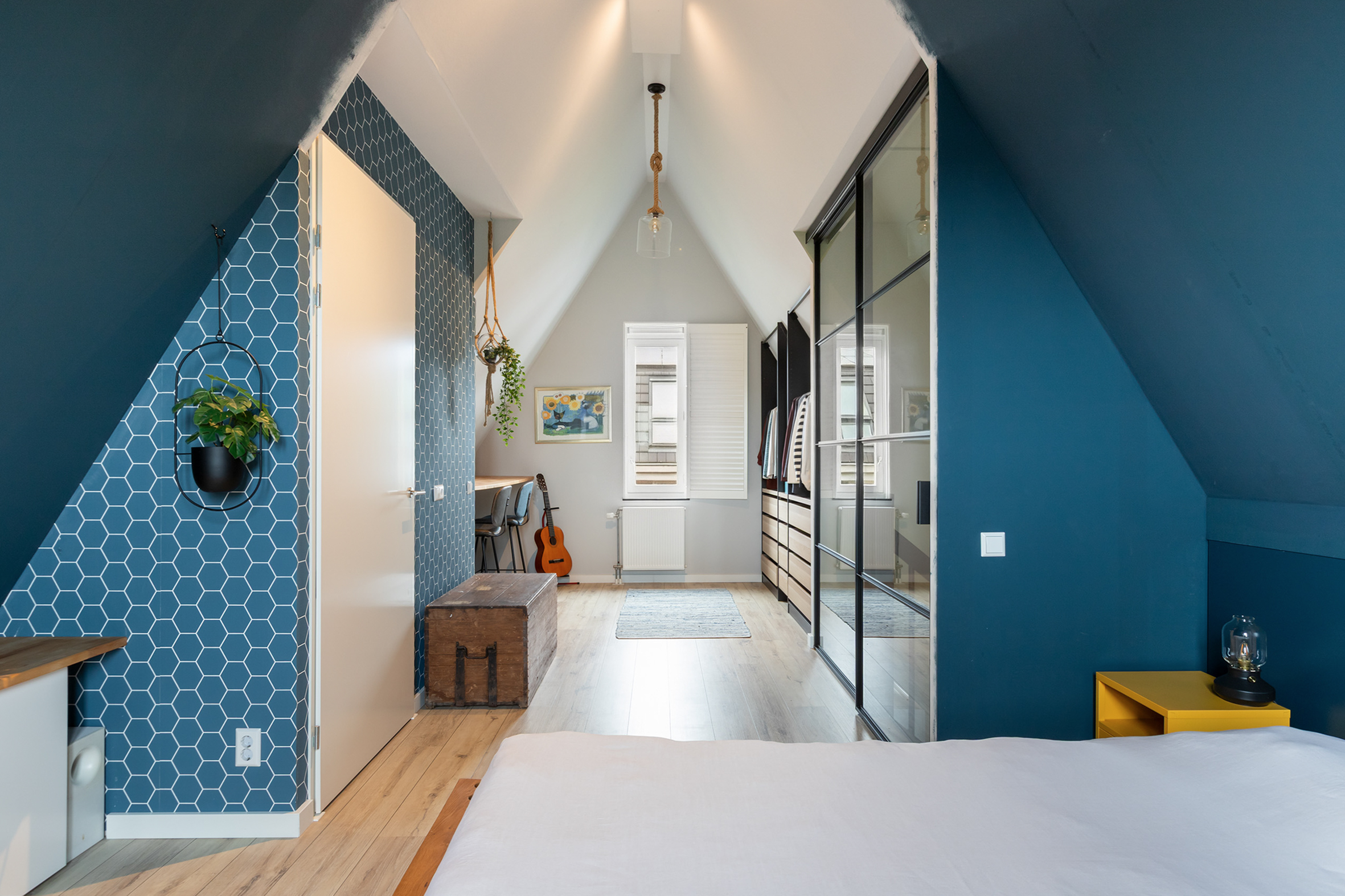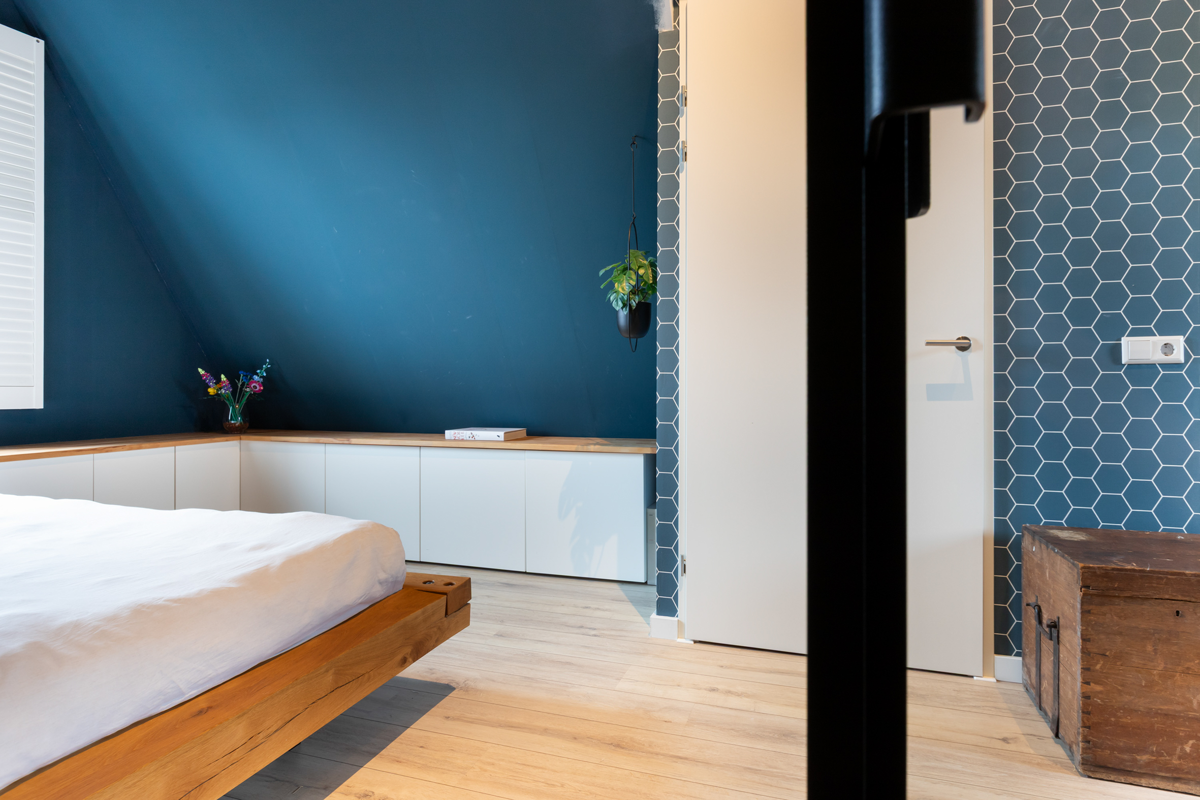 2e verdieping: overloop met toilet (hang), moderne badkamer (wit/antraciet betegeld) met inloopdouche, brede wastafel, designradiator en raam. Slaapkamer aan de voorzijde over de volle breedte van de woning en voorzien van 3 ramen. De slaapkamer aan de achterzijde heeft 2 grote ramen.