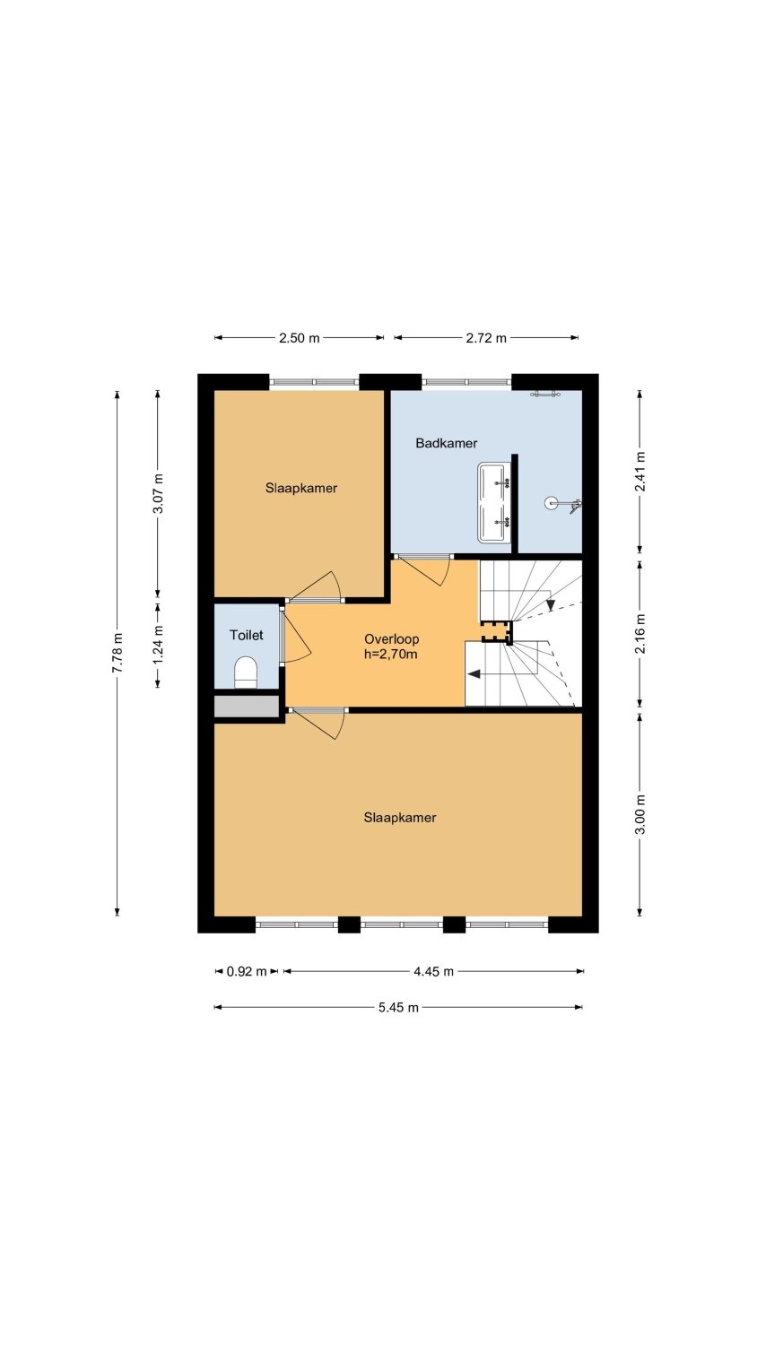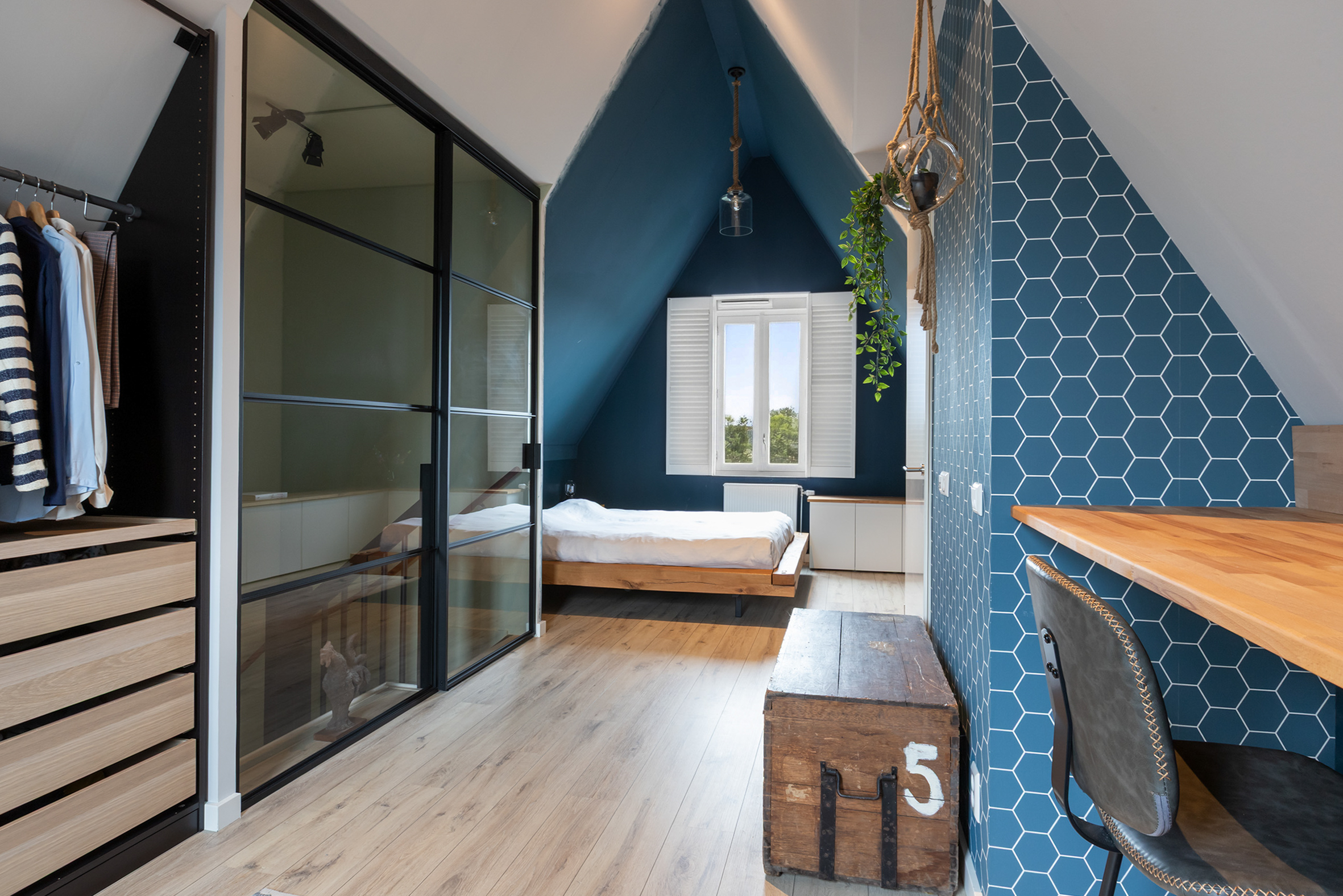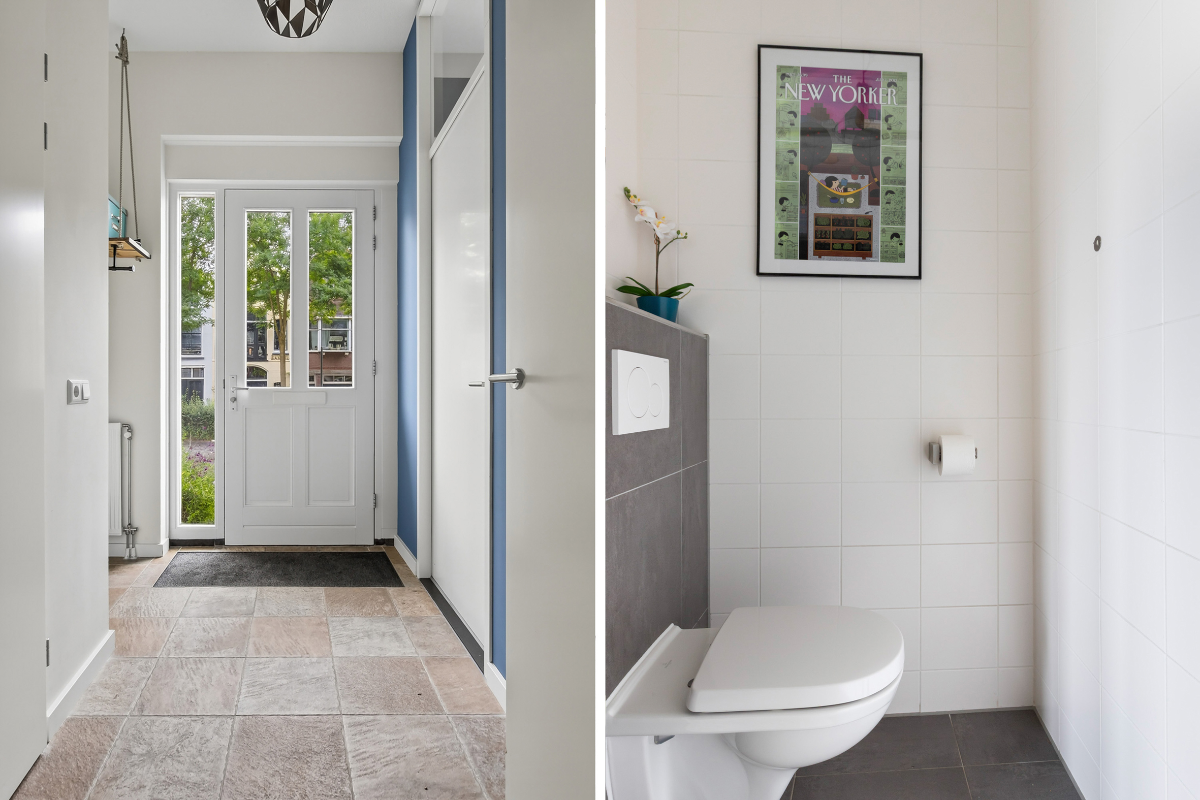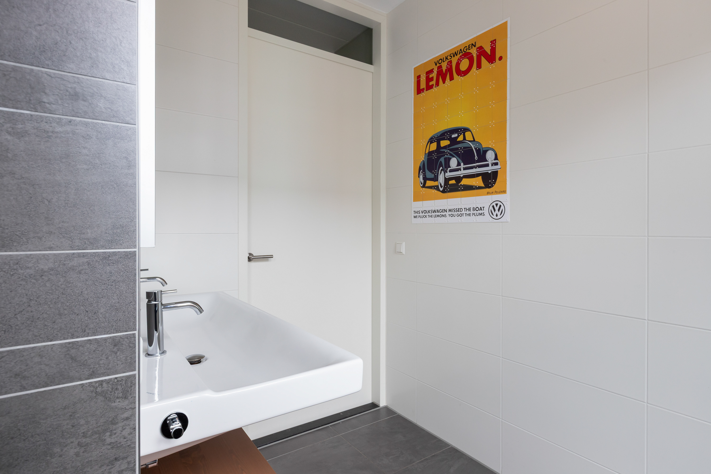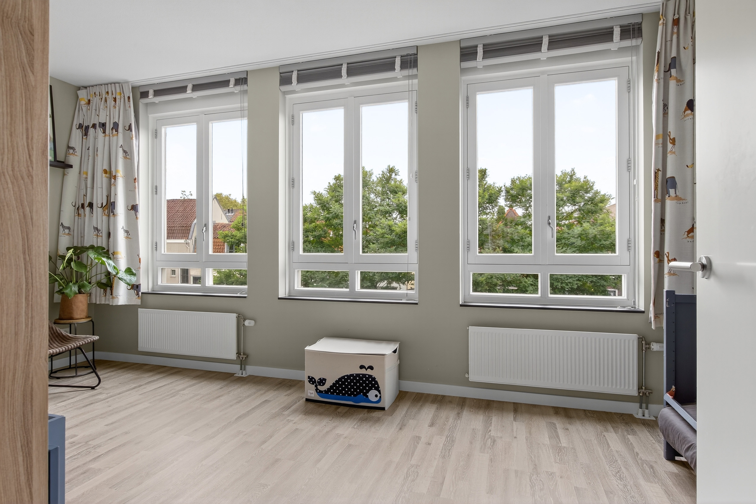 2e verdieping: overloop met toilet (hang), moderne badkamer (wit/antraciet betegeld) met inloopdouche, brede wastafel, designradiator en raam. Slaapkamer aan de voorzijde over de volle breedte van de woning en voorzien van 3 ramen. De slaapkamer aan de achterzijde heeft 2 grote ramen.