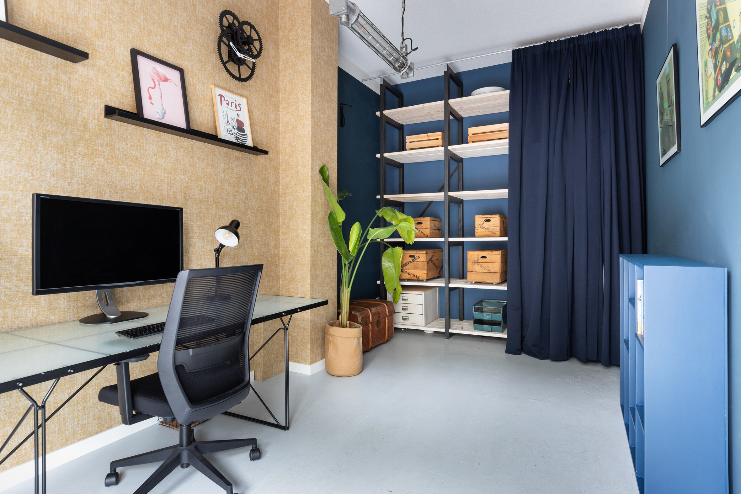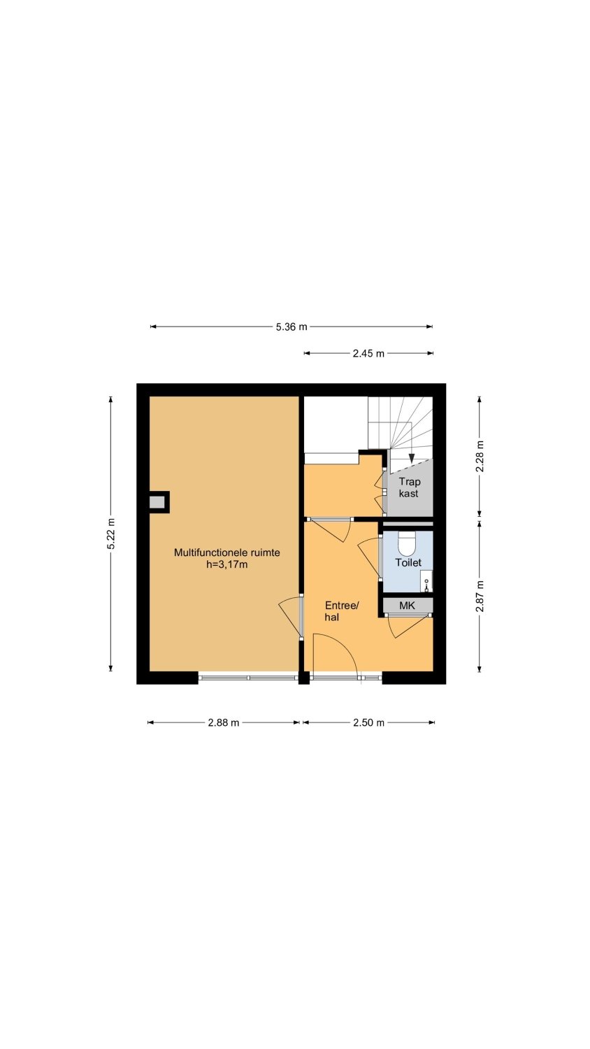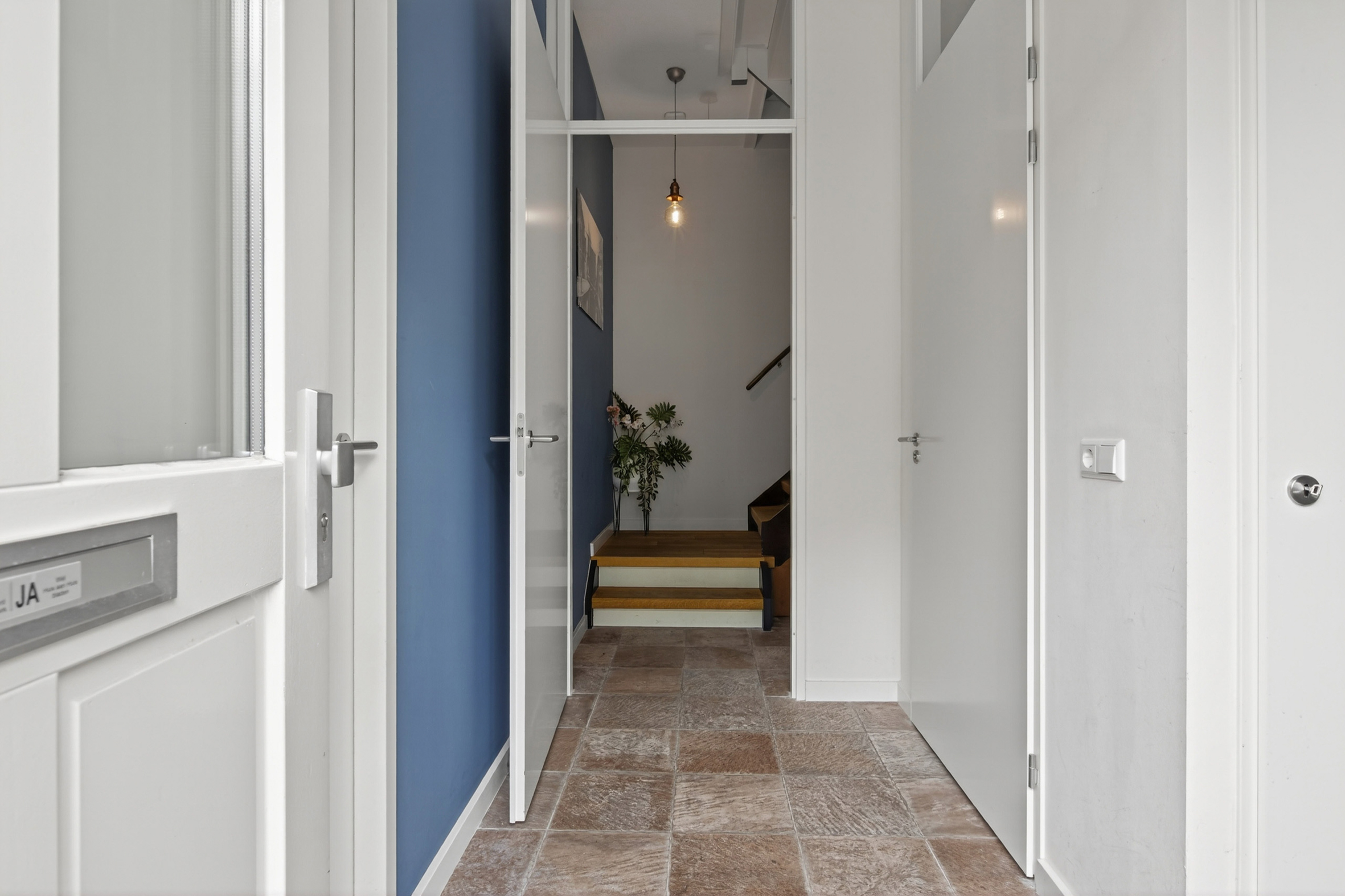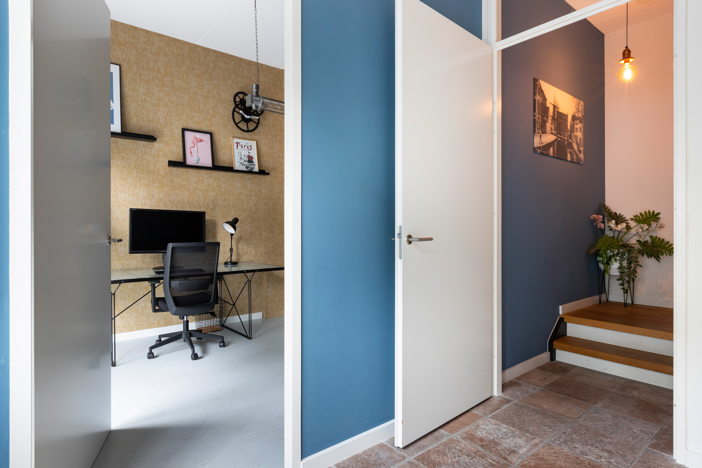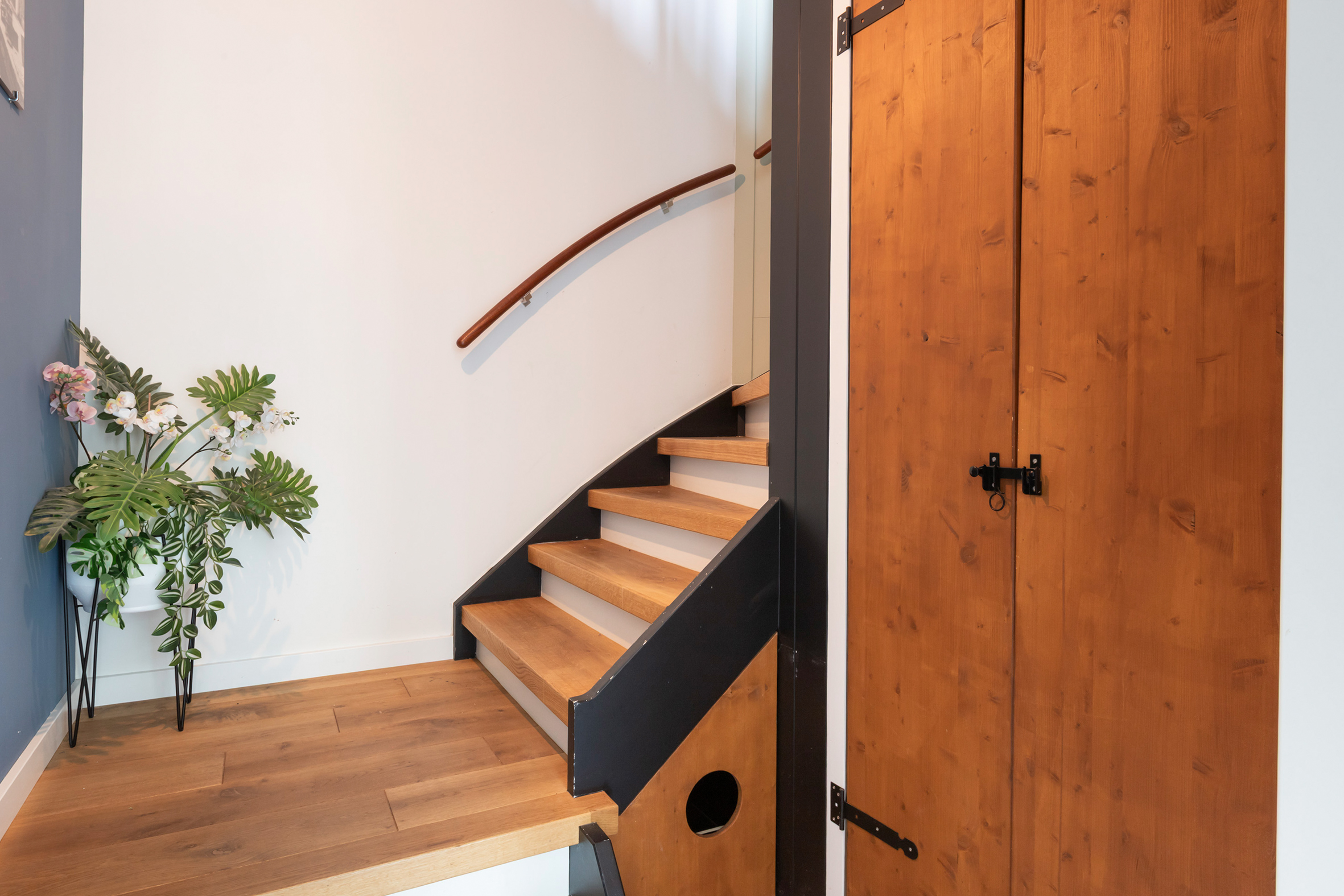 begane grond: entree, hal met meterkast, toilet (hangend) + fontein, werk-/slaapkamer met chipwood vloer (grijs) en bergruimte. Bordestrap naar de...