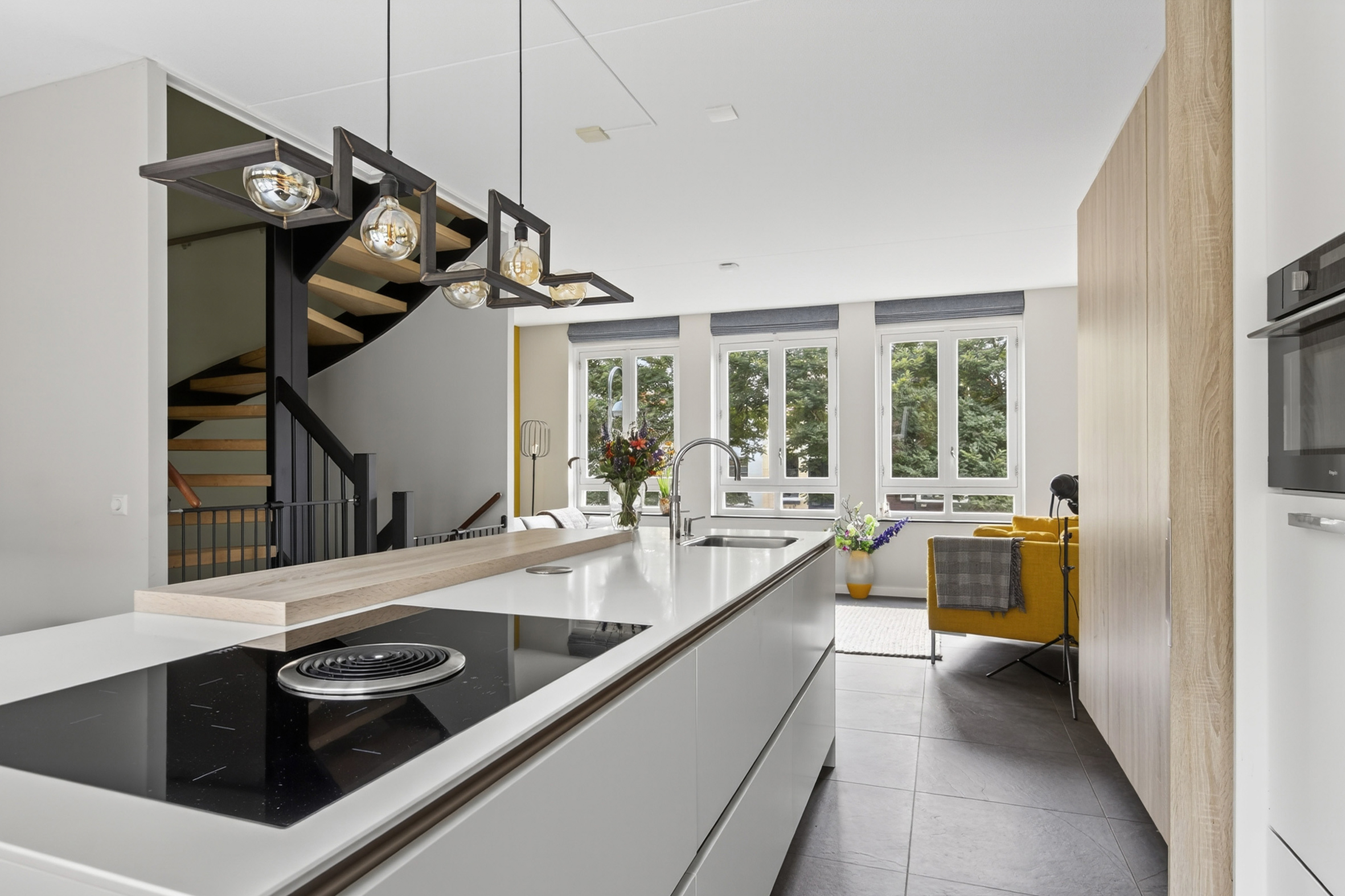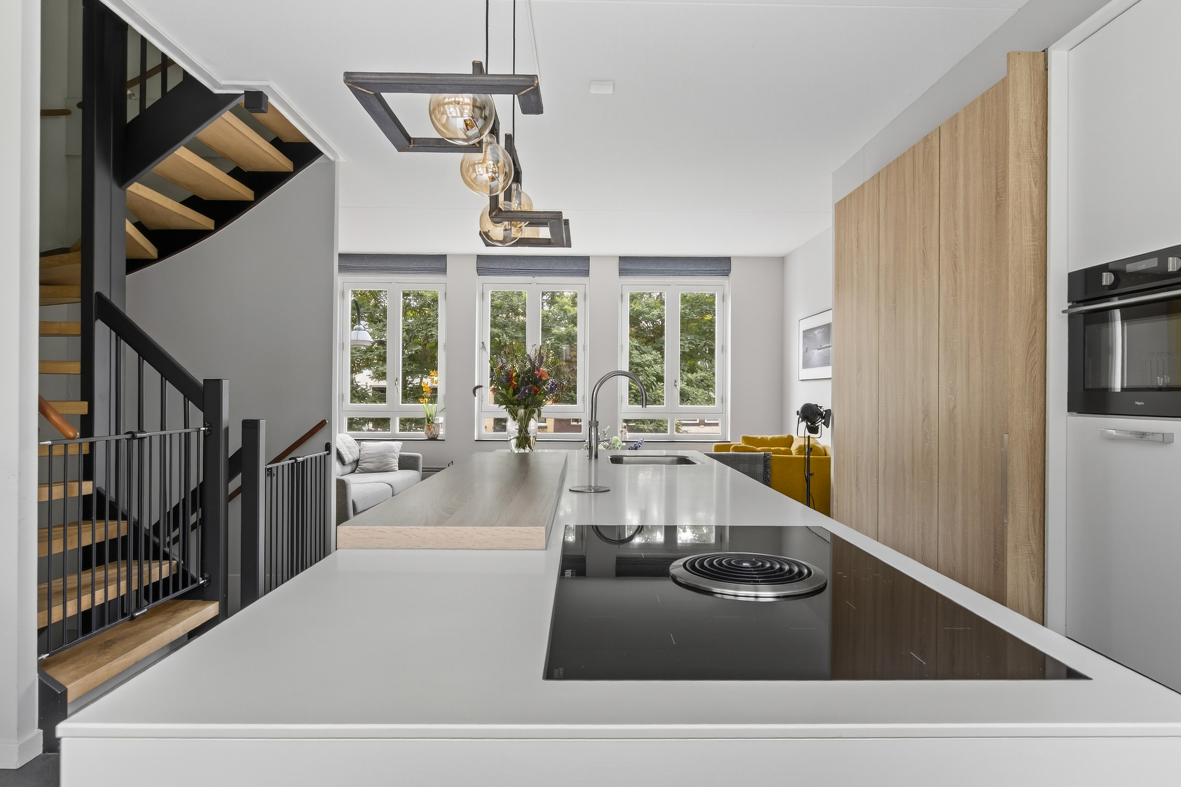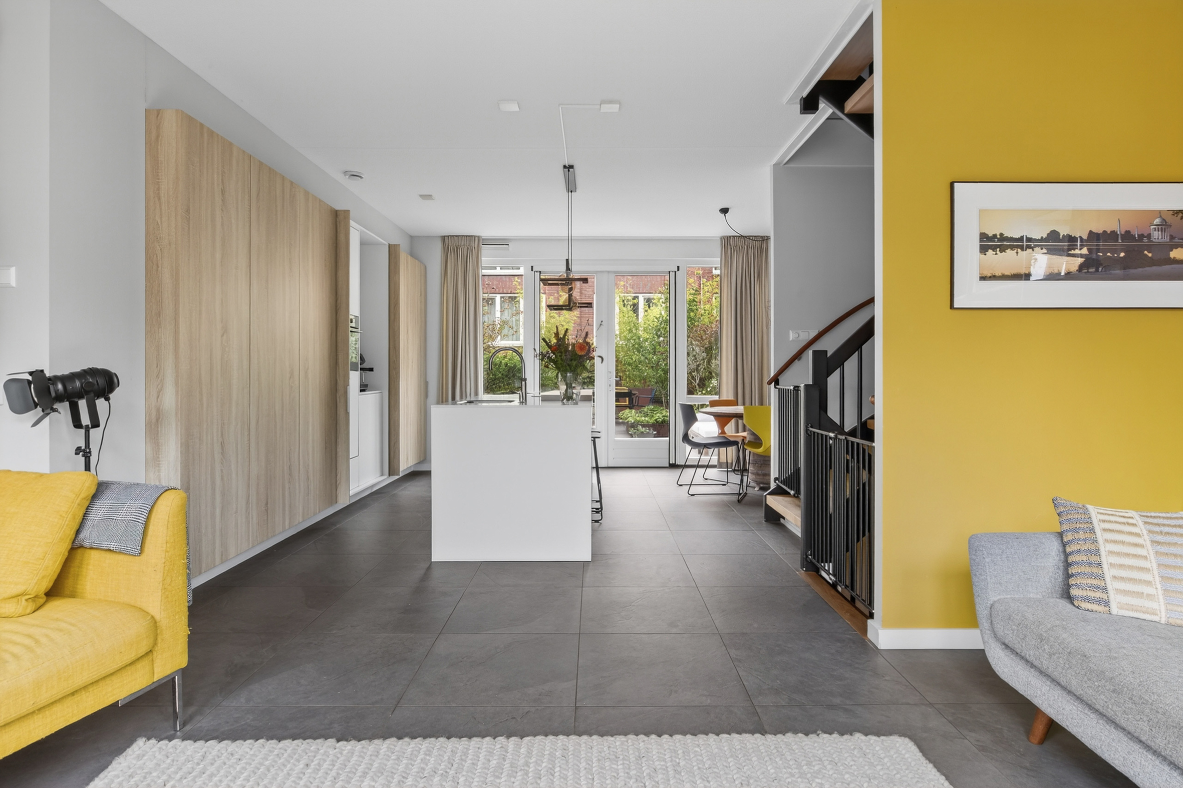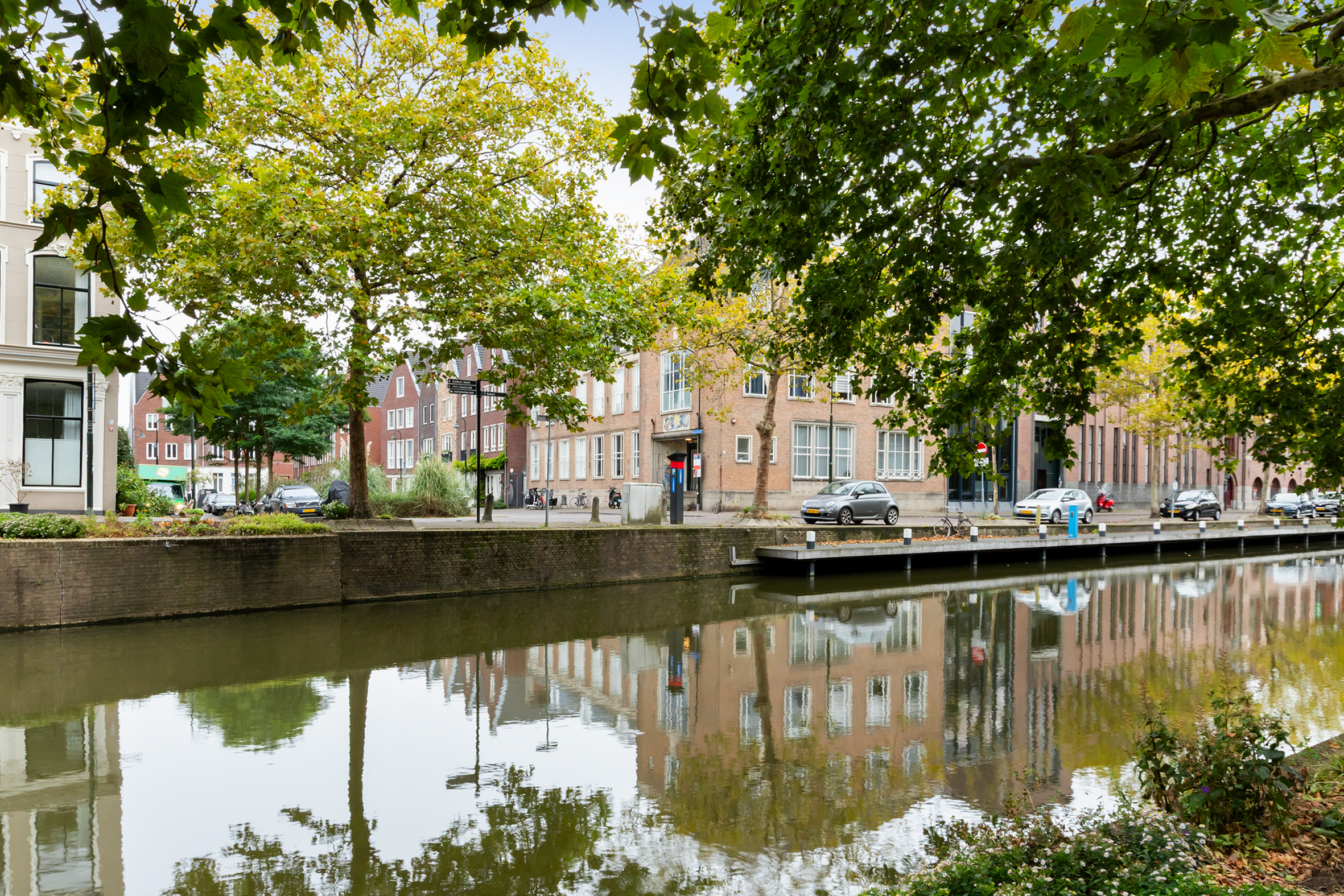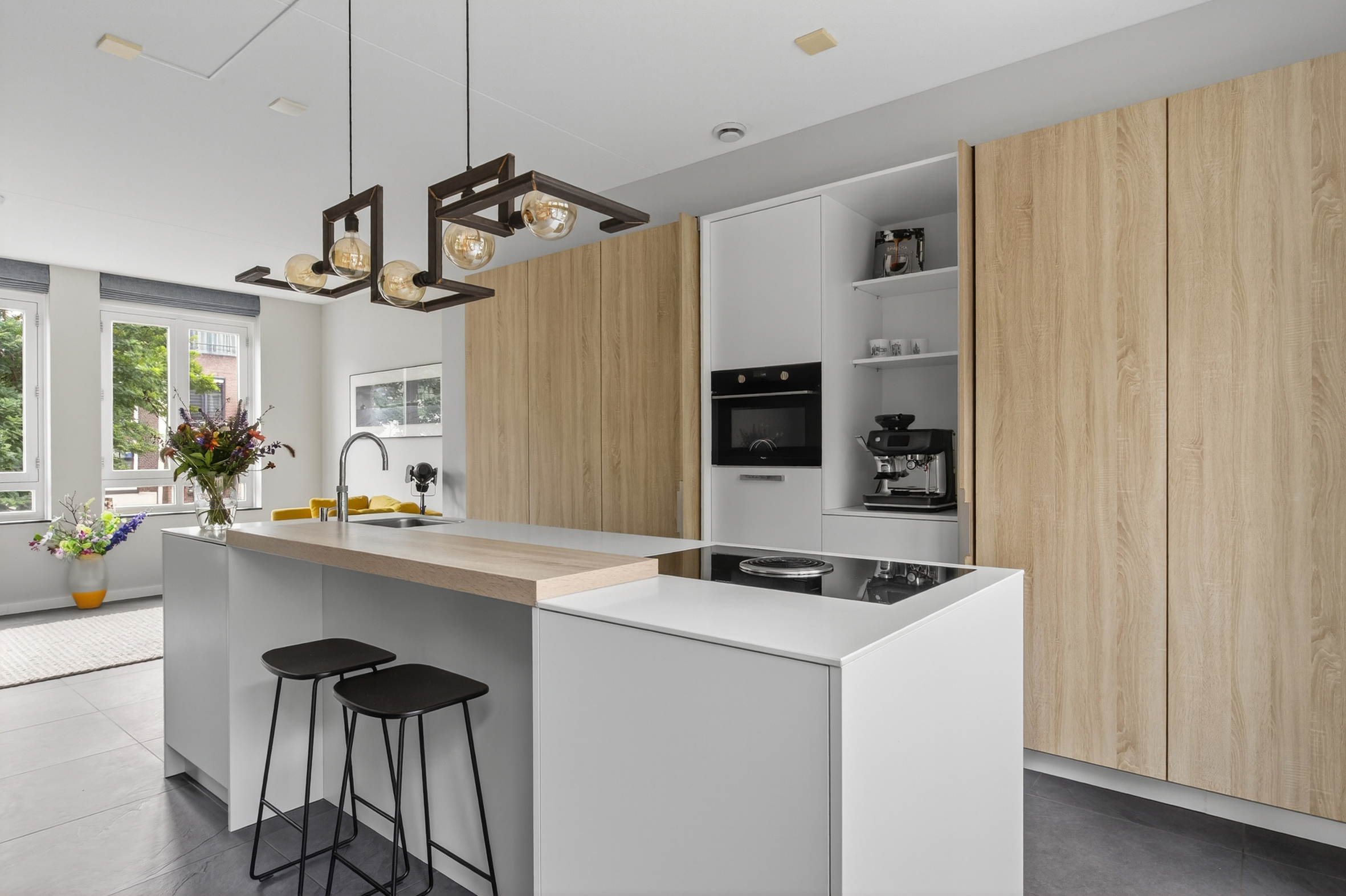 1e verdieping: heerlijk ruime en lichte woonkamer en woonkeuken. De woonkamer heeft 3 grote ramen aan de voorzijde en biedt zicht op historische panden en links op de gracht en bomen. In de woonkeuken is een kookeiland aangebracht, dat is voorzien van een kookeiland (wit hoogglans) met bar, Bora inductie kookplaat met geïntegreerde recirculatiekap, veel laden en een rvs spoelbak. Wand waarin zich de vaatwasser, combi-oven, grote koel-/vriescombinatie en bergruimte bevinden. Deze wand is "afsluitbaar" middels licht eiken panelen. Eethoek met grote ramen en openslaande deuren naar de daktuin.