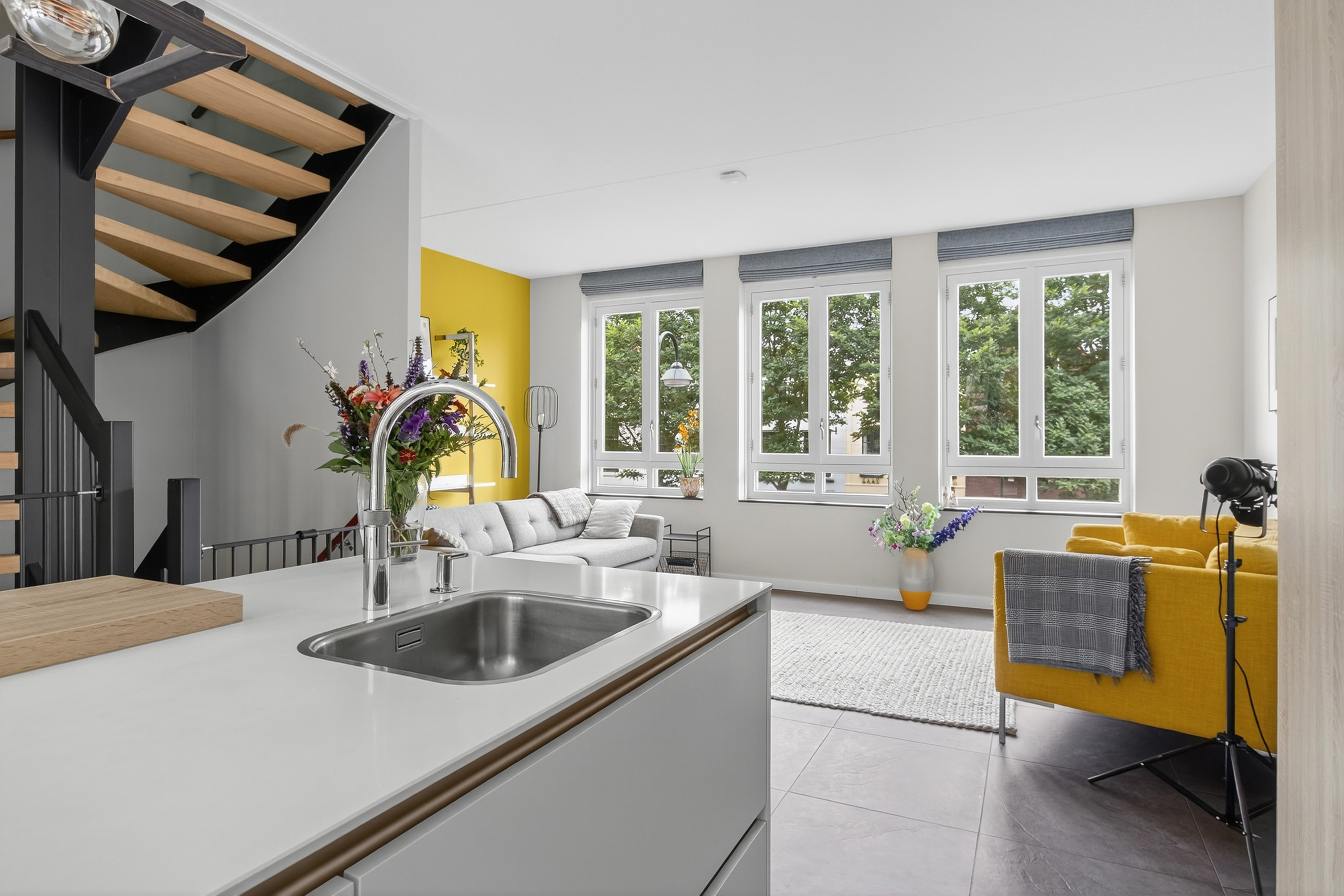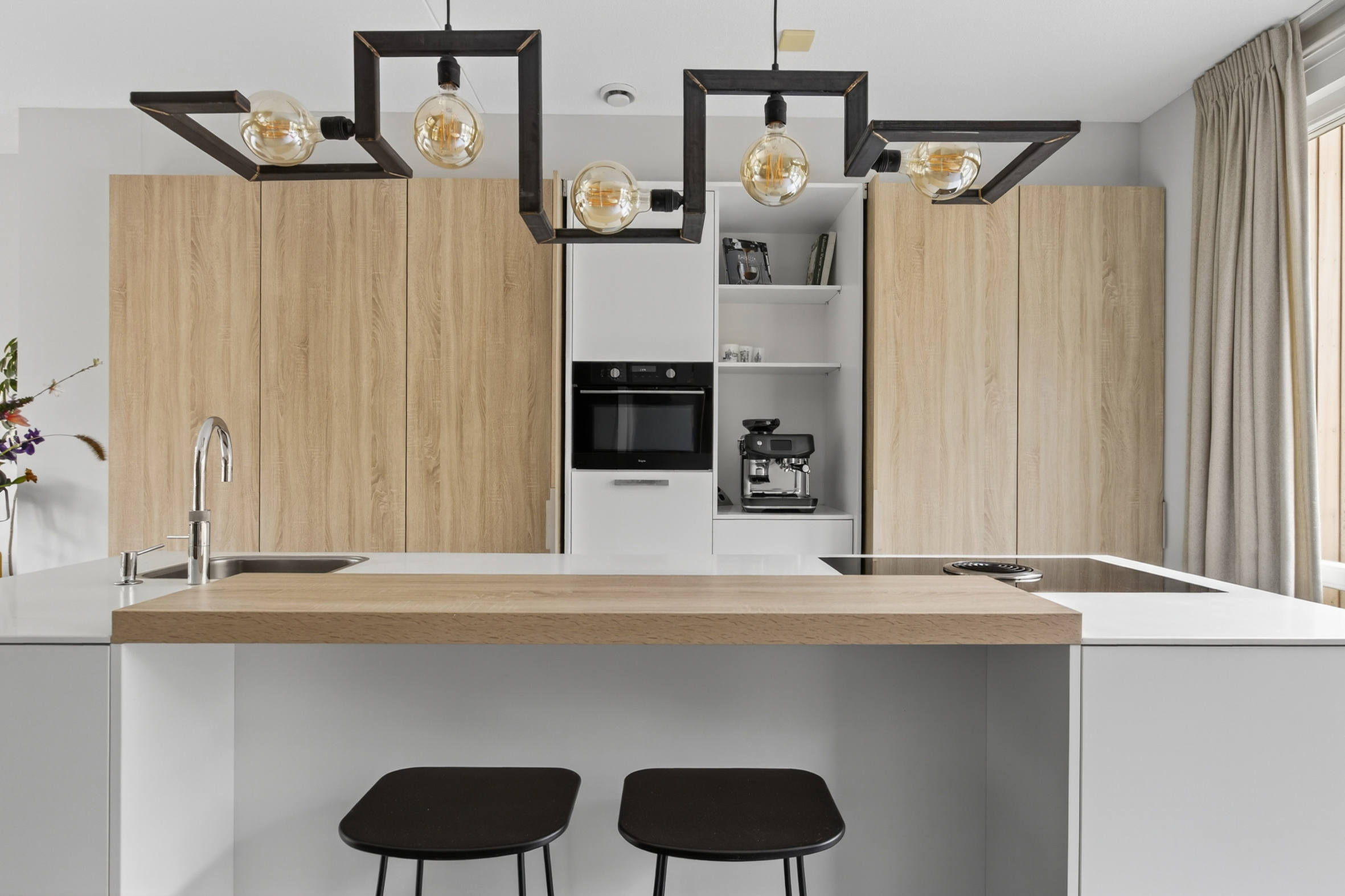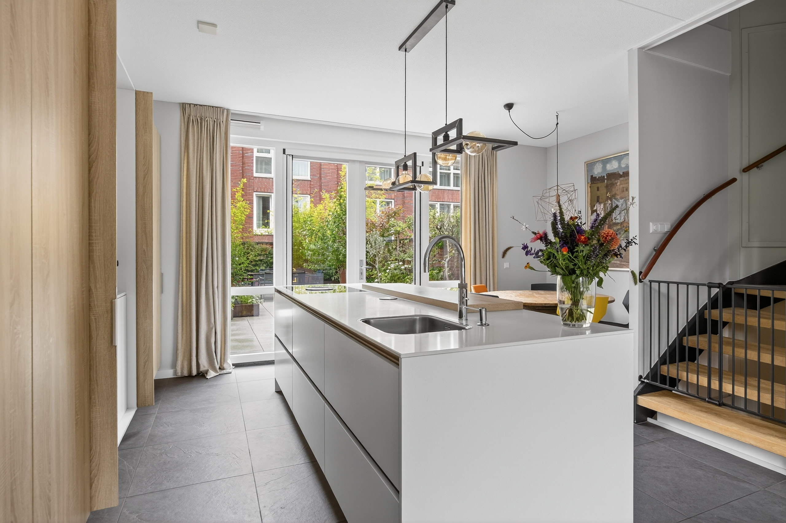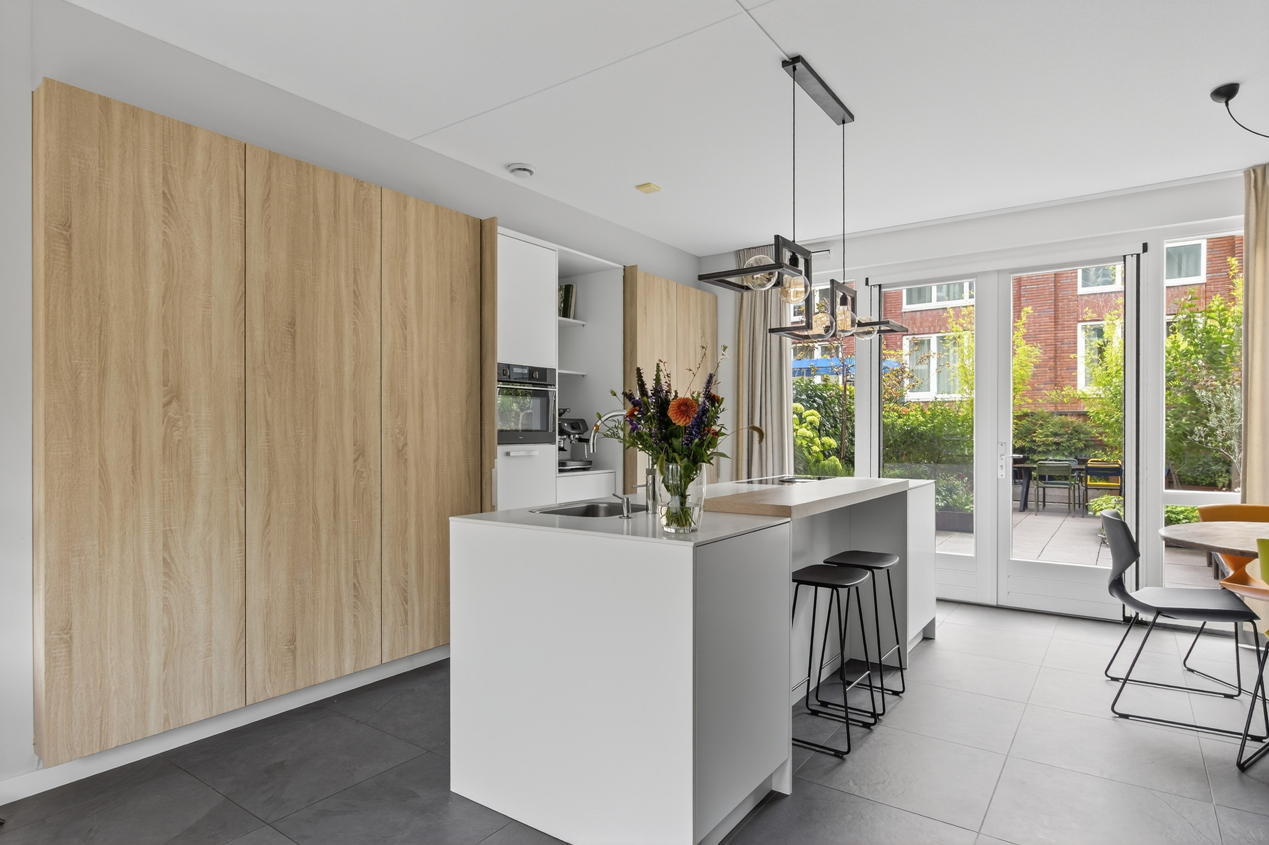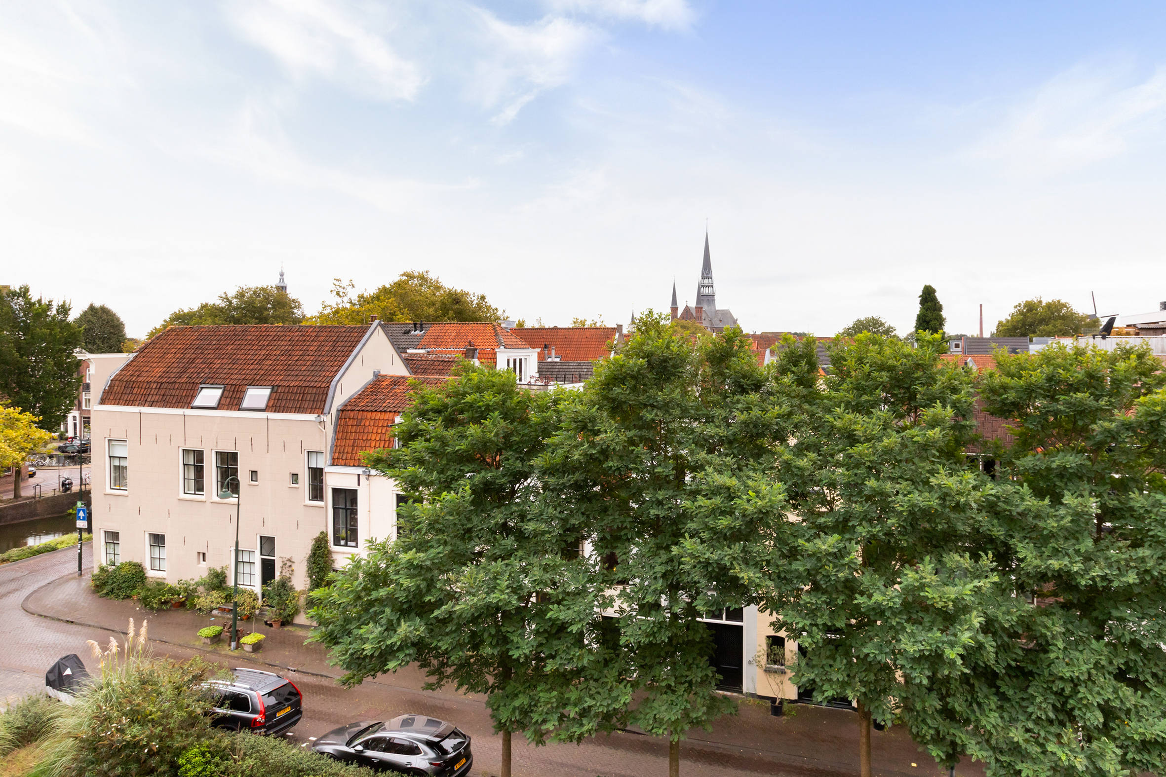 1e verdieping: heerlijk ruime en lichte woonkamer en woonkeuken. De woonkamer heeft 3 grote ramen aan de voorzijde en biedt zicht op historische panden en links op de gracht en bomen. In de woonkeuken is een kookeiland aangebracht, dat is voorzien van een kookeiland (wit hoogglans) met bar, Bora inductie kookplaat met geïntegreerde recirculatiekap, veel laden en een rvs spoelbak. Wand waarin zich de vaatwasser, combi-oven, grote koel-/vriescombinatie en bergruimte bevinden. Deze wand is "afsluitbaar" middels licht eiken panelen. Eethoek met grote ramen en openslaande deuren naar de daktuin.