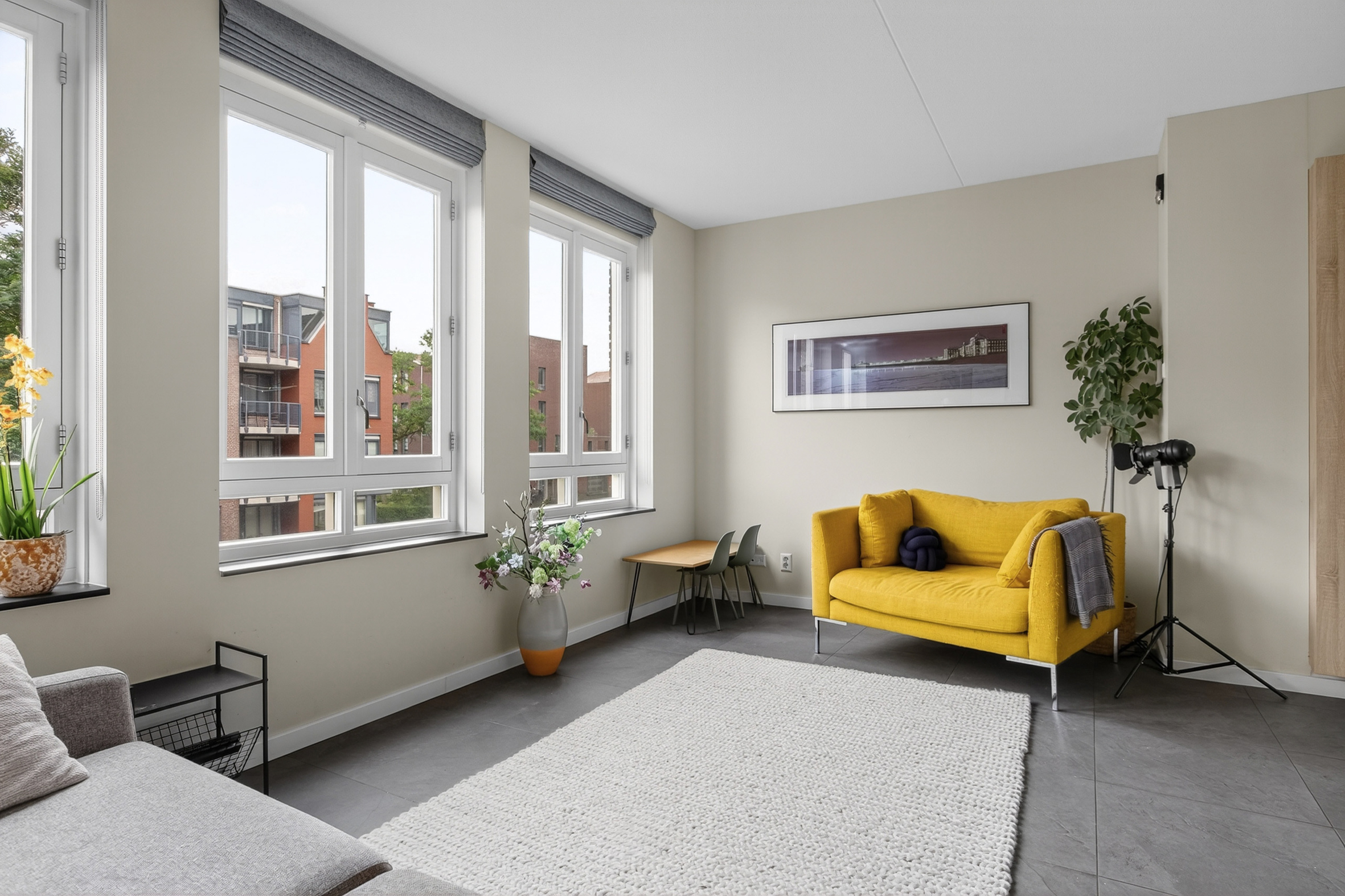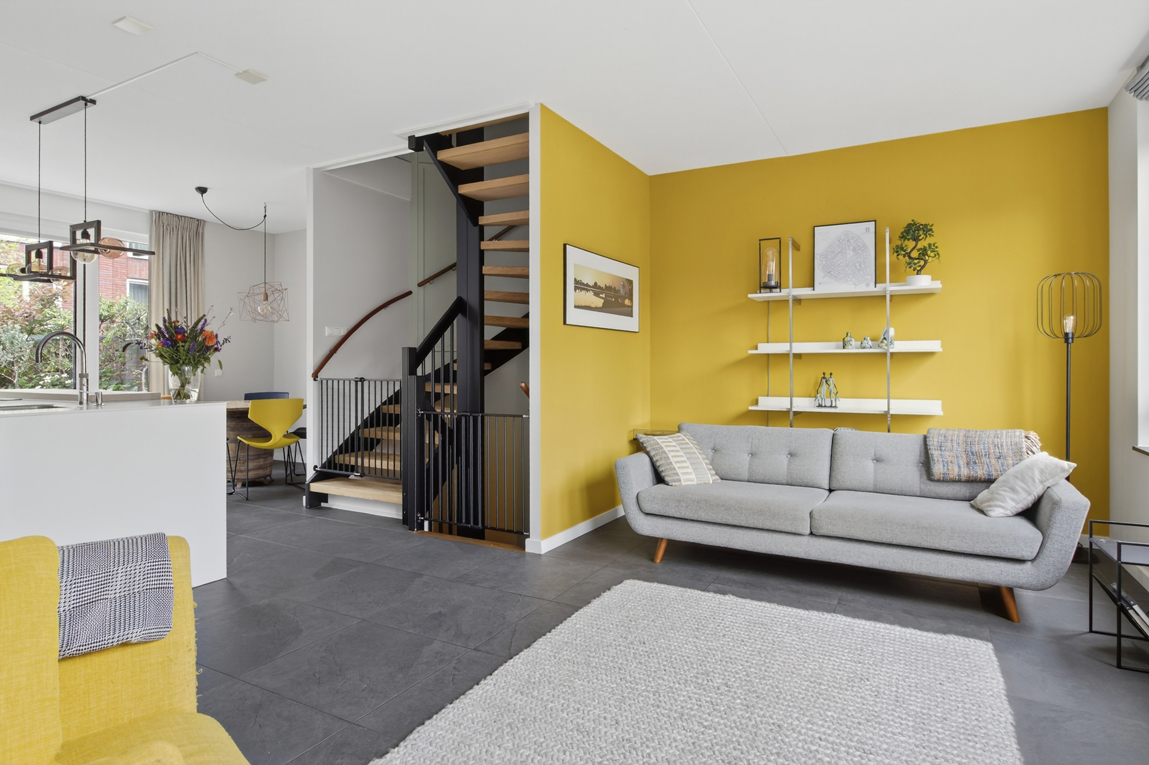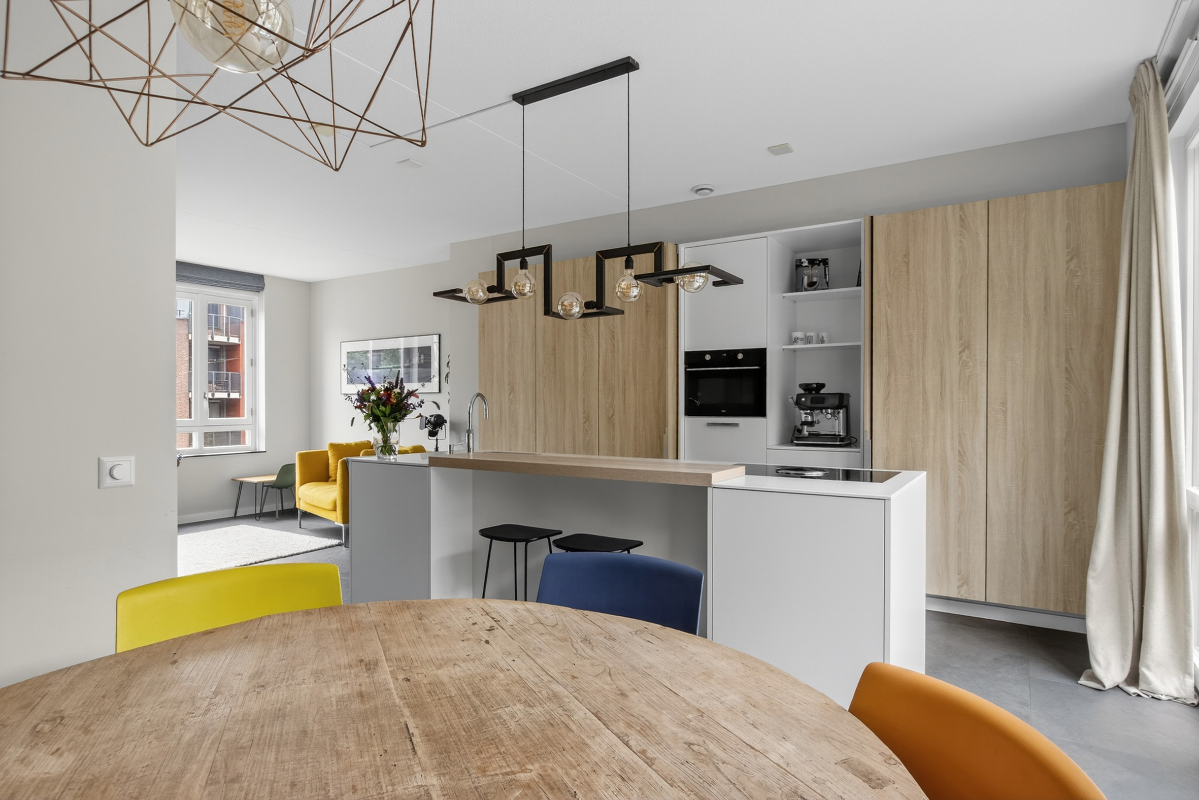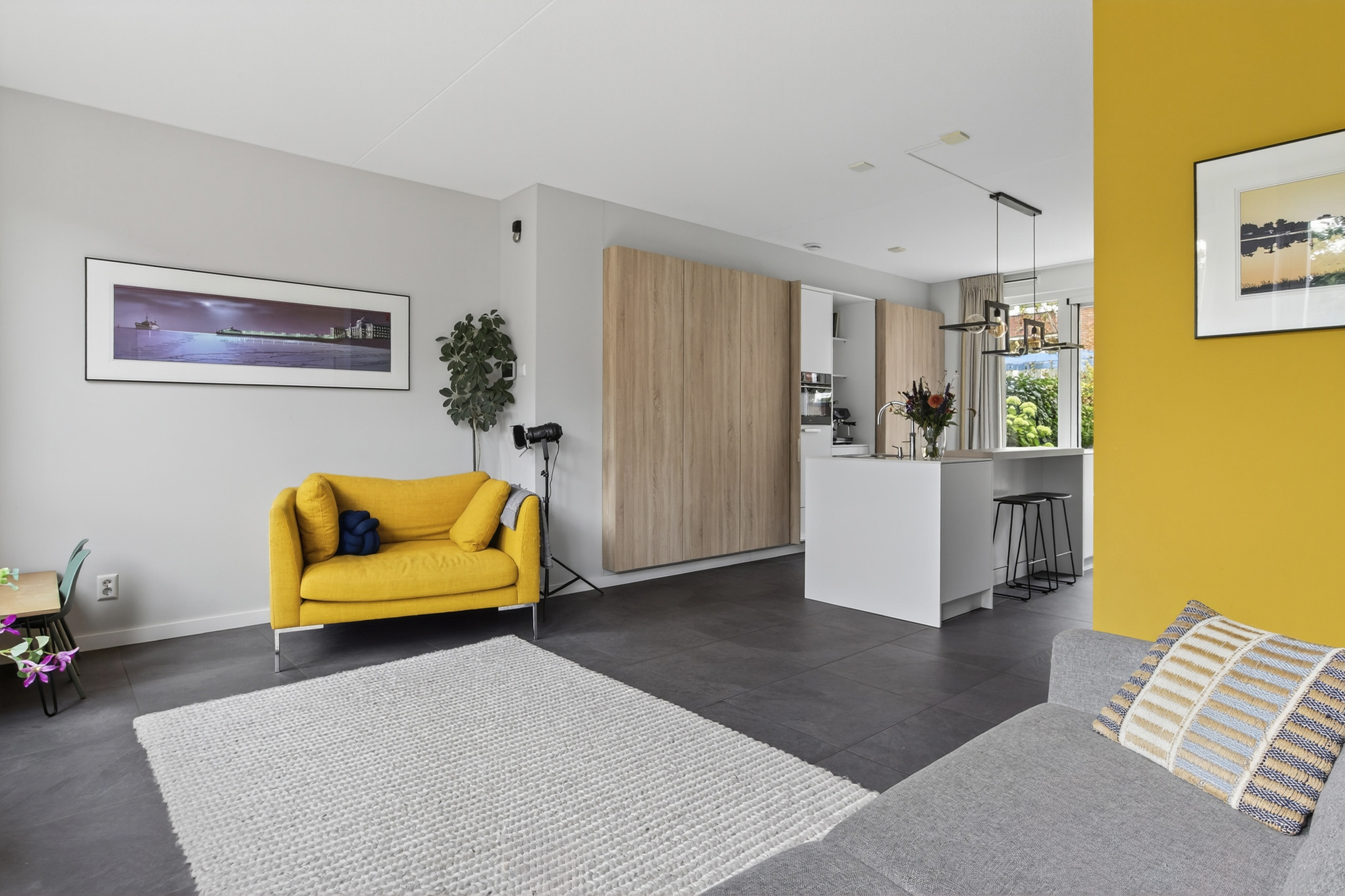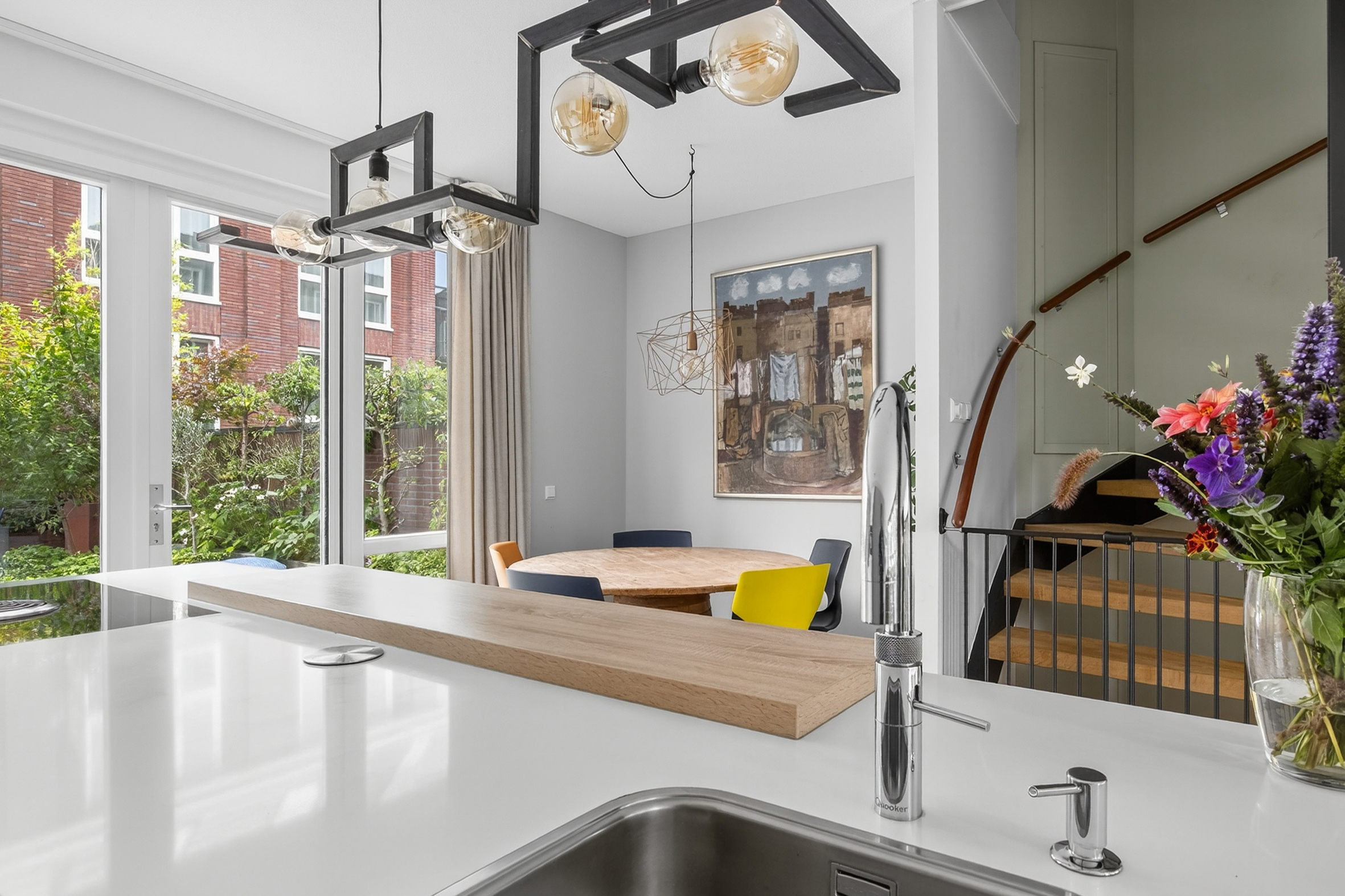 1e verdieping: heerlijk ruime en lichte woonkamer en woonkeuken. De woonkamer heeft 3 grote ramen aan de voorzijde en biedt zicht op historische panden en links op de gracht en bomen. In de woonkeuken is een kookeiland aangebracht, dat is voorzien van een kookeiland (wit hoogglans) met bar, Bora inductie kookplaat met geïntegreerde recirculatiekap, veel laden en een rvs spoelbak. Wand waarin zich de vaatwasser, combi-oven, grote koel-/vriescombinatie en bergruimte bevinden. Deze wand is "afsluitbaar" middels licht eiken panelen. Eethoek met grote ramen en openslaande deuren naar de daktuin.