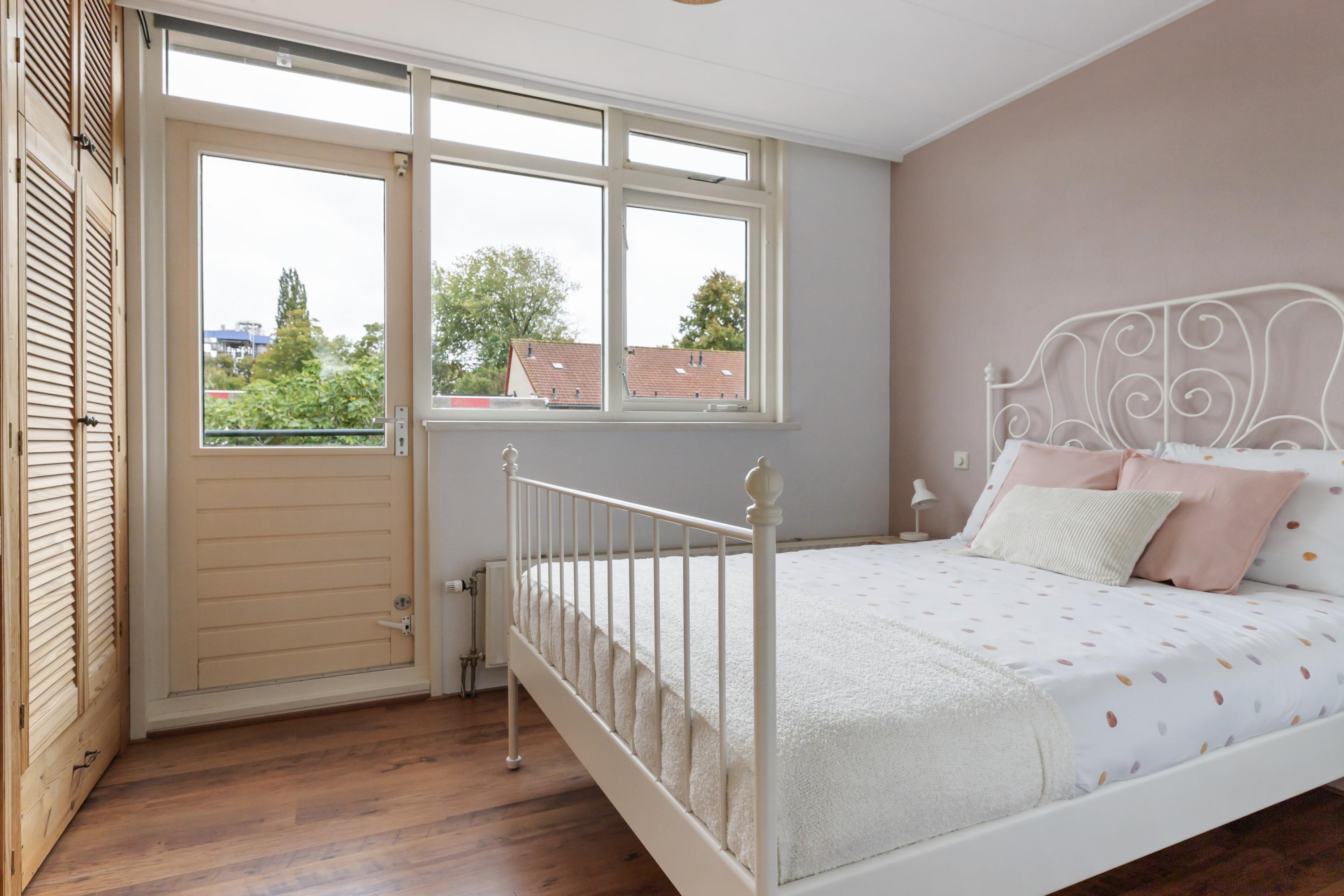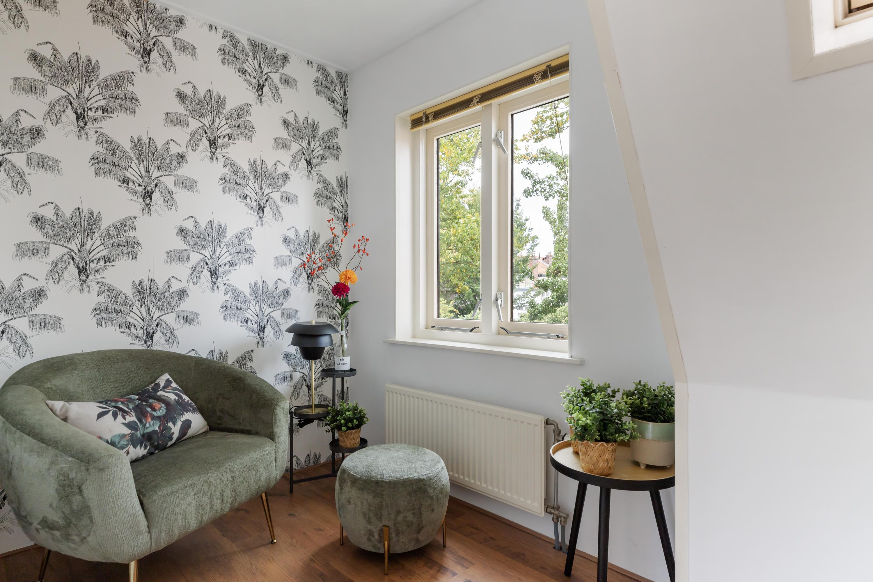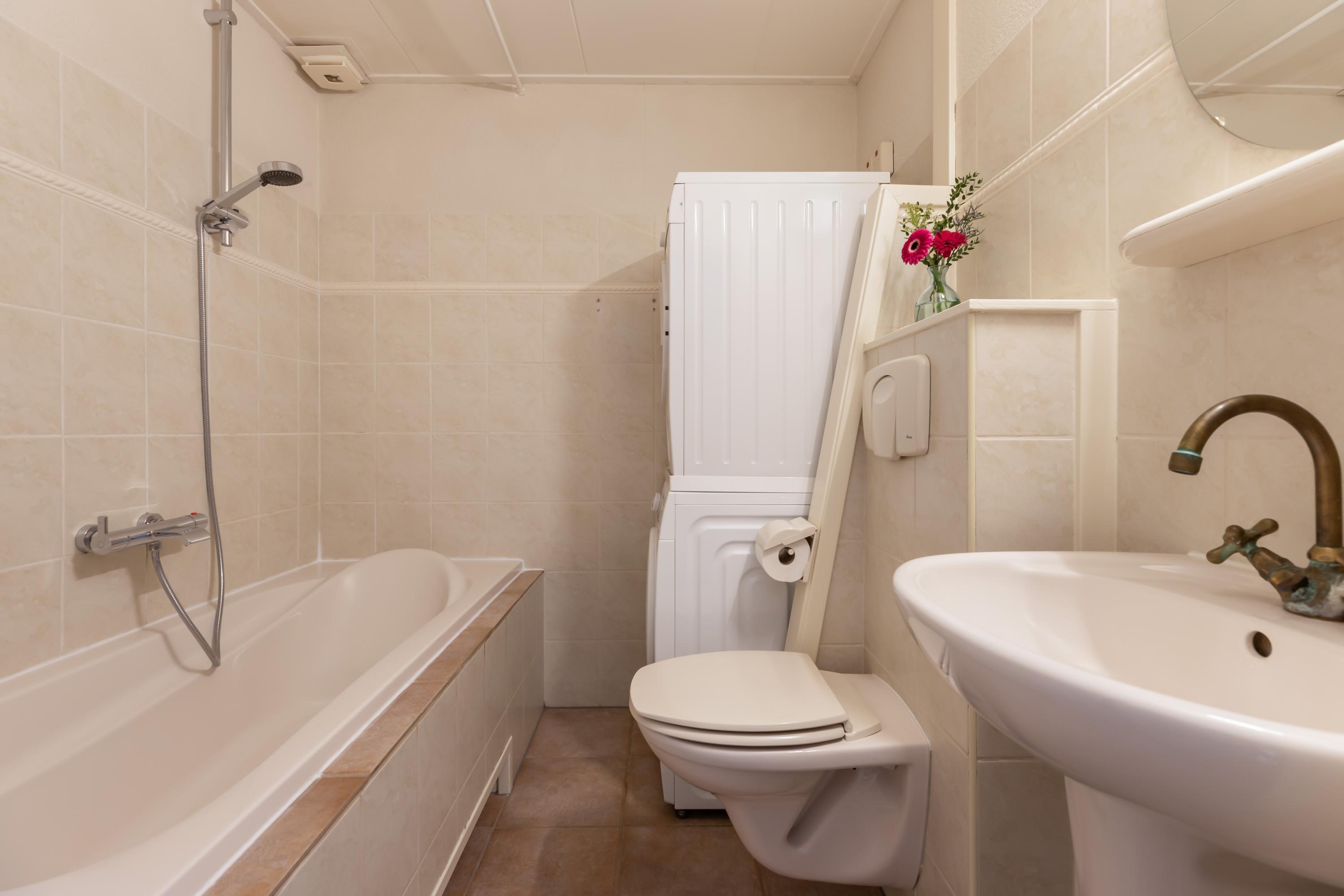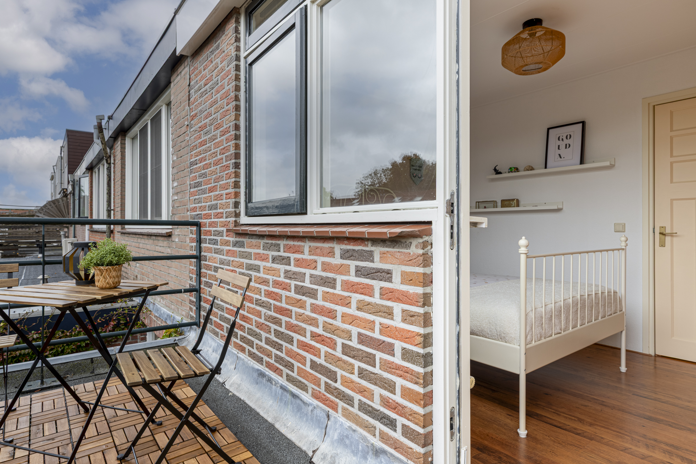 1e verdieping: overloop, slaapkamer achterzijde met vaste kast met louvredeuren, toegang tot het balkon. Inpandige badkamer voorzien van een ligbad, hangend toilet, wastafel en een designradiator. Schattige L-vormige slaapkamer aan de voorzijde met Velux dakraam en vliering met veel bergruimte (bereikbaar via een vlizotrap).