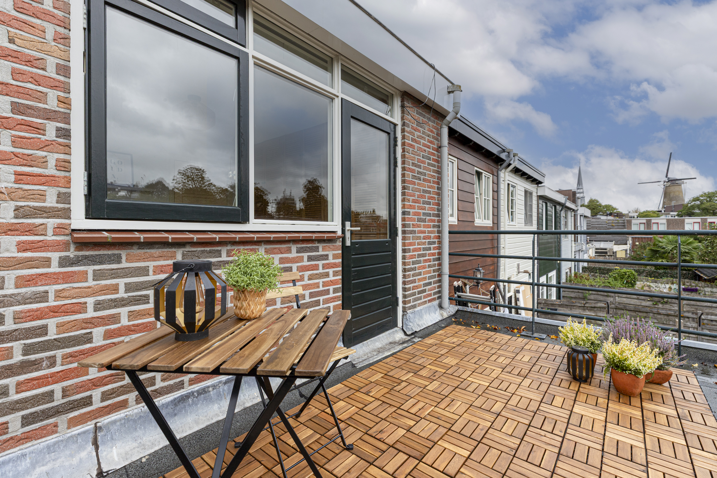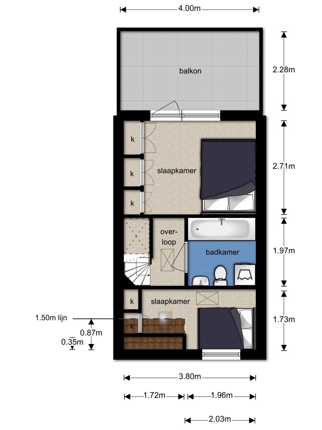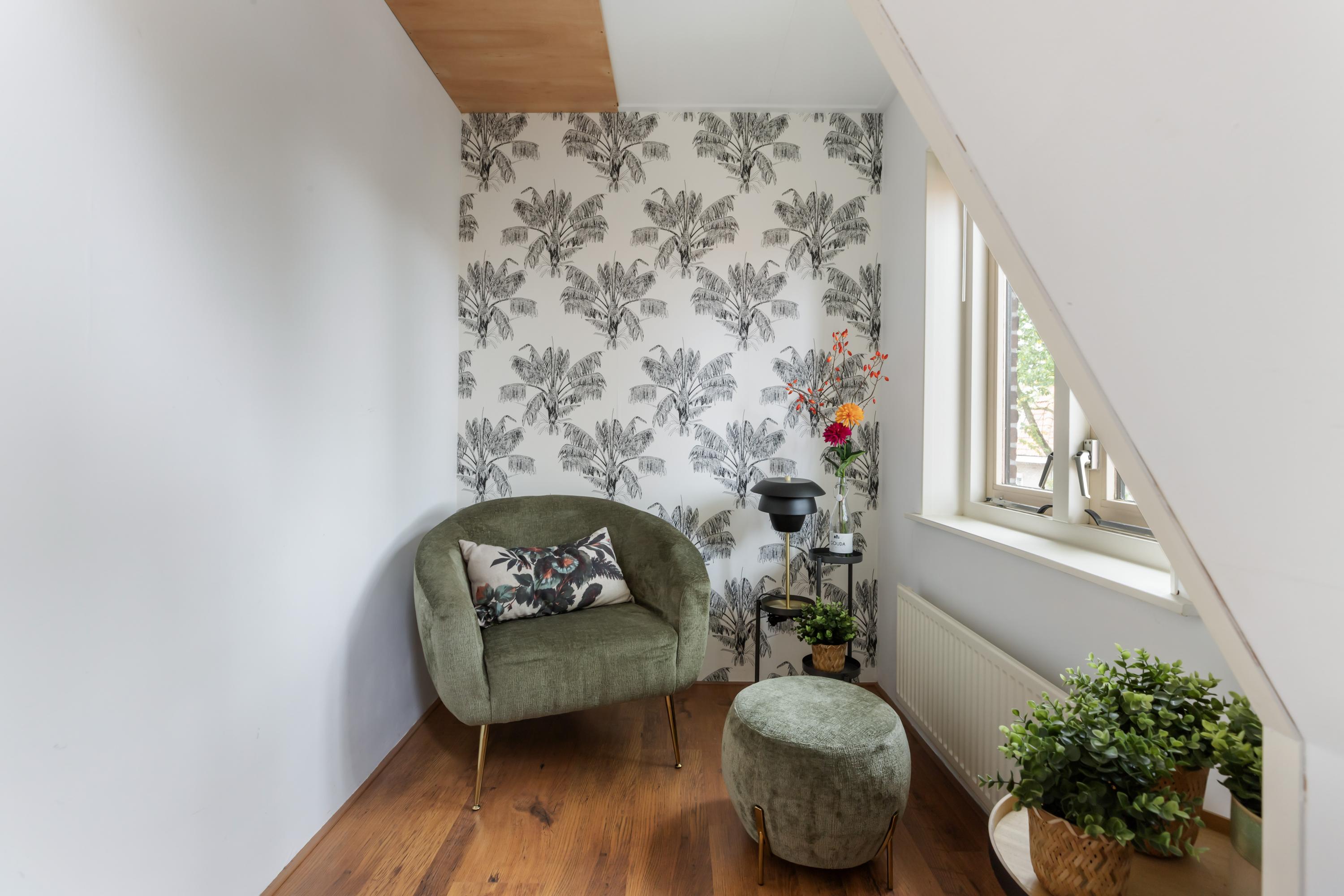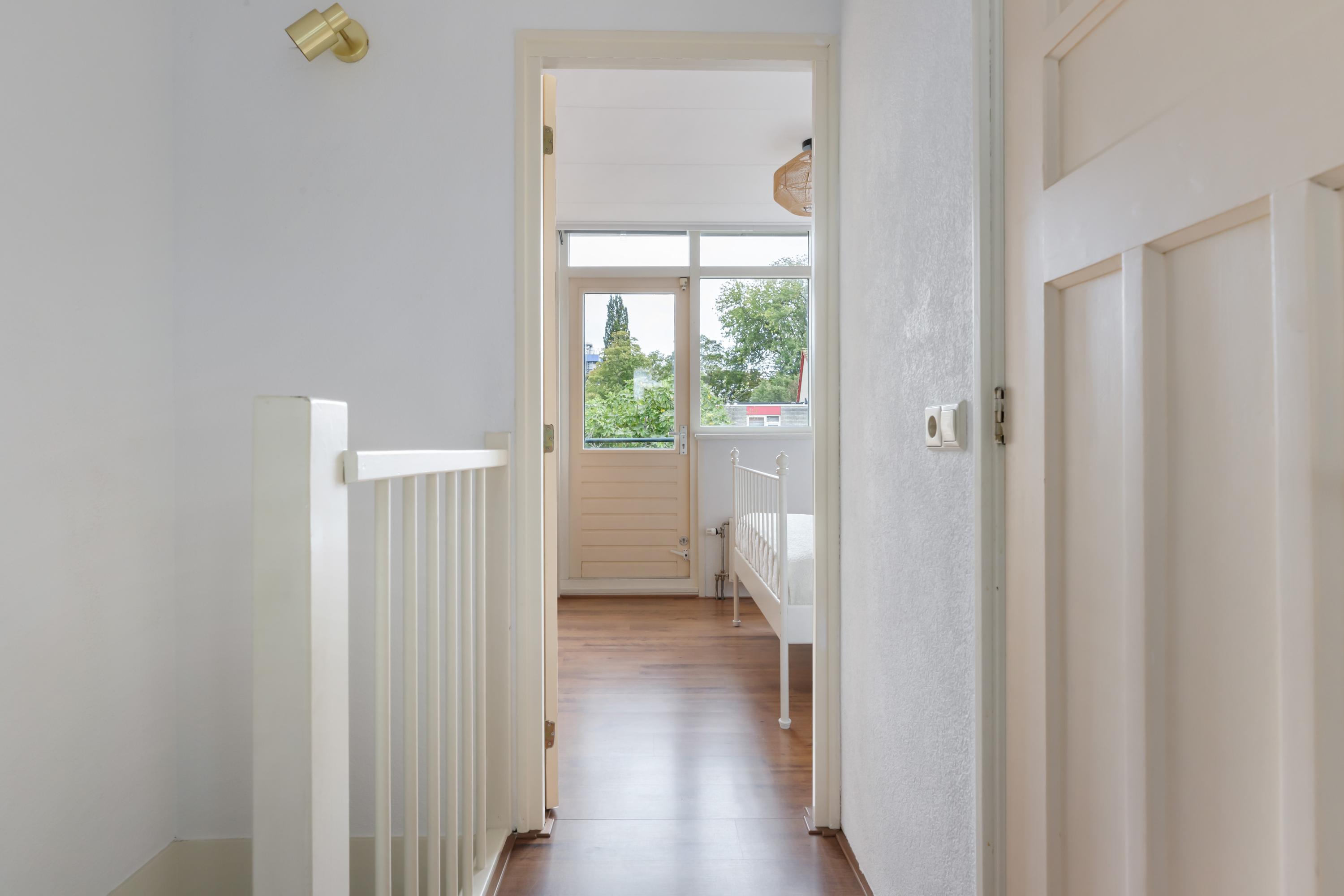 1e verdieping: overloop, slaapkamer achterzijde met vaste kast met louvredeuren, toegang tot het balkon. Inpandige badkamer voorzien van een ligbad, hangend toilet, wastafel en een designradiator. Schattige L-vormige slaapkamer aan de voorzijde met Velux dakraam en vliering met veel bergruimte (bereikbaar via een vlizotrap).