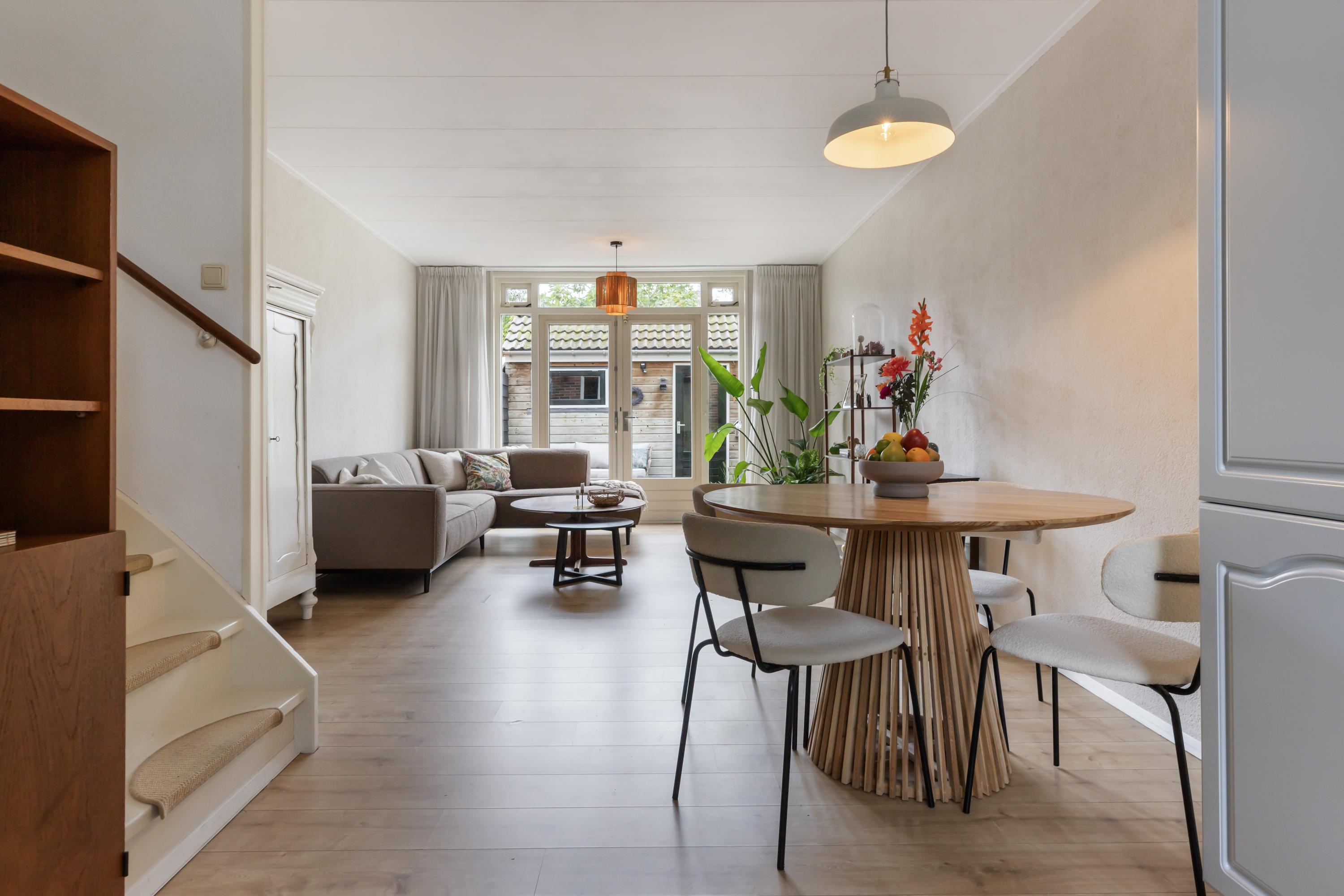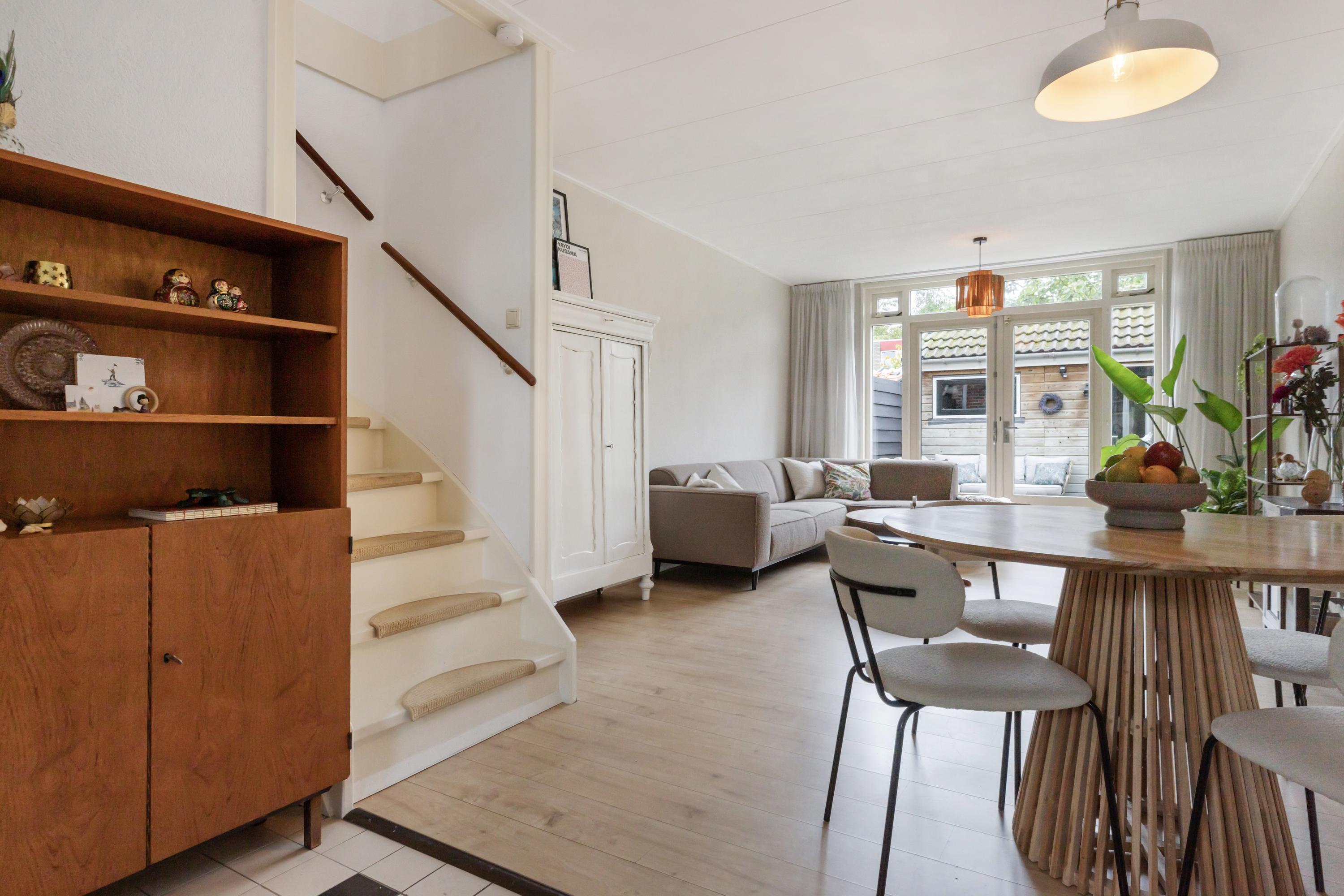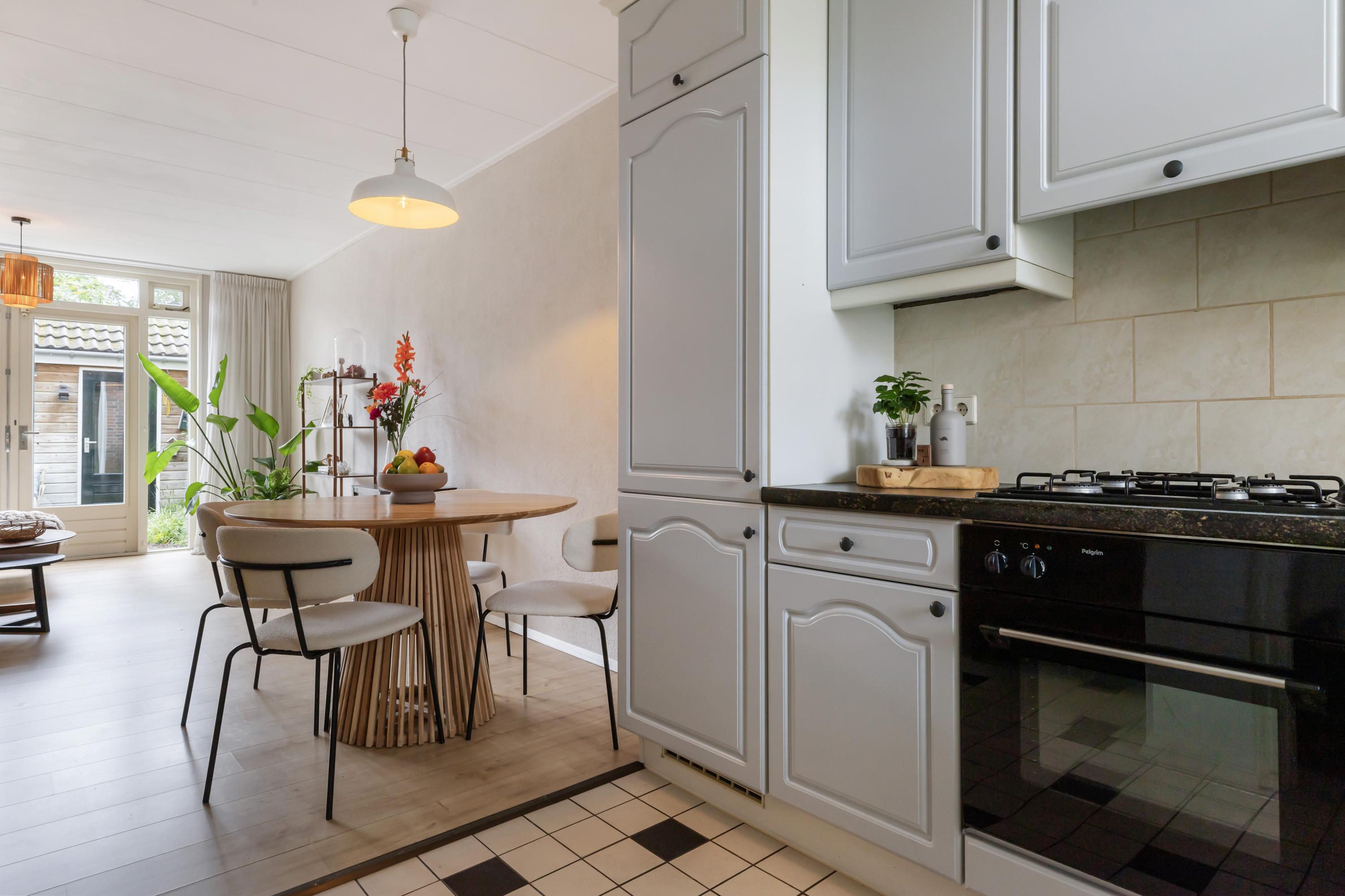 begane grond: entree, hal met meterkast en toilet (hangend) + fontein. Semi-open keuken met L-vormig kunststof aanrechtblad, rvs spoelbak, gaskookplaat, afzuigkap, oven, koelkast, vriezer en close-in boiler. Grote, lichte woonkamer met ramen van plafond tot vloer en openslaande deuren naar de tuin.