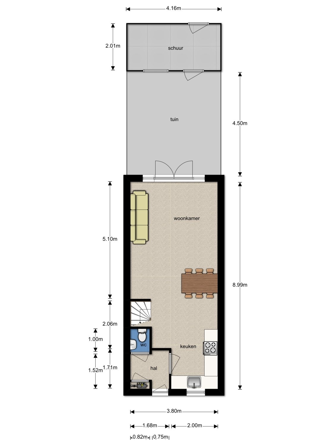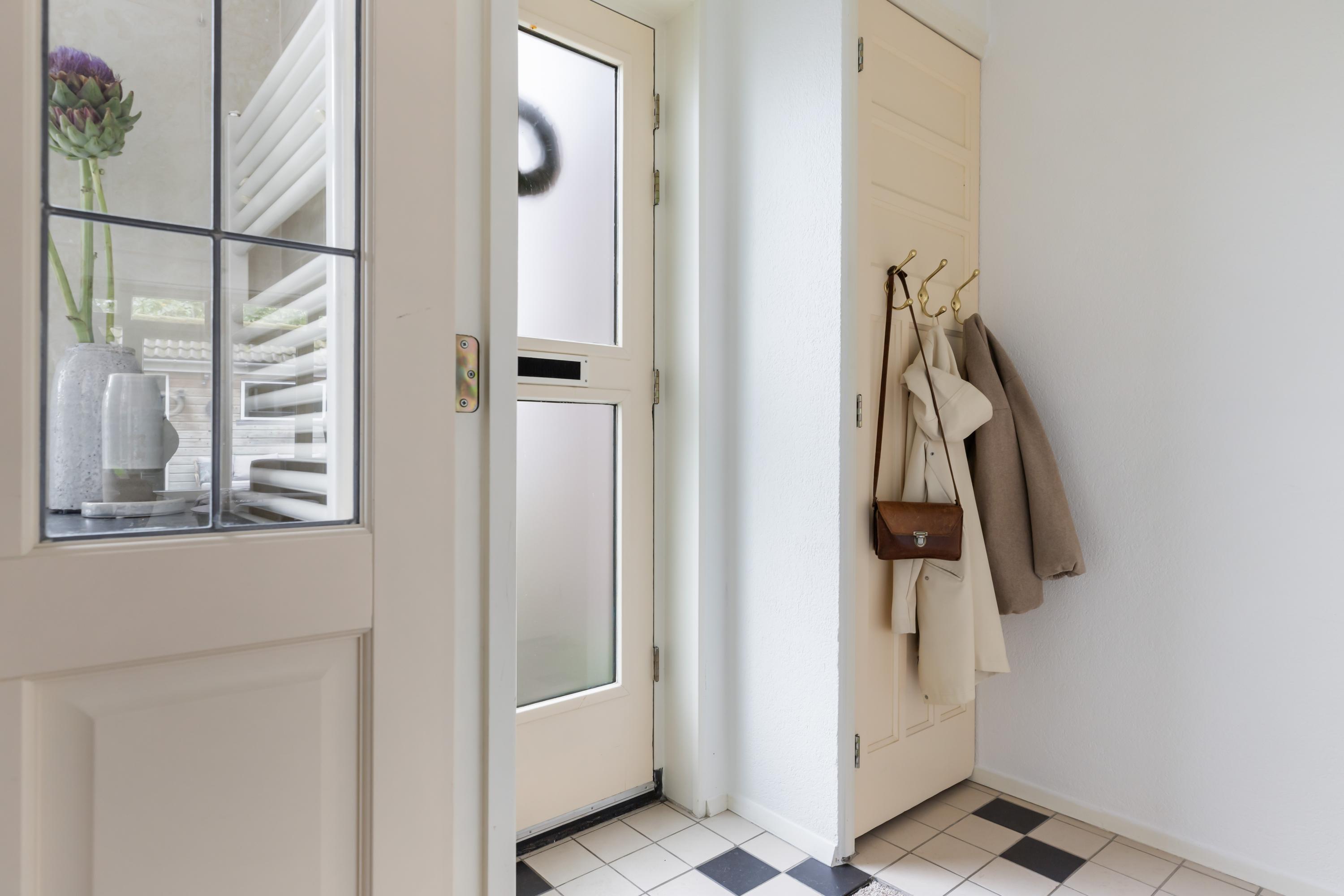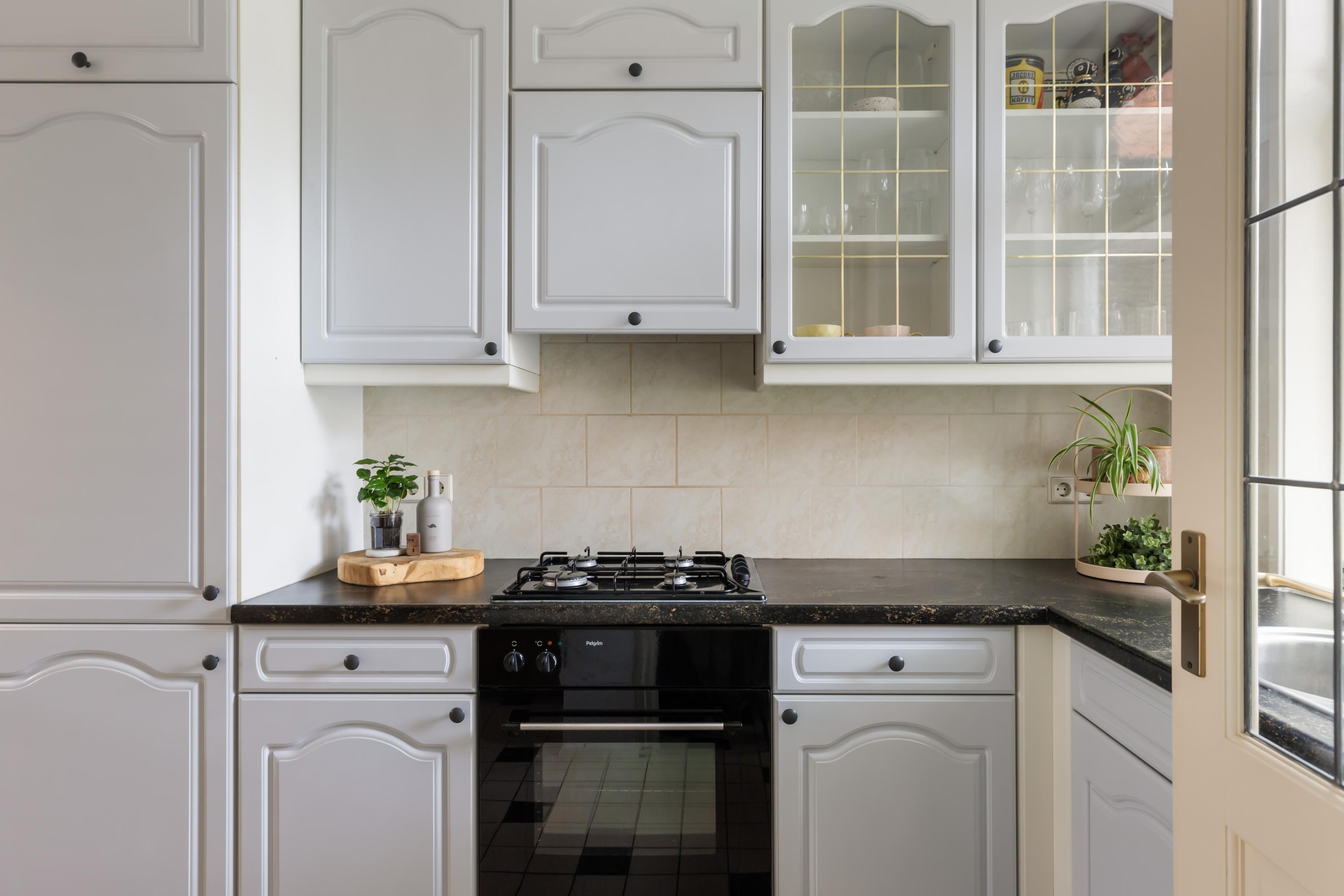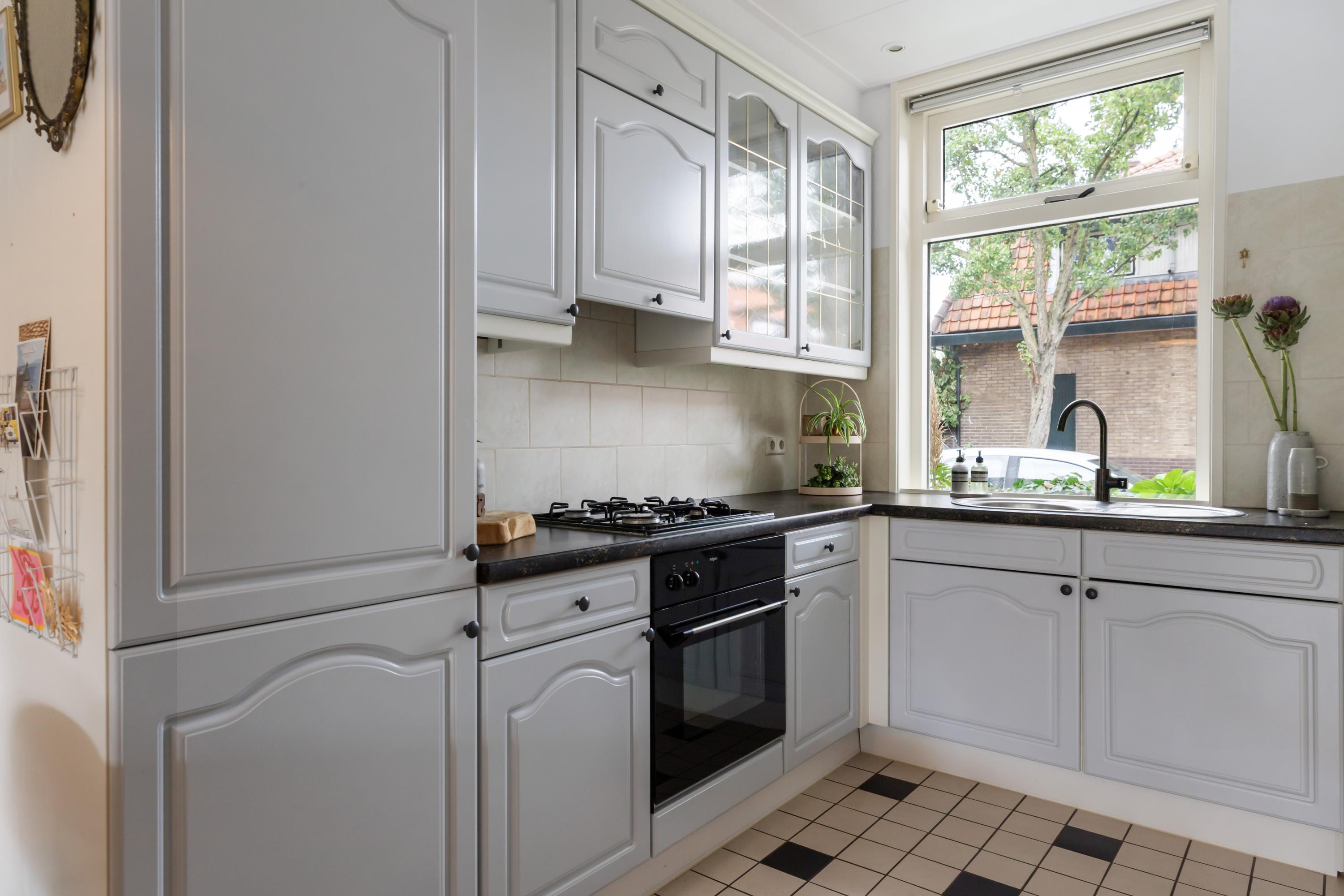 begane grond: entree, hal met meterkast en toilet (hangend) + fontein. Semi-open keuken met L-vormig kunststof aanrechtblad, rvs spoelbak, gaskookplaat, afzuigkap, oven, koelkast, vriezer en close-in boiler. Grote, lichte woonkamer met ramen van plafond tot vloer en openslaande deuren naar de tuin.