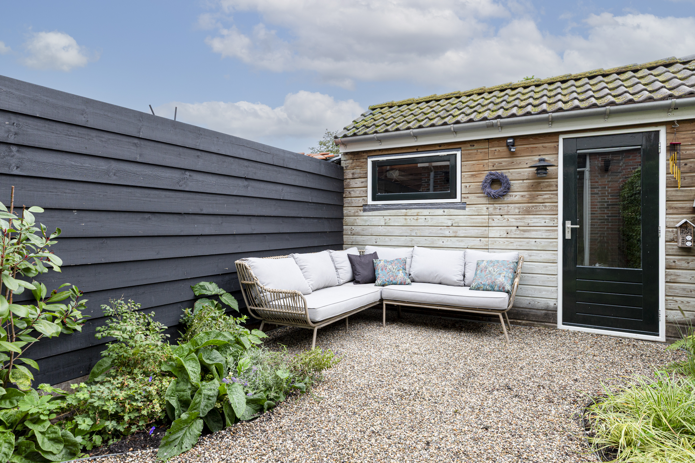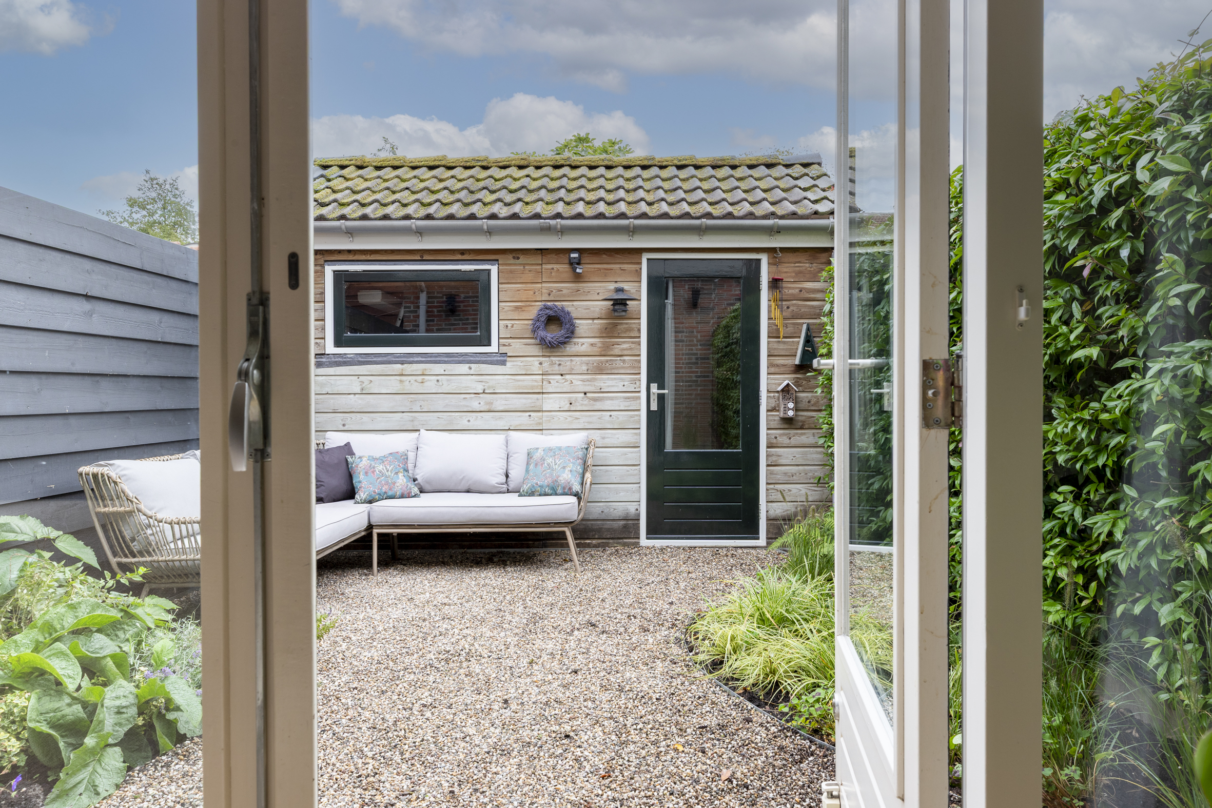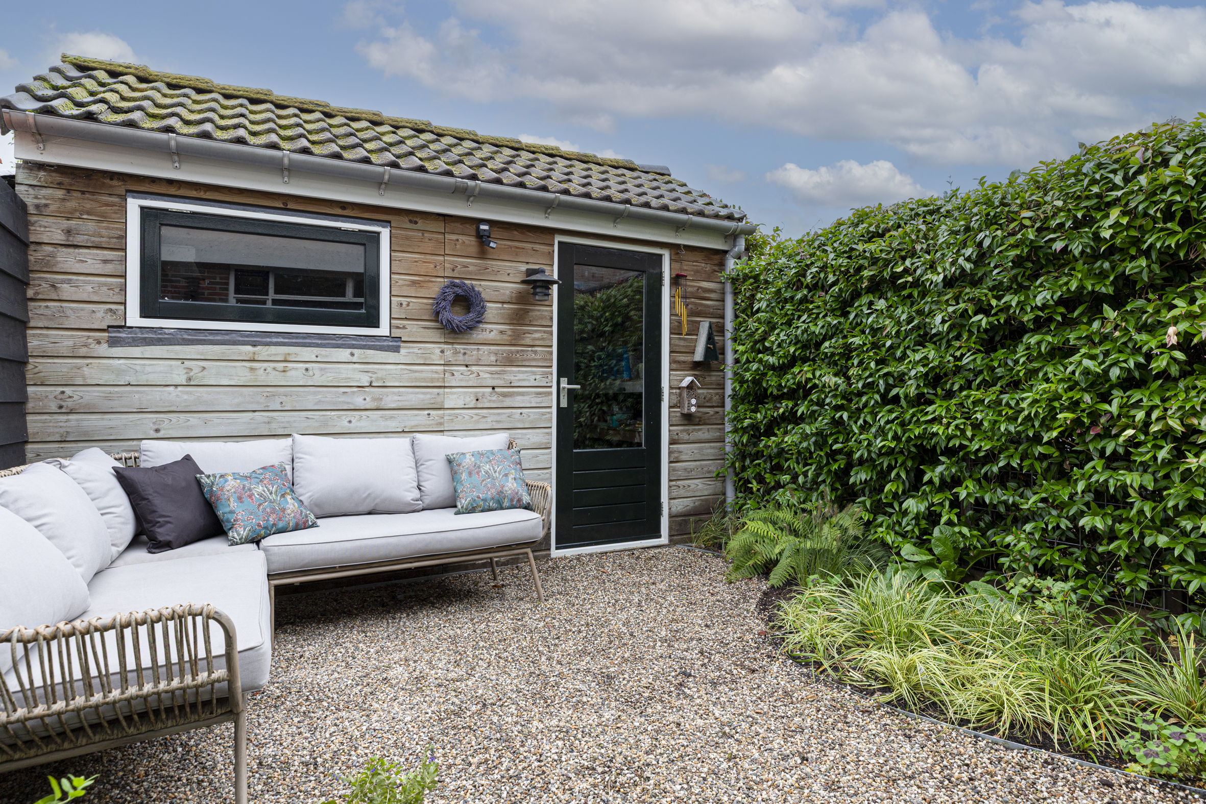 *Aan de achterzijde bevindt zich de grote, houten berging met elektra en achterom via dubbele deuren. Je kunt hier met gemak fietsen en een motor stallen.