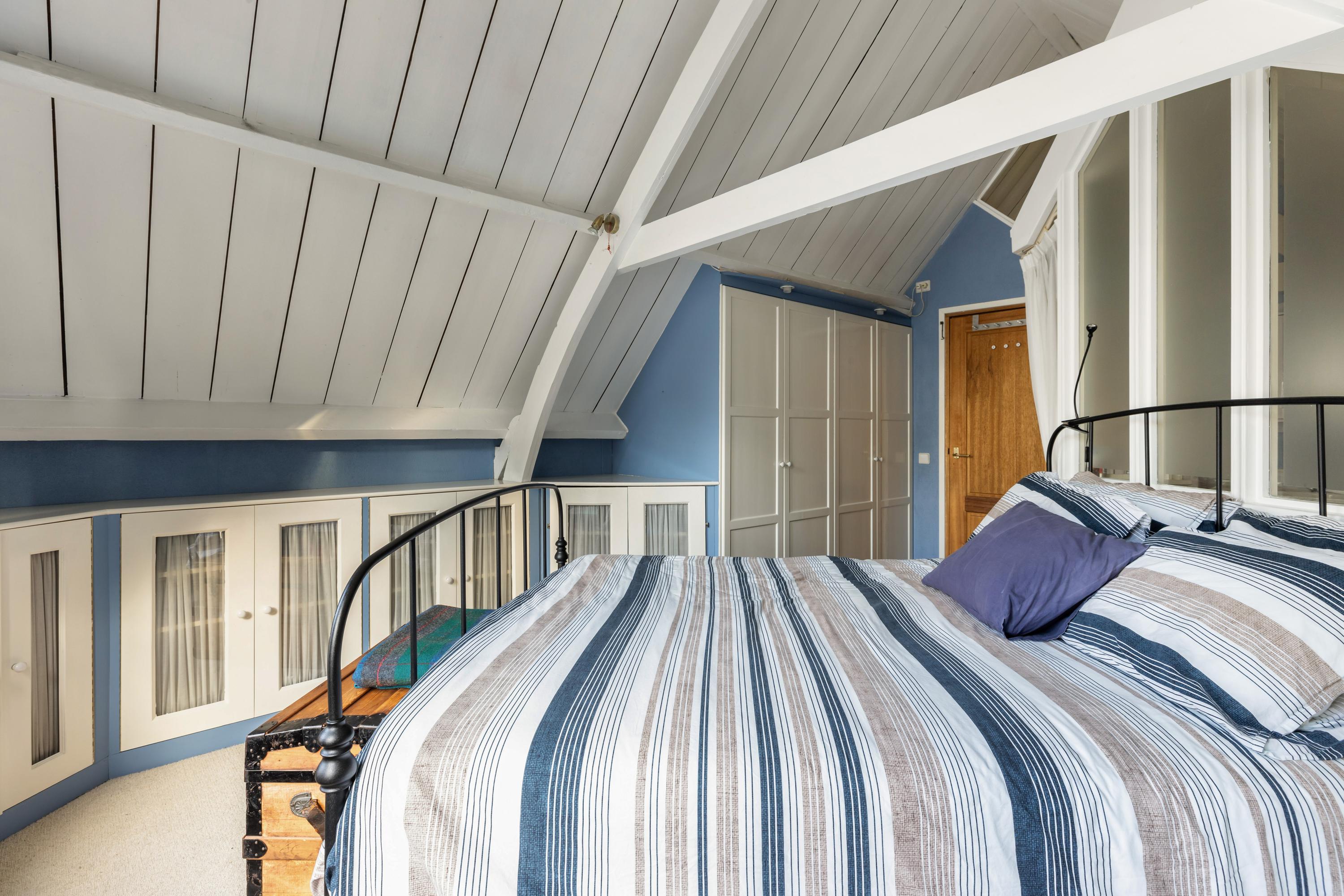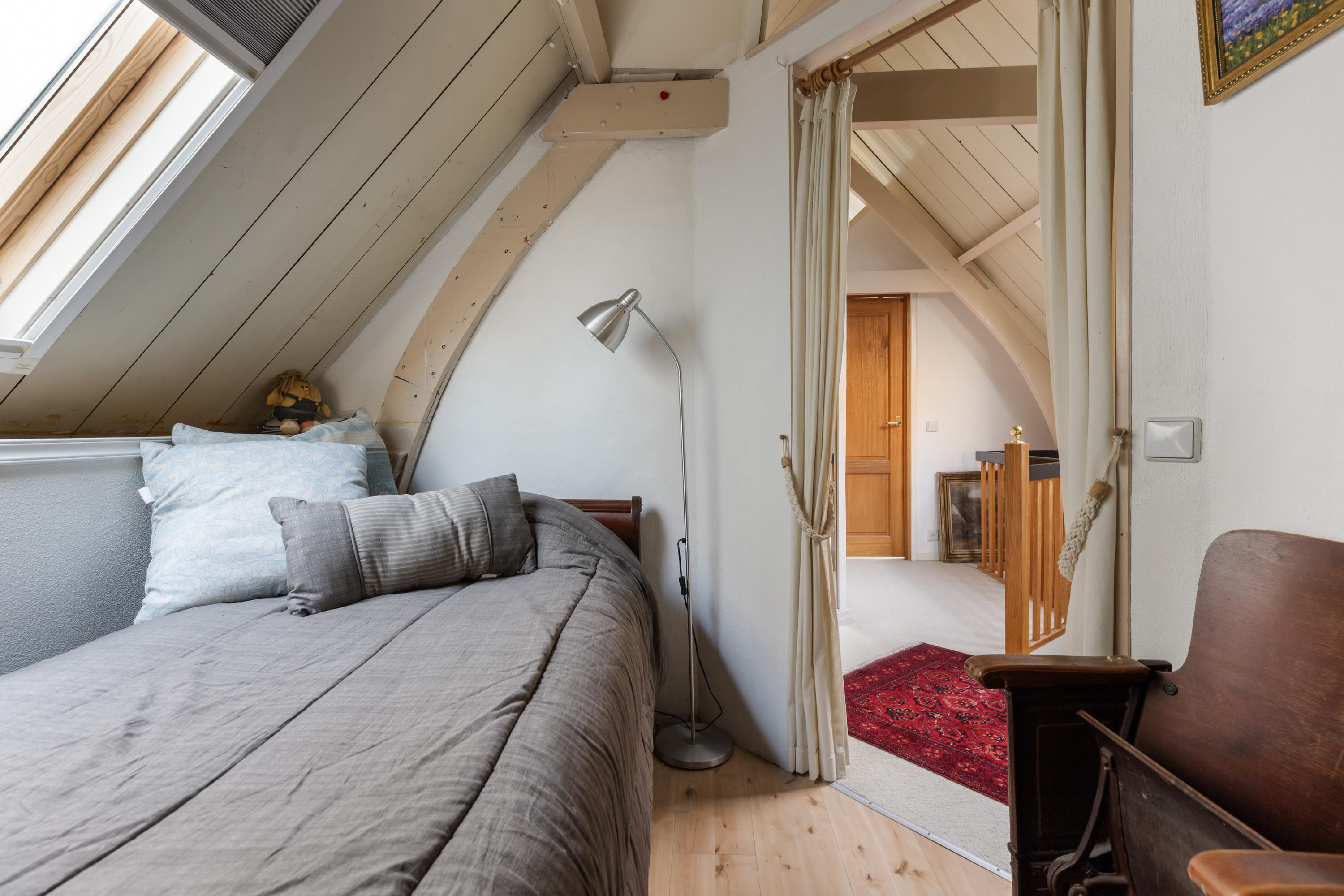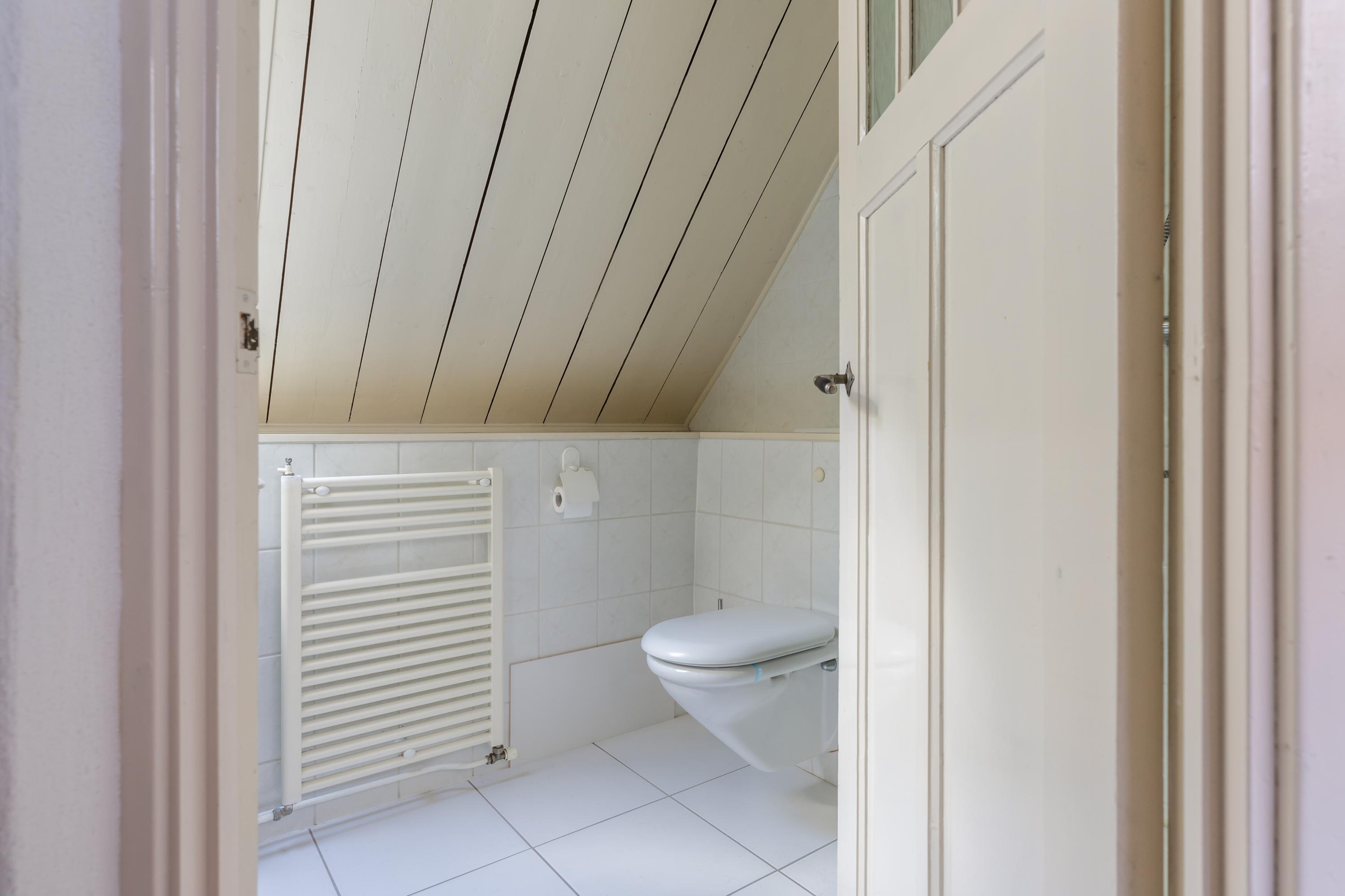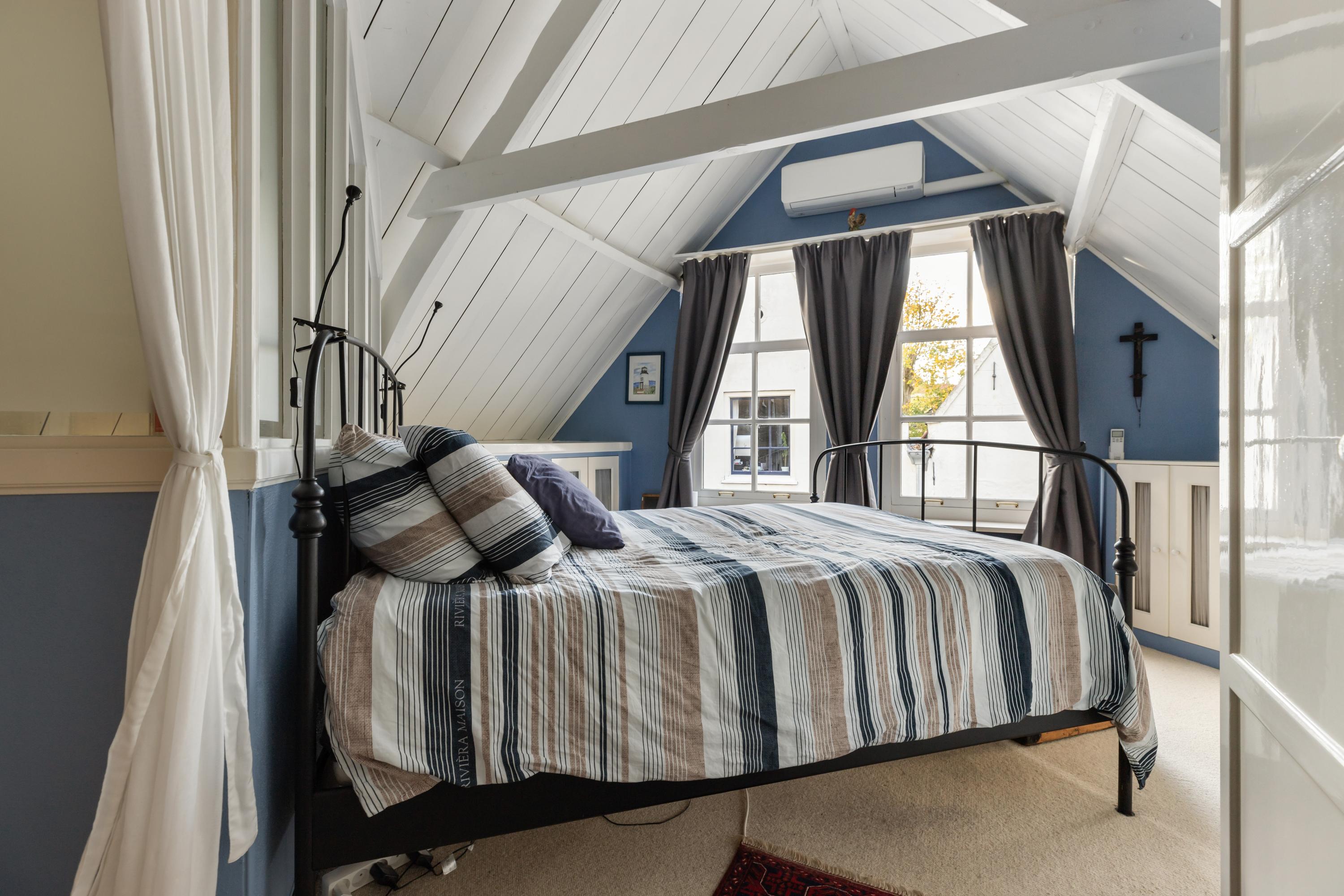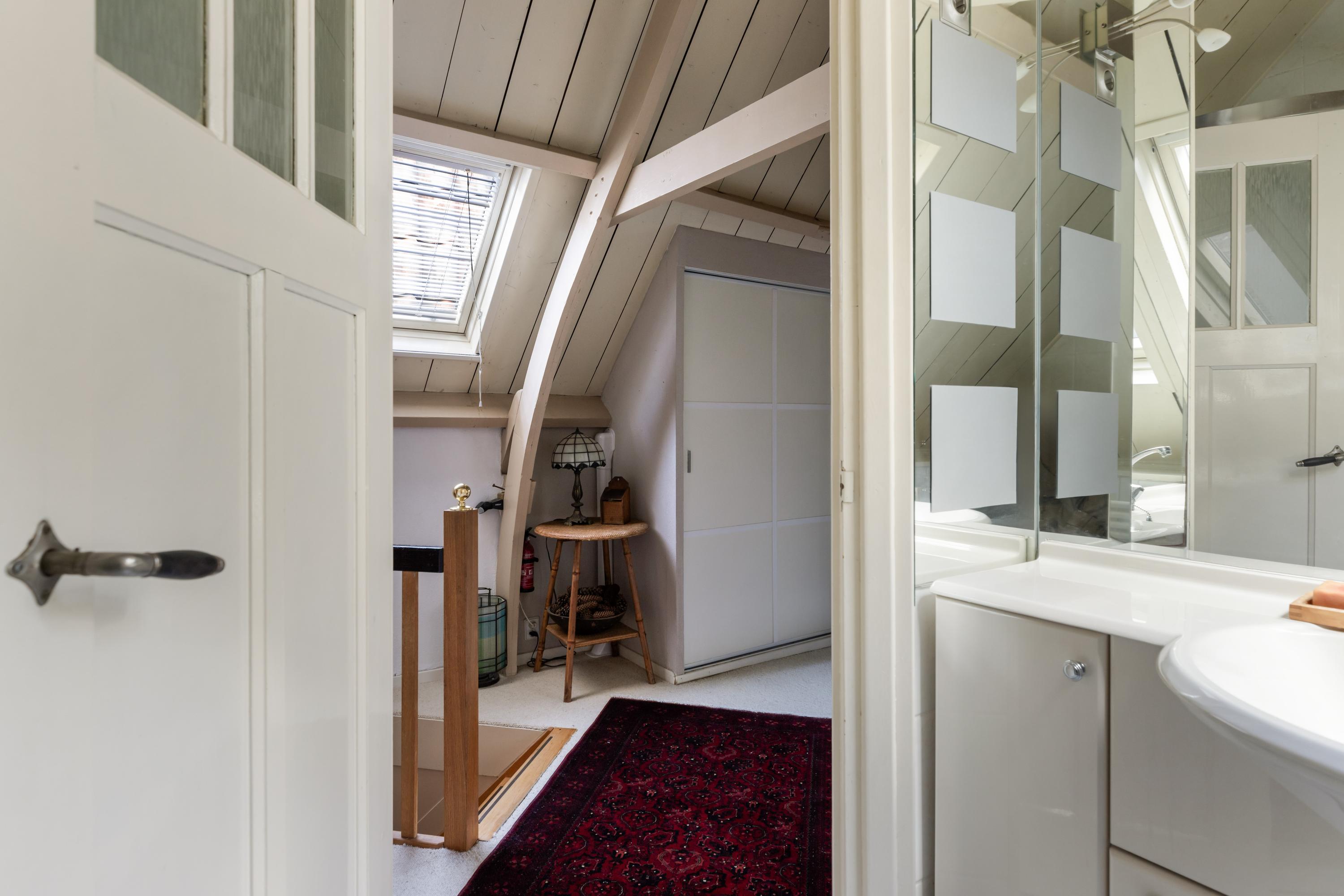 1e verdieping: overloop met Velux dakraam en een schuifkastenwand voorzien van een wasmachineaansluiting en de cv-ketel (2018). Grote slaapkamer aan de voorzijde met vaste kasten, airco en een eigen semi-open badkamer I, die is voorzien van een ligbad, wastafel met meubel en toilet. Slaapkamer in het midden met Velux dakraam, badkamer II met douchecabine, wastafel met meubel, een bidet en een Velux raam. Ruime slaapkamer aan de achterzijde met openslaande deuren en een Frans balkon.