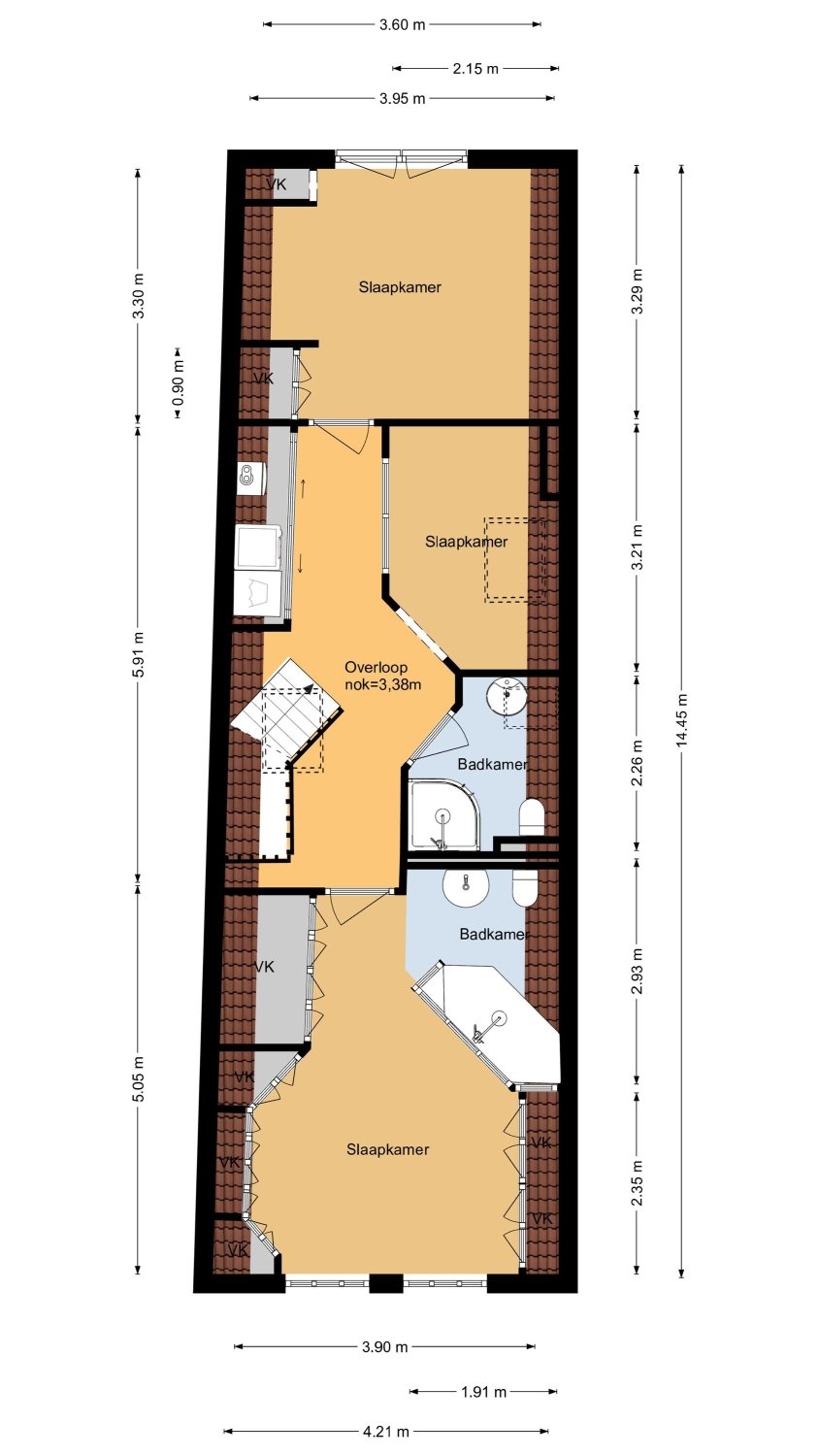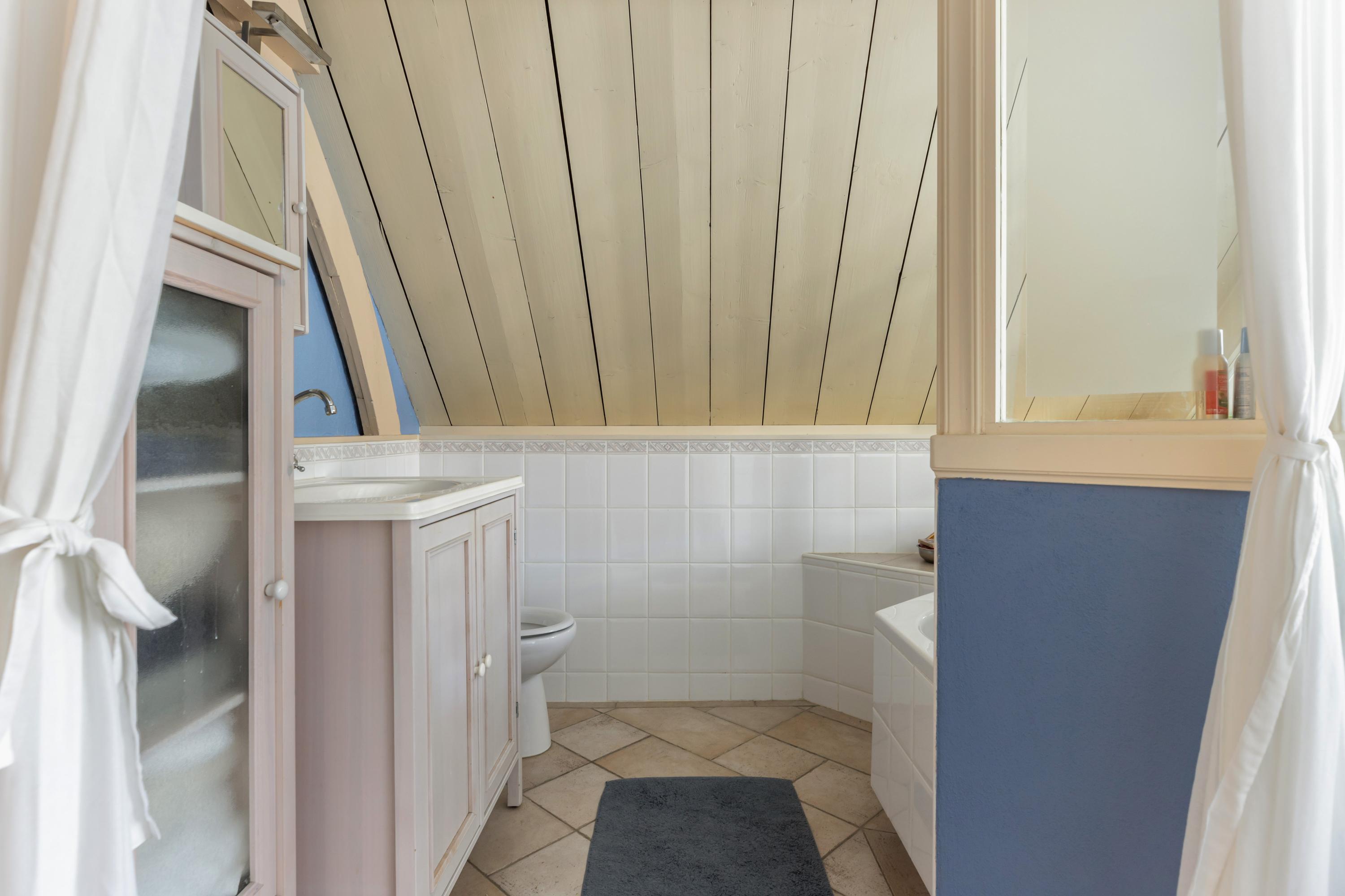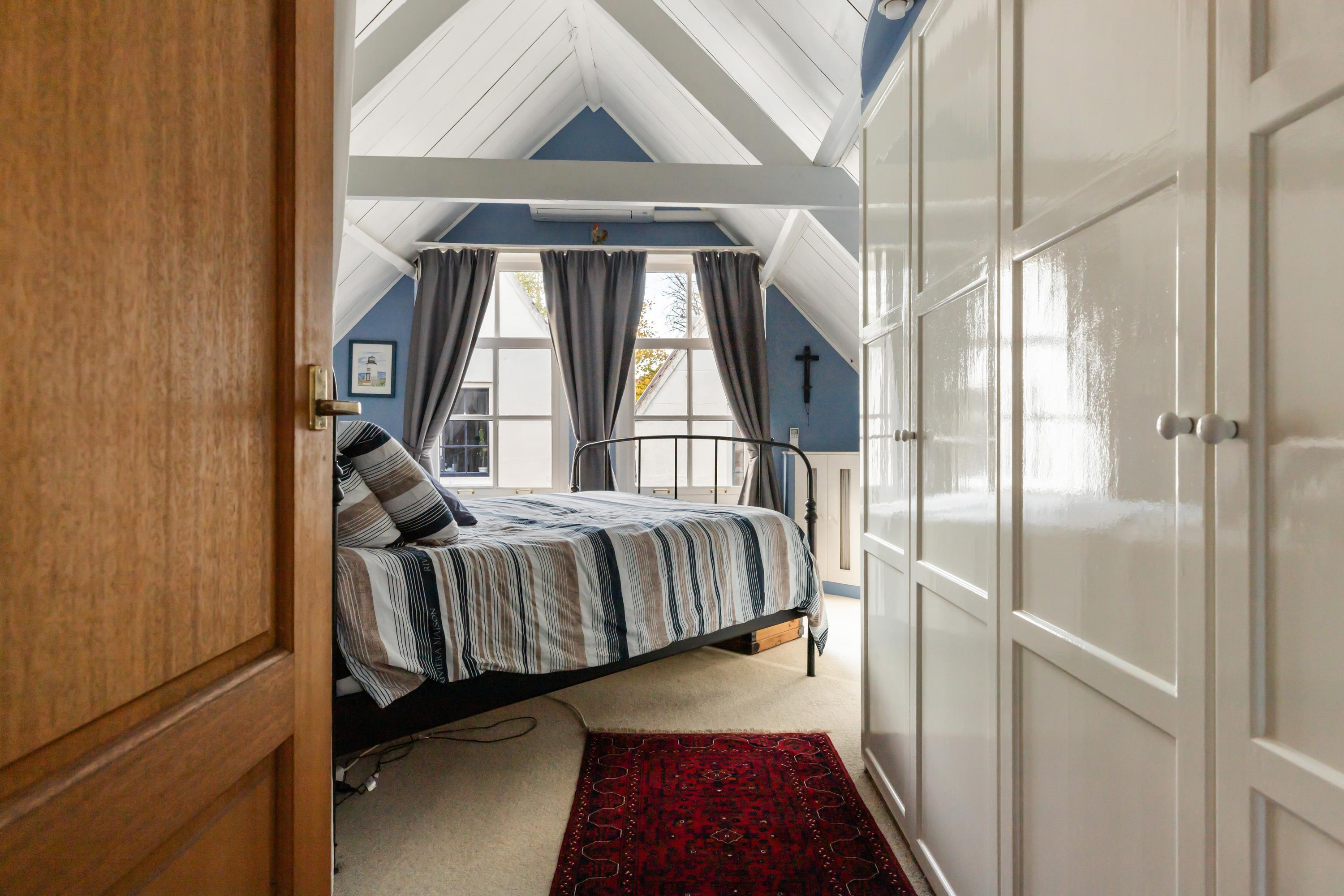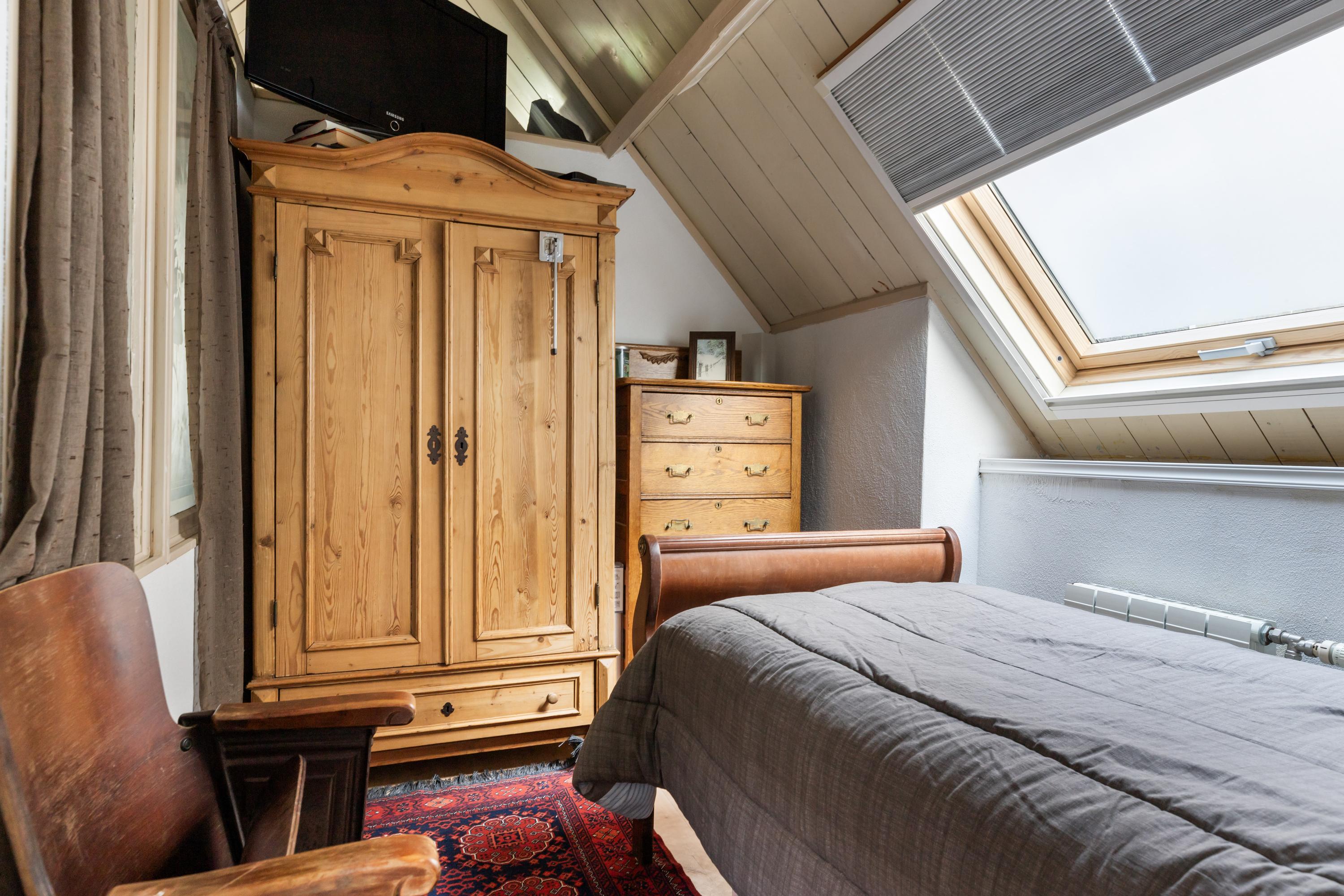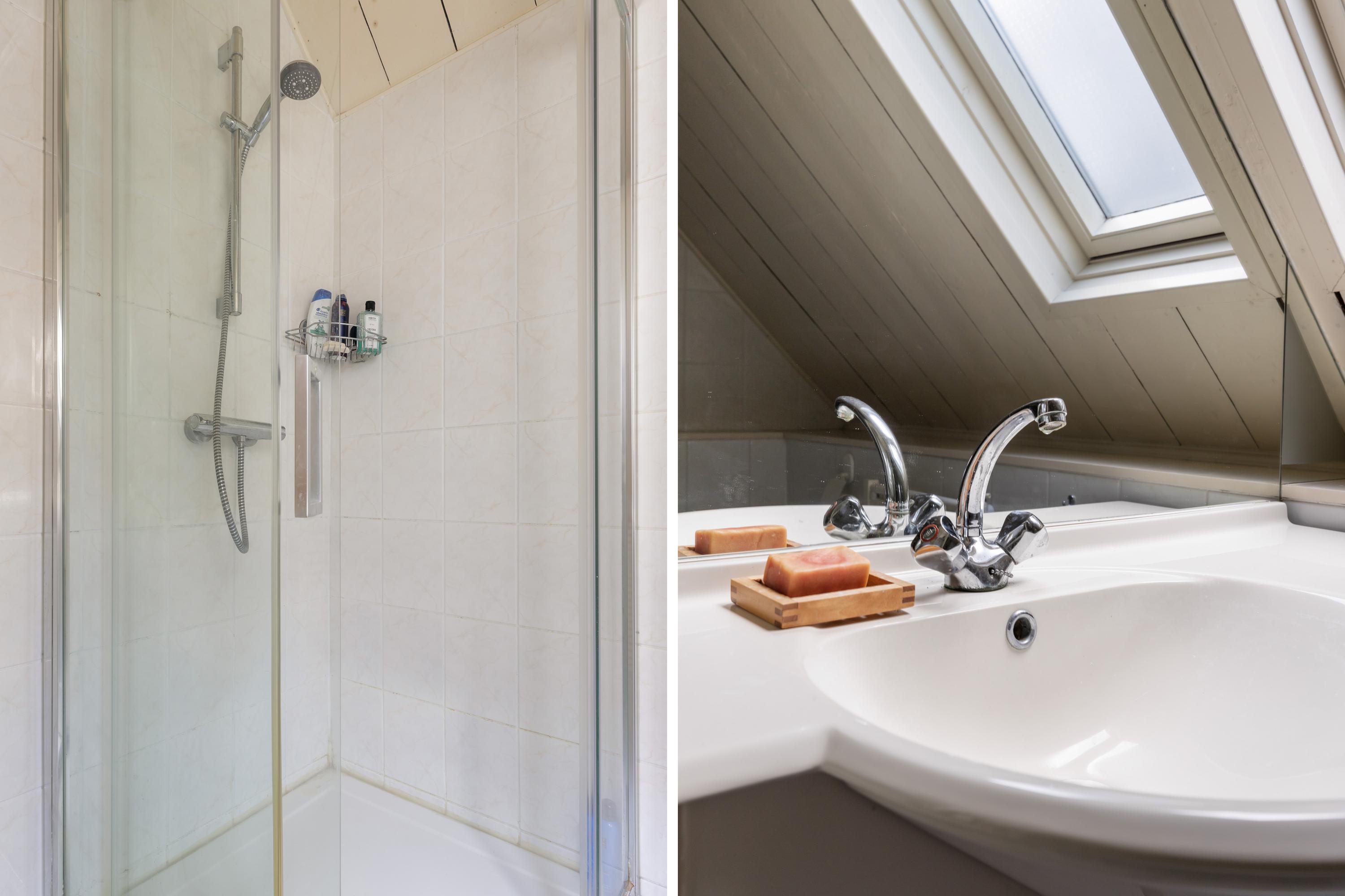 1e verdieping: overloop met Velux dakraam en een schuifkastenwand voorzien van een wasmachineaansluiting en de cv-ketel (2018). Grote slaapkamer aan de voorzijde met vaste kasten, airco en een eigen semi-open badkamer I, die is voorzien van een ligbad, wastafel met meubel en toilet. Slaapkamer in het midden met Velux dakraam, badkamer II met douchecabine, wastafel met meubel, een bidet en een Velux raam. Ruime slaapkamer aan de achterzijde met openslaande deuren en een Frans balkon.