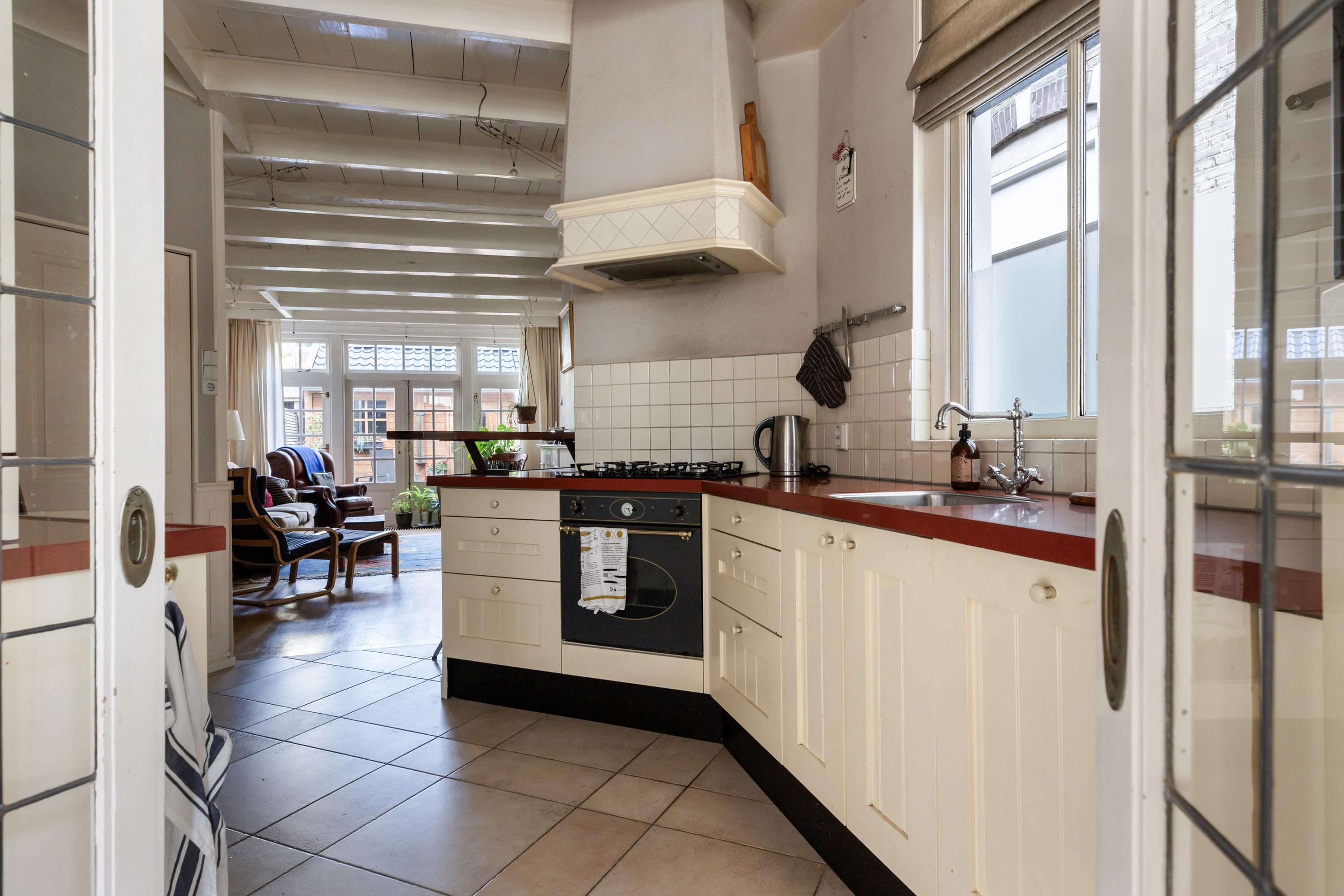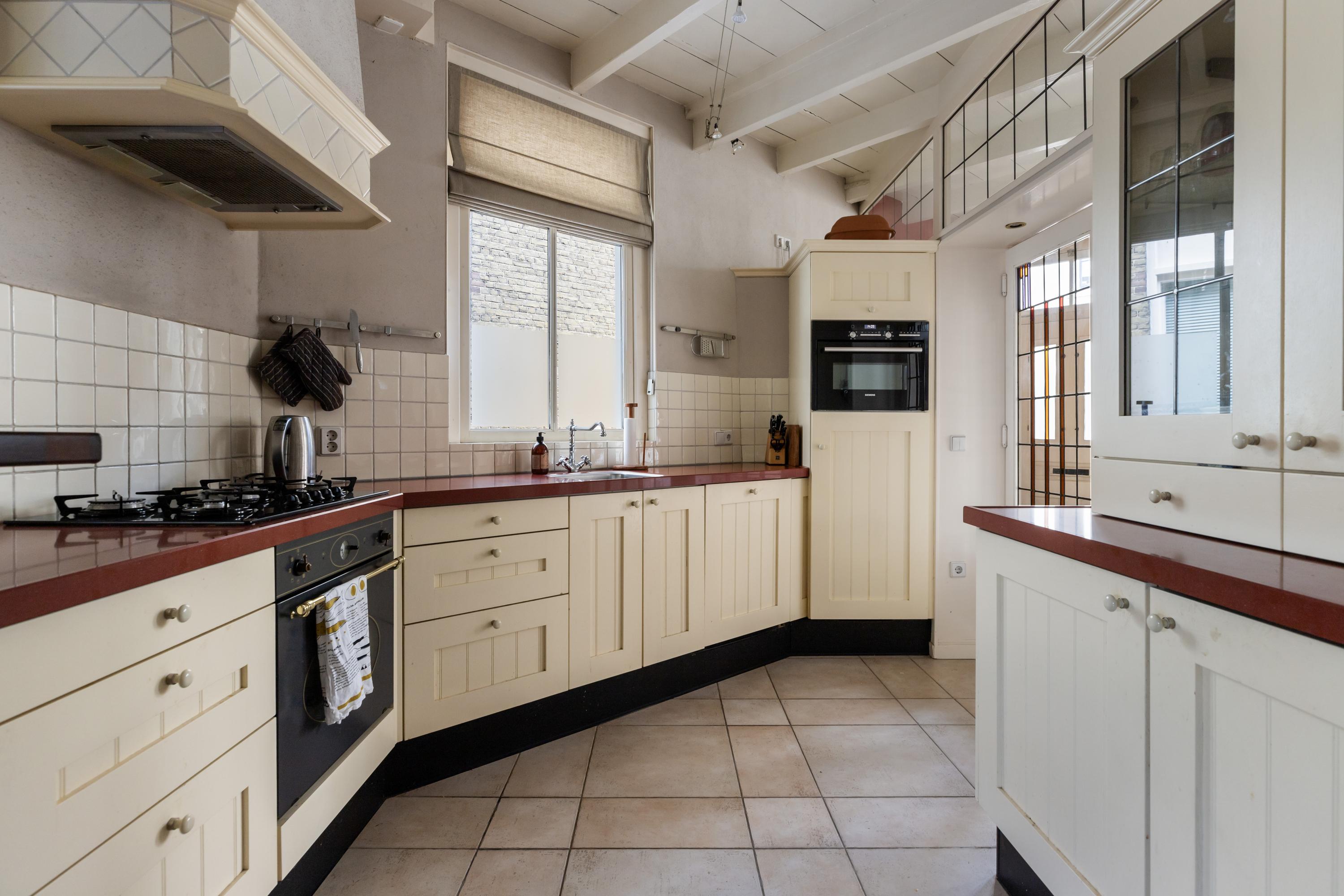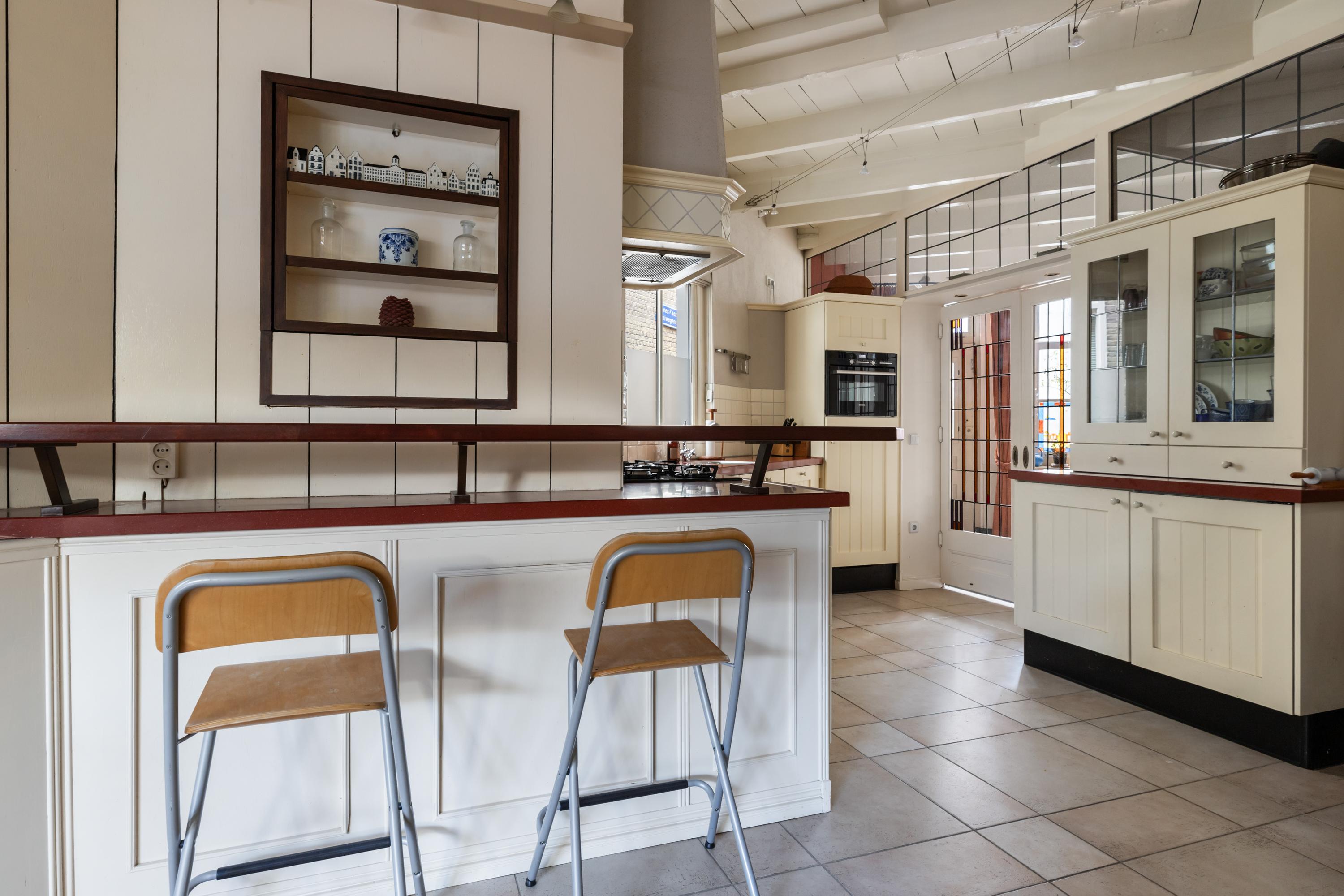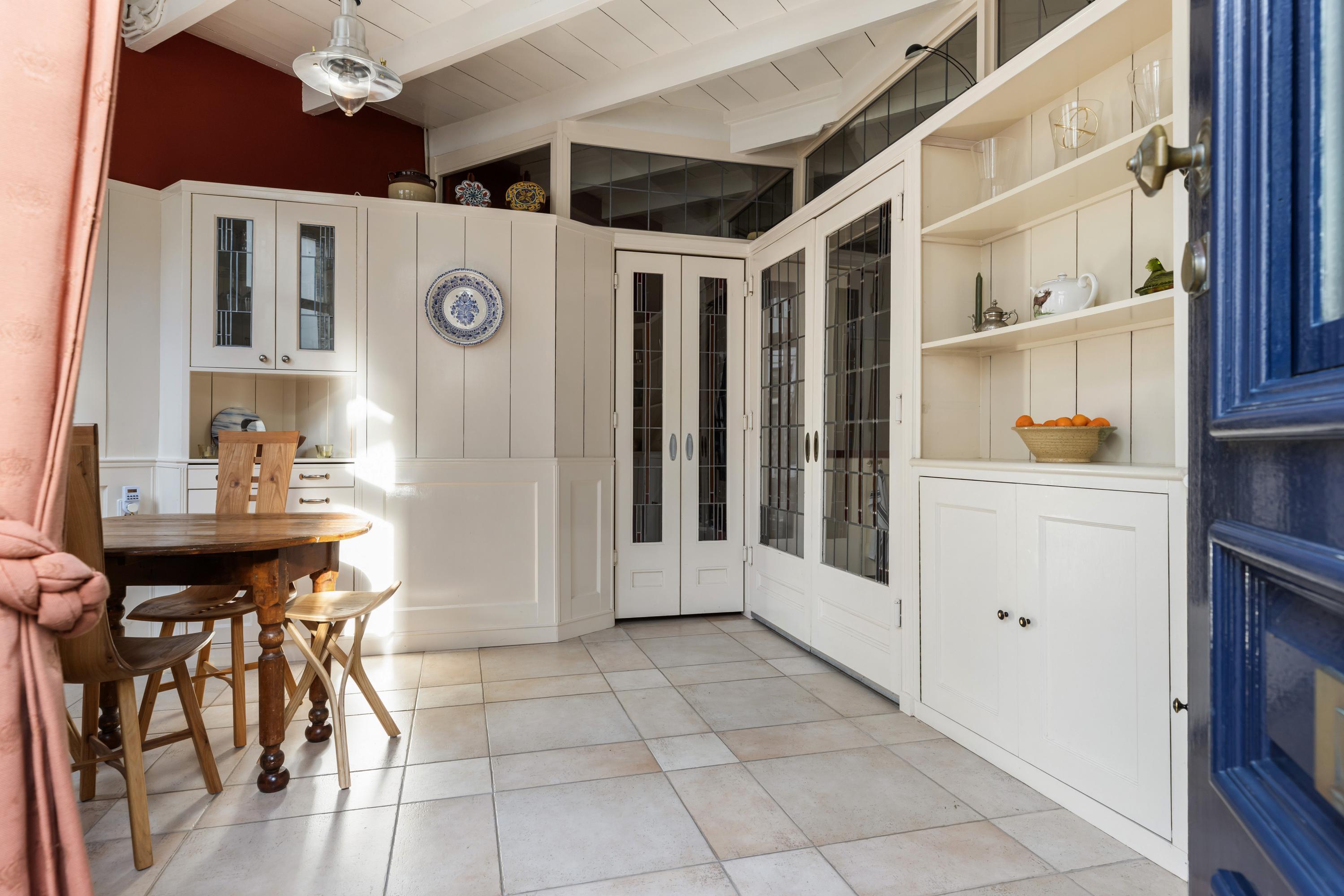 begane grond: entree, hal annex werkkamer met veel vaste kasten, glas-in-lood deur met toegang tot een portaal met toilet en trapopgang. Openslaande deuren met glas-in-lood naar de keuken, die zich in het midden van deze verdieping bevindt. Zijraam, Caesarstone aanrechtbladen (steenrood) met rvs spoelbak, close-in boiler, vaatwasser, koelkast, combi-magnetron, 5 pitsgaskookplaat, oven, afzuigkap, kastenwand met vriezer. Leuke bar met bijzonder draaikastje in de wand. Onder/achter de bar bevindt zich veel bergruimte.