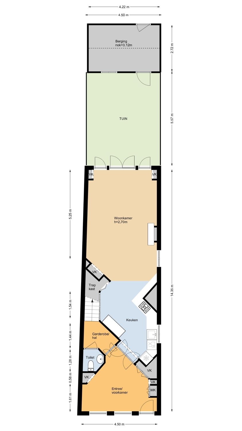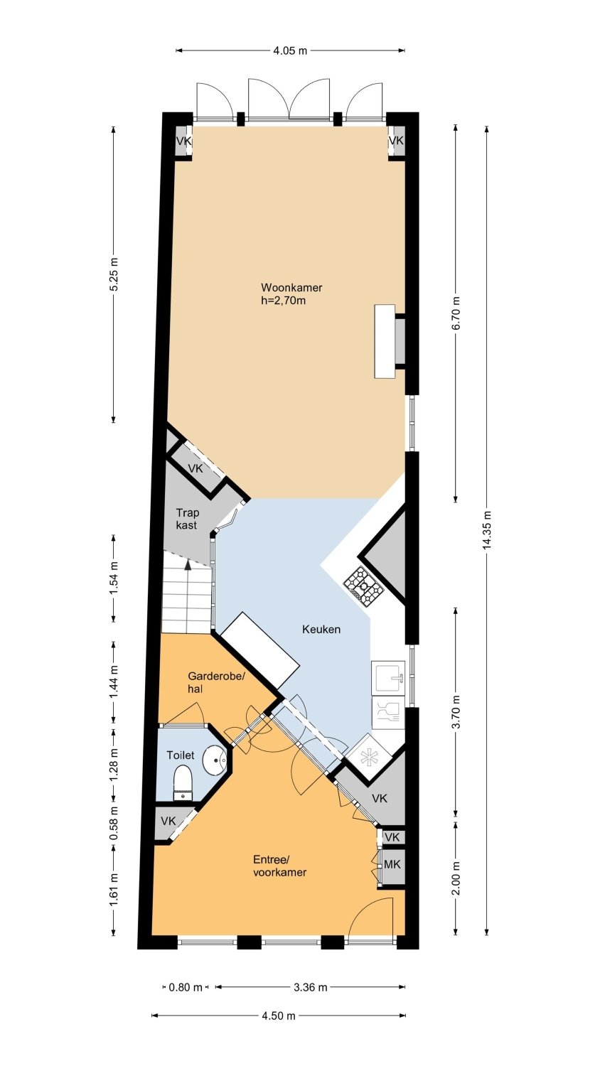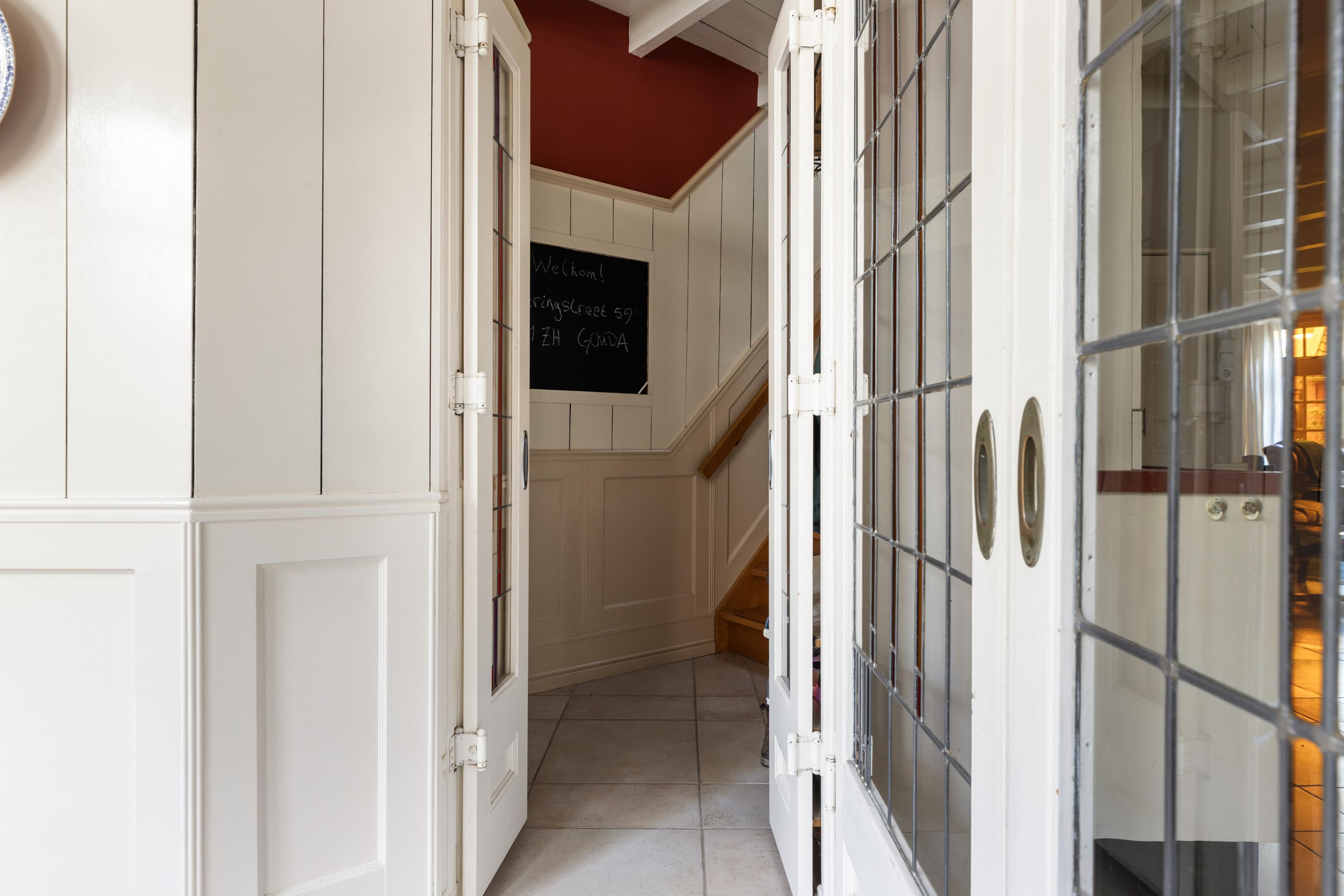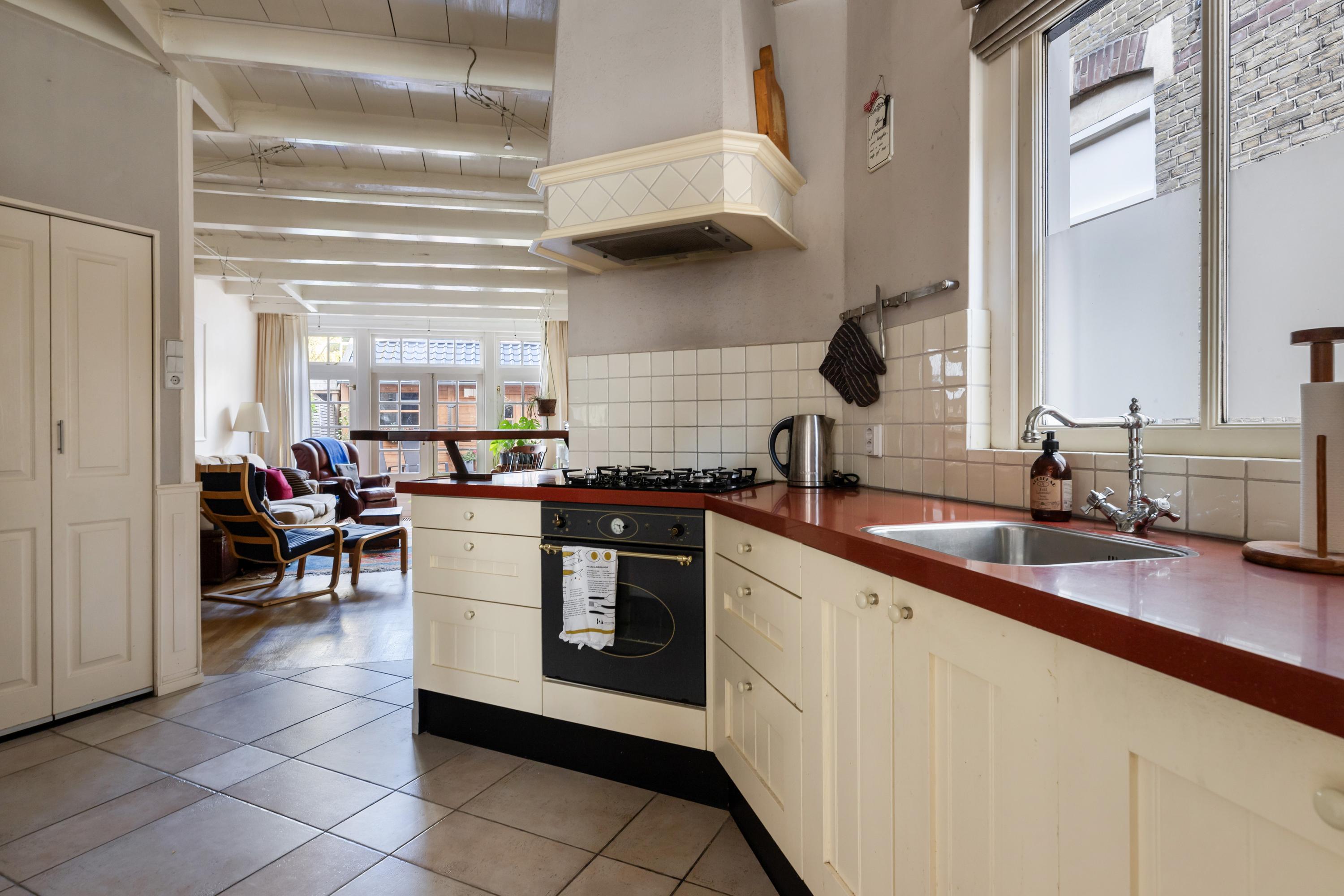 begane grond: entree, hal annex werkkamer met veel vaste kasten, glas-in-lood deur met toegang tot een portaal met toilet en trapopgang. Openslaande deuren met glas-in-lood naar de keuken, die zich in het midden van deze verdieping bevindt. Zijraam, Caesarstone aanrechtbladen (steenrood) met rvs spoelbak, close-in boiler, vaatwasser, koelkast, combi-magnetron, 5 pitsgaskookplaat, oven, afzuigkap, kastenwand met vriezer. Leuke bar met bijzonder draaikastje in de wand. Onder/achter de bar bevindt zich veel bergruimte.