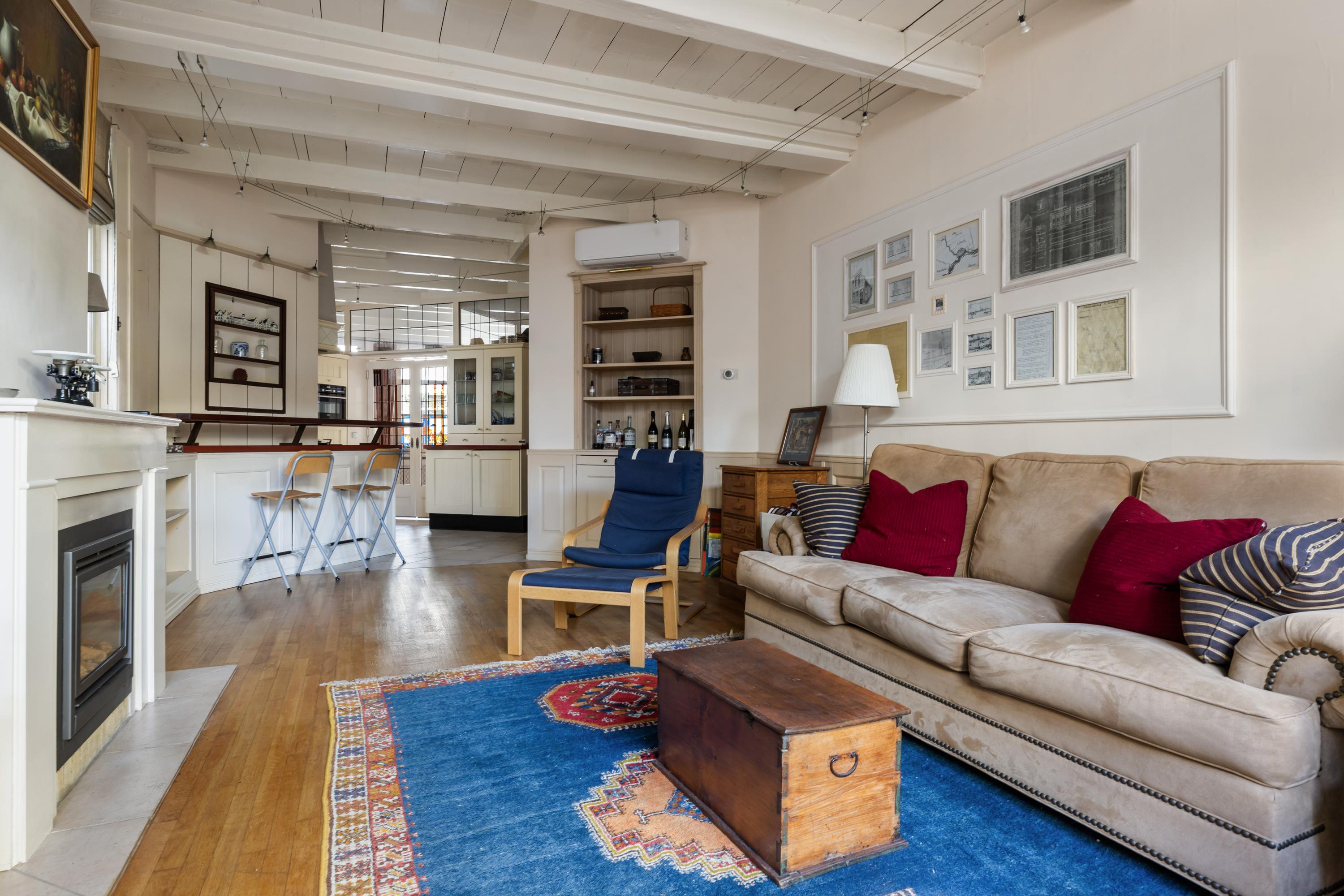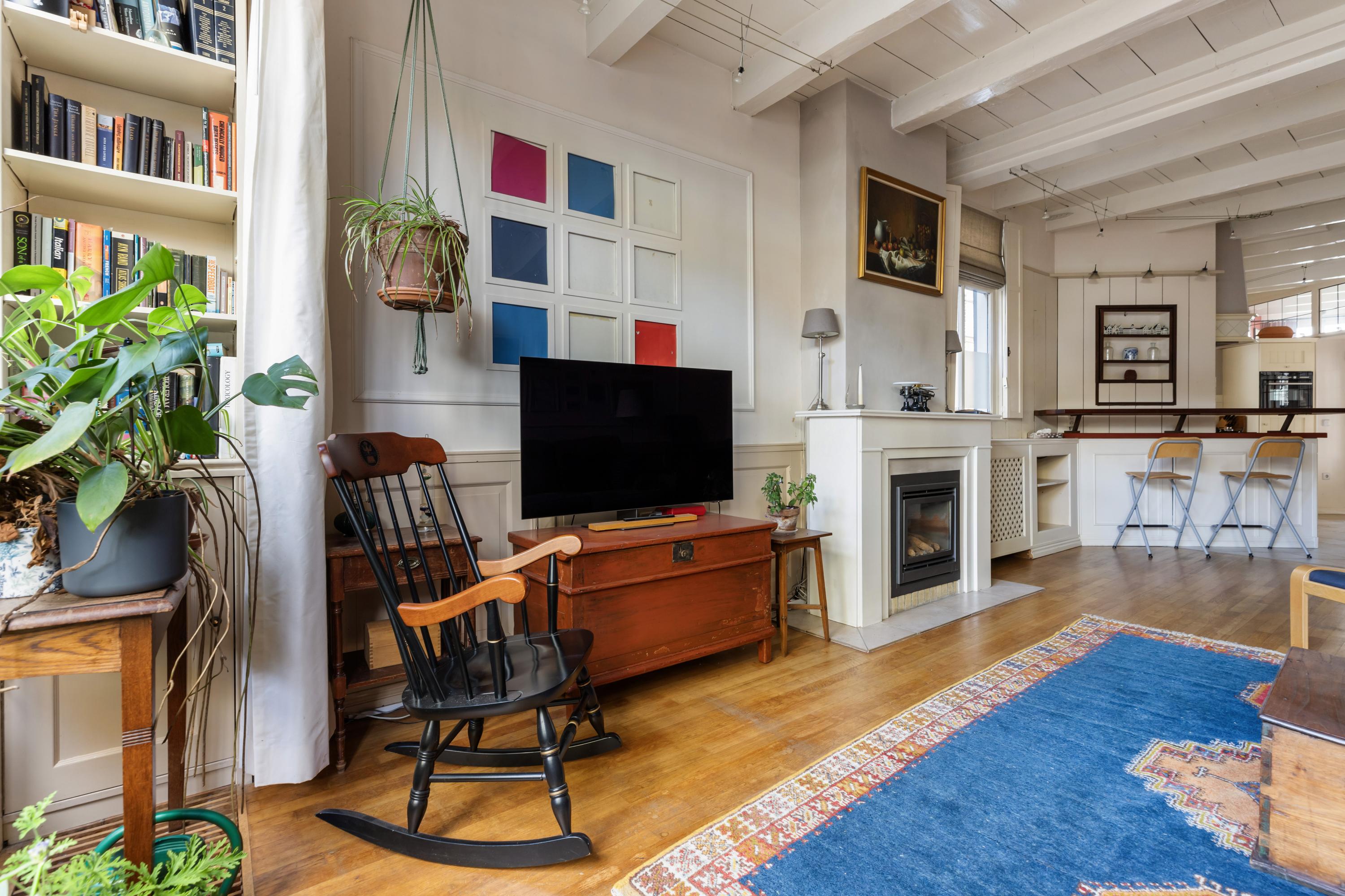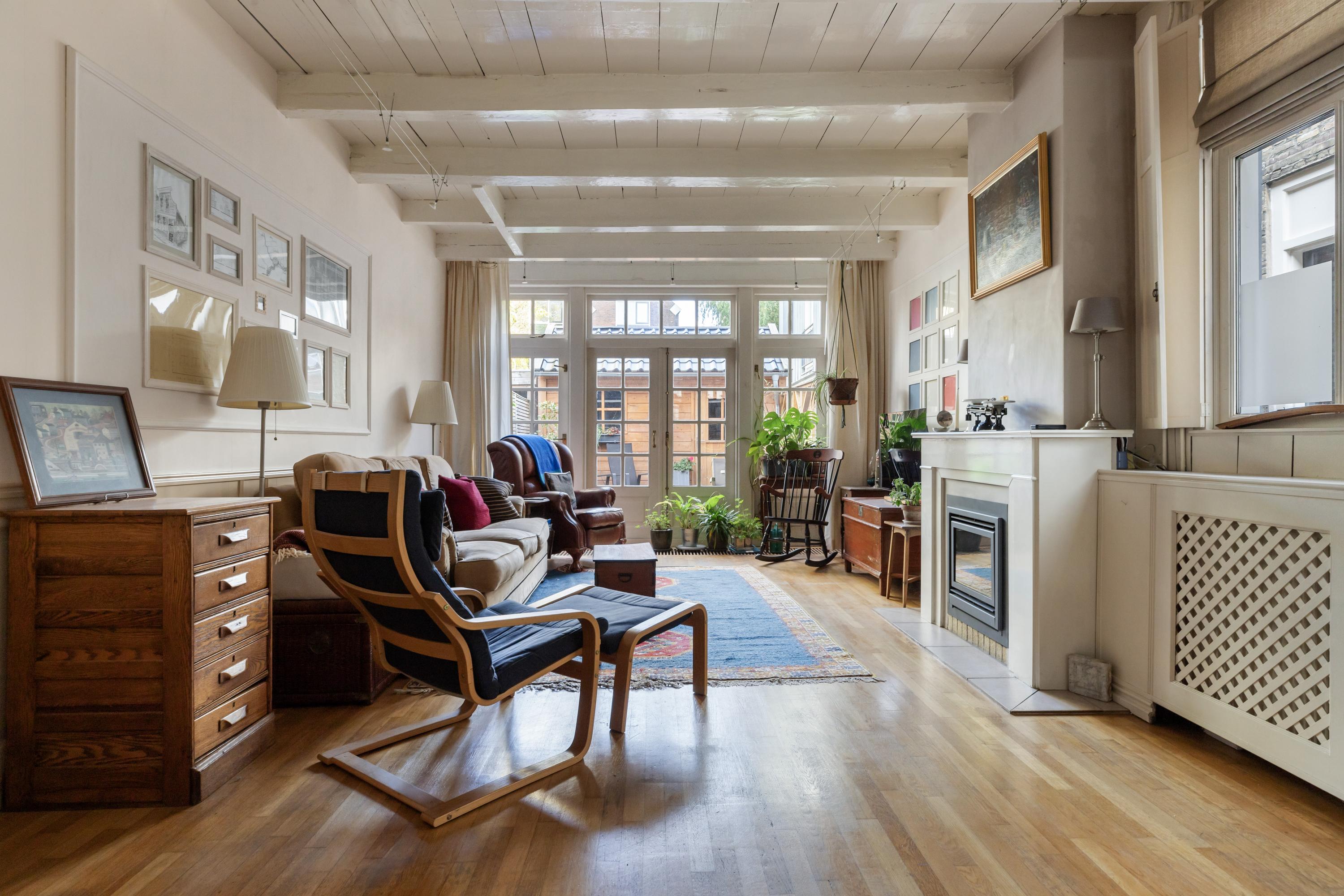 *Fijne, lichte woonkamer met balkenplafond. Op de 1e verdieping zijn de mooie kap met boogspanten in het zicht gehouden.