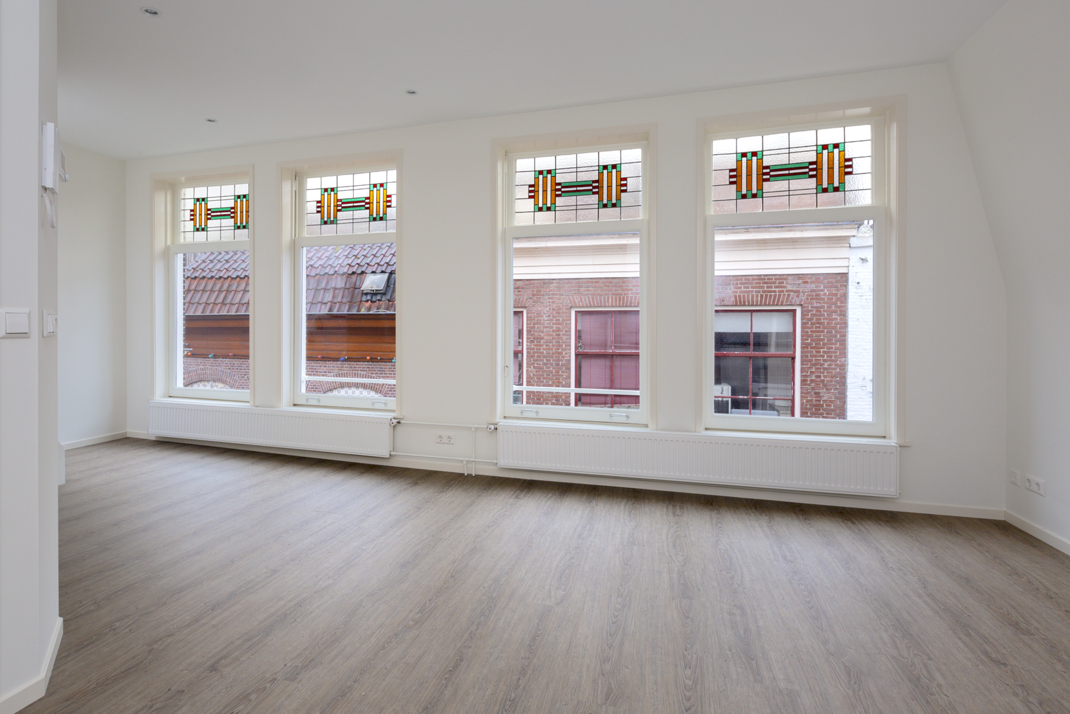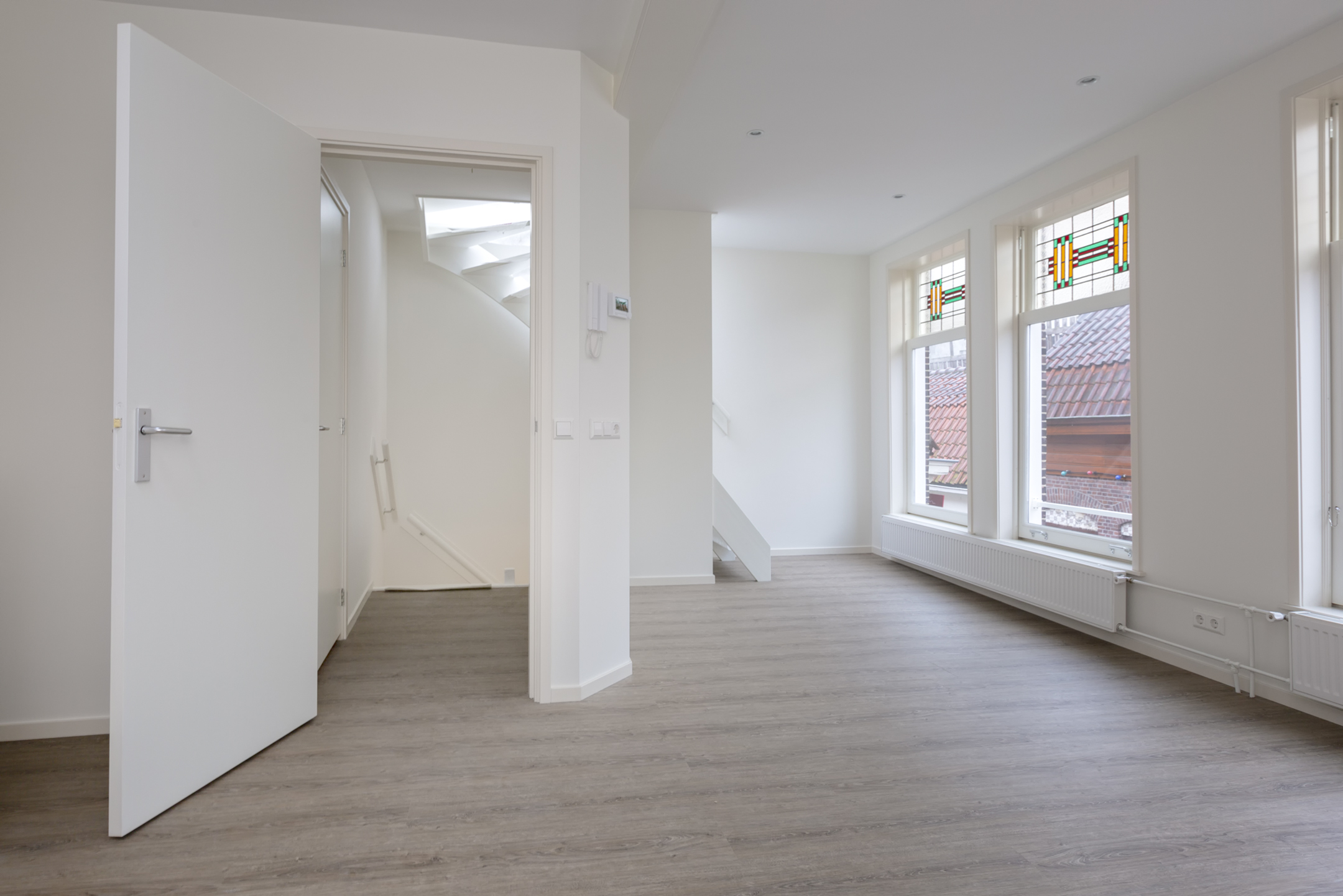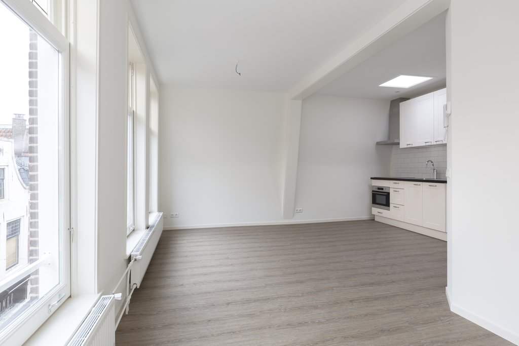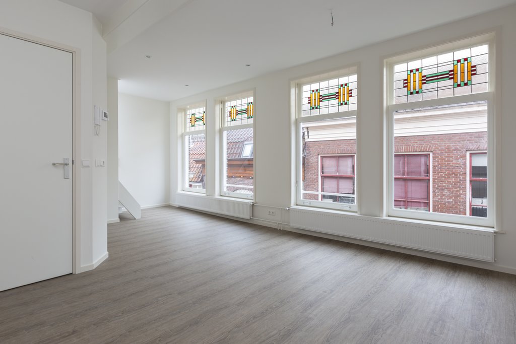2e Verdieping: hal met luxe toiletruimte met hangend toilet en fontein. In het toilet bevindt zich een wandkast met opstelling cv-ketel. Toegang tot de lichte, brede woonkamer met grote ramen met glas-in-lood bovenlichten. Luxe open keuken met lichtkoepel. De keuken is in rechte opstelling en voorzien van inductiekookplaat, rvs-afzuigkap, combimagnetron, vaatwasser, koel-/vriescombinatie en veel bergruimte. Vanuit de woonkamer toegang tot het dakterras op de bovenste verdieping met spectaculair uitzicht op de Goudse binnenstad!