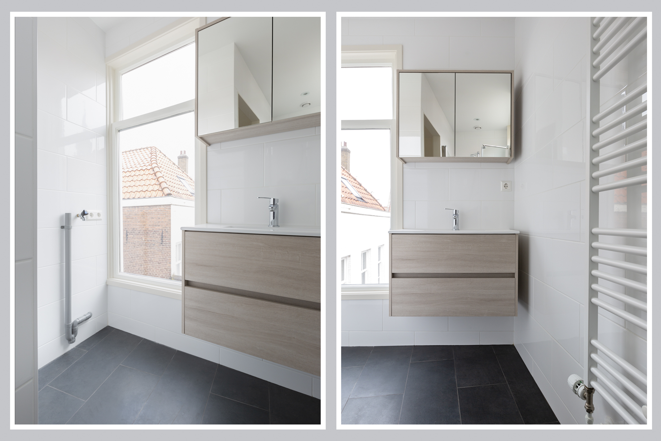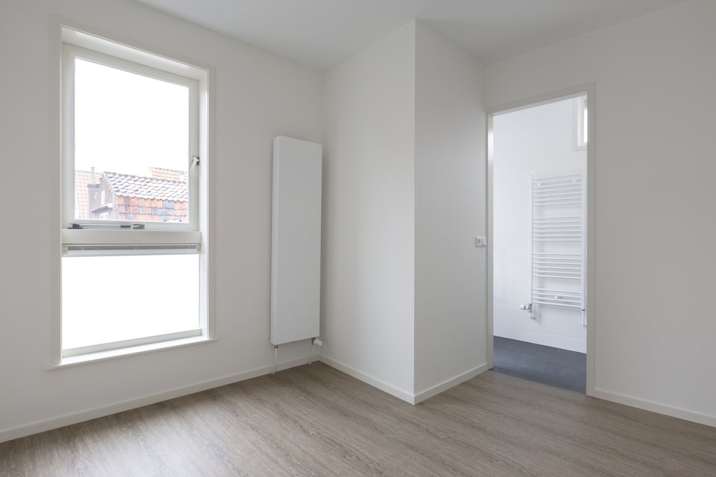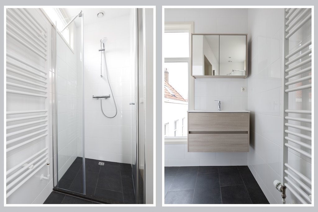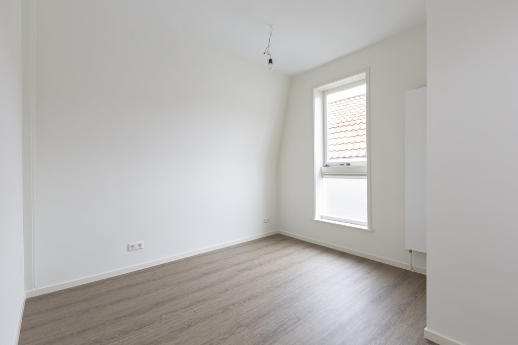 Goede slaapkamer aan de achterzijde met pvc vloer. De lichte, luxe badkamer beschikt over een inloopdouche met strakke glazen douchewand, wastafelmeubel met spiegelkast en een sierradiator.