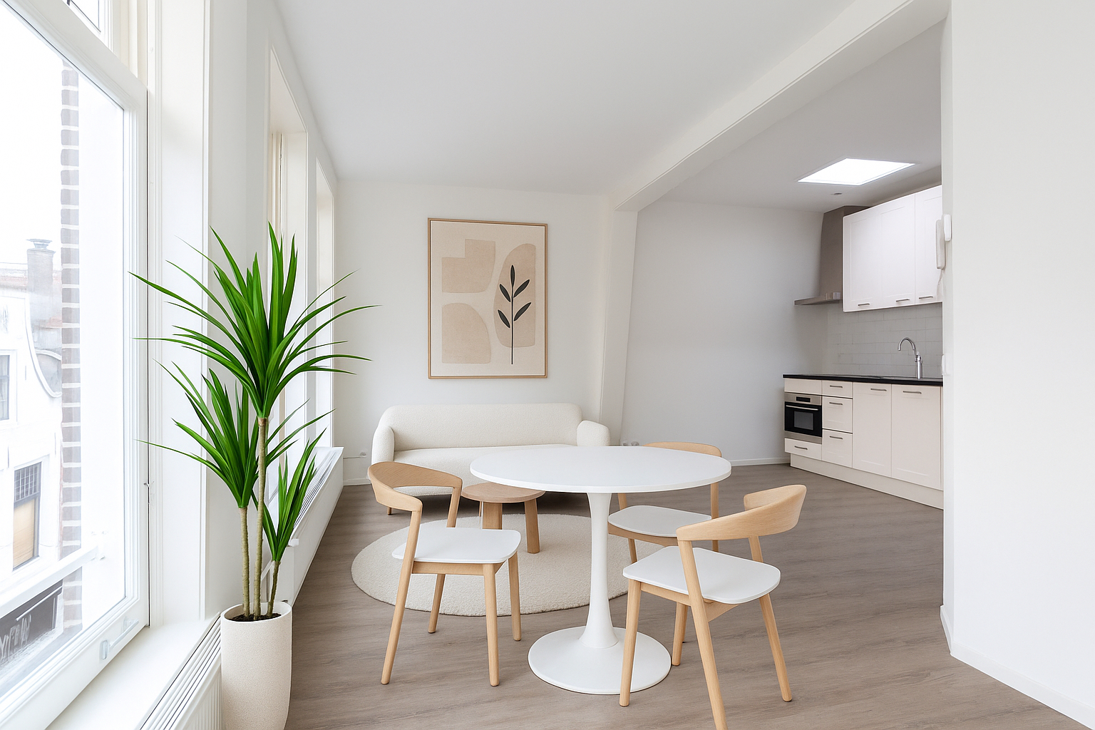 * Het appartement wordt turn key opgeleverd: de woning is gestoffeerd en geheel voorzien van een moderne licht eiken pvc vloer en lichte, glad gestucte wandafwerking.