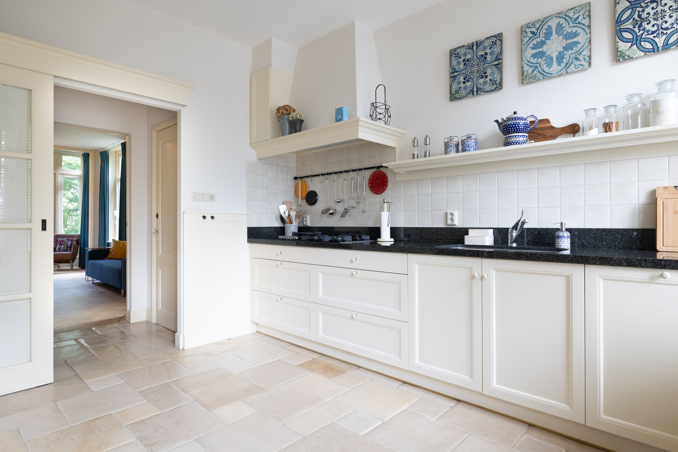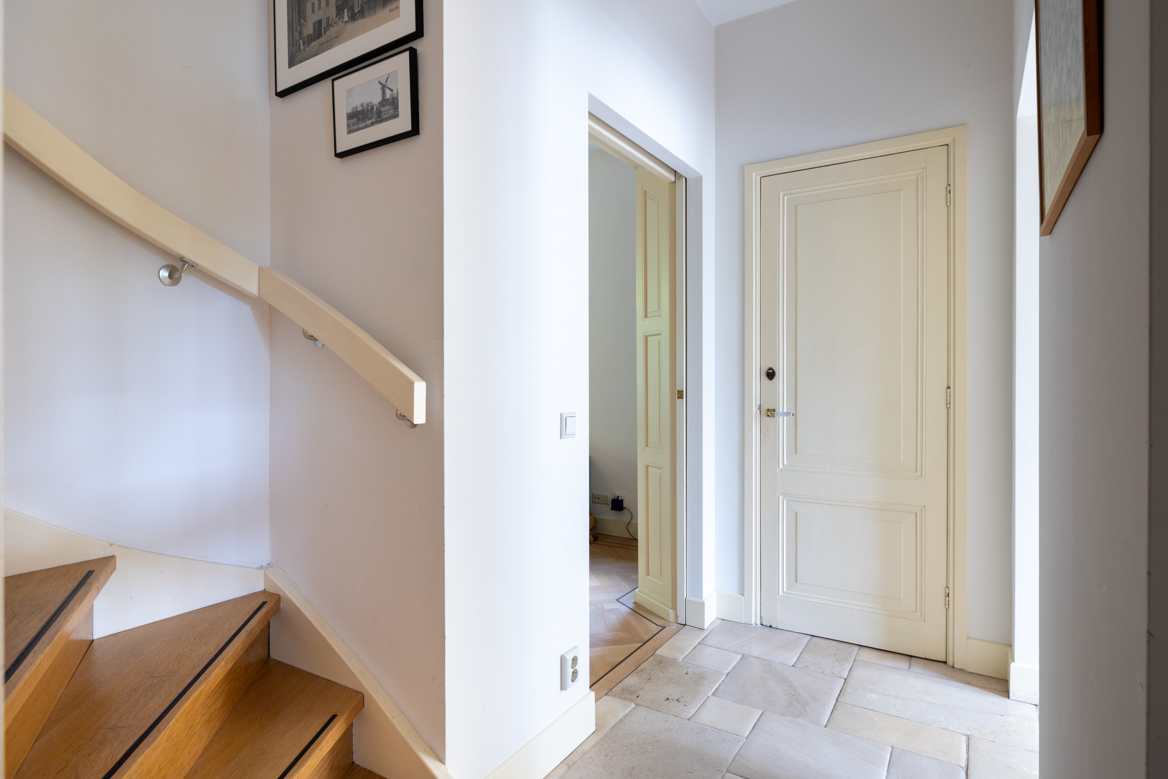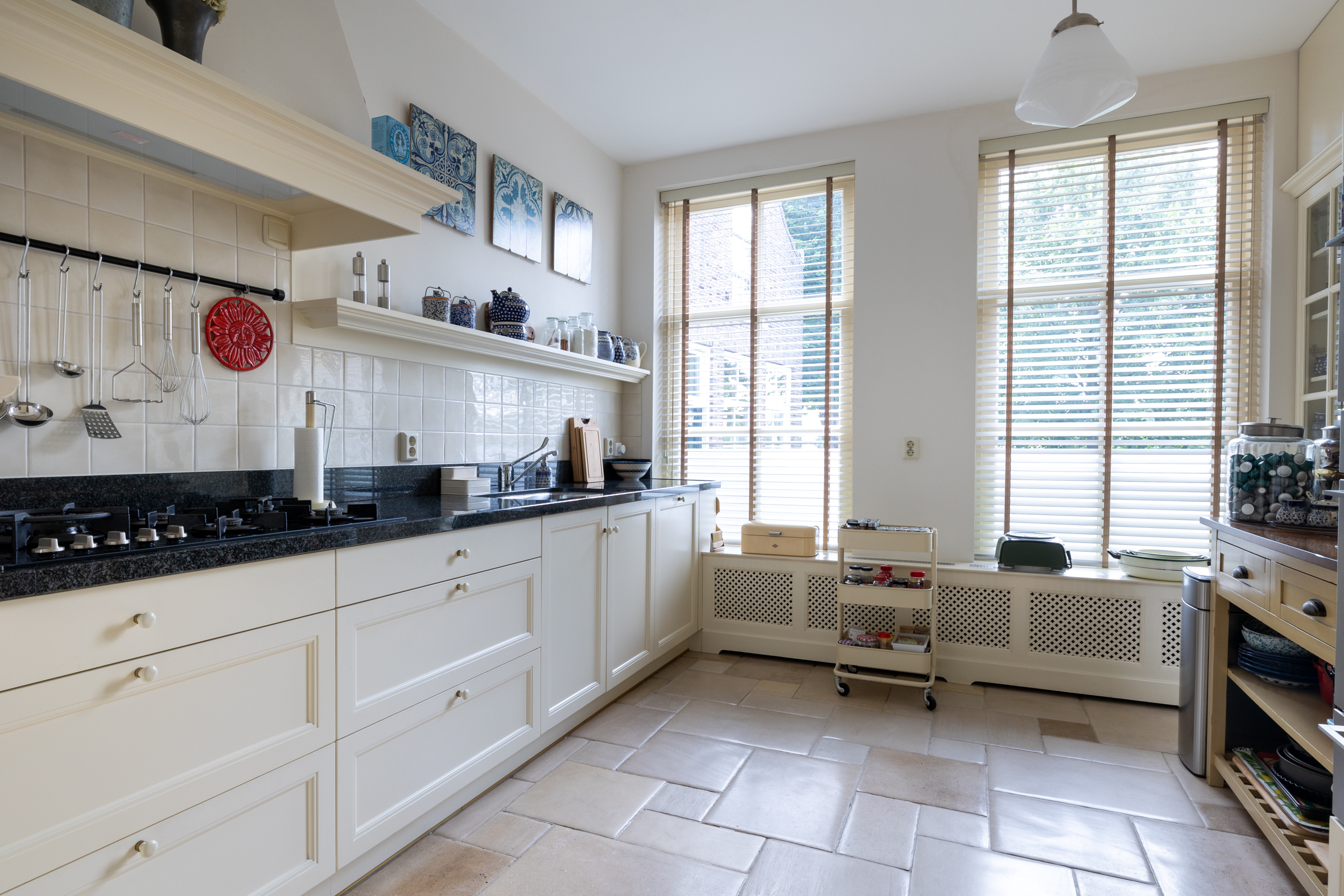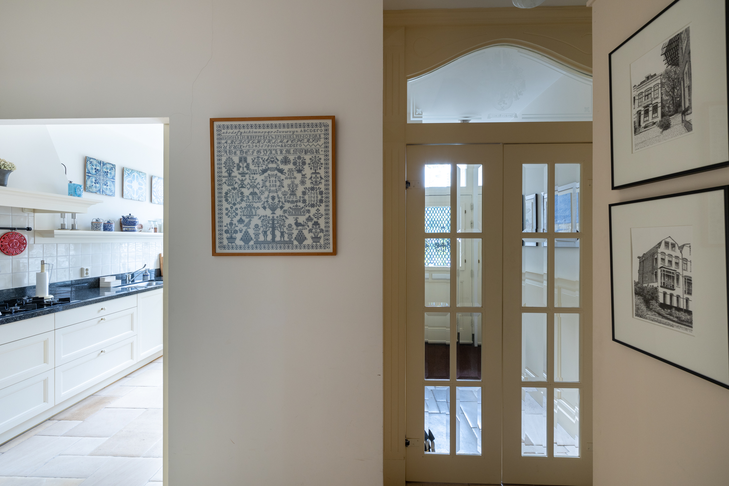 Bel-etage: entree, vestibule, gang met luxe toilet met fontein. Woonkeuken aan de voorzijde met luxe keuken in lichte kleurstelling met donker granieten blad, 5 pits gaskookplaat met wokbrander (2017), afzuigkap, oven en magnetron, bordenwarmer, koelkast/vriezer en vaatwasser. De keuken is voorzien van een mooie, lichte stenen vloer die doorloopt in de hal en vestibule. Aan de achterzijde bevindt zich de woonkamer met mooie kastenpartij, hoog stucplafond, matte, eiken visgraat parketvloer met bies, zijraam en fraaie erker met prachtige raampartij en Frans balkon met een overweldigend uitzicht op het park!