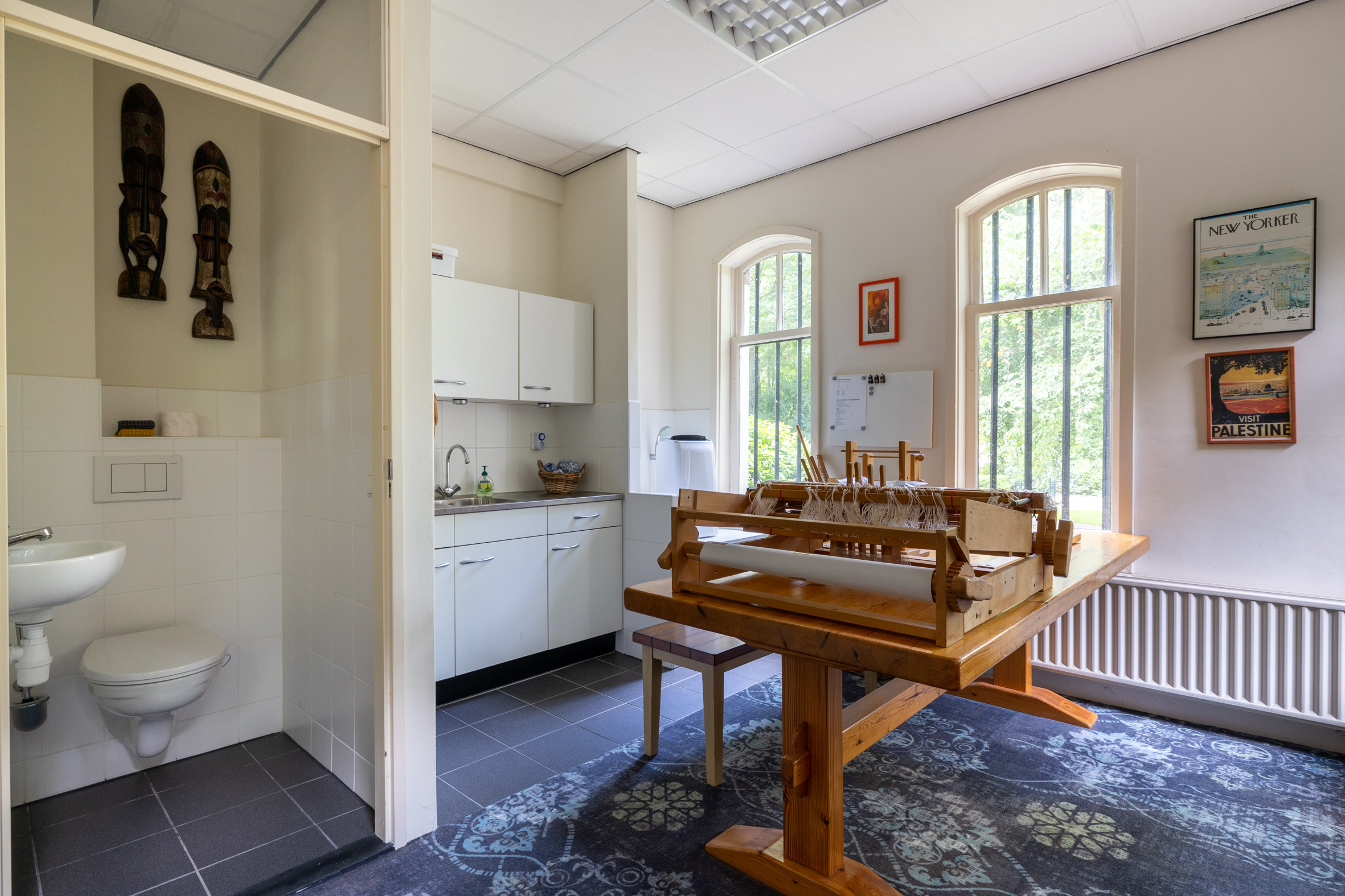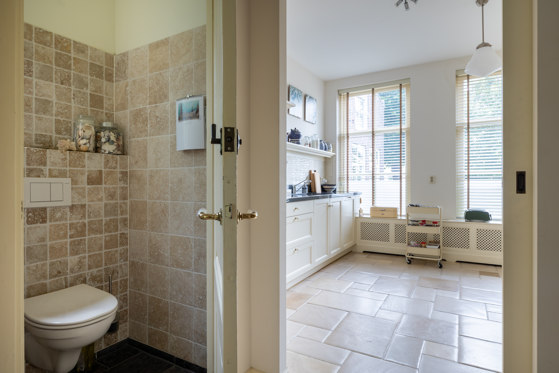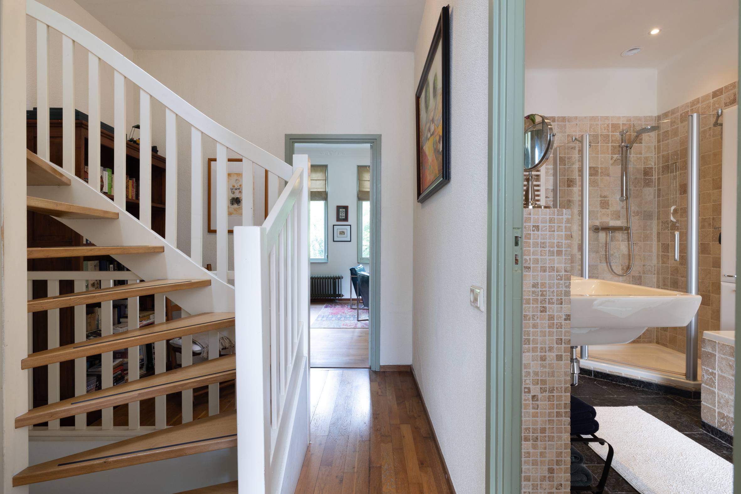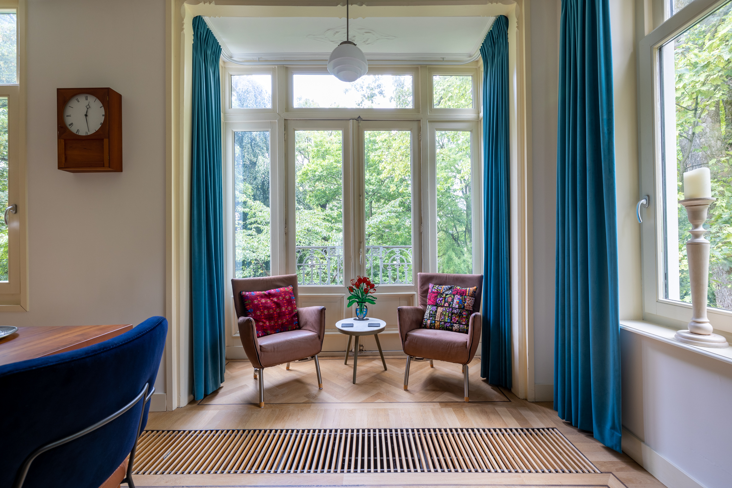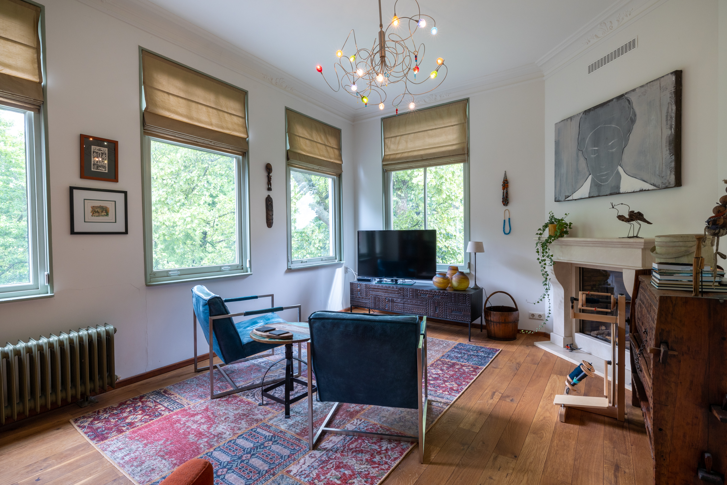 De luxe afgewerkte badkamer is voorzien van ligbad, douche, toilet, dubbele wastafel, sierradiator, vloerverwarming en luxe, getrommeld marmeren betegeling en een donkere plavuizenvloer. Fraaie werk-/slaapkamer aan de achterzijde met eikenhouten vloer, zandstenen schouw met gashaard (2007) en grote raampartijen met een fenomenaal uitzicht op het park.
