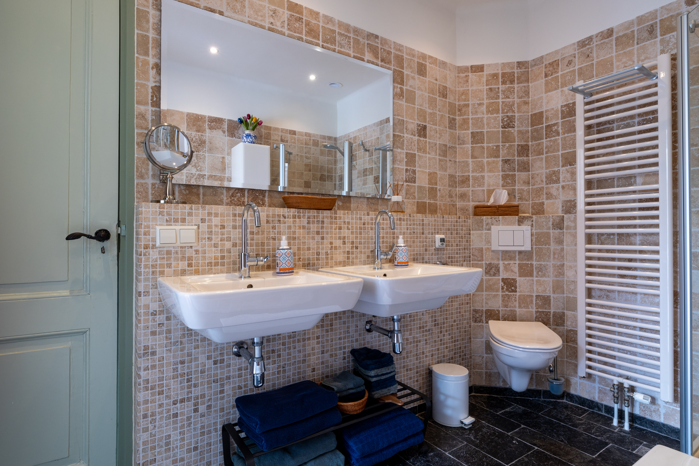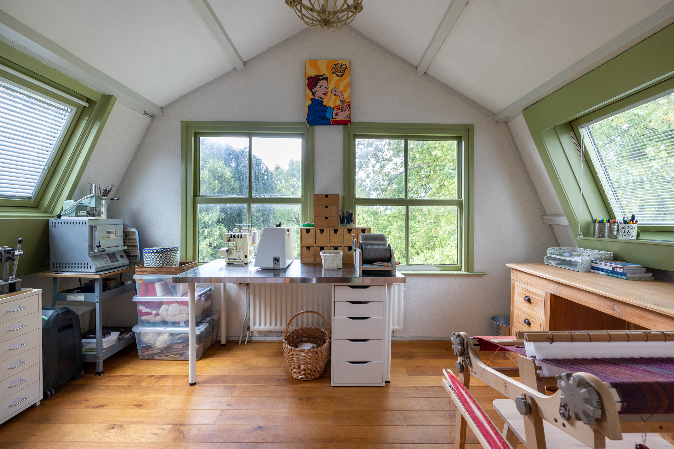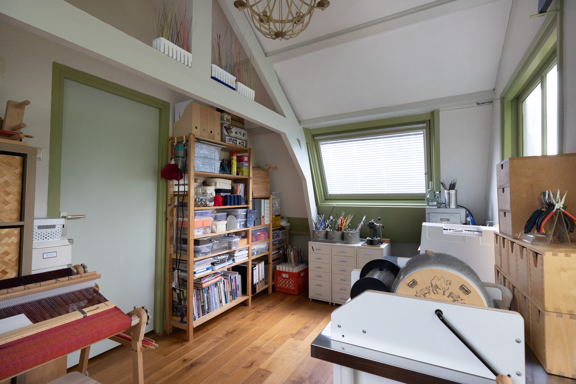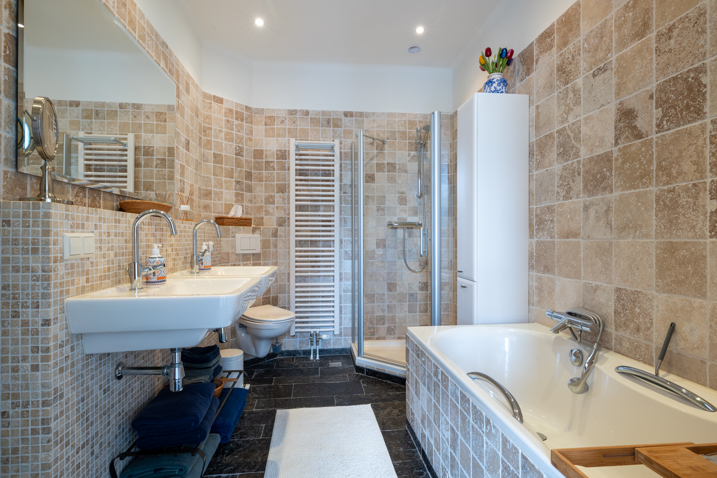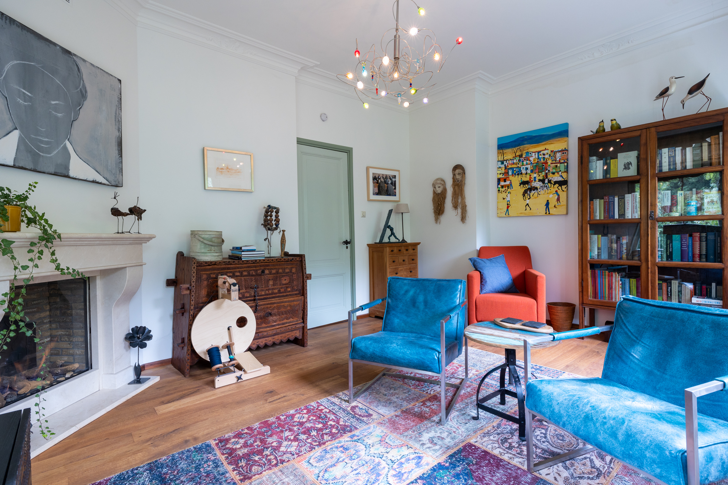 De luxe afgewerkte badkamer is voorzien van ligbad, douche, toilet, dubbele wastafel, sierradiator, vloerverwarming en luxe, getrommeld marmeren betegeling en een donkere plavuizenvloer. Fraaie werk-/slaapkamer aan de achterzijde met eikenhouten vloer, zandstenen schouw met gashaard (2007) en grote raampartijen met een fenomenaal uitzicht op het park.