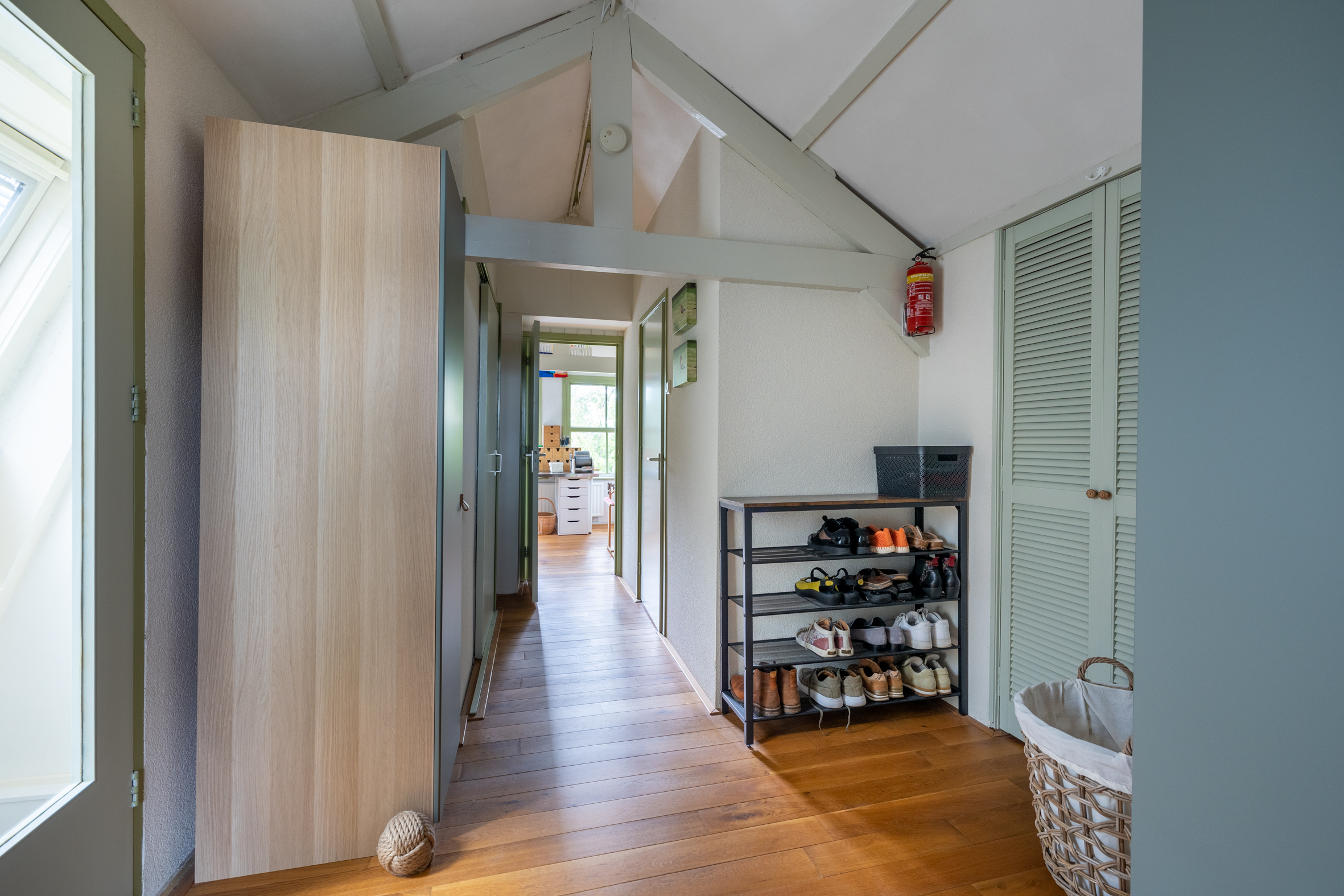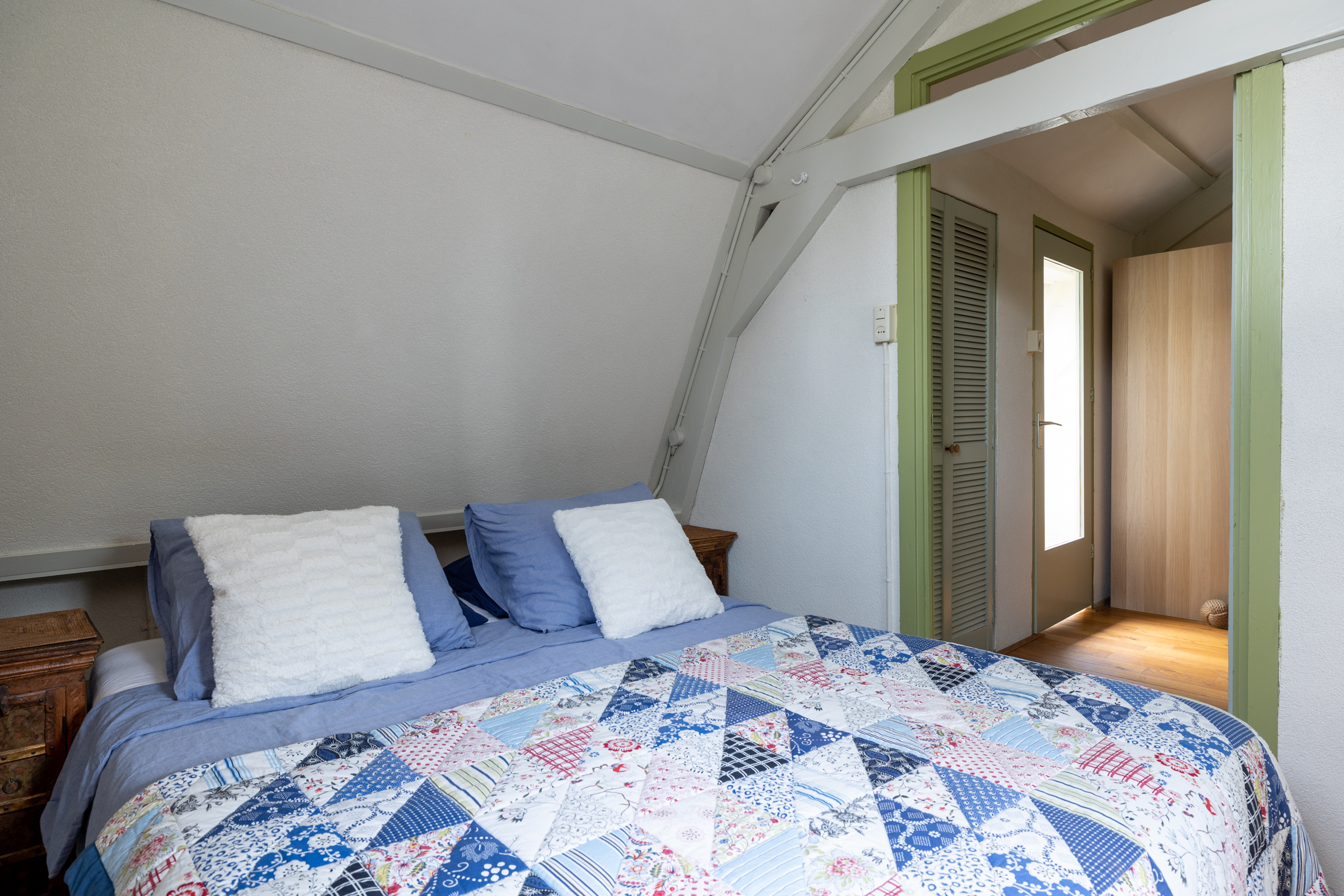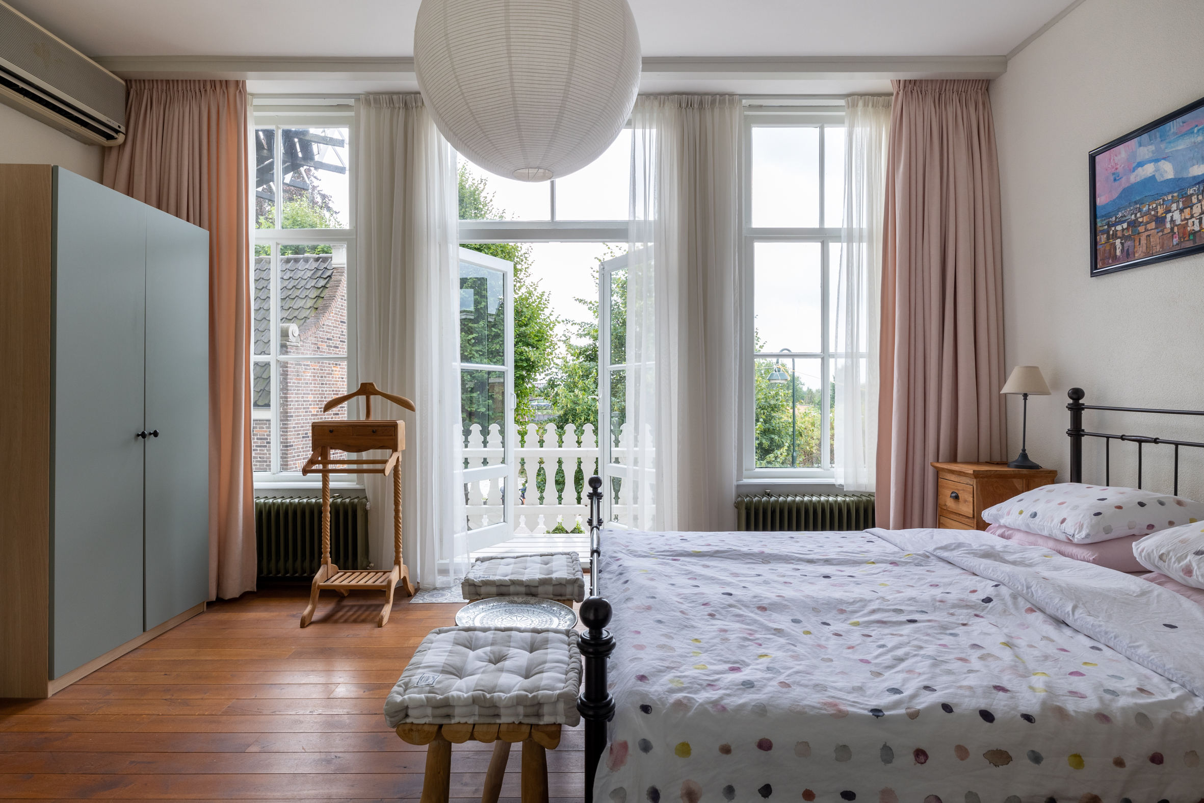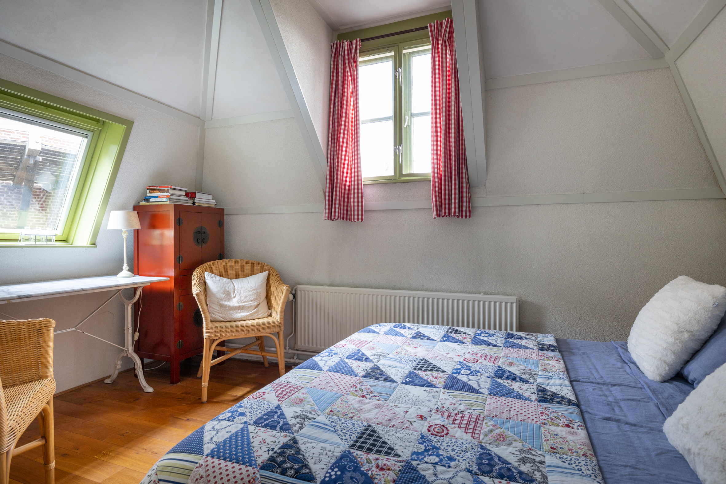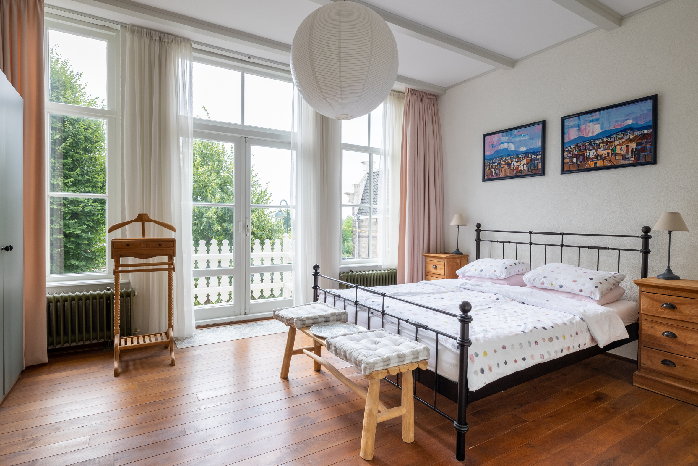 1e verdieping: overloop, mooie, grote slaapkamer aan de voorzijde met eikenhouten vloer, hoog balkenplafond, ruim balkon met openslaande deuren en vrij uitzicht richting de rivier de Hollandse IJssel. Vanuit deze kamer is er toegang tot de badkamer. De badkamer is eveneens toegankelijk via de overloop.