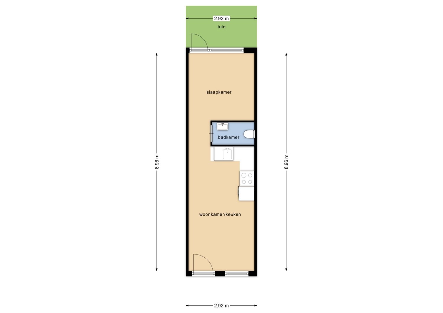 begane grond: entree, lichte woonkamer met een eenvoudige open keuken. Groot raam aan de voorzijde. De keuken is uitgevoerd in wit kunststof. Gang met toegang tot de badkamer met toilet en douche. Aan de achterzijde bevindt zich de slaapkamer.
