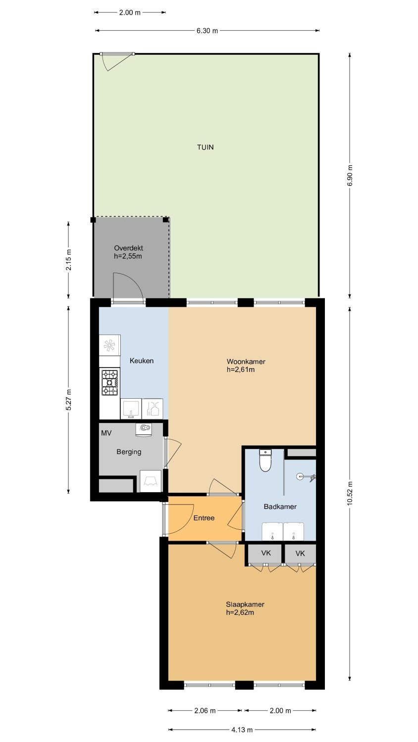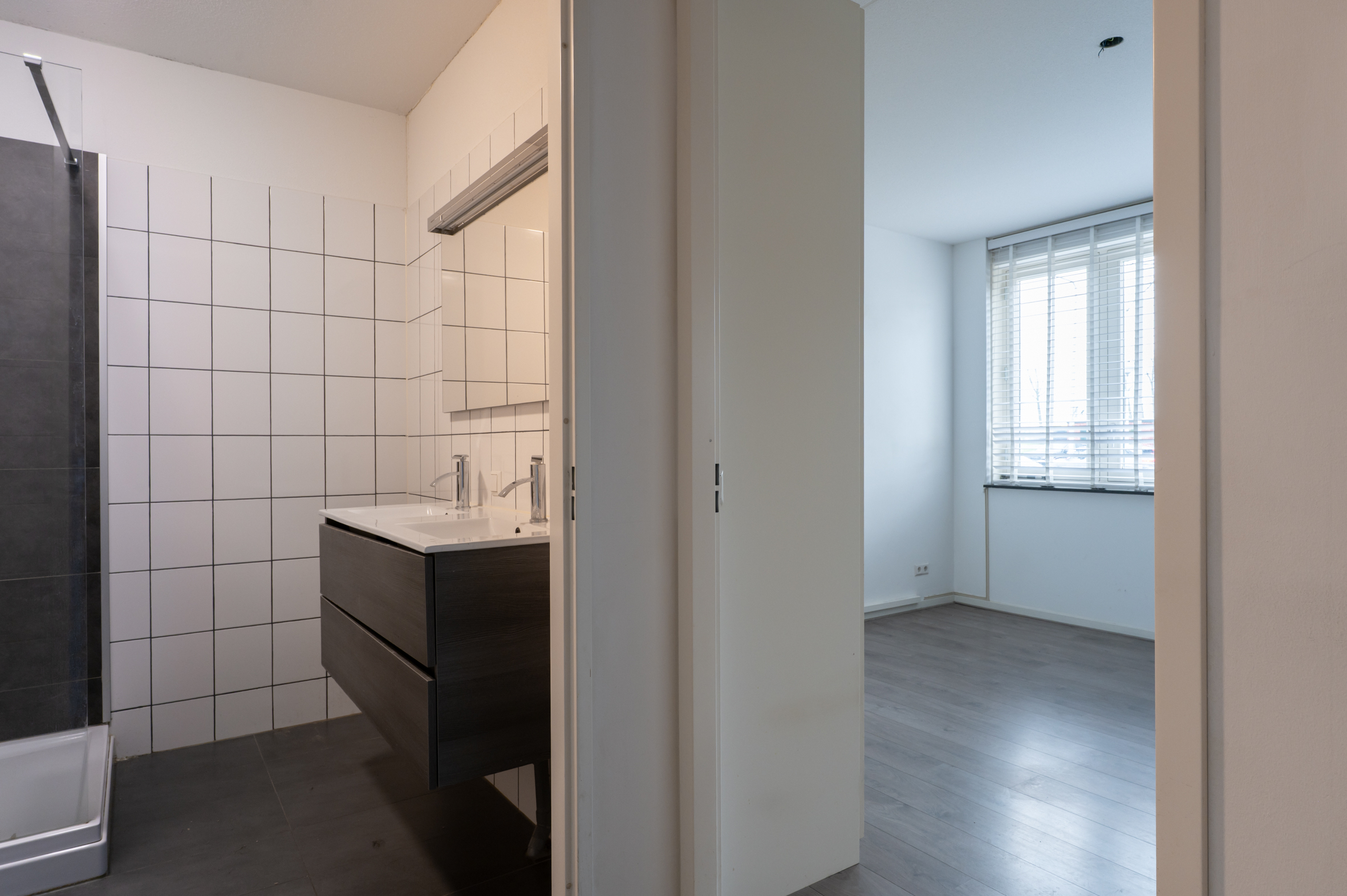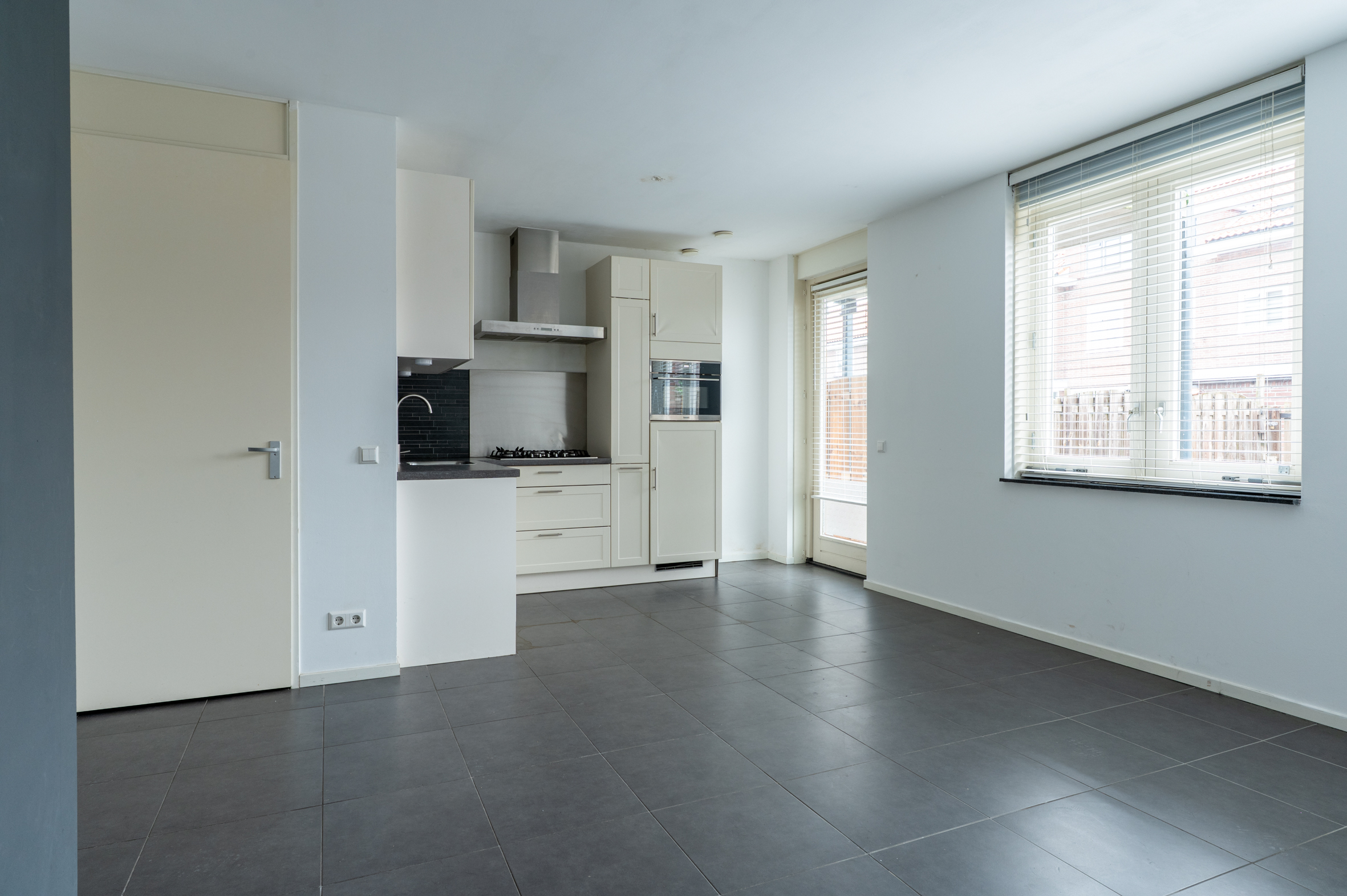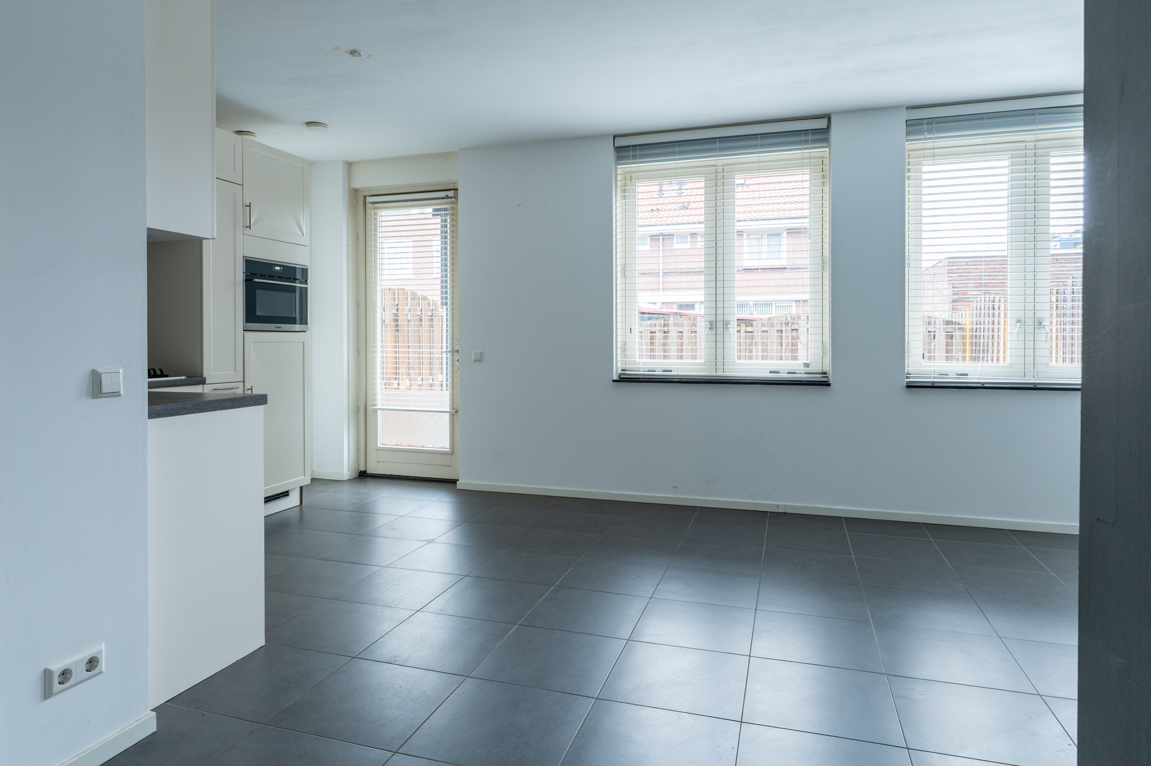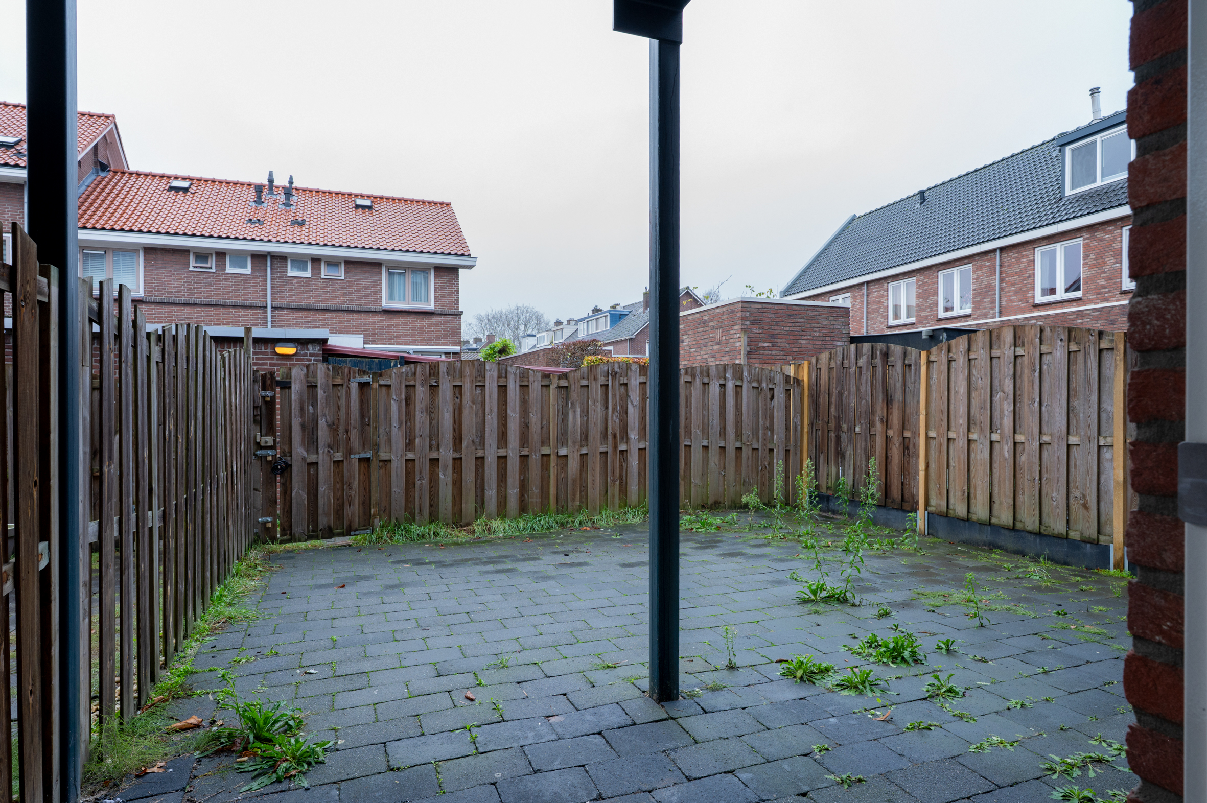 Privé-entree, hal, tuingerichte woonkamer van maar liefst 6.10 breed (!) met grote ramen en toegang tot de tuin. Luxe open keuken (wit kunststof) met een zwart aanrechtblad met rvs spoelbak, circulatiekap, gaskookplaat, combi-magnetron, koelkast met vriesvak, vaatwasser en veel kastruimte. Aparte berg-/was-cv-ruimte. Ruime slaapkamer aan de voorzijde. Moderne, inpandige badkamer met witte wandtegels en antraciet vloertegels, douche met glazen spatscherm en luxe douchegarnituur, dubbele wastafel met meubel, toilet.