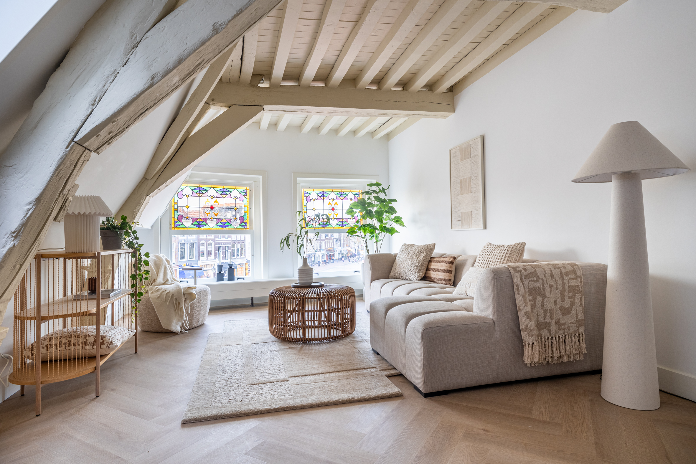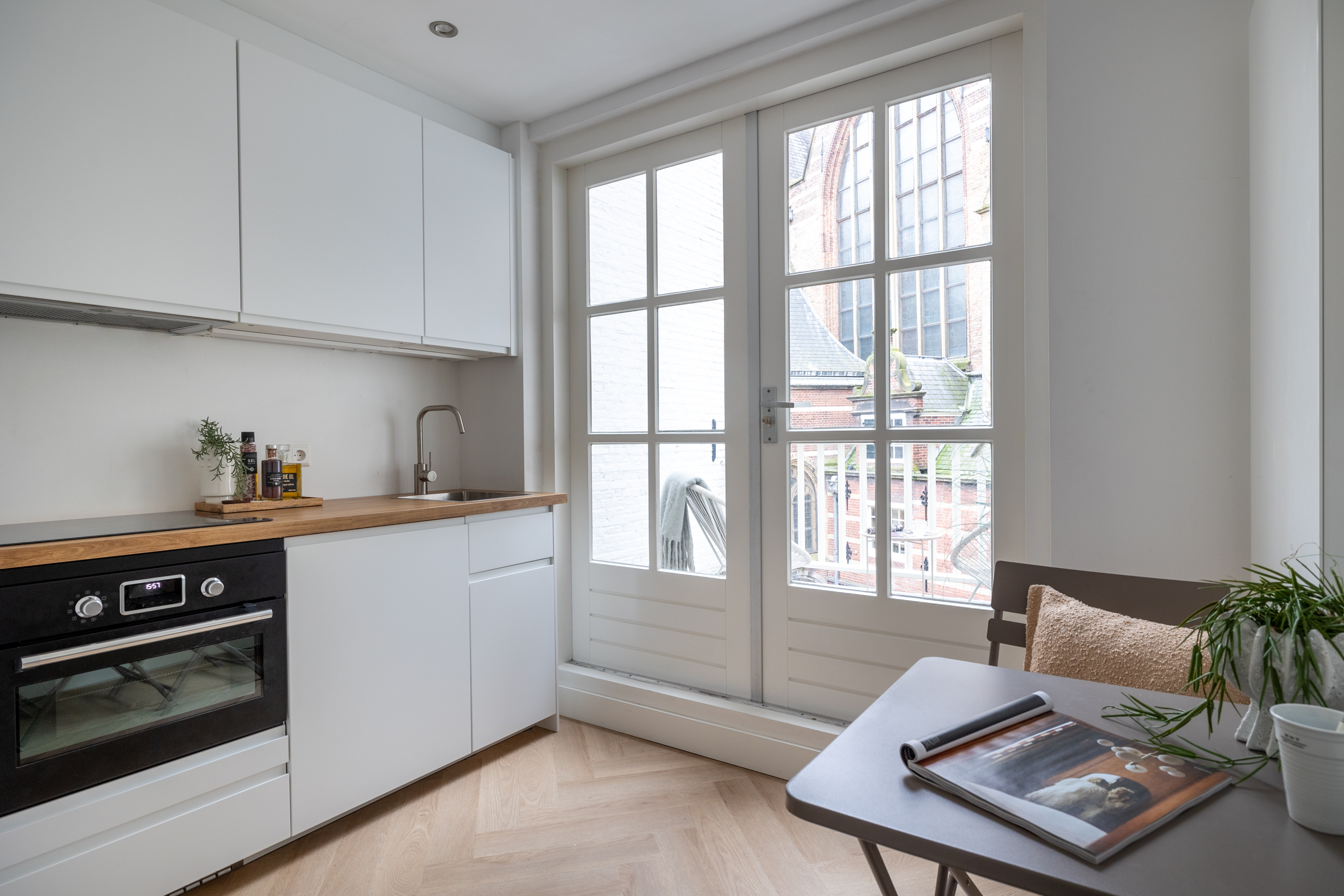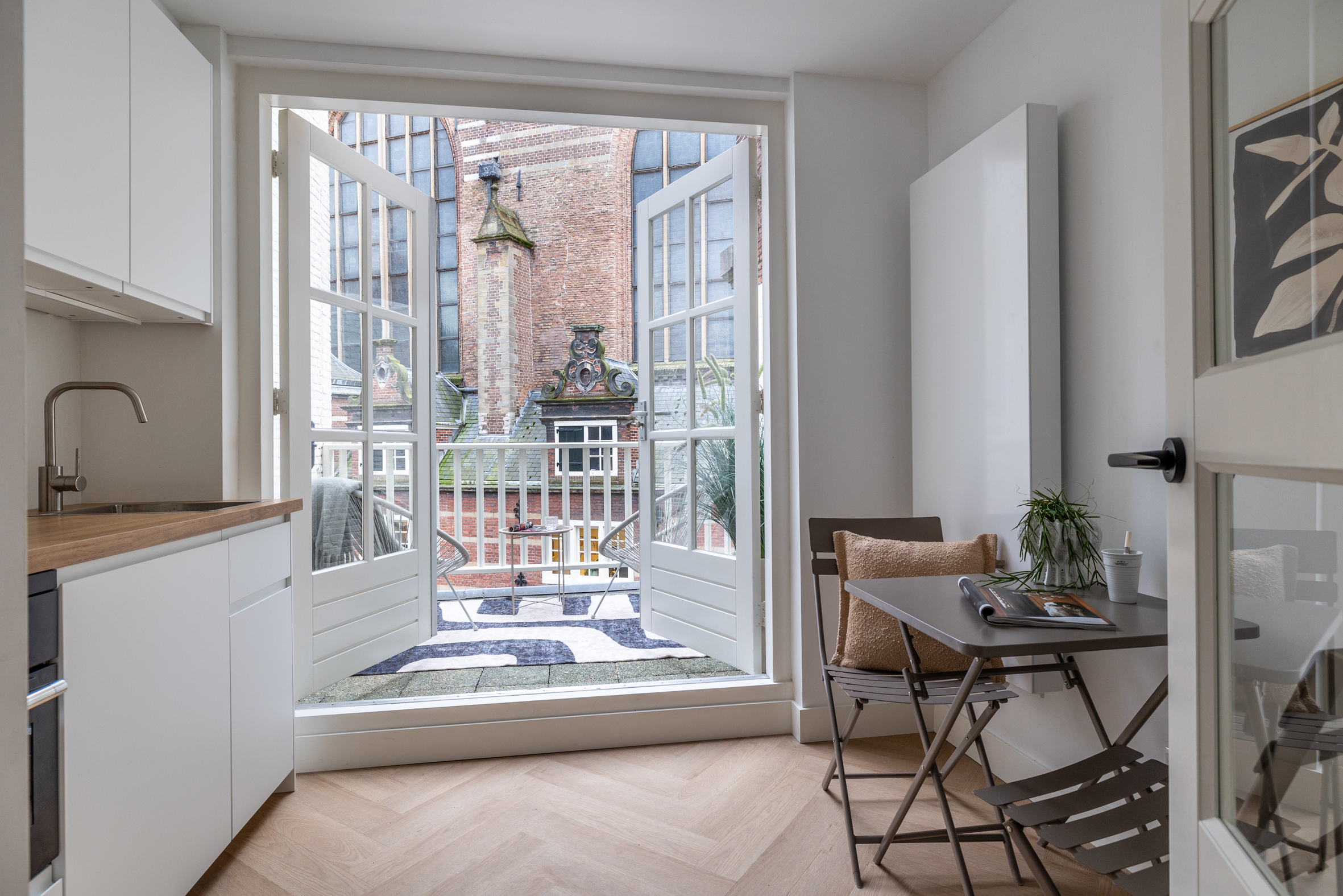 2e verdieping: privé-entree van de woning, gezellige keuken aan de achterzijde met openslaande deuren naar het balkon. Modern wit keukenblok voorzien van een oven, inductiekookplaat, afzuigkap, vaatwasser en een extra kastblok met koel-/vriescombinatie. Overloop met de badkamer. De badkamer is voorzien van een douche, wastafel met meubel, hangend toilet, sierradiator, grijze tegelvloer en witte wandtegels. Trapje naar de woonkamer waar je bij binnenkomst direct naar het prachtige uitzicht wordt getrokken! De woonkamer heeft een prachtig balkenplafond, licht eiken visgraat pvc vloer, dakramen en grote raampartijen met geweldig uitzicht op de Markt.