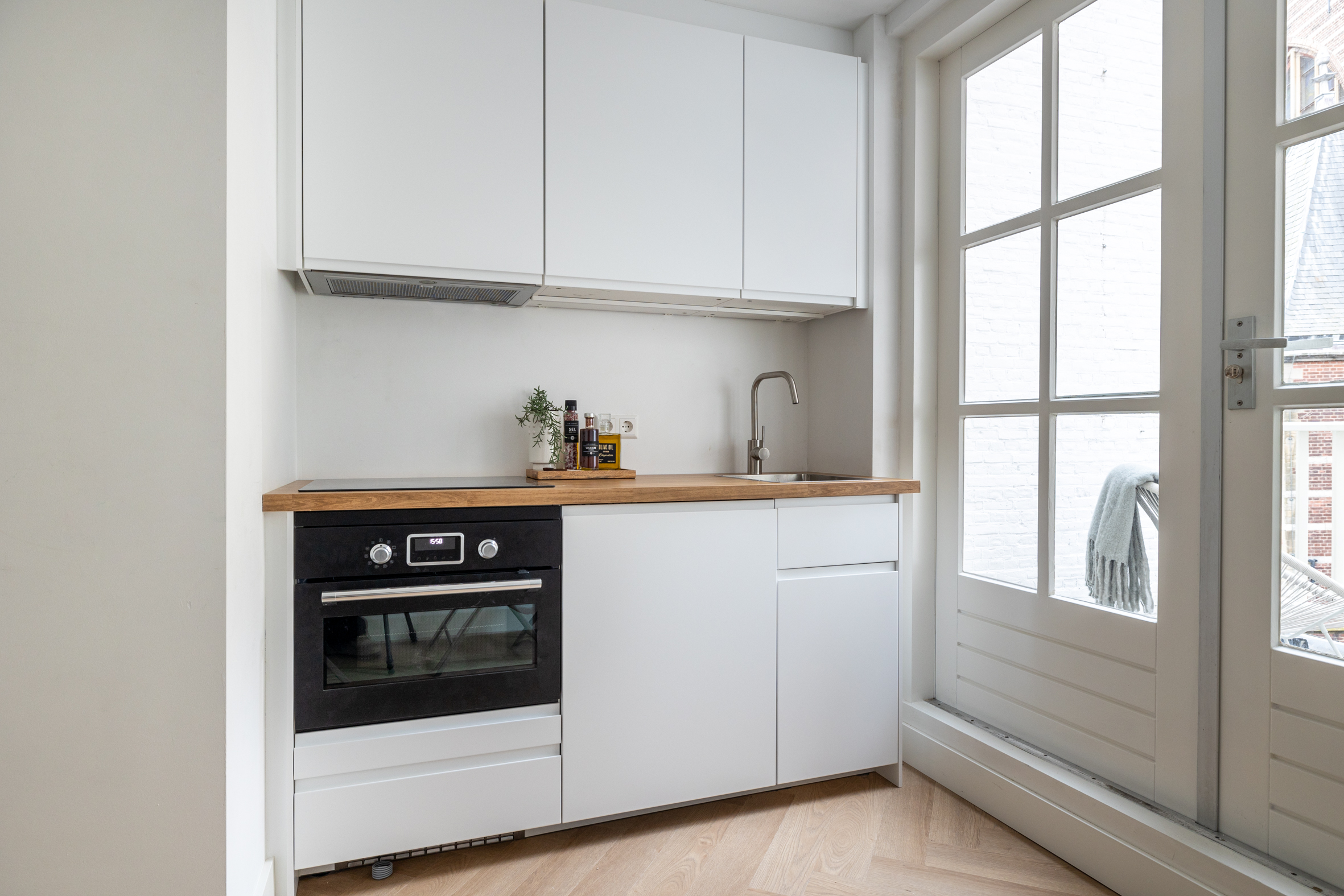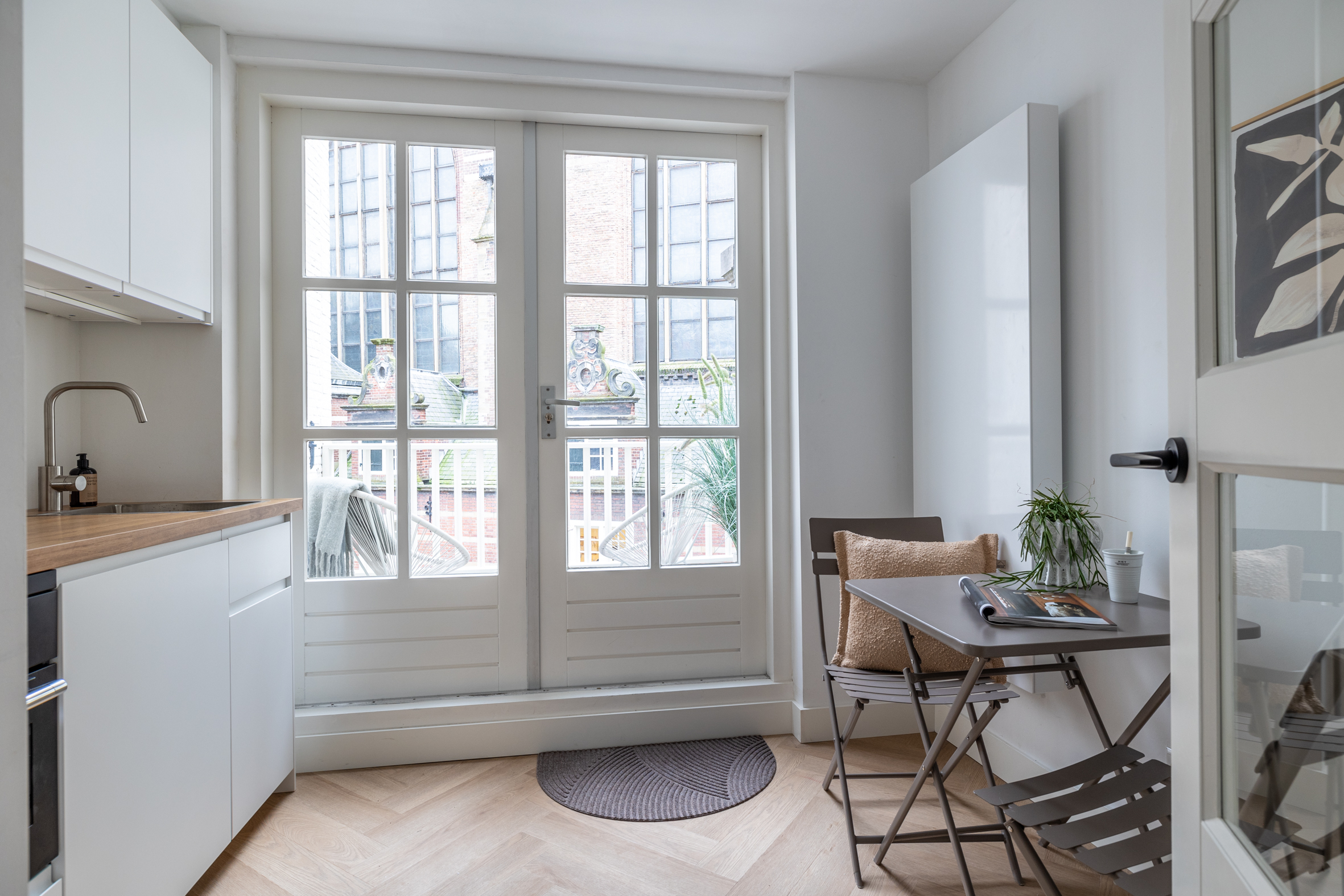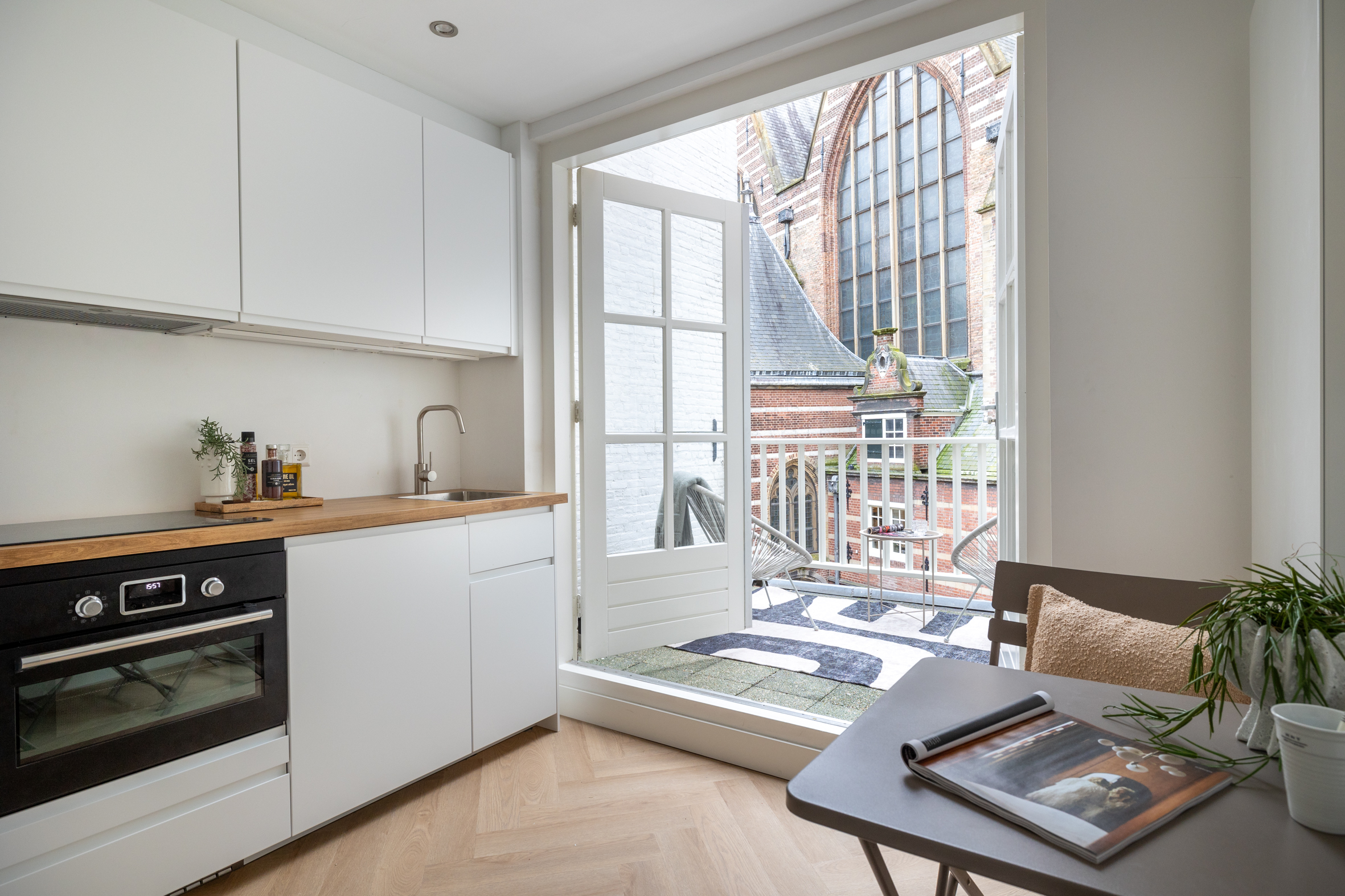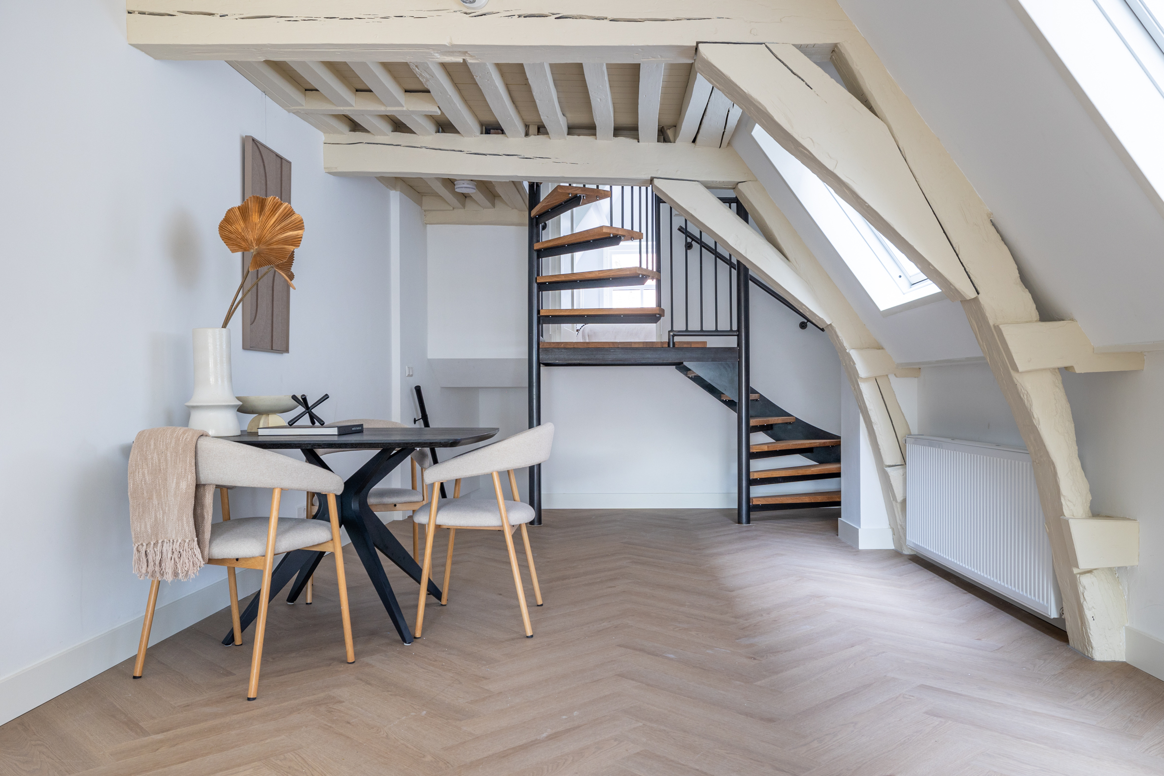 2e verdieping: privé-entree van de woning, gezellige keuken aan de achterzijde met openslaande deuren naar het balkon. Modern wit keukenblok voorzien van een oven, inductiekookplaat, afzuigkap, vaatwasser en een extra kastblok met koel-/vriescombinatie. Overloop met de badkamer. De badkamer is voorzien van een douche, wastafel met meubel, hangend toilet, sierradiator, grijze tegelvloer en witte wandtegels. Trapje naar de woonkamer waar je bij binnenkomst direct naar het prachtige uitzicht wordt getrokken! De woonkamer heeft een prachtig balkenplafond, licht eiken visgraat pvc vloer, dakramen en grote raampartijen met geweldig uitzicht op de Markt.