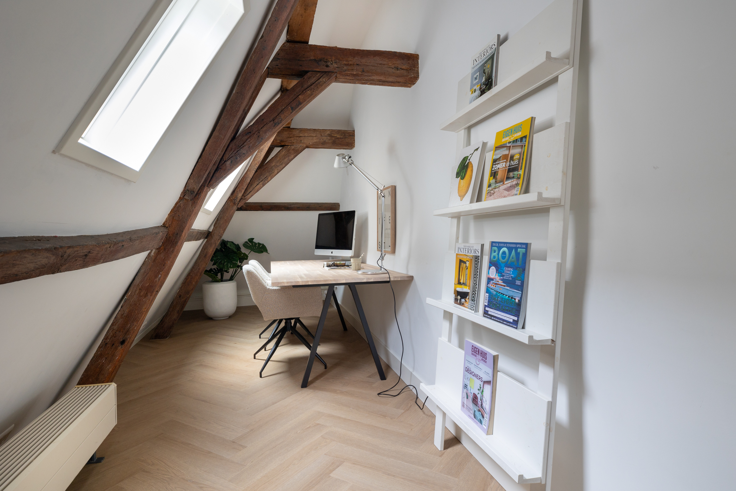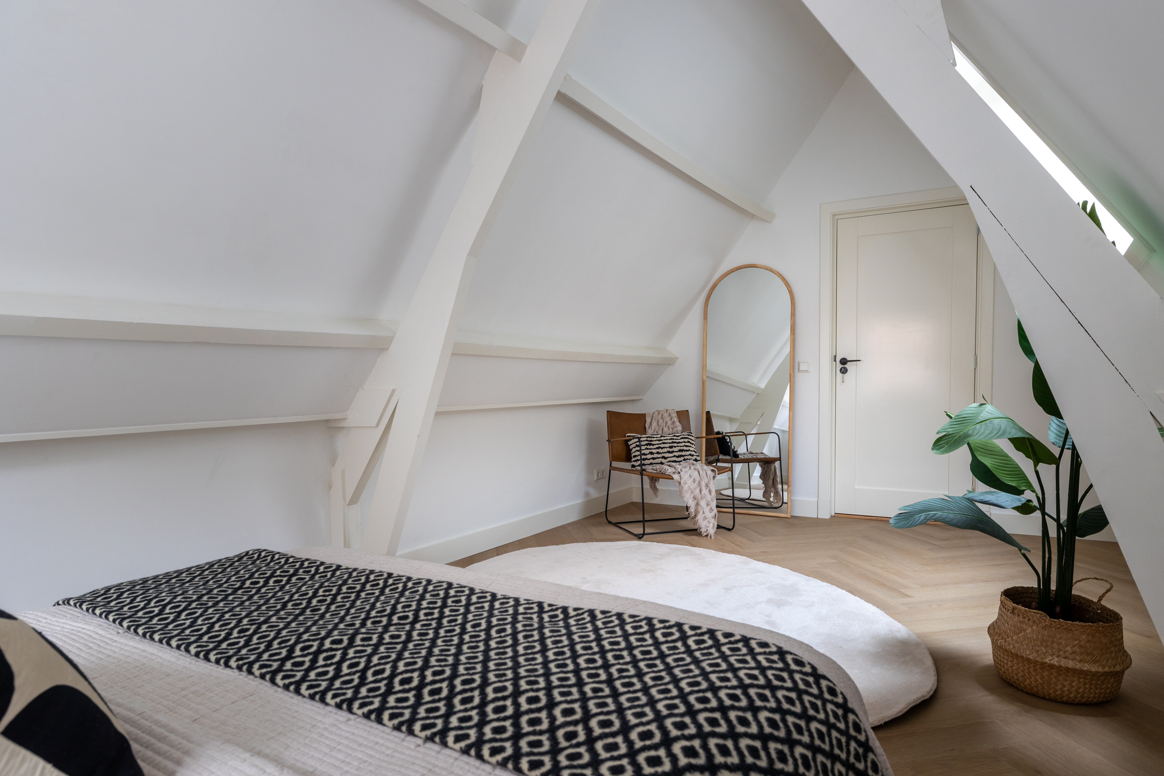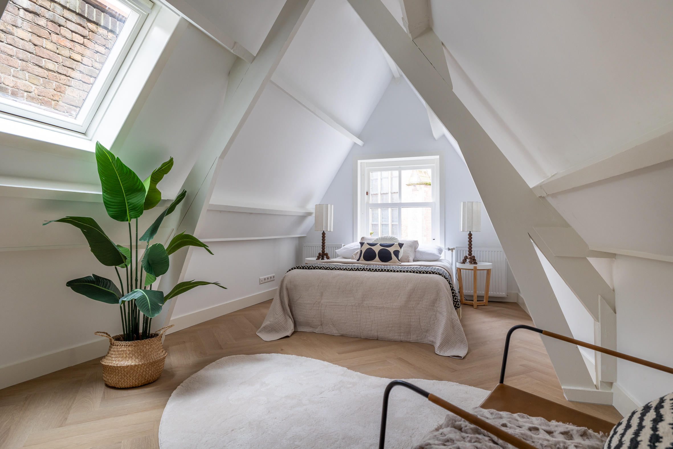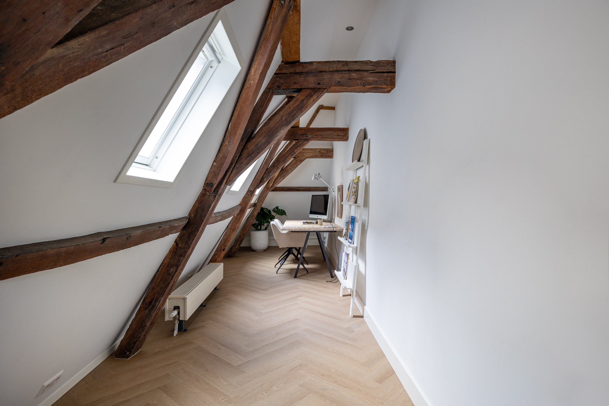 Tussenverdieping: mooie, grote slaapkamer met zicht op de nok, dakraam en licht eiken visgraat pvc vloer.
