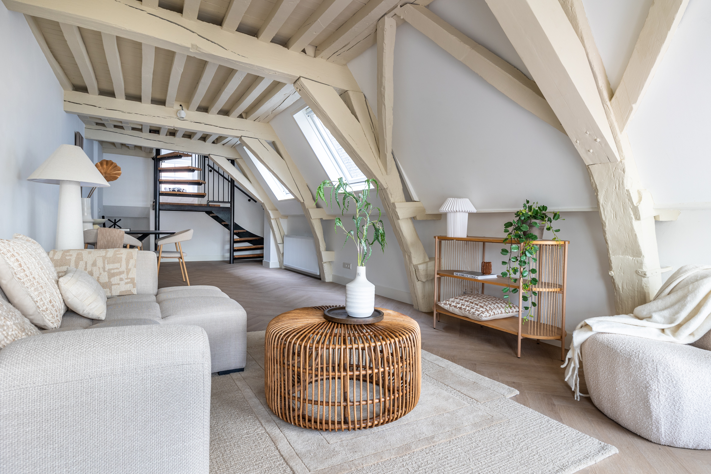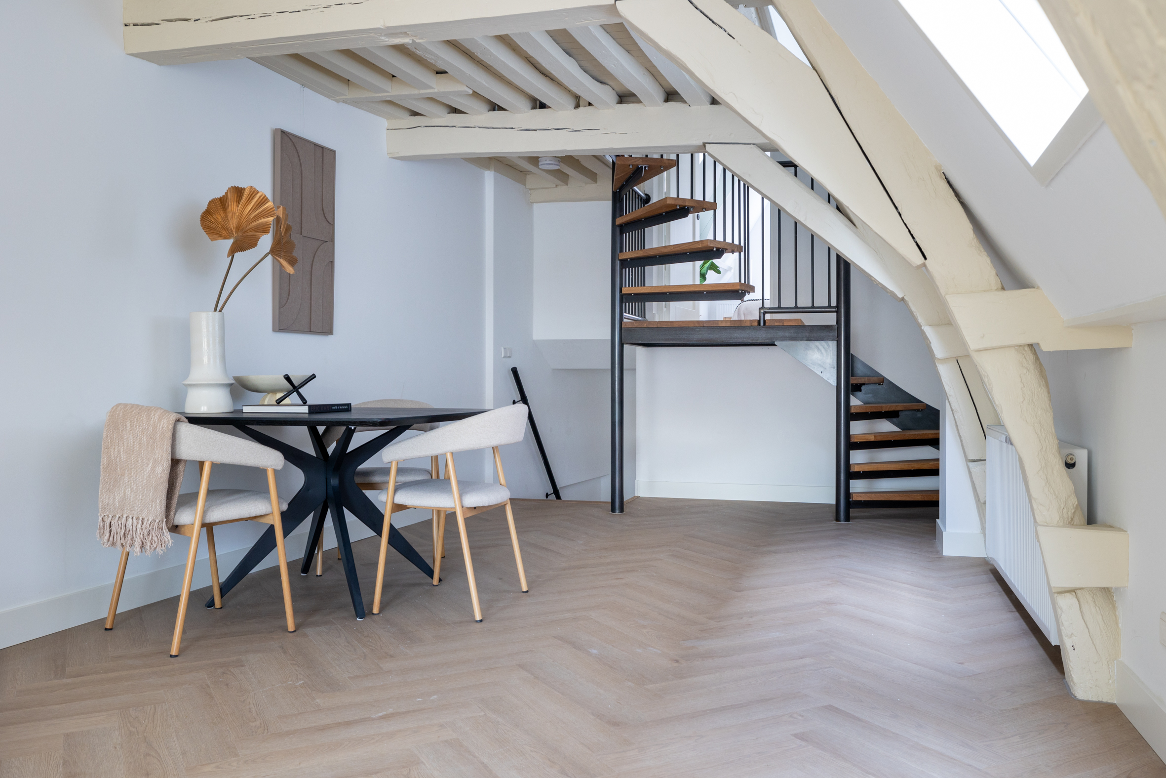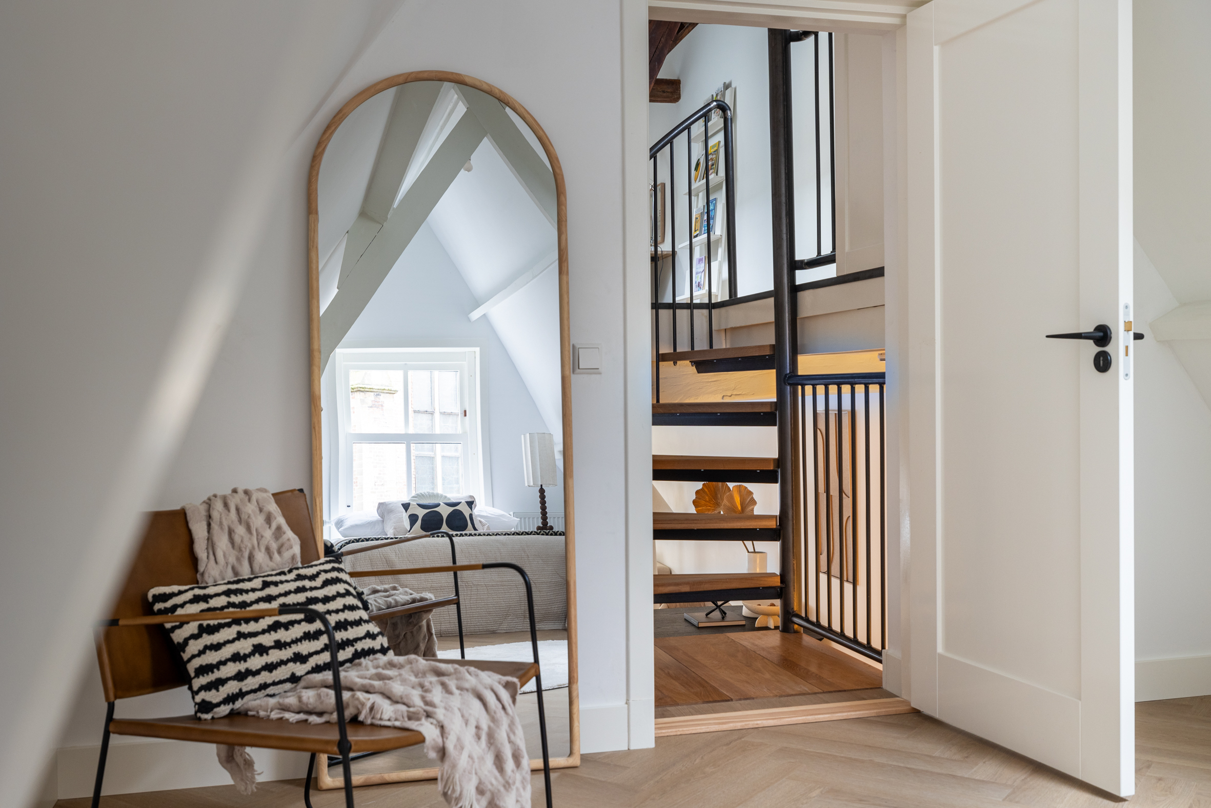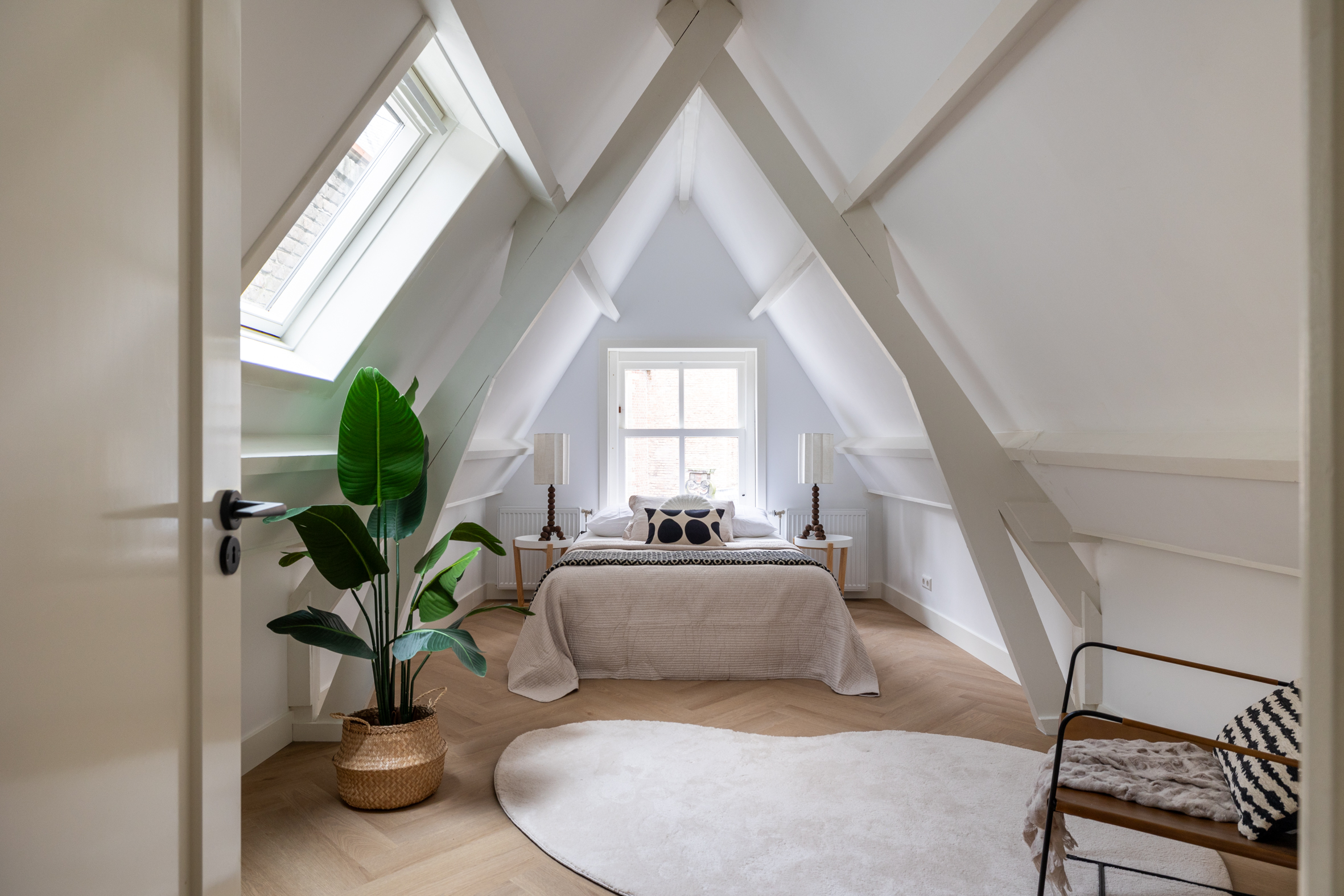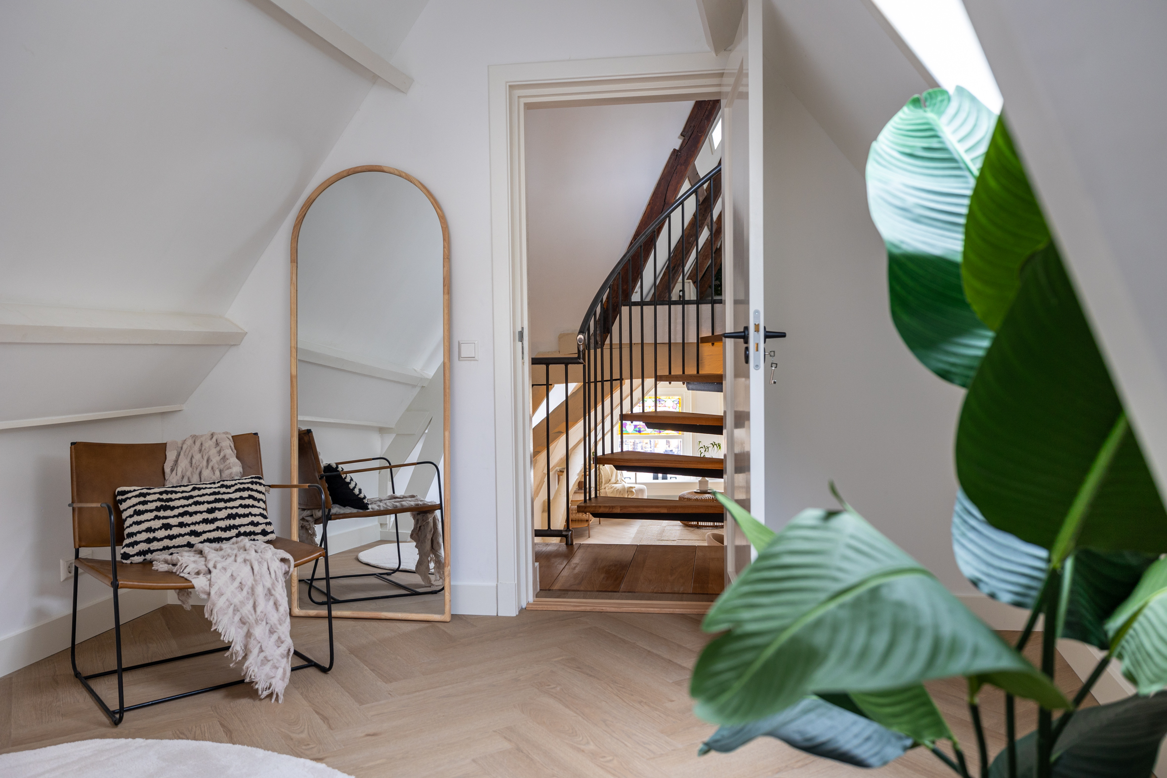Tussenverdieping: mooie, grote slaapkamer met zicht op de nok, dakraam en licht eiken visgraat pvc vloer.