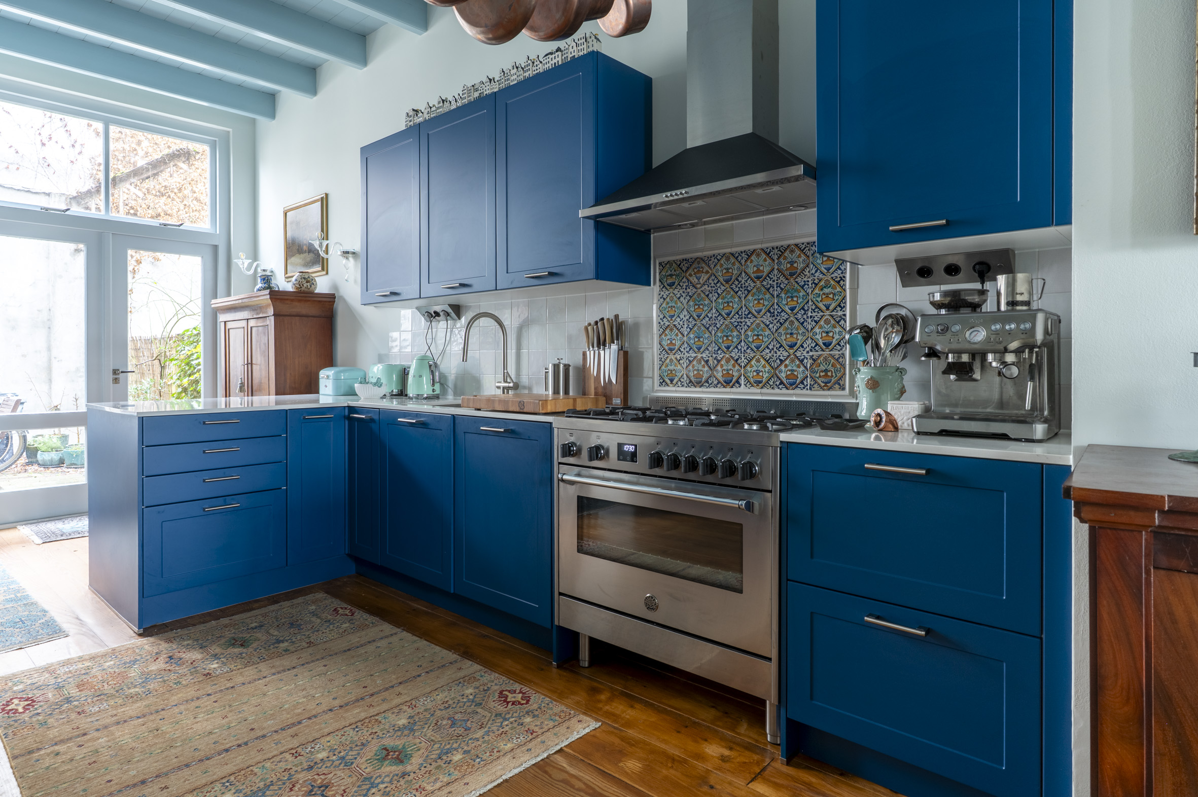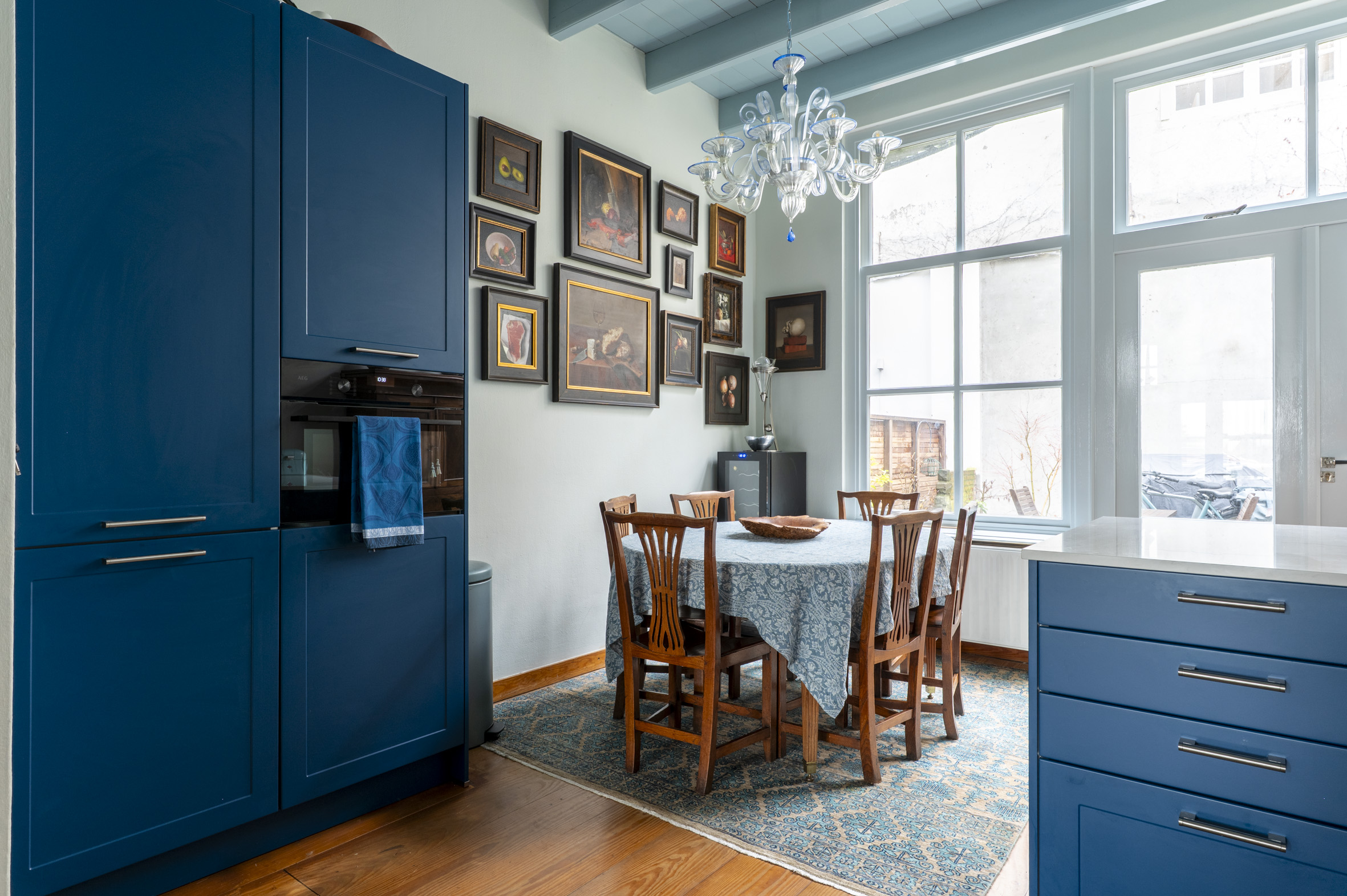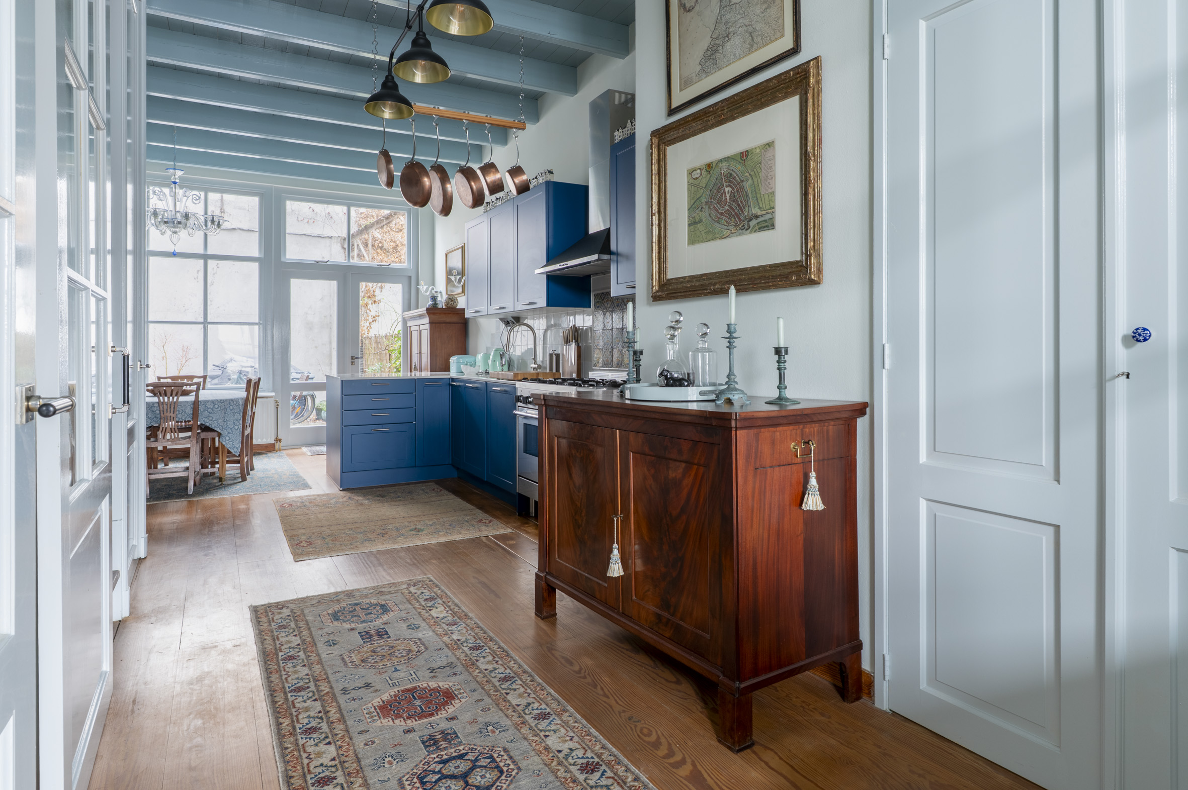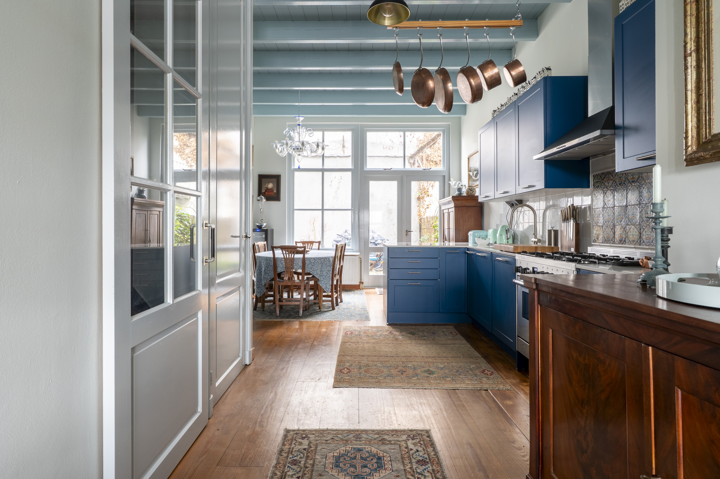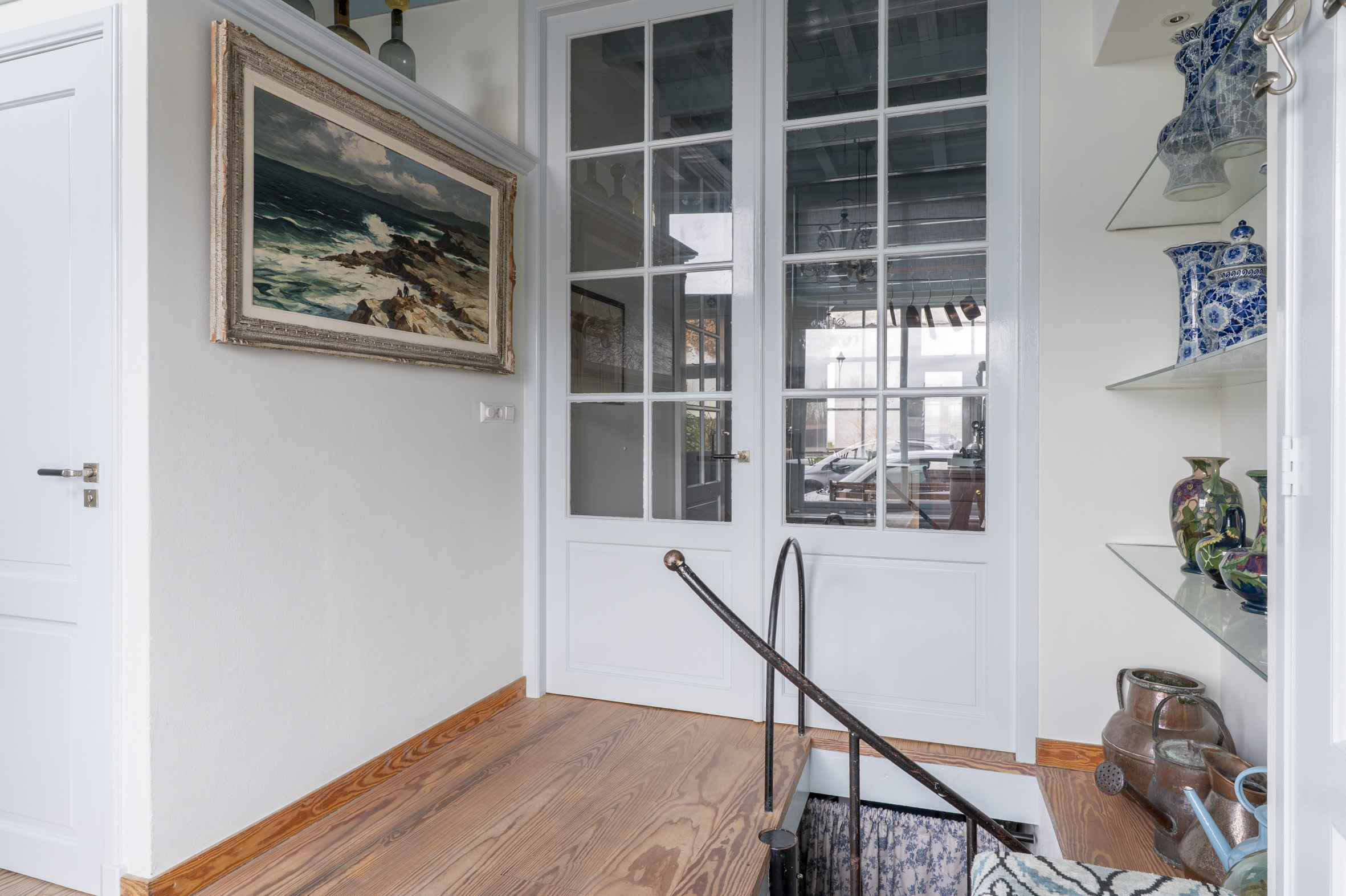 Begane grond: bereikbaar via eigen natuurstenen "bordes" met 3 treden. Entree, ruime hal met meterkast, luxe toilet met fontein. Trap naar het souterrain. Wand met glas en roedeverdeling en deur naar de heel gezellige woonkeuken. Deze is vernieuwd in 2025 en voorzien van een L-vormig keramisch "marmeren" blad met spoelbak, Bertisoni fornuis met 6 gaspitten, circulatiekap, vaatwasser, carrouselkast en bar. Op de achterwand "witjes" en een antiek tegeltableau. Wand met koelkast, vriezer en oven. Openslaande deuren naar de tuin.