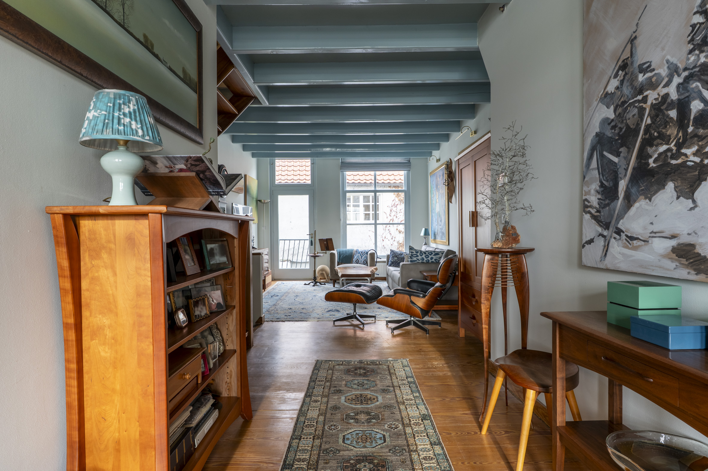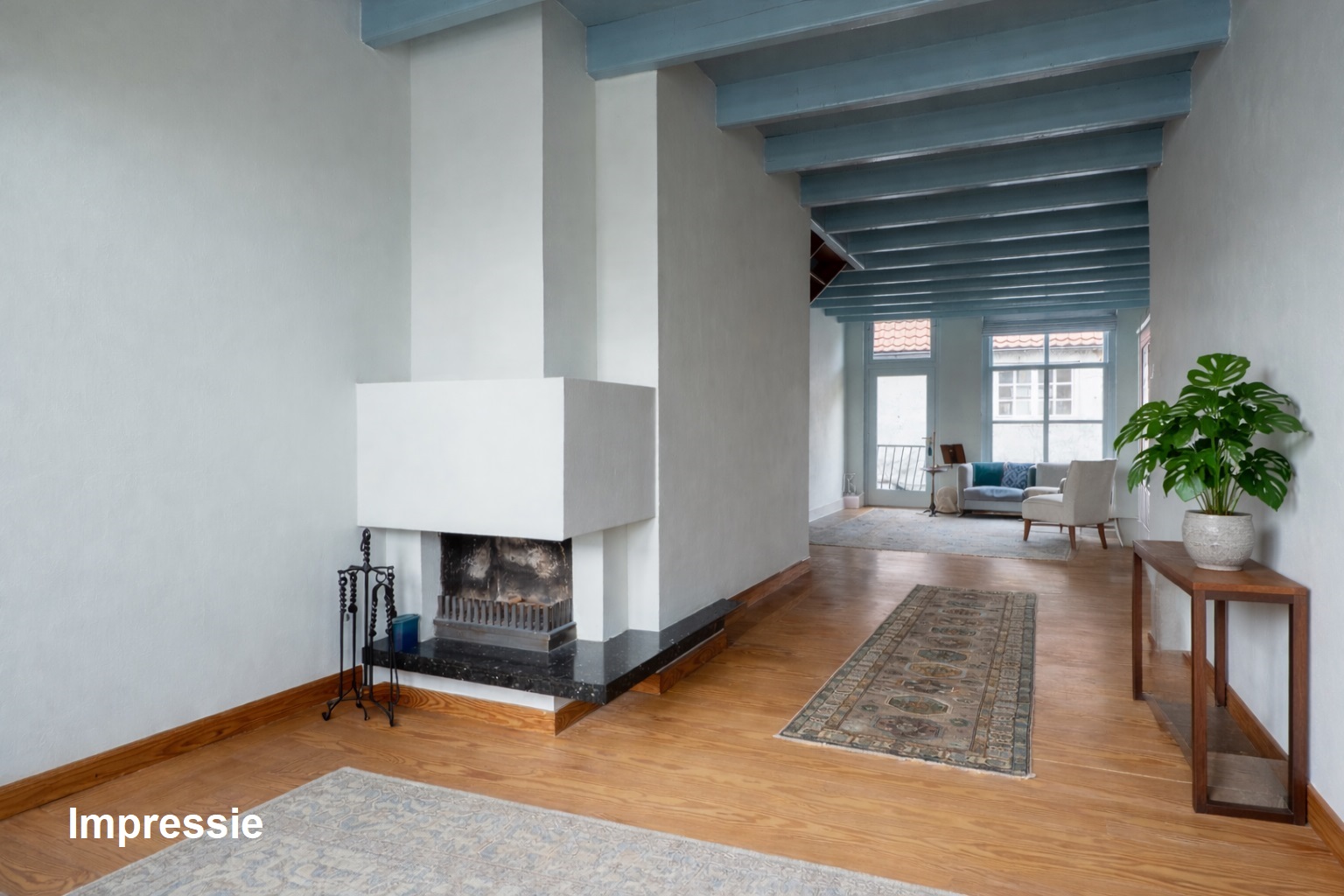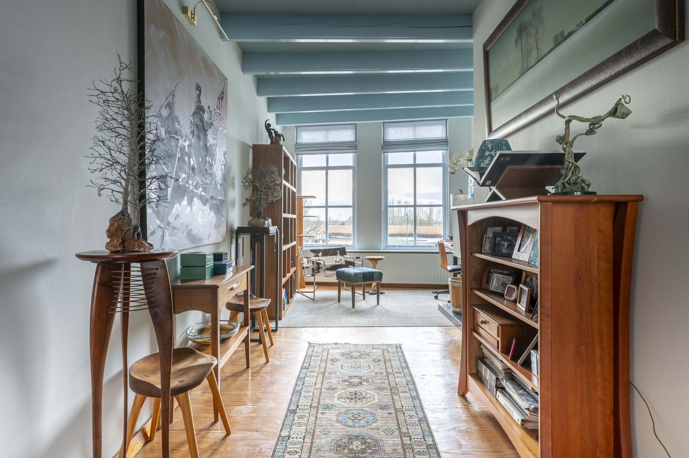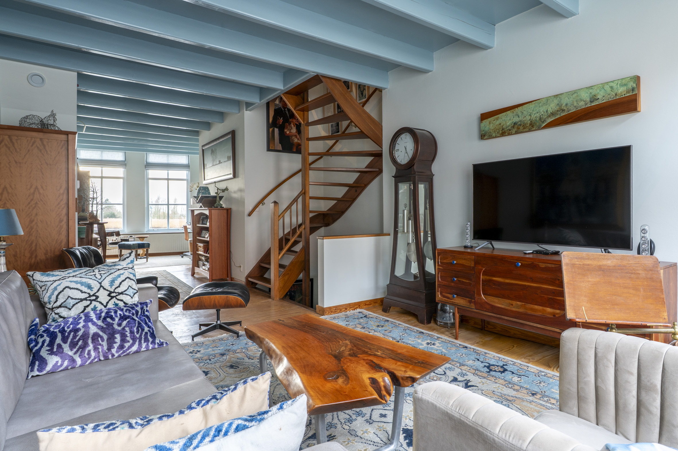 *de grote hoogten in het huis, de fraaie balken en mooie grenen vloeren bepalen de karakteristieke sfeer. De wanden zijn mooi strak afgewerkt en al het schilderwerk aan de binnenzijde is uitgevoerd in 2025. Hierbij zijn warme kleuren gebruikt.