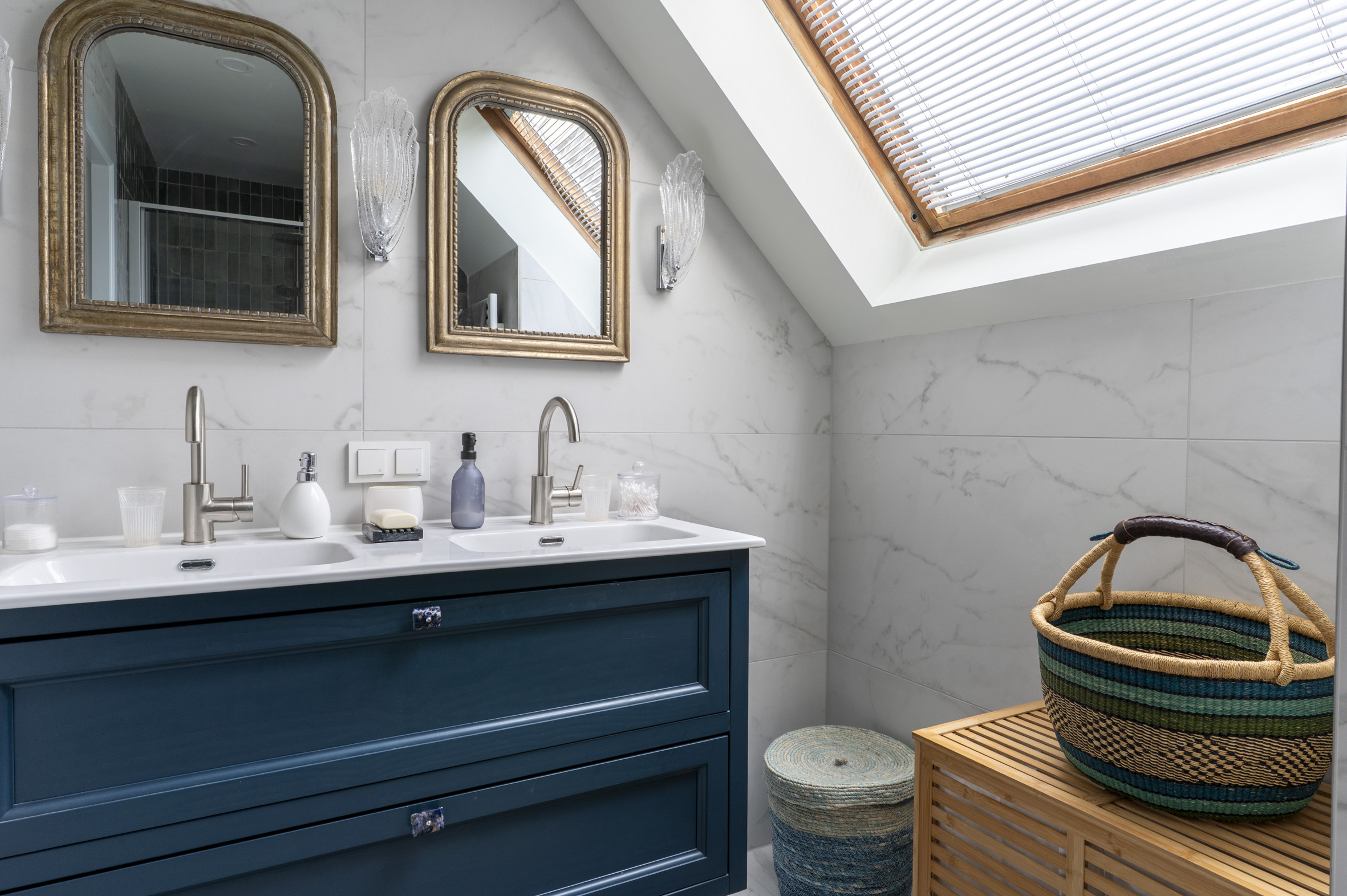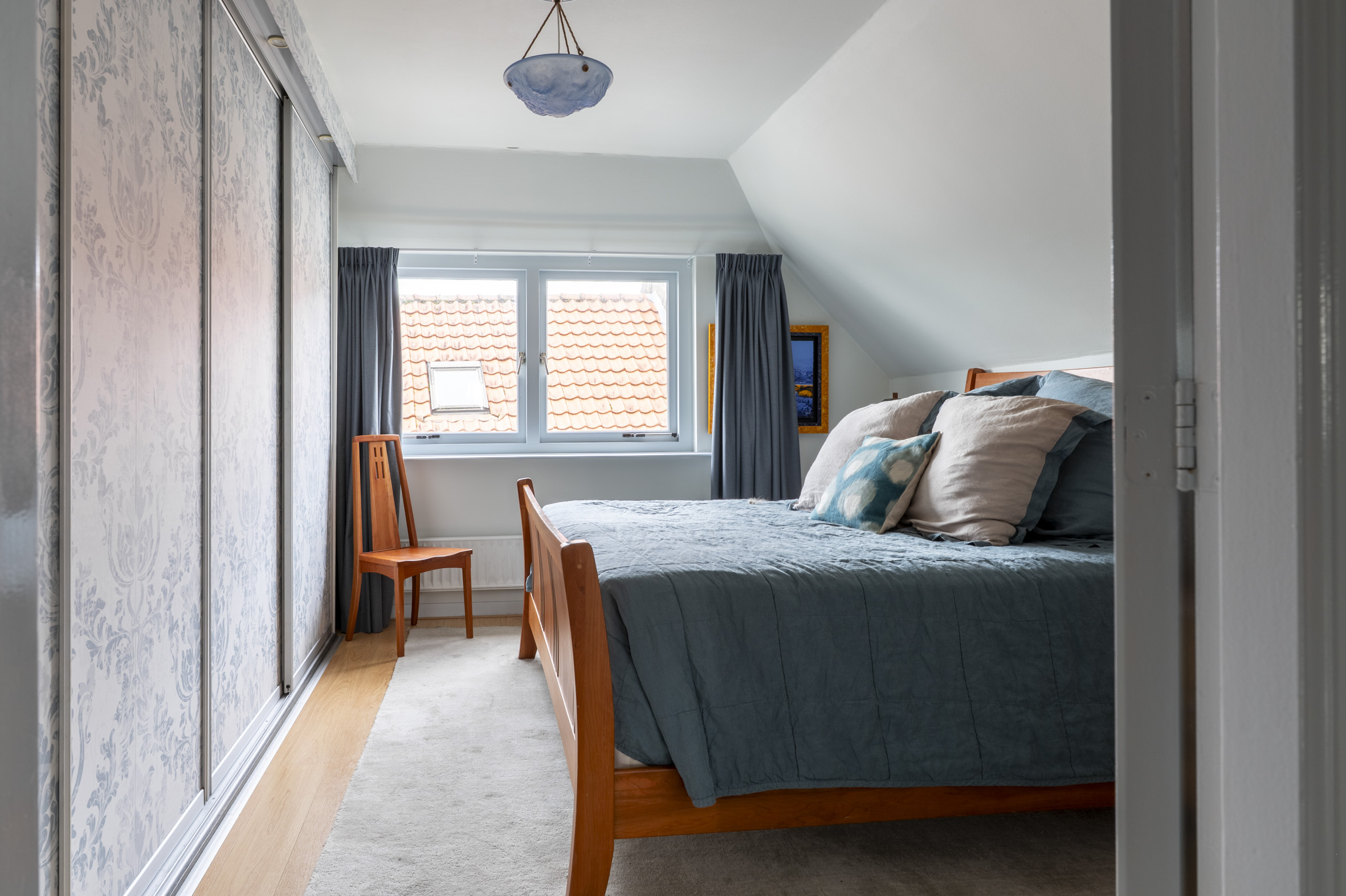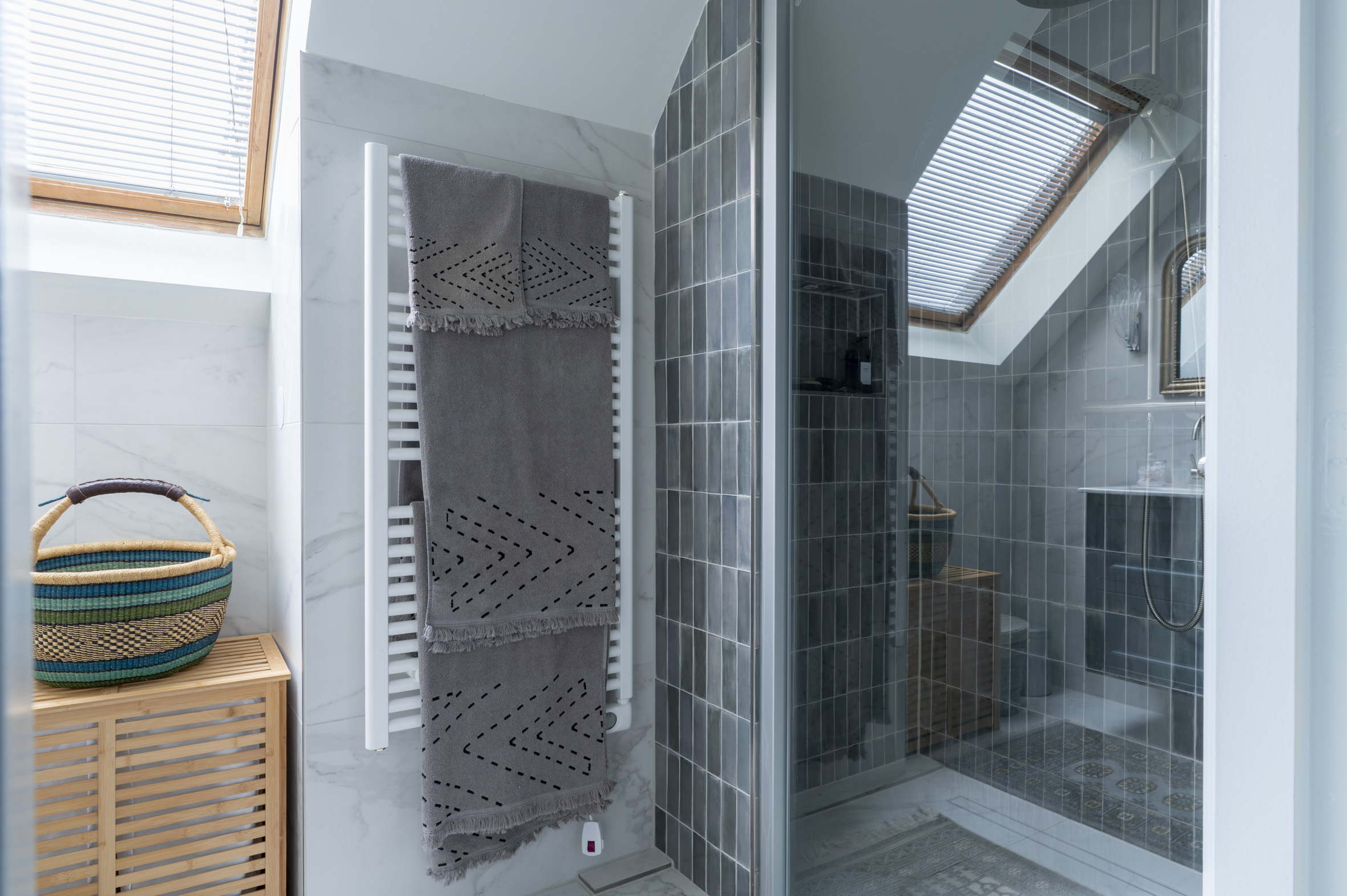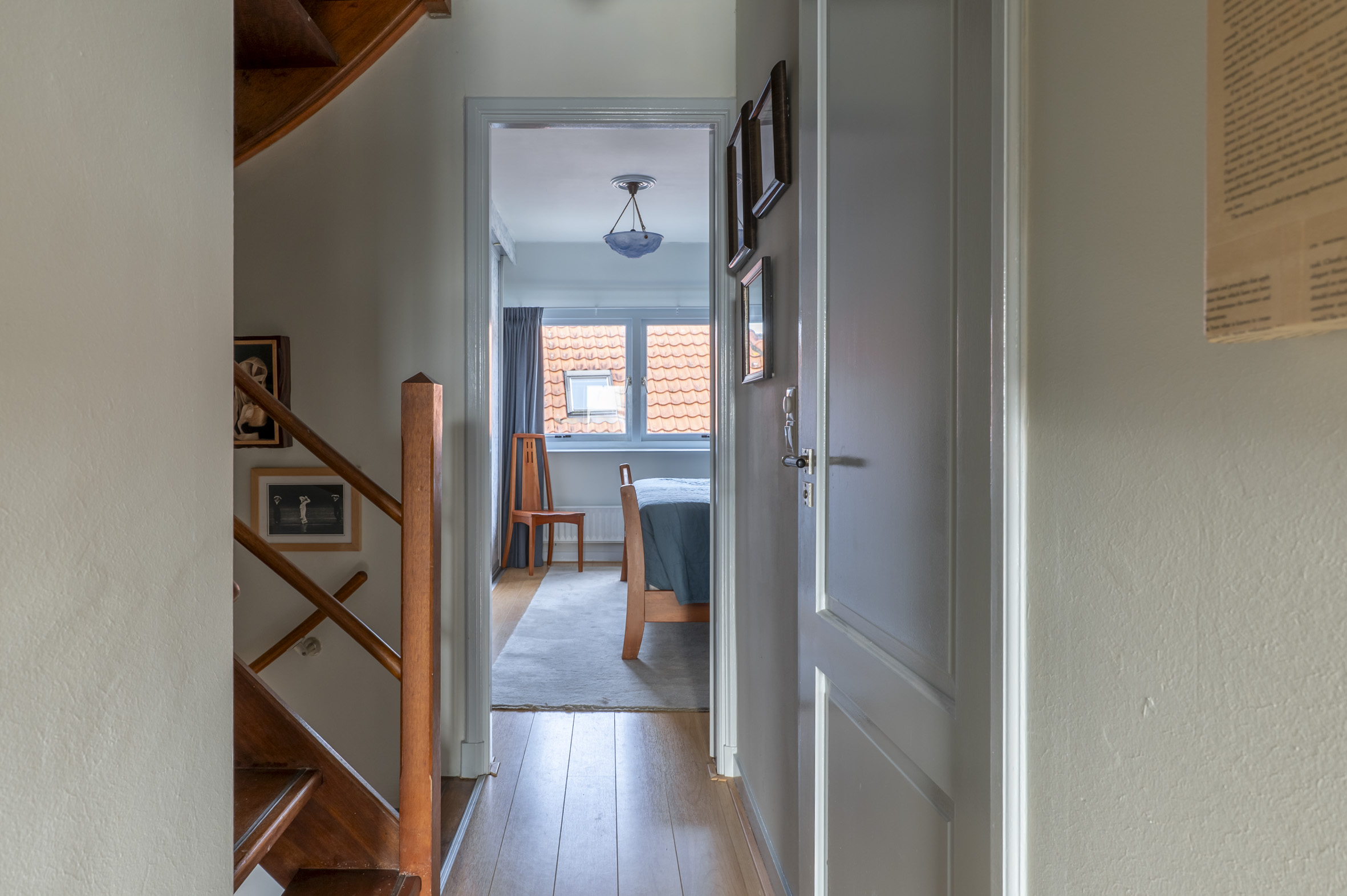 2e verdieping: overloop met luxe toilet + fontein. Slaapkamer aan de voorzijde, luxe badkamer met fraai tegelwerk, grote douche met glazen wand, dubbele wastafel met meubel, designradiator en Velux dakraam. Grote slaapkamer aan de achterzijde met vaste schuifkastenwand.