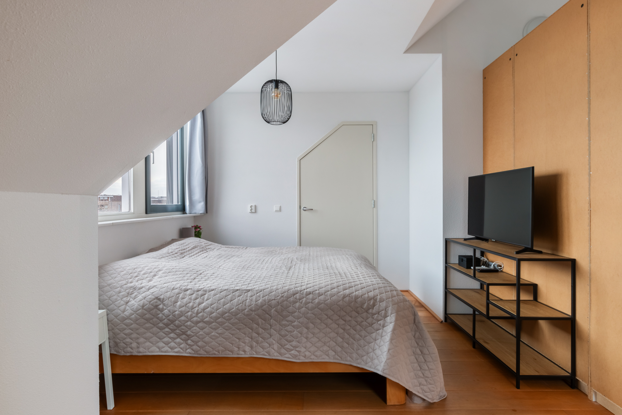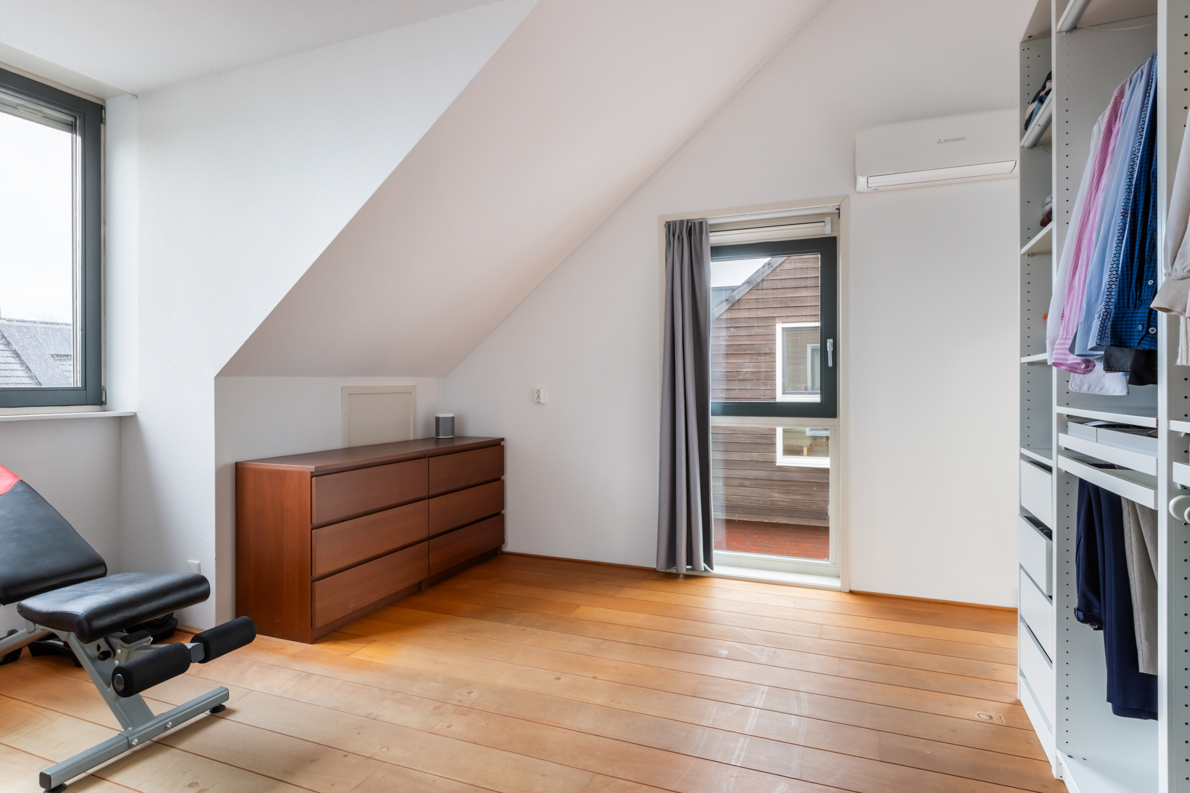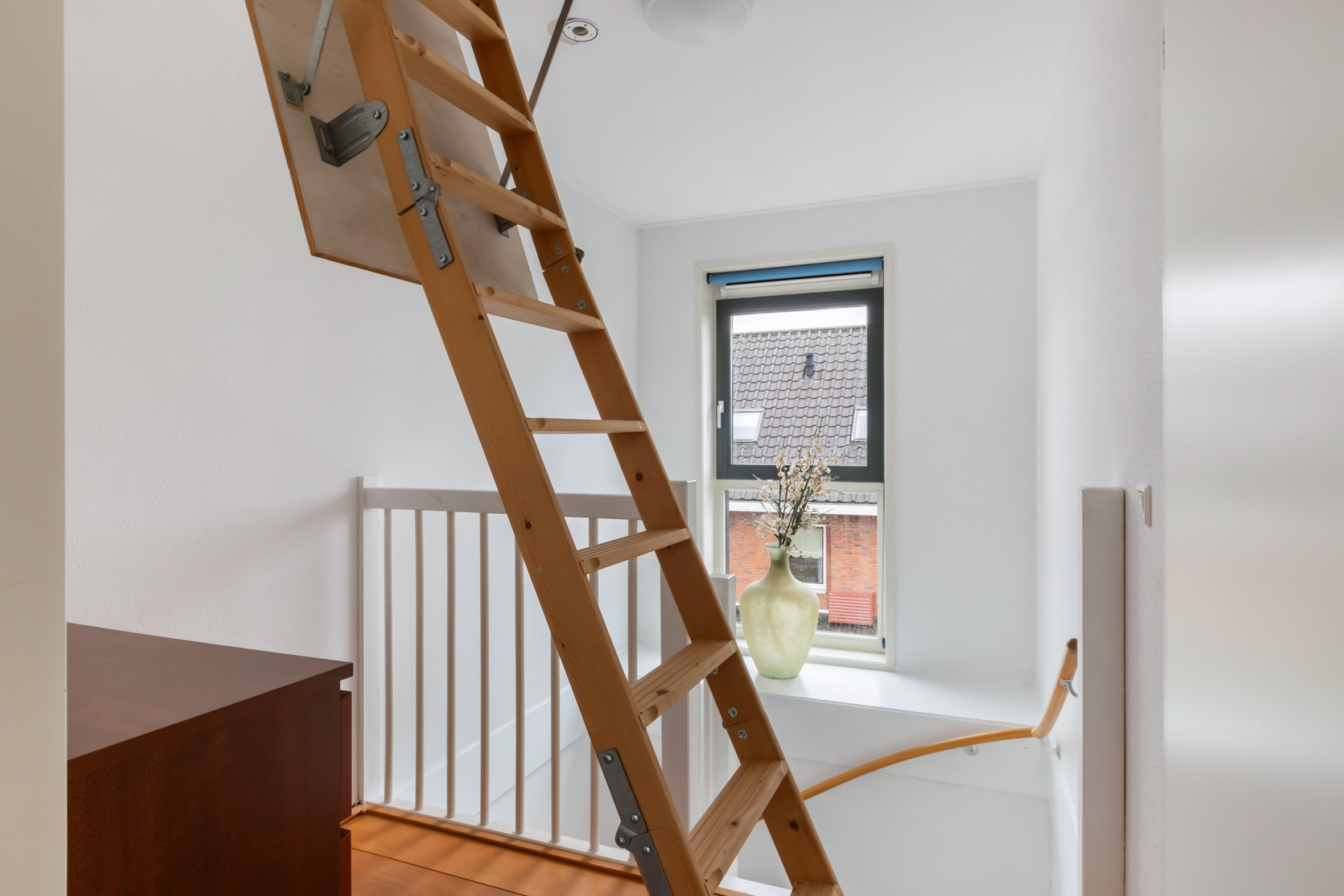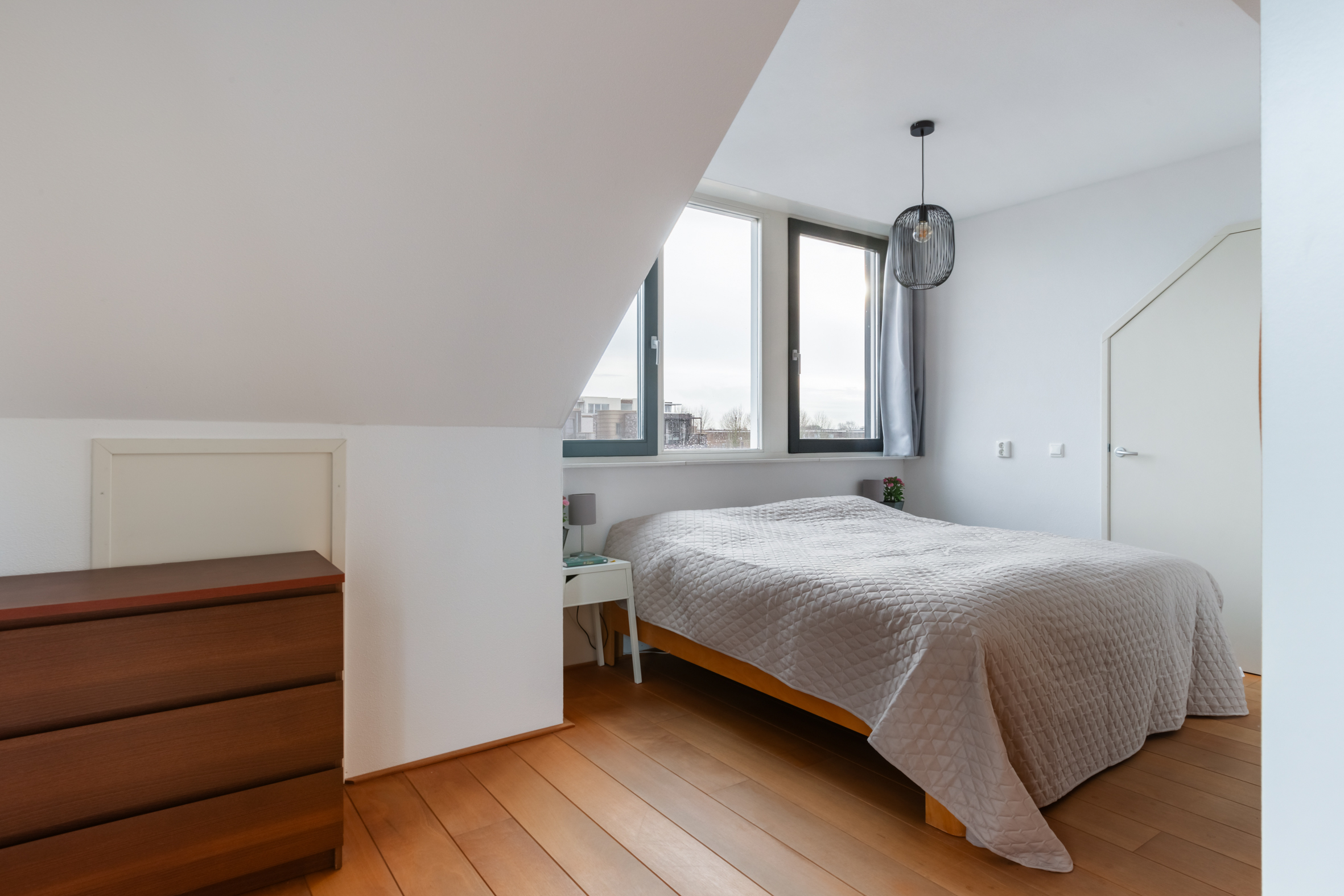 2e verdieping: overloop met zijraam en een luik met vlizotrap naar de vliering. Heel fijne, grote slaapkamer met hoge nok, dakkapellen aan voor- en achterzijde en de mogelijkheid tot het realiseren van twee kamers. Tweede badkamer met een douchecabine, wastafel met meubel, toilet en dakkapel. Aparte cv-/bergruimte met de unit van de mechanische ventilatie en omvormer voor de zonnepanelen.