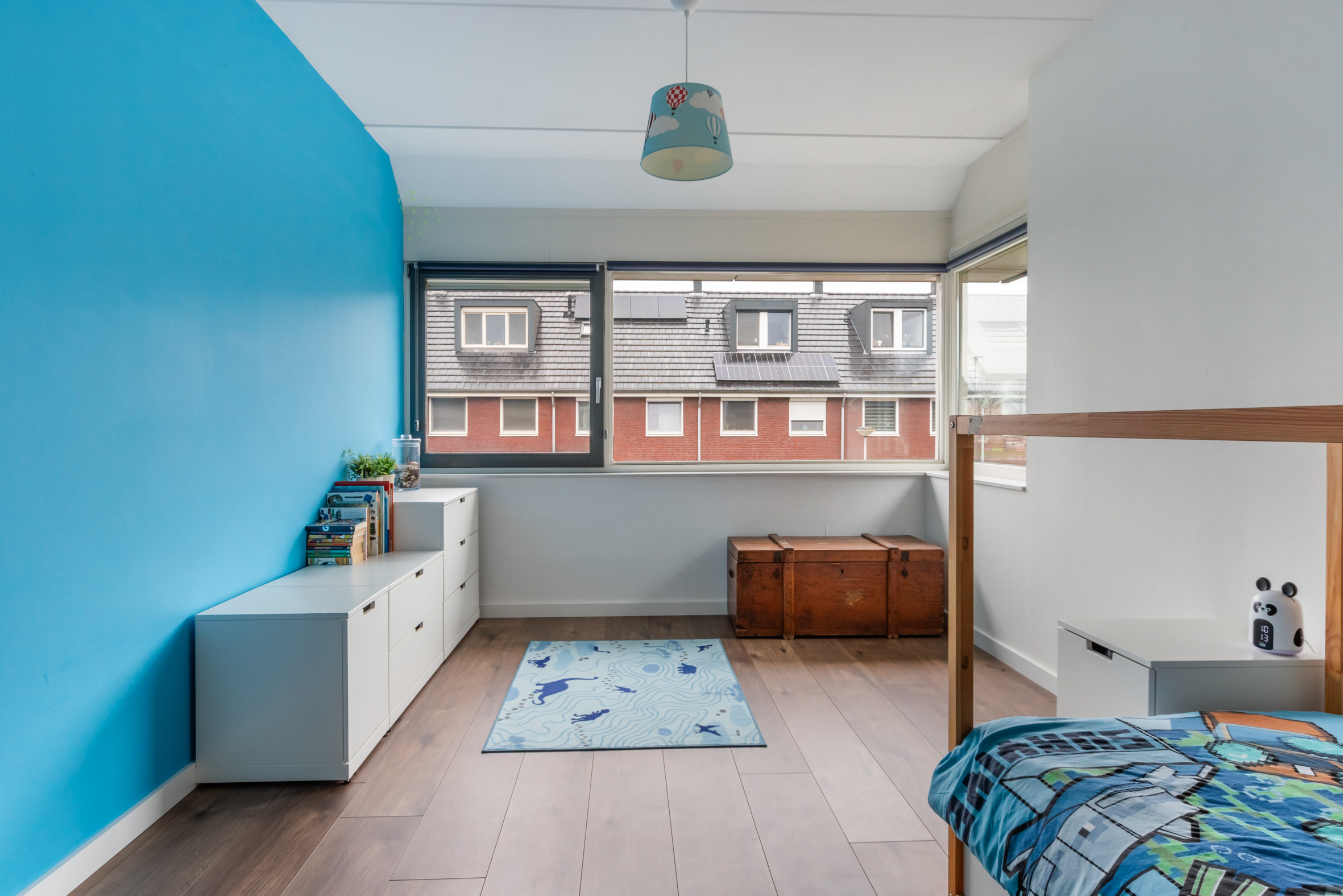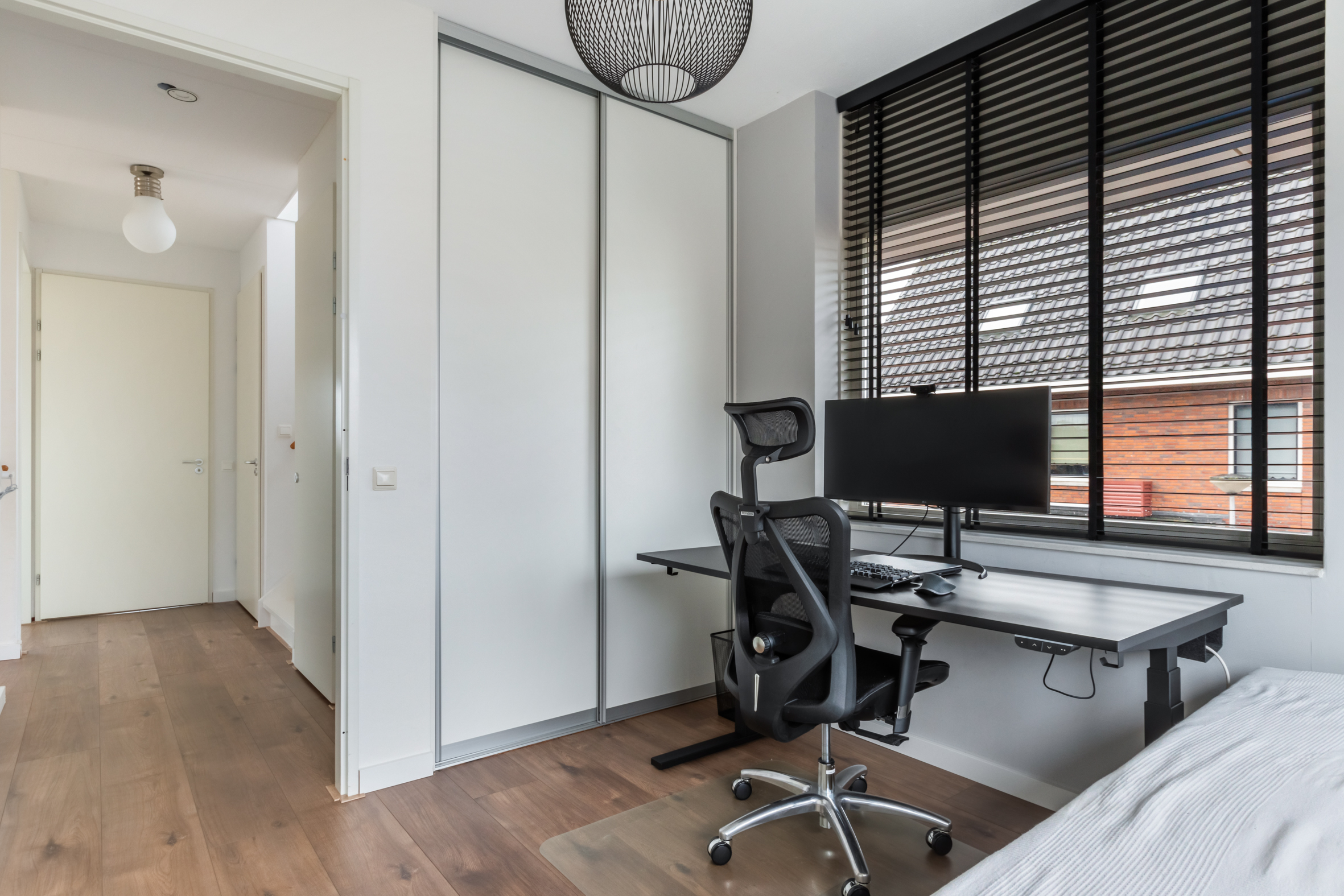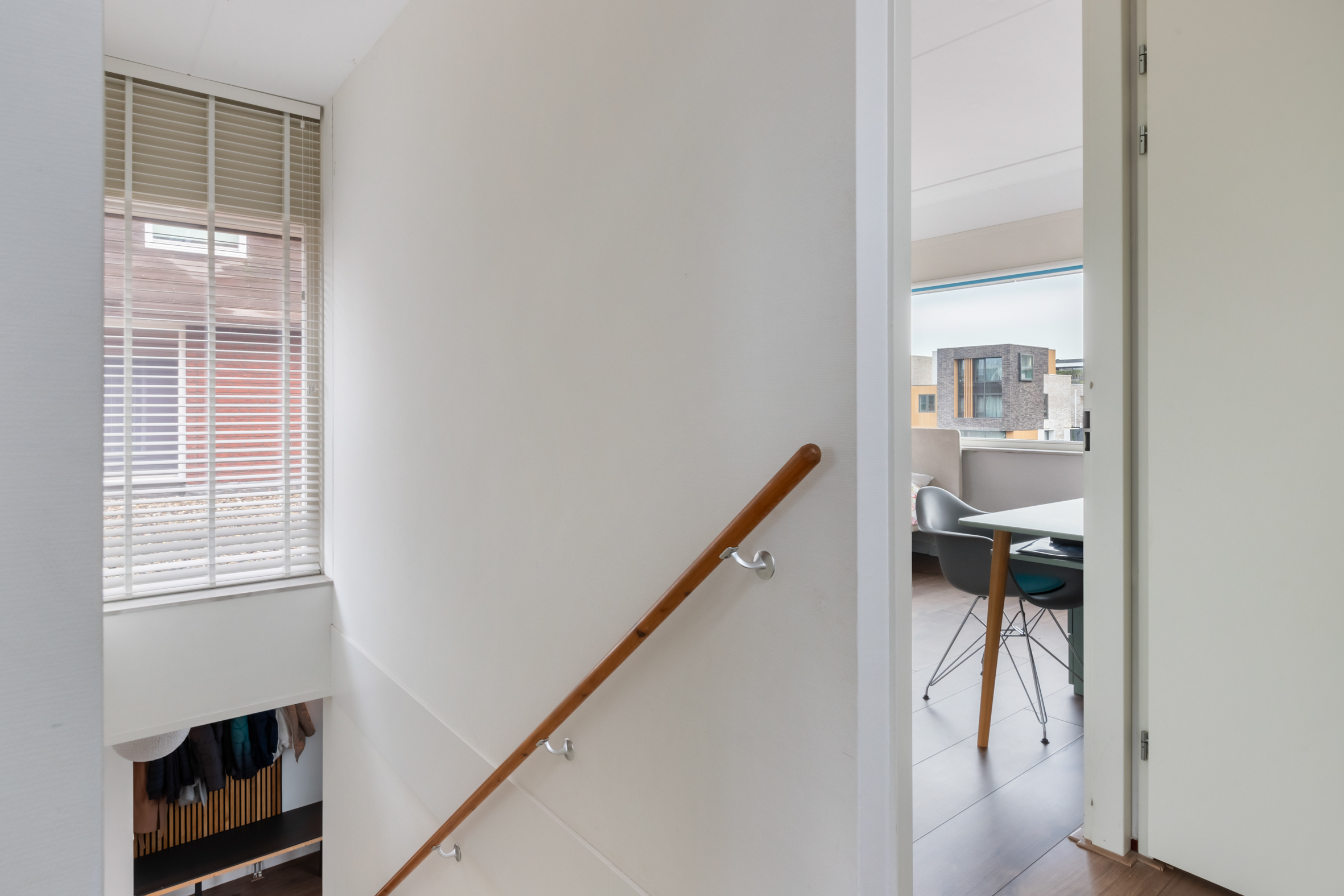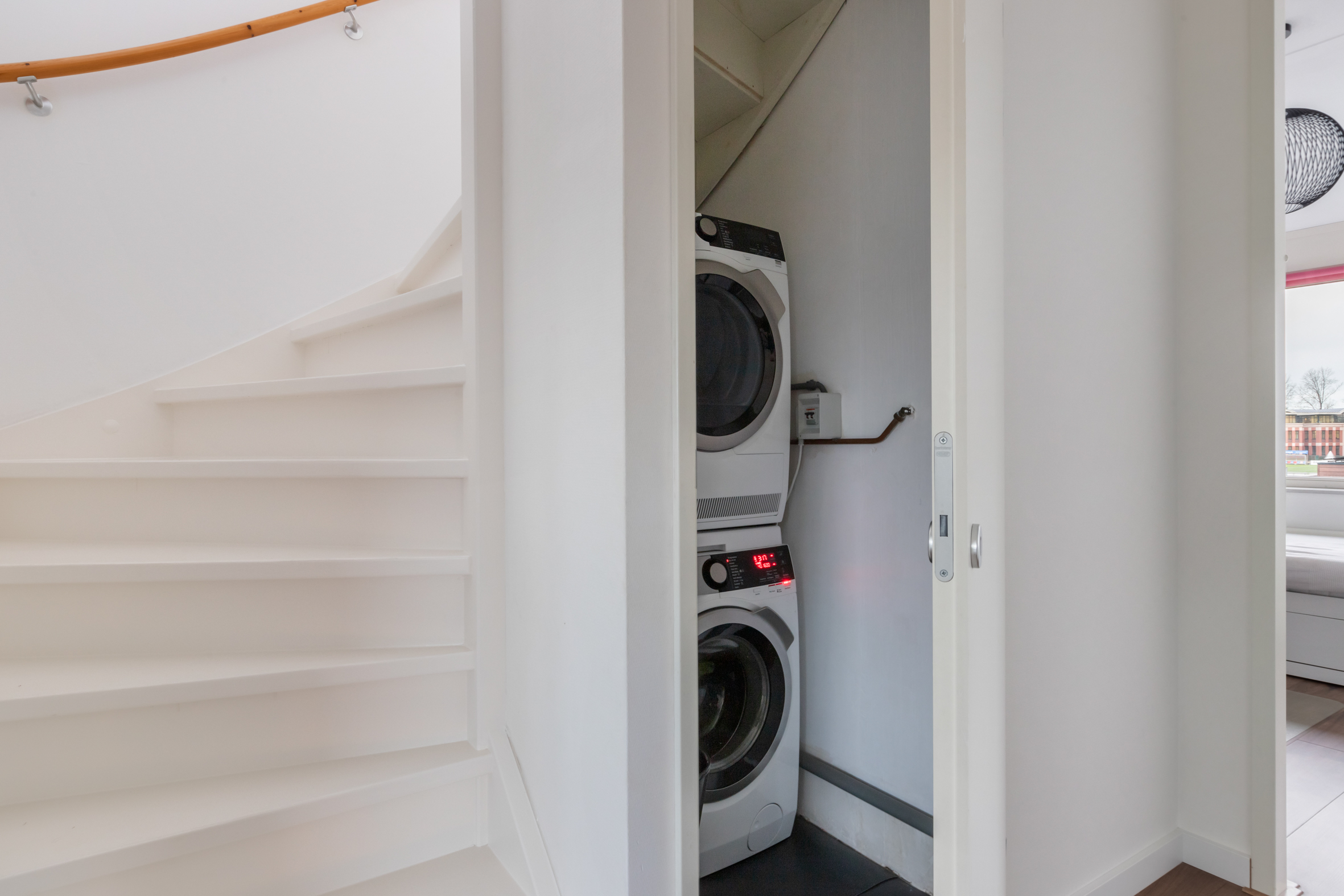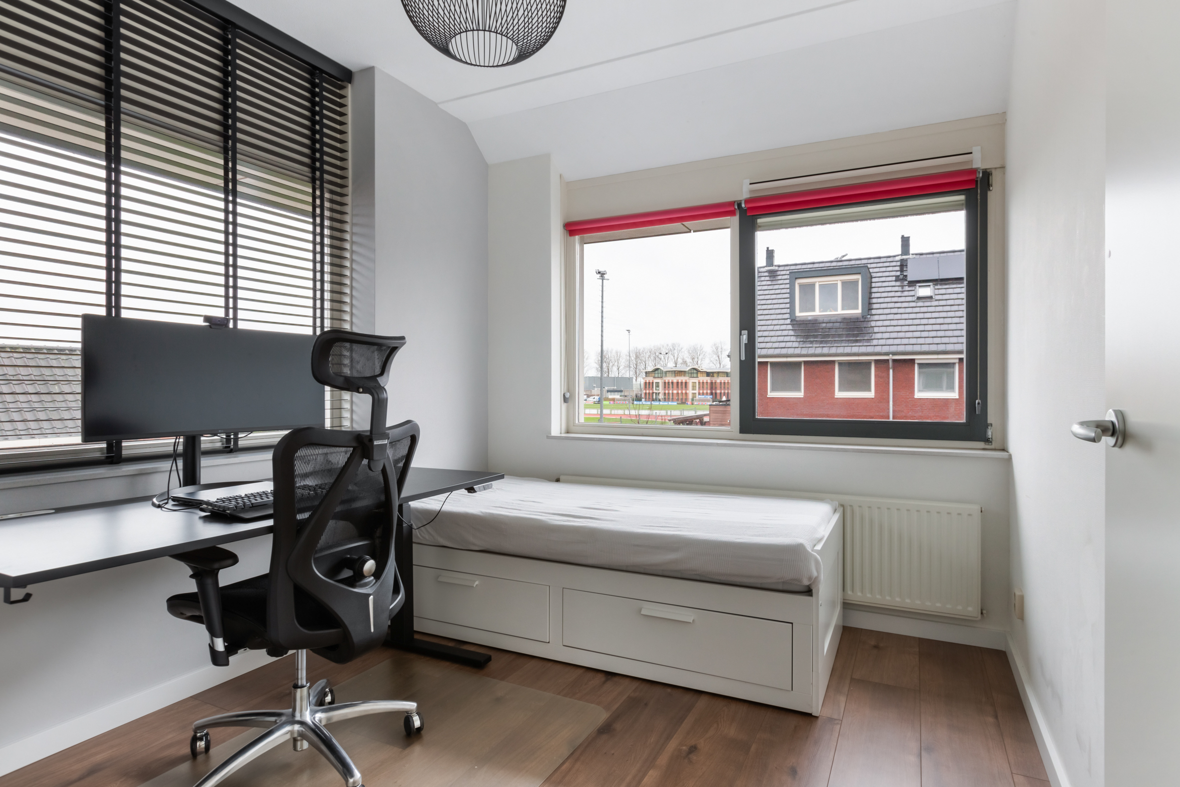 2e verdieping: overloop met zijraam en een luik met vlizotrap naar de vliering. Heel fijne, grote slaapkamer met hoge nok, dakkapellen aan voor- en achterzijde en de mogelijkheid tot het realiseren van twee kamers. Tweede badkamer met een douchecabine, wastafel met meubel, toilet en dakkapel. Aparte cv-/bergruimte met de unit van de mechanische ventilatie en omvormer voor de zonnepanelen.